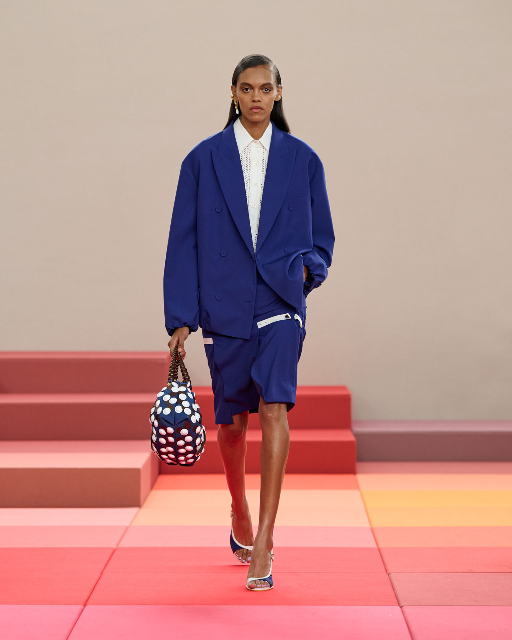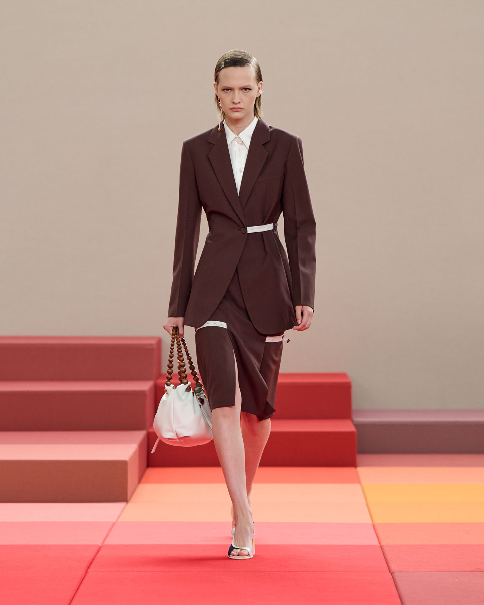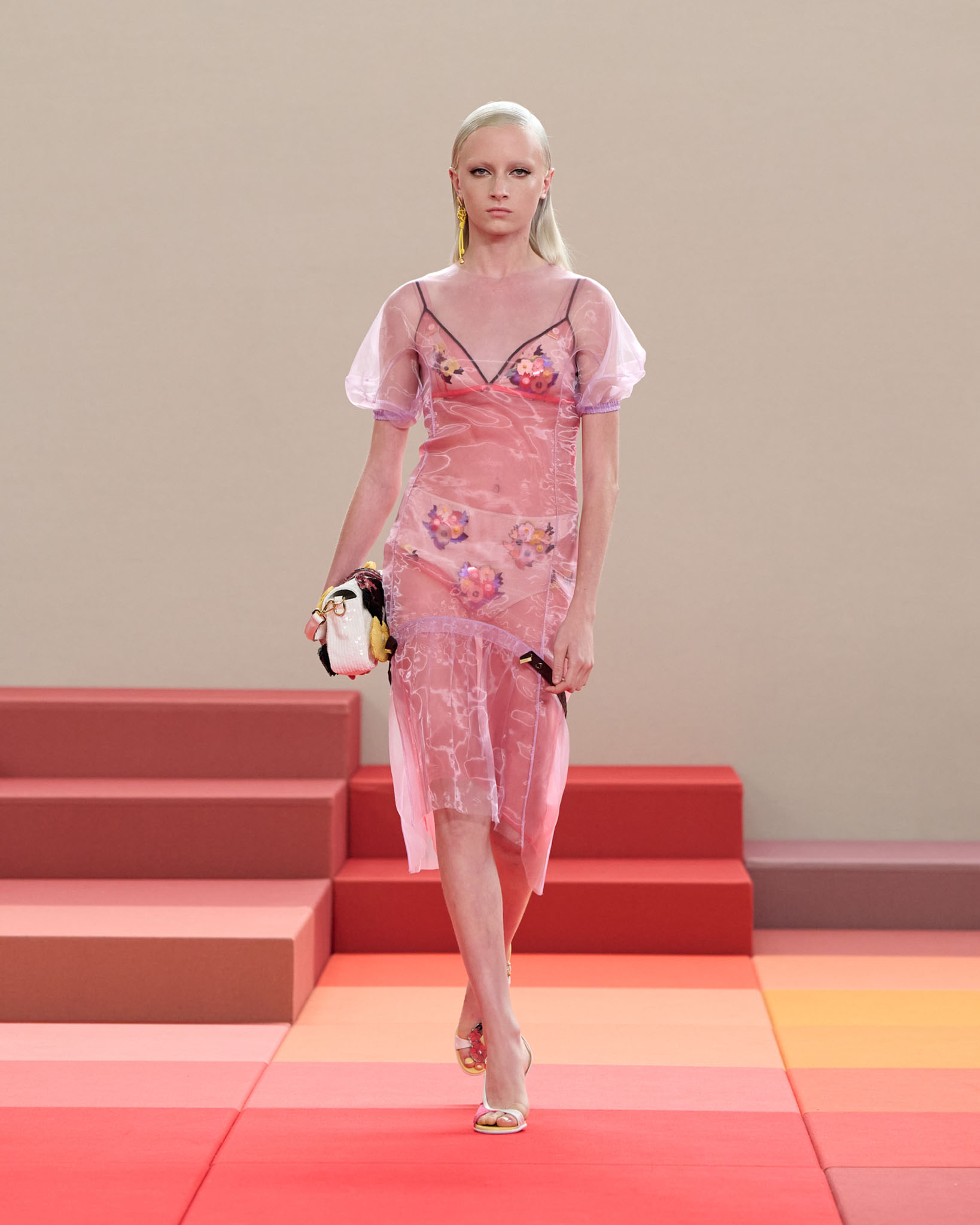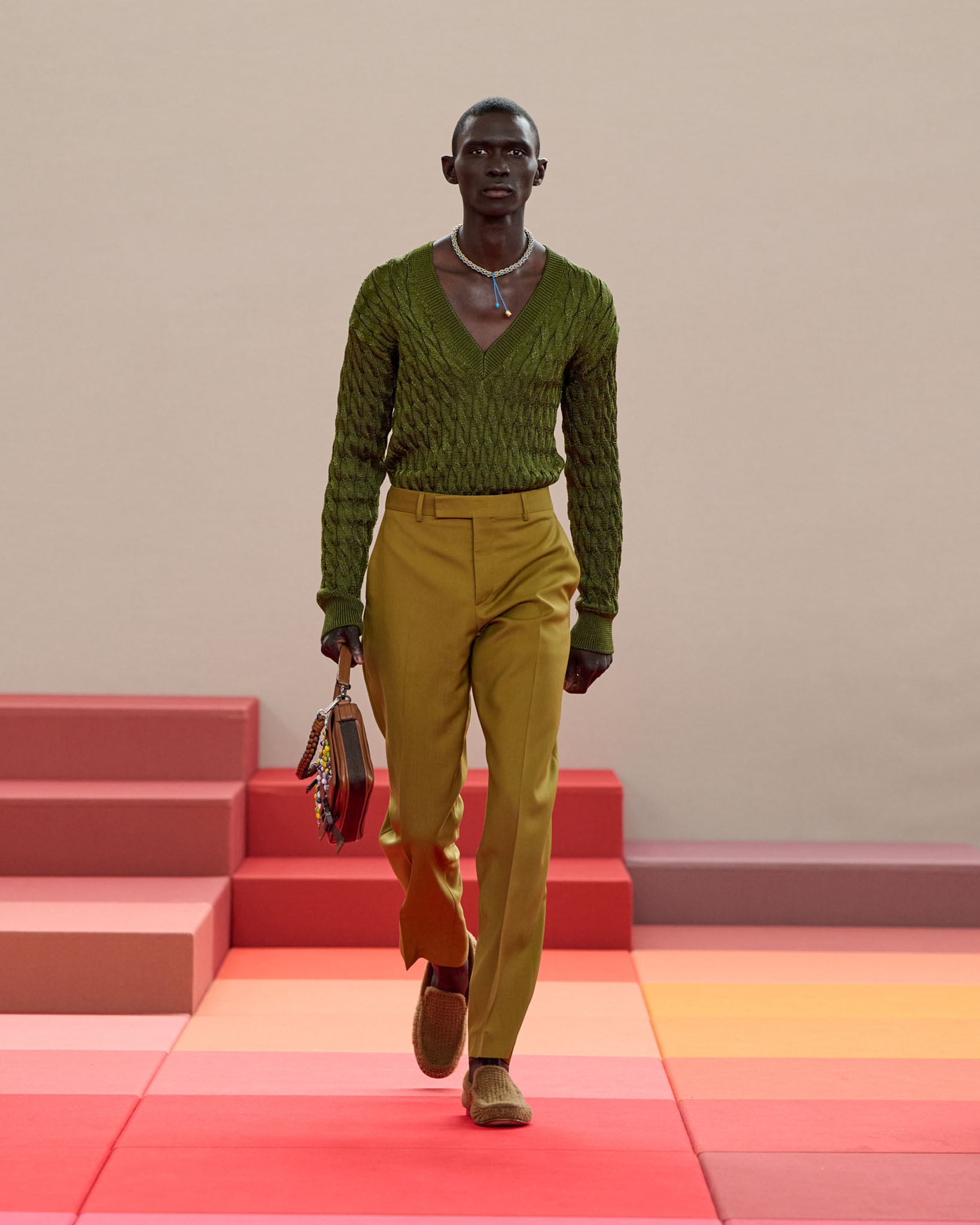 在每套服装中,Silvia Venturini Fendi 都优先考虑以折衷主义风格为基础的轻盈感——让轻盈的面料在微风中飘扬,其鲜艳的连续色块则带来令人愉悦的厚重感。波点印花半身裙,或者花朵镂空拼接的人造皮草夹克让忙碌匆忙的都市女性增添俏皮活泼的轻松气息。这种青春活力也延续到了男装系列当中,西装翻领上别着充满创意的花朵别针,一些套装则以宽松的工装裤进行搭配,更显轻松写意。