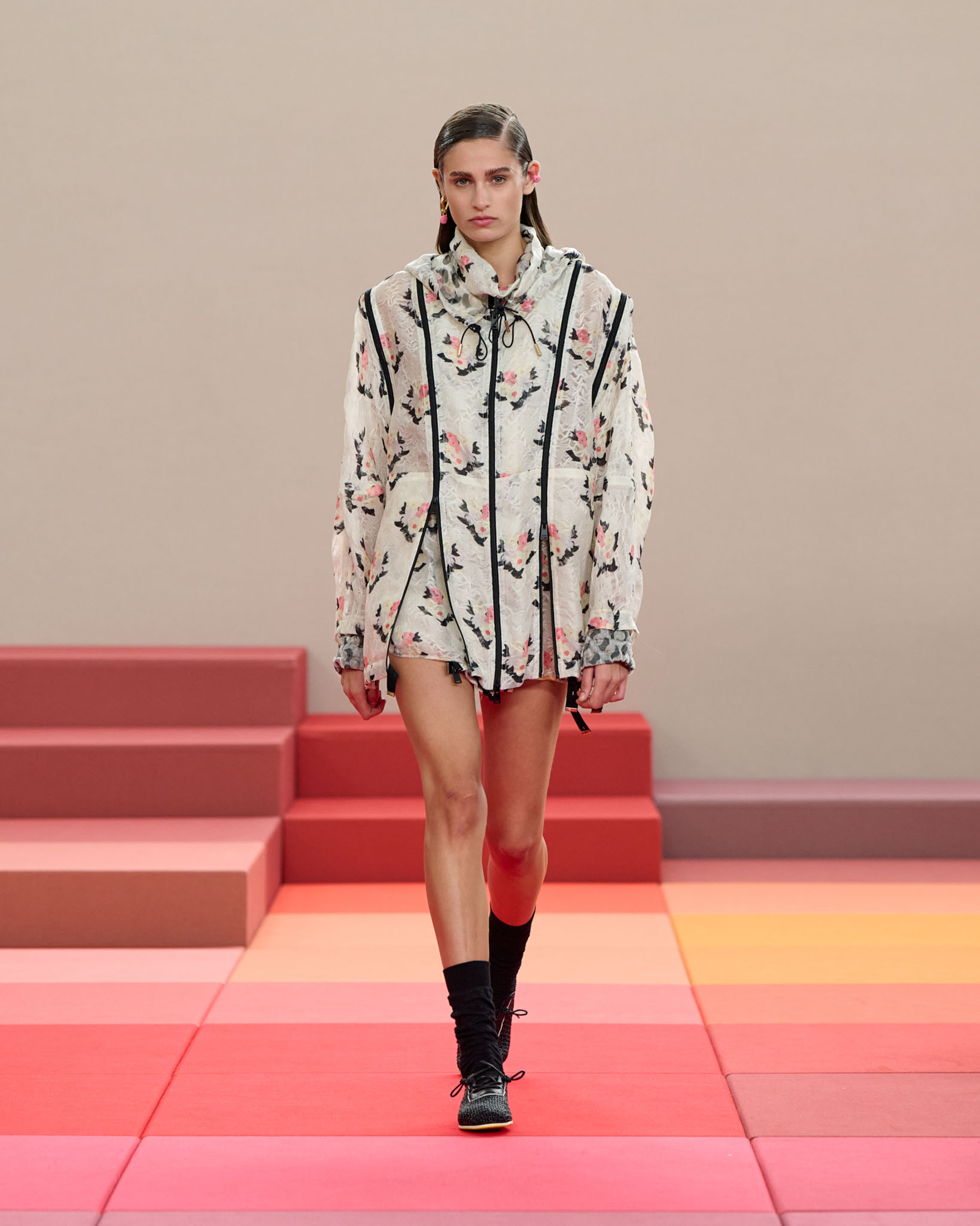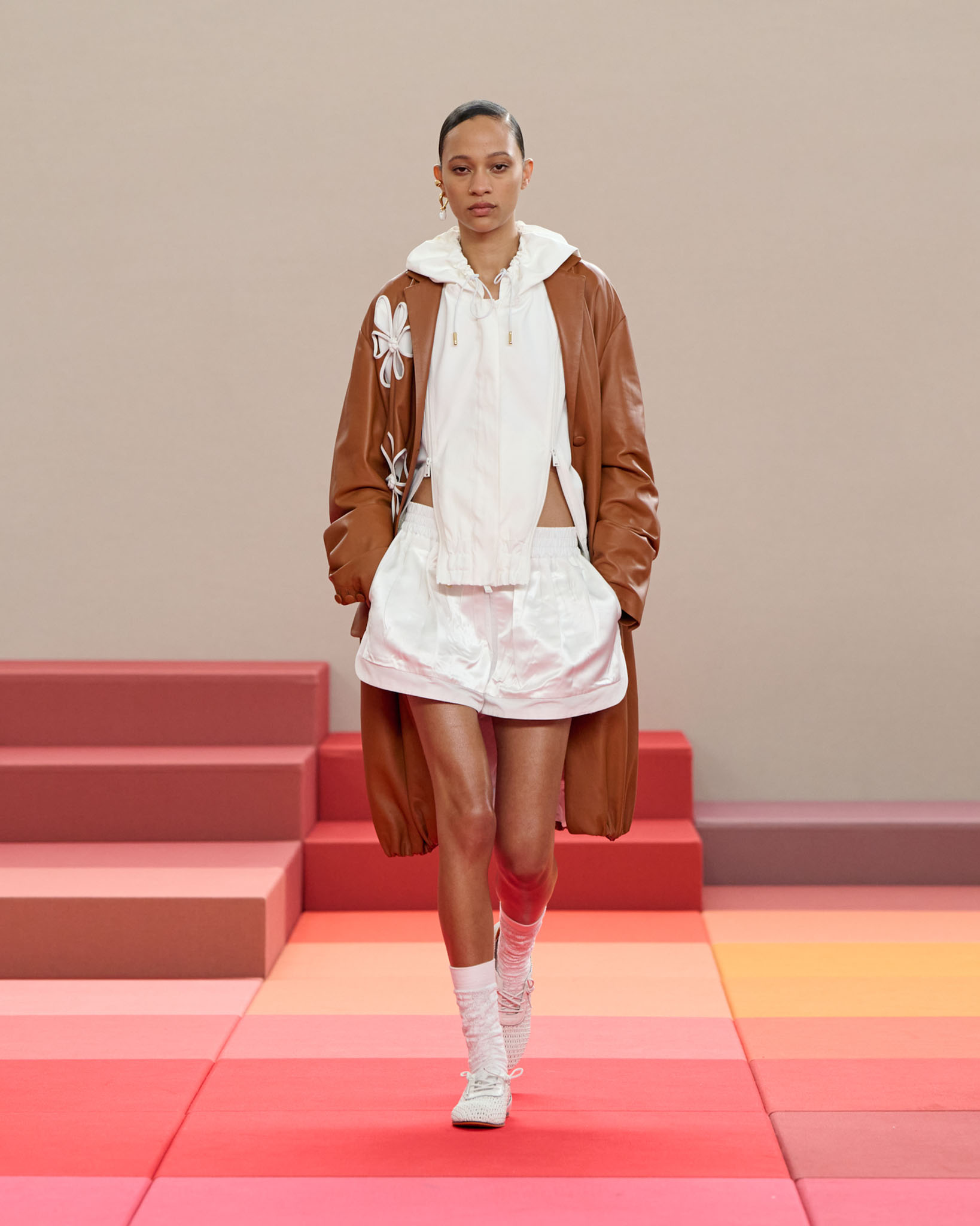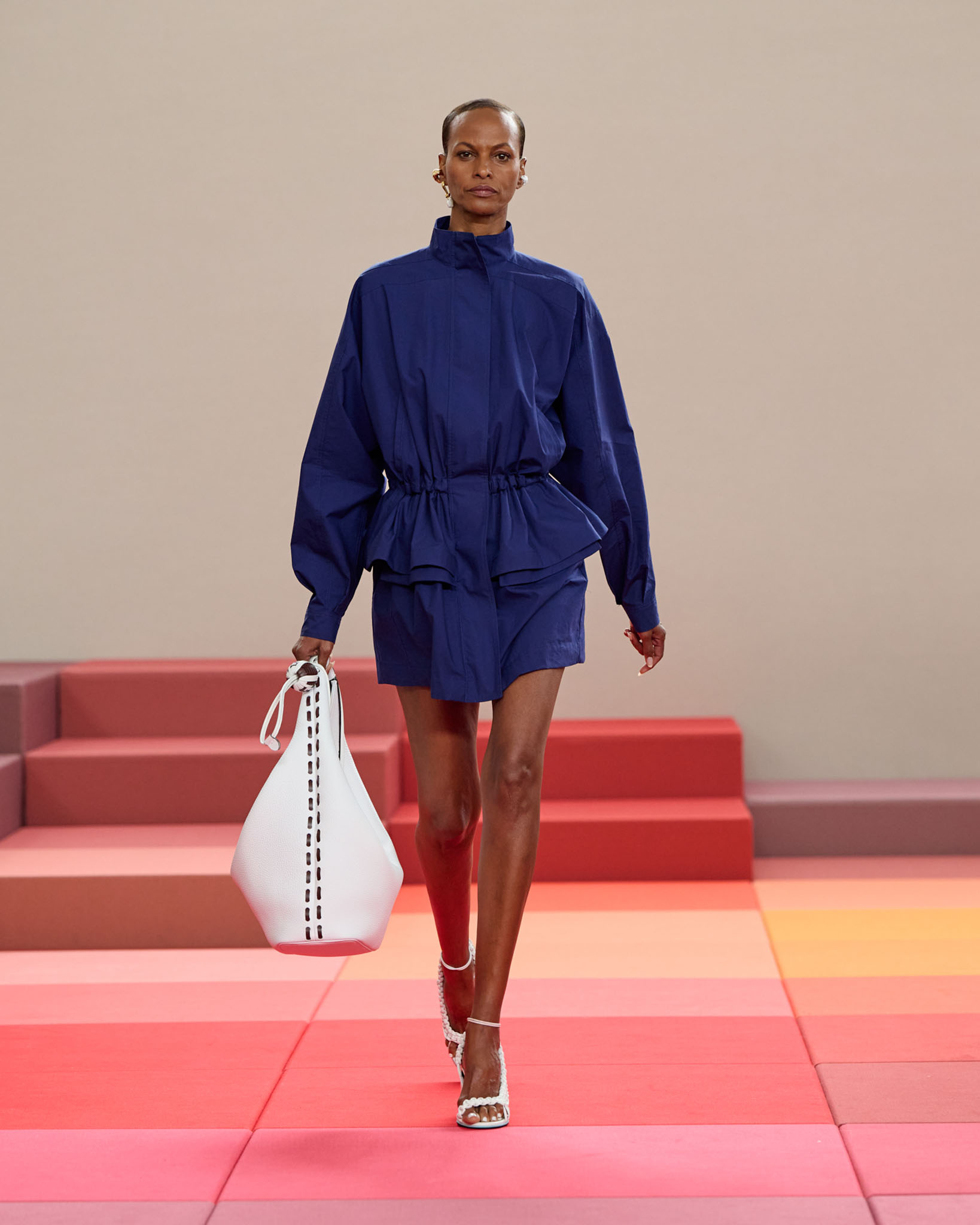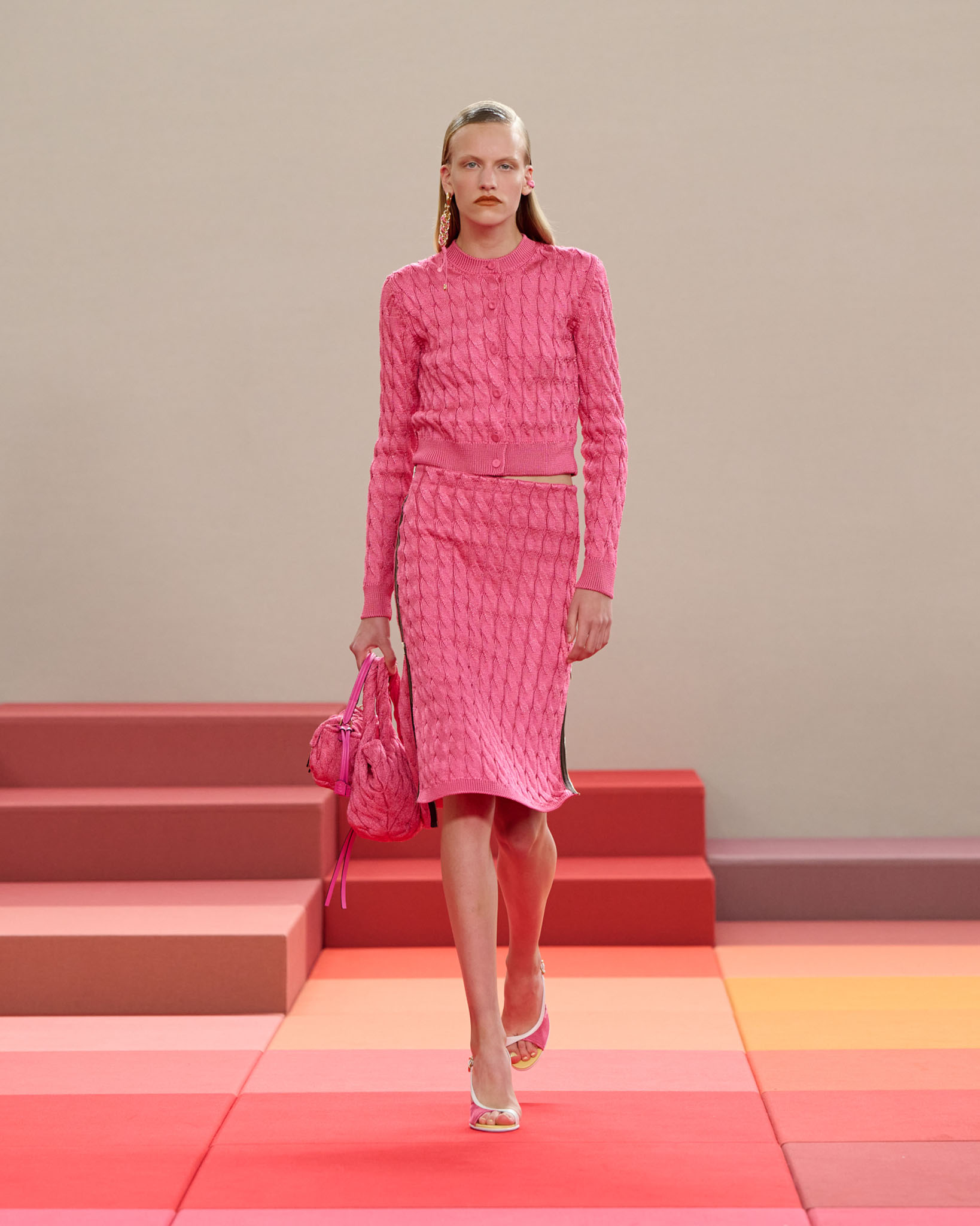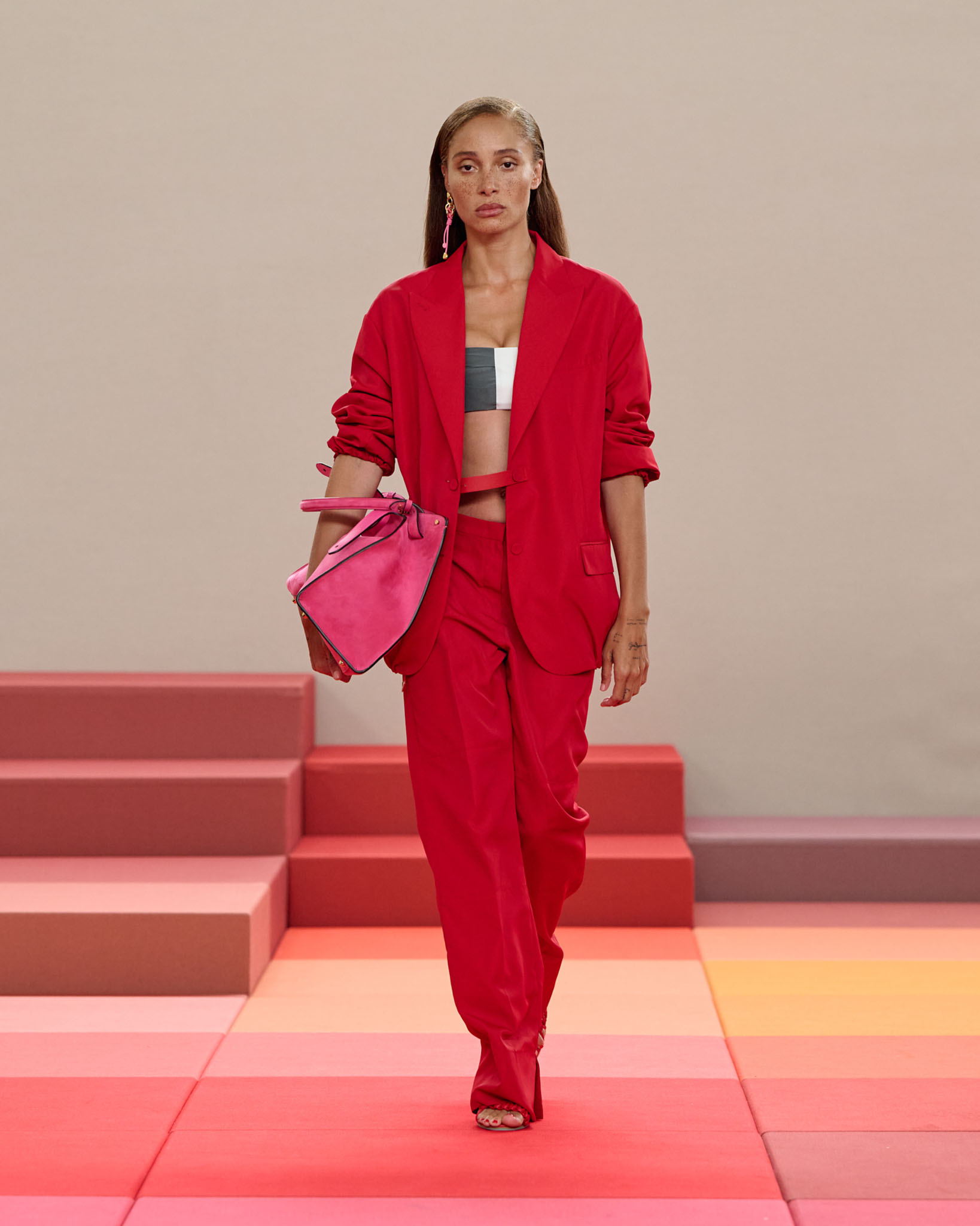 在每套服装中,Silvia Venturini Fendi 都优先考虑以折衷主义风格为基础的轻盈感——让轻盈的面料在微风中飘扬,其鲜艳的连续色块则带来令人愉悦的厚重感。波点印花半身裙,或者花朵镂空拼接的人造皮草夹克让忙碌匆忙的都市女性增添俏皮活泼的轻松气息。这种青春活力也延续到了男装系列当中,西装翻领上别着充满创意的花朵别针,一些套装则以宽松的工装裤进行搭配,更显轻松写意。