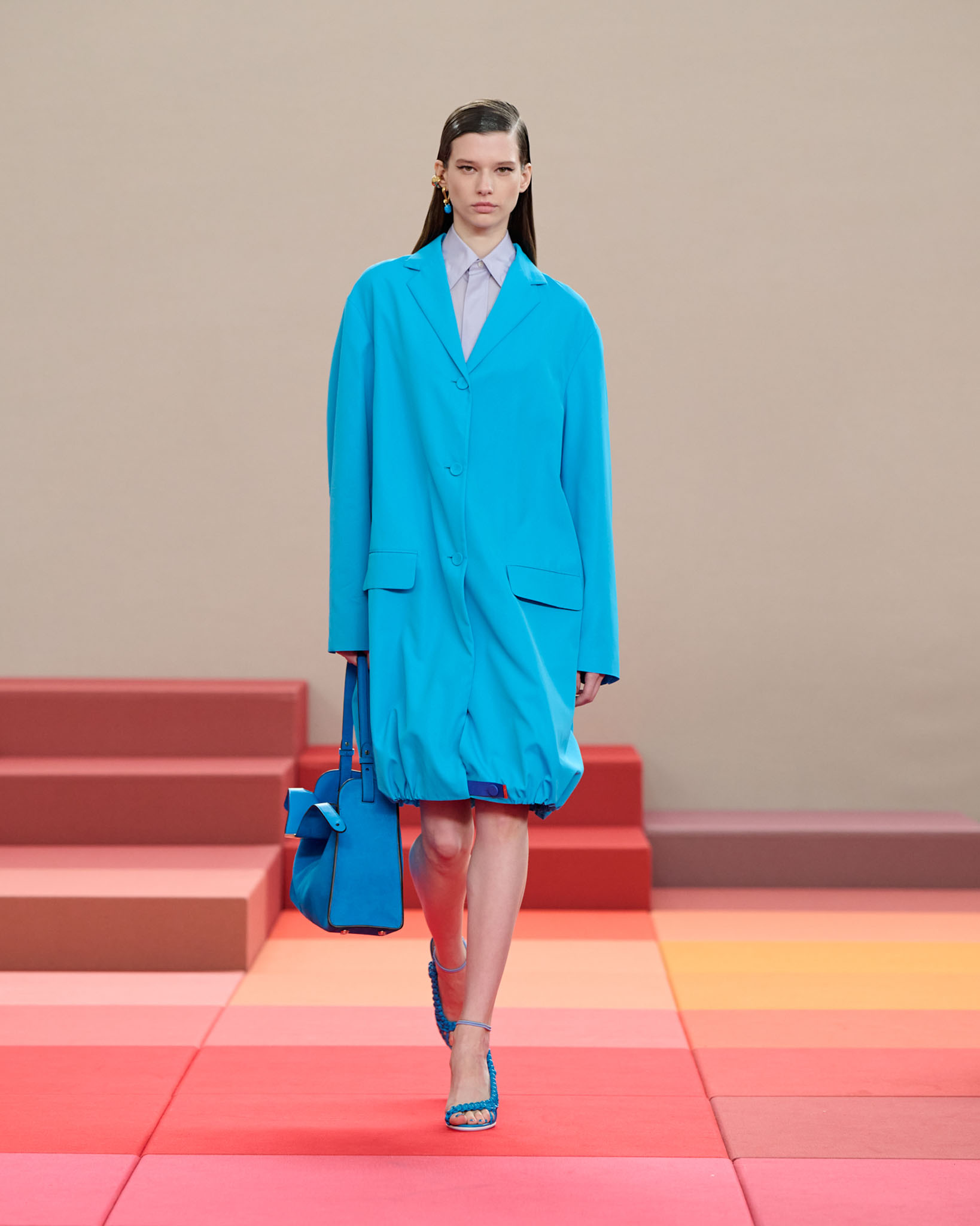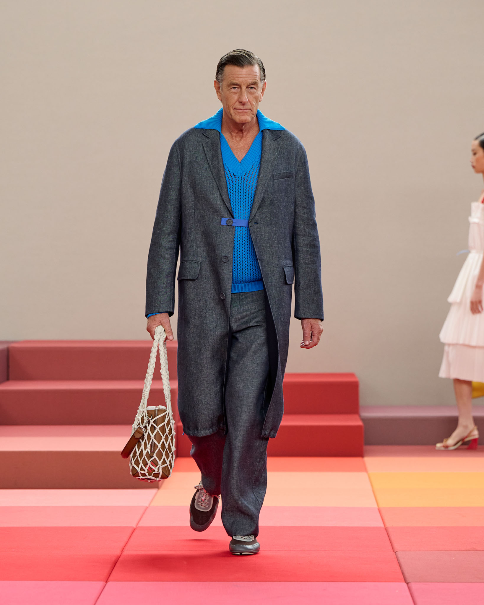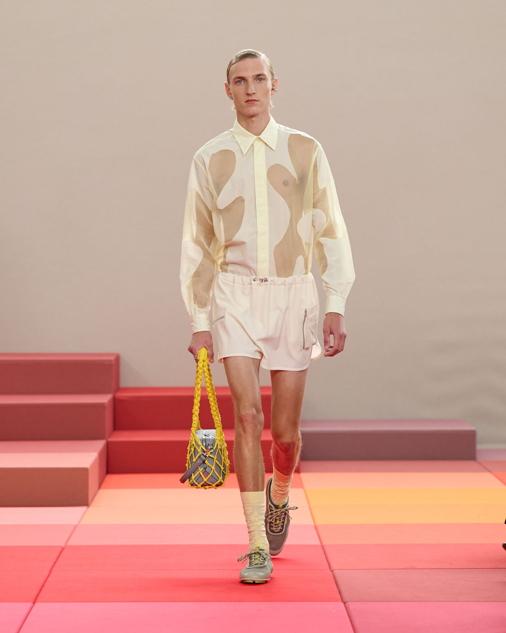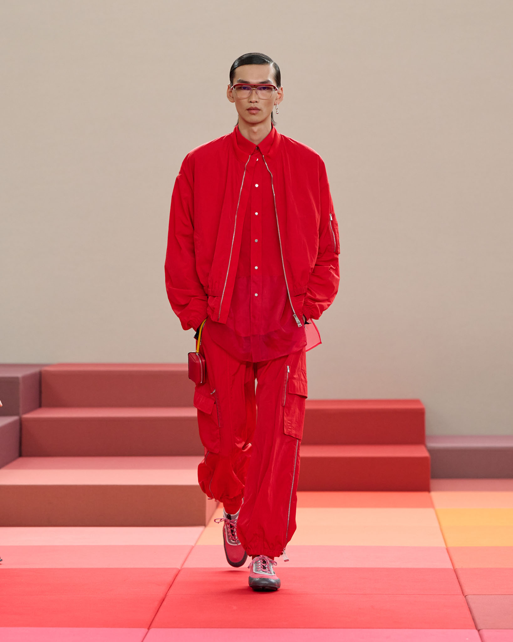 在每套服装中,Silvia Venturini Fendi 都优先考虑以折衷主义风格为基础的轻盈感——让轻盈的面料在微风中飘扬,其鲜艳的连续色块则带来令人愉悦的厚重感。波点印花半身裙,或者花朵镂空拼接的人造皮草夹克让忙碌匆忙的都市女性增添俏皮活泼的轻松气息。这种青春活力也延续到了男装系列当中,西装翻领上别着充满创意的花朵别针,一些套装则以宽松的工装裤进行搭配,更显轻松写意。