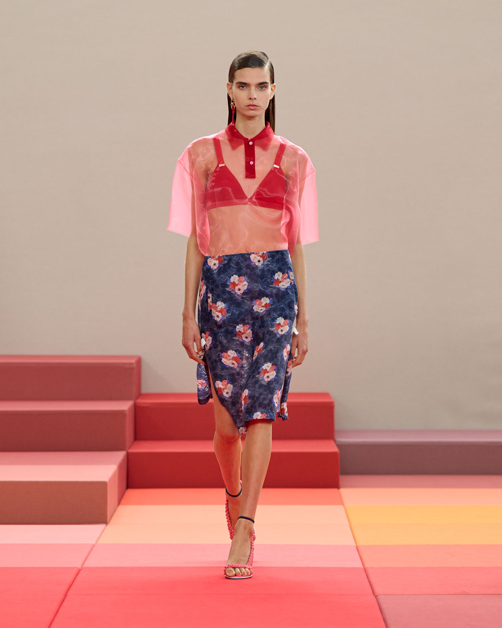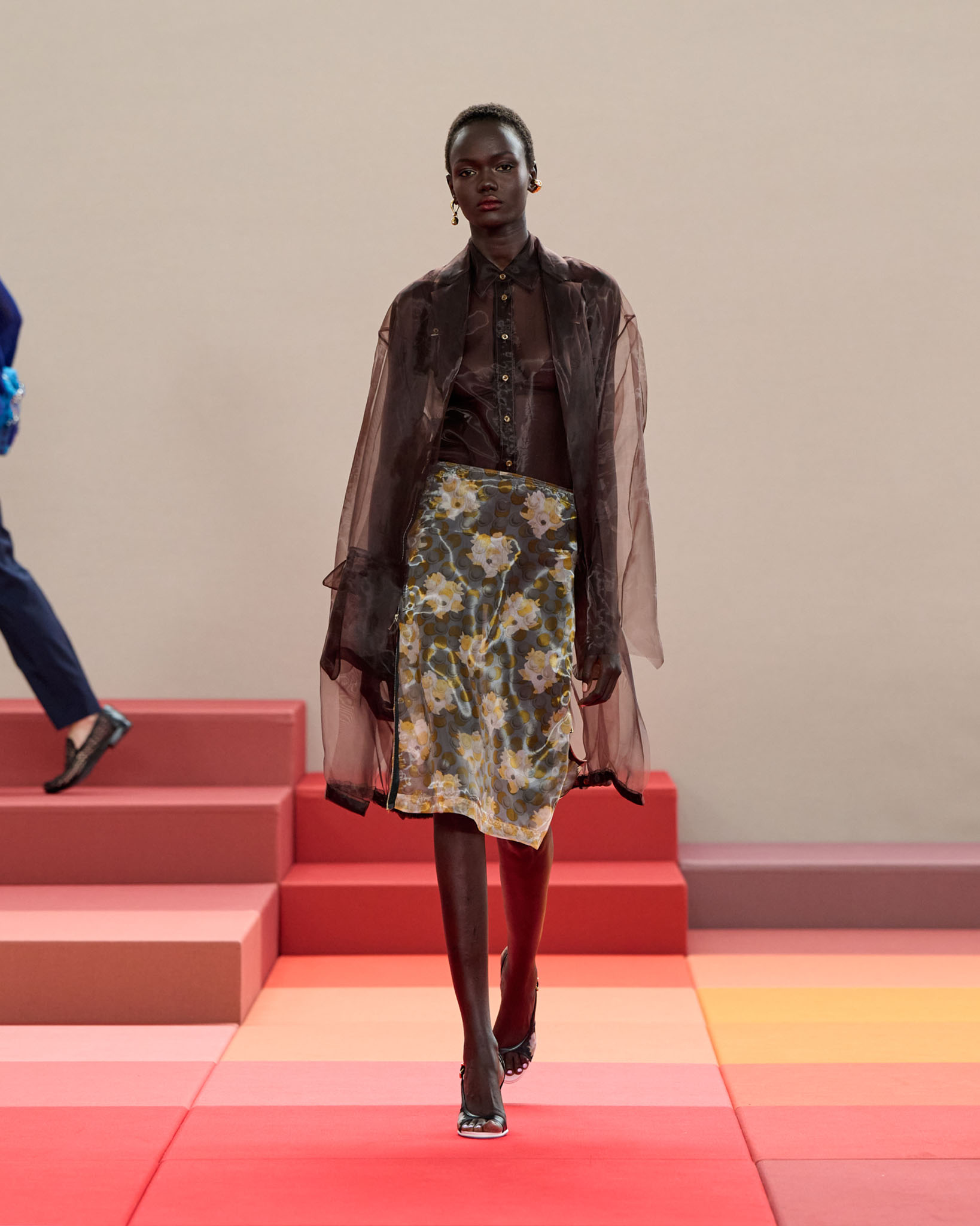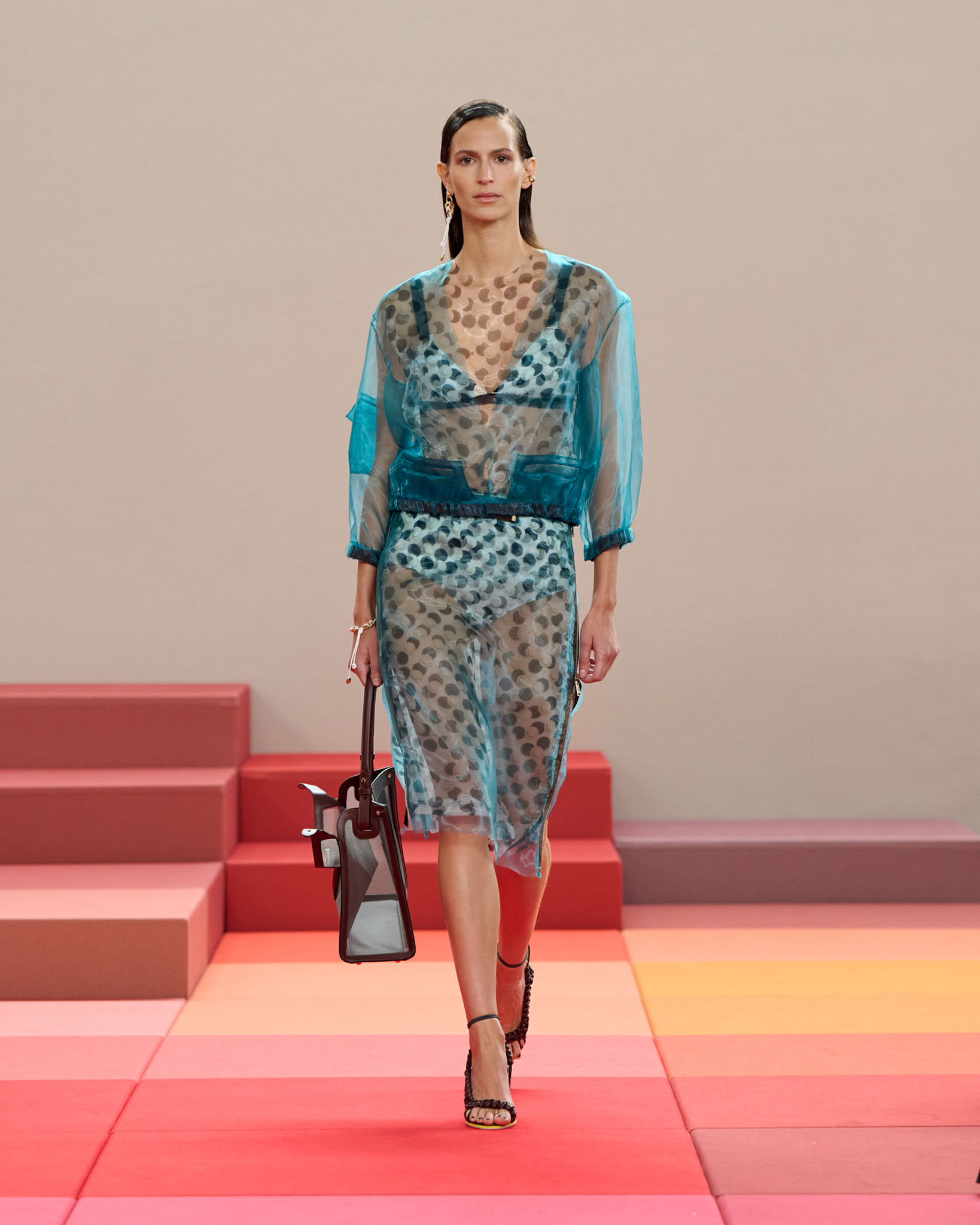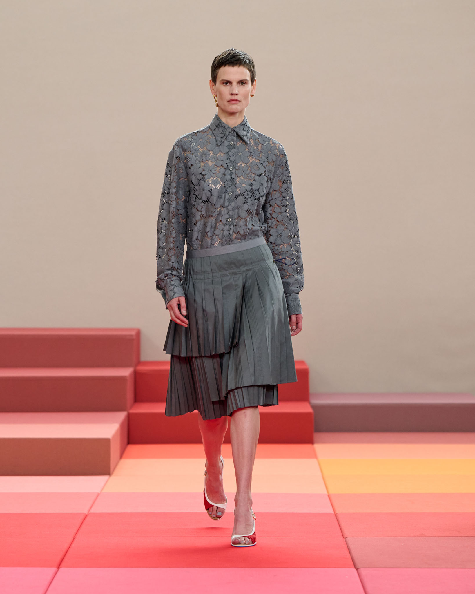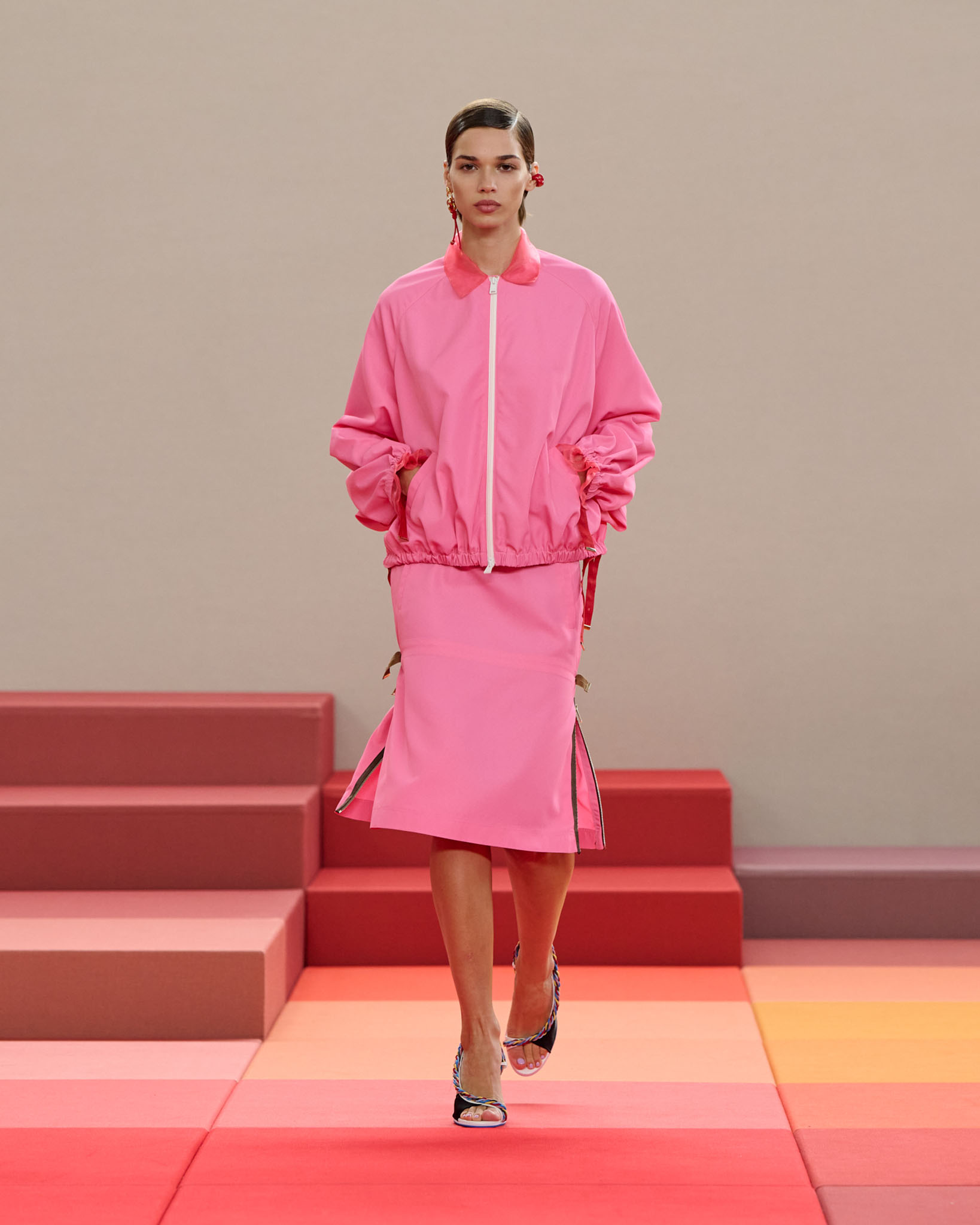在每套服装中,Silvia Venturini Fendi 都优先考虑以折衷主义风格为基础的轻盈感——让轻盈的面料在微风中飘扬,其鲜艳的连续色块则带来令人愉悦的厚重感。波点印花半身裙,或者花朵镂空拼接的人造皮草夹克让忙碌匆忙的都市女性增添俏皮活泼的轻松气息。这种青春活力也延续到了男装系列当中,西装翻领上别着充满创意的花朵别针,一些套装则以宽松的工装裤进行搭配,更显轻松写意。