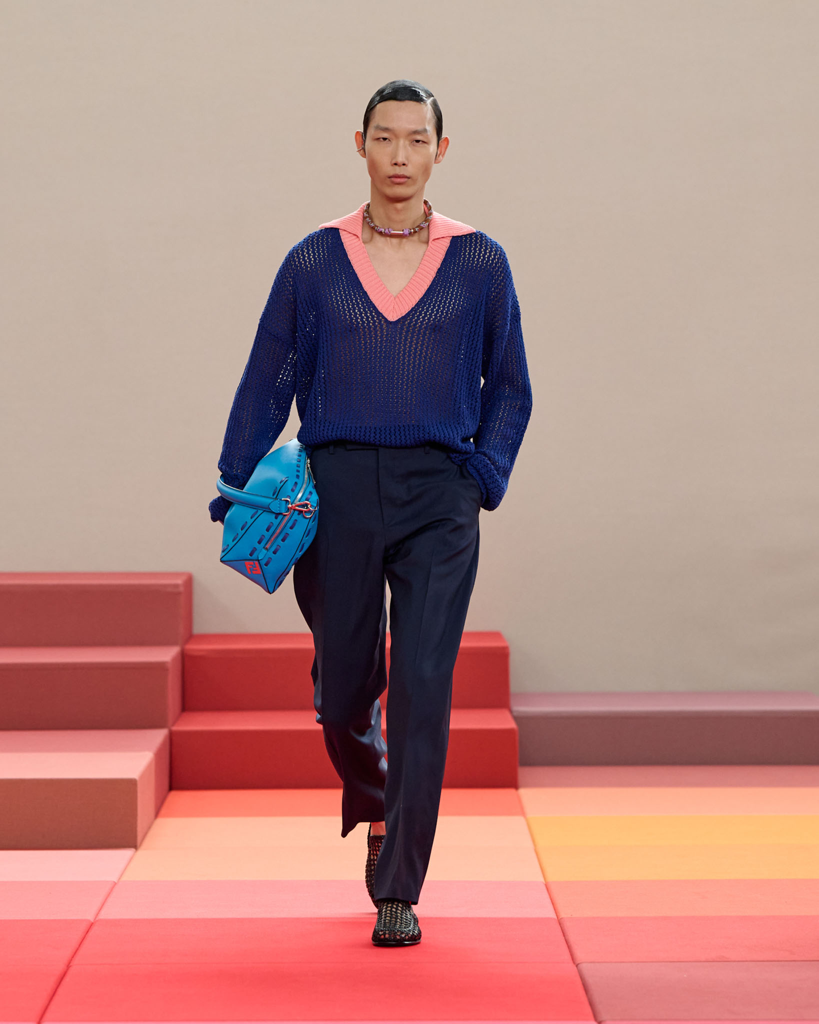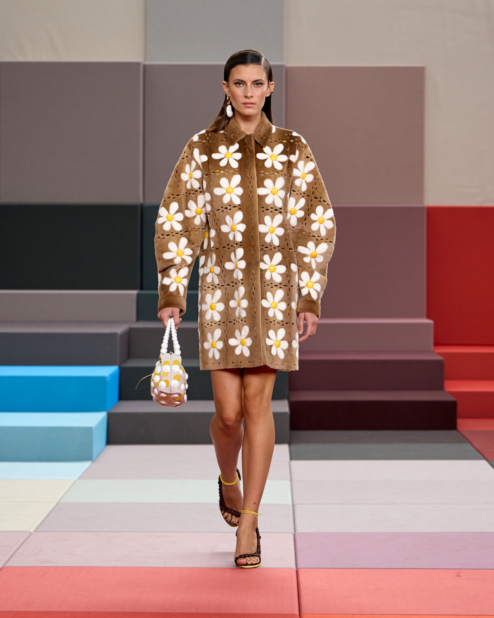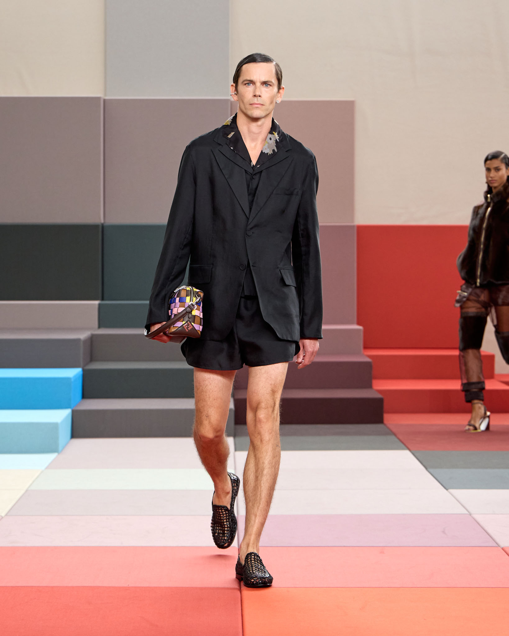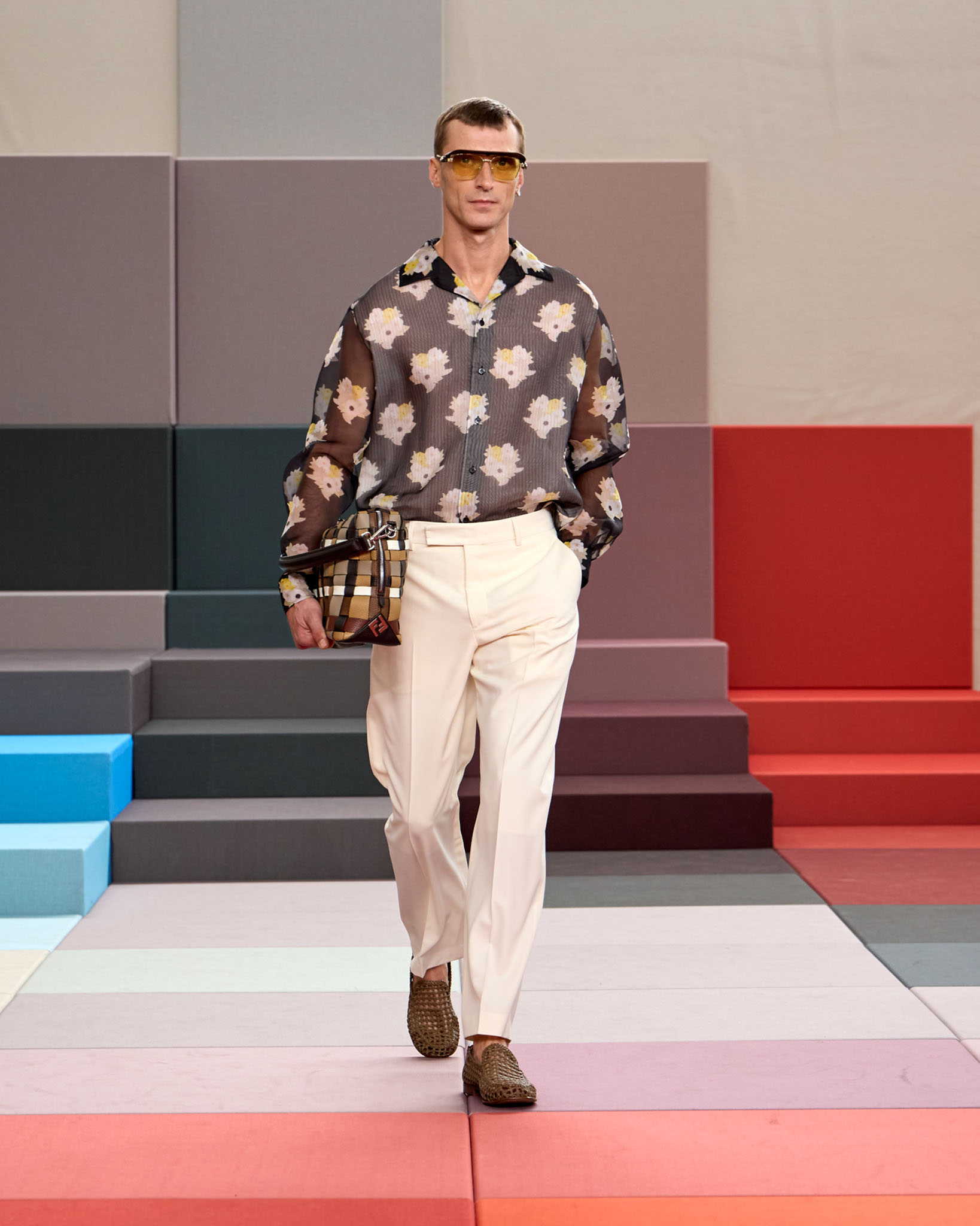 FENDI 今年正值成立 100 周年之际,创意总监 Silvia Venturini Fendi 与工业设计师 Mar Newson 合作,将秀场舞台打造成亮眼的像素化风格,推出了一个融合意式轻松与波普艺术美感的服装系列。