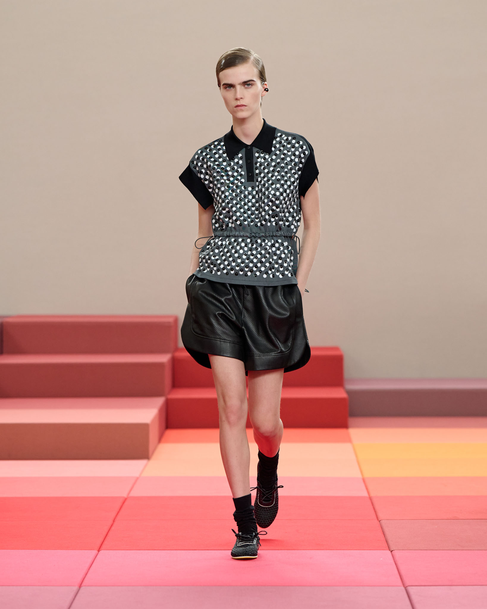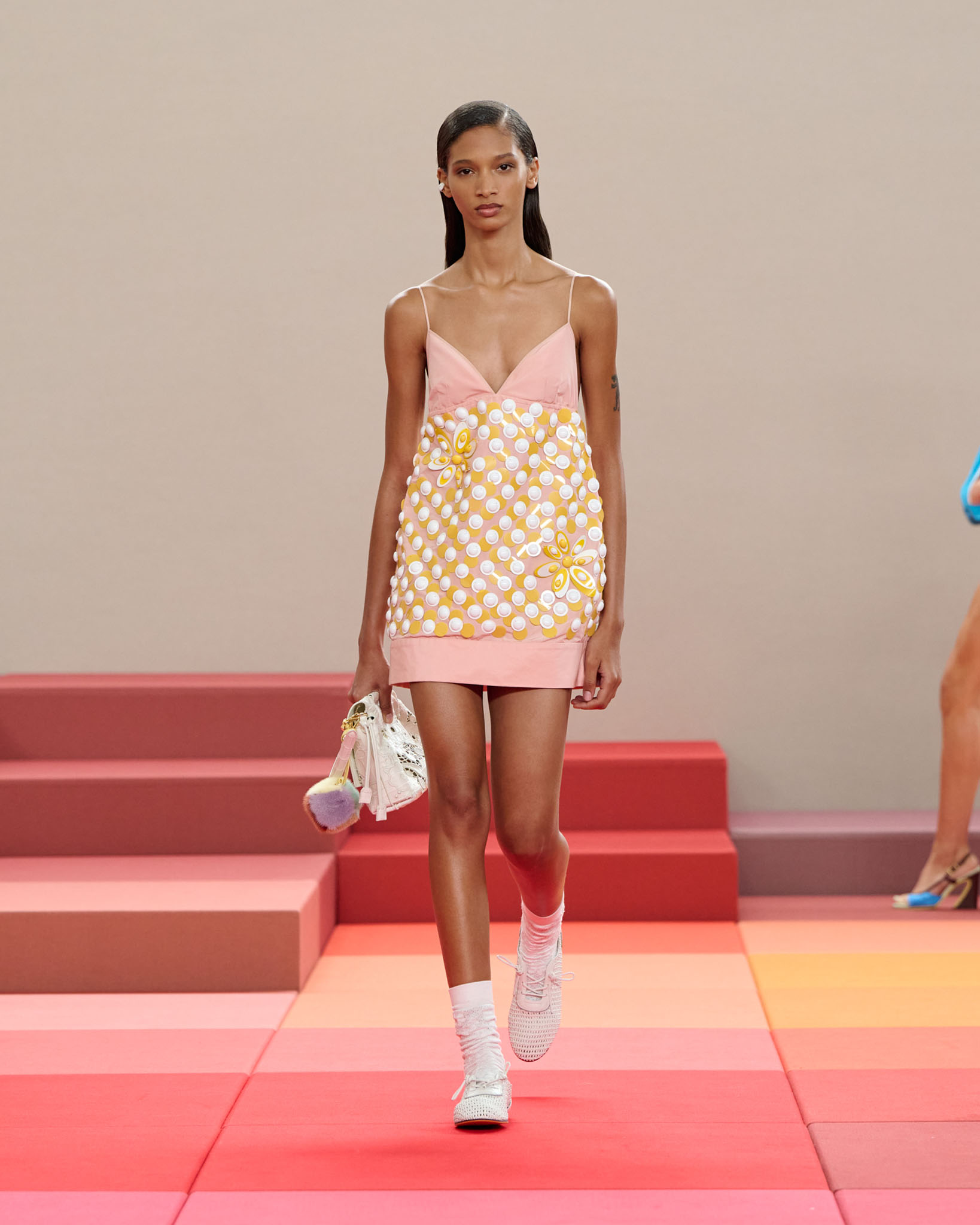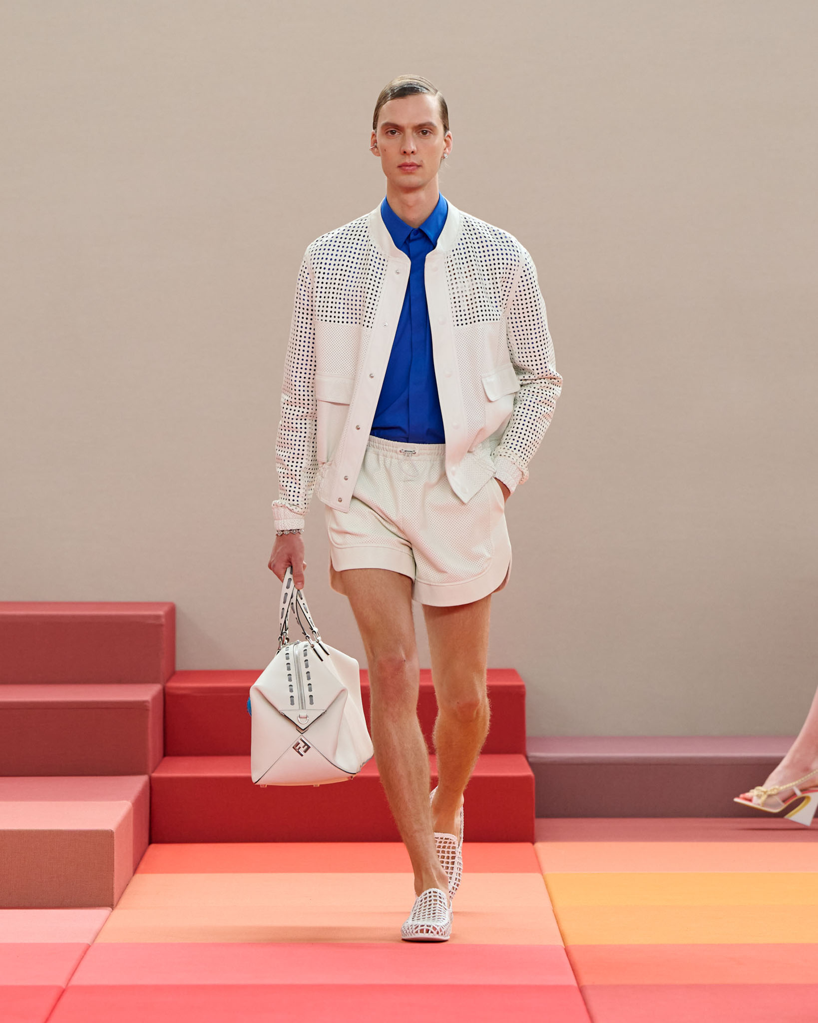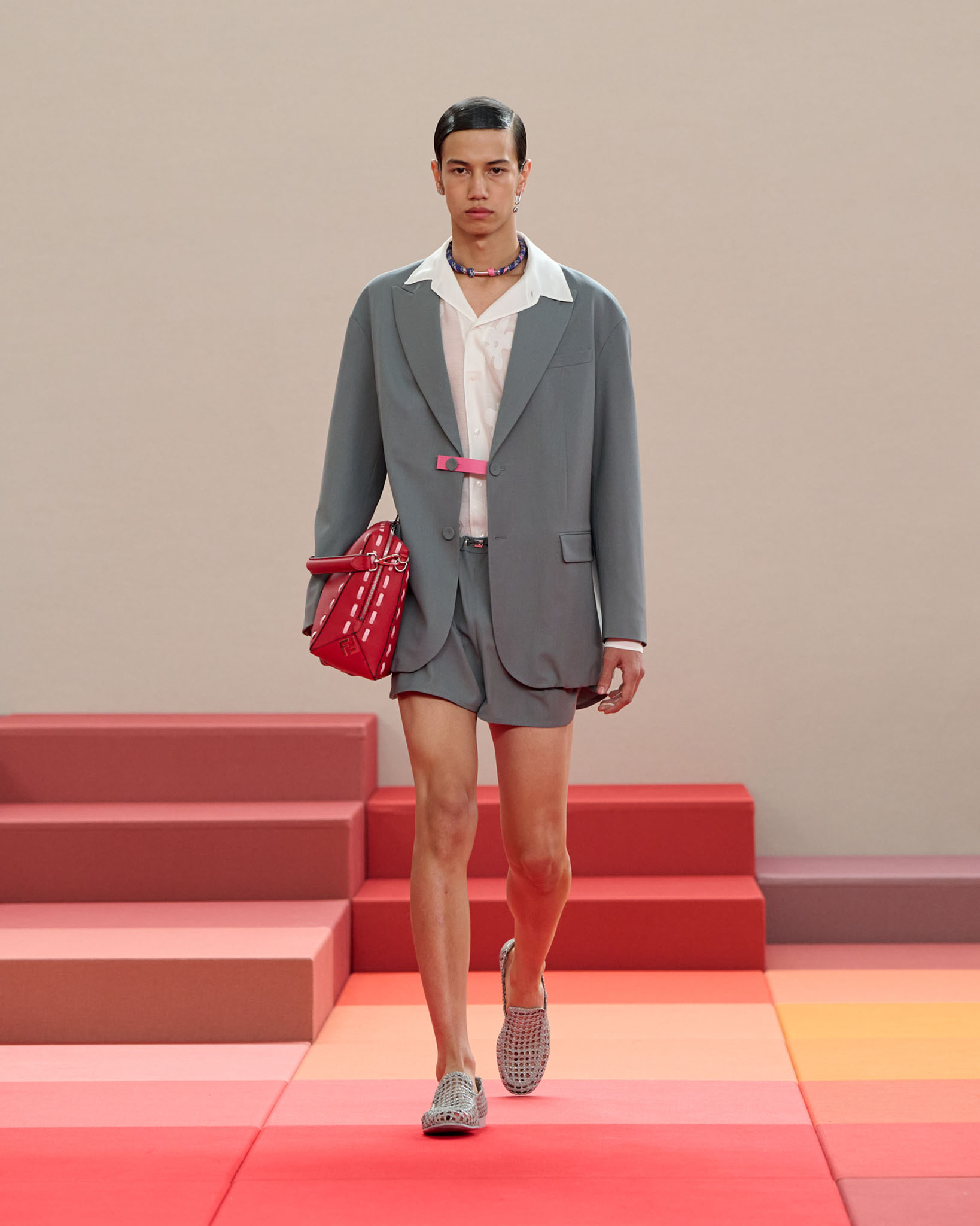 FENDI 今年正值成立 100 周年之际,创意总监 Silvia Venturini Fendi 与工业设计师 Mar Newson 合作,将秀场舞台打造成亮眼的像素化风格,推出了一个融合意式轻松与波普艺术美感的服装系列。