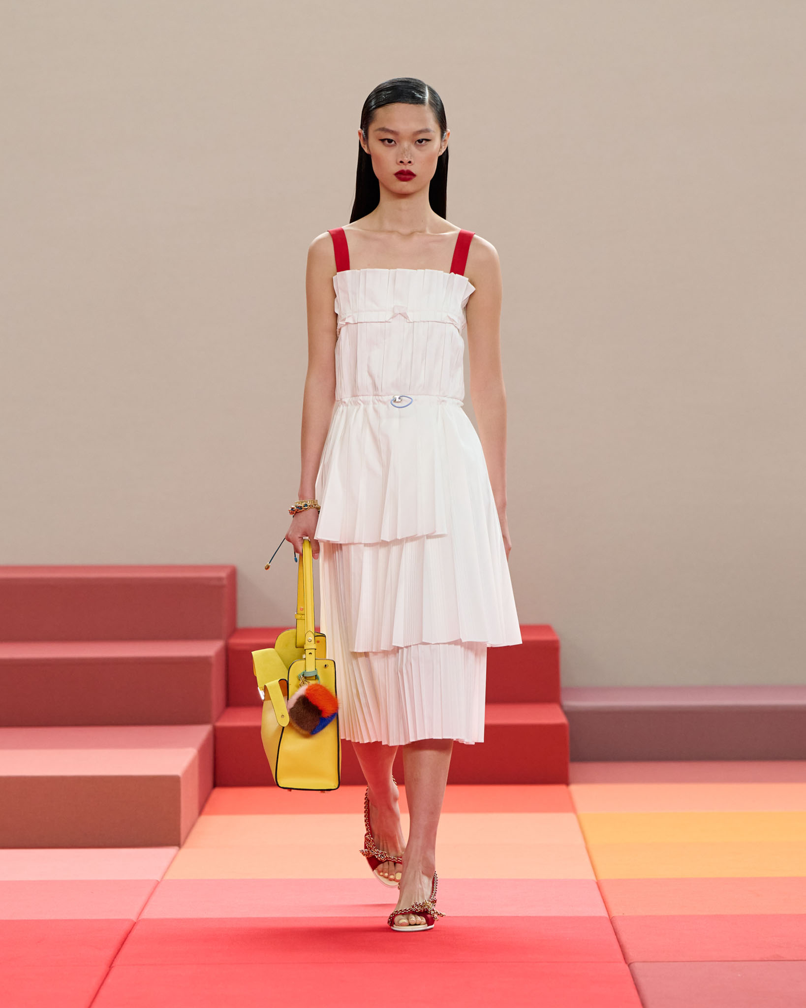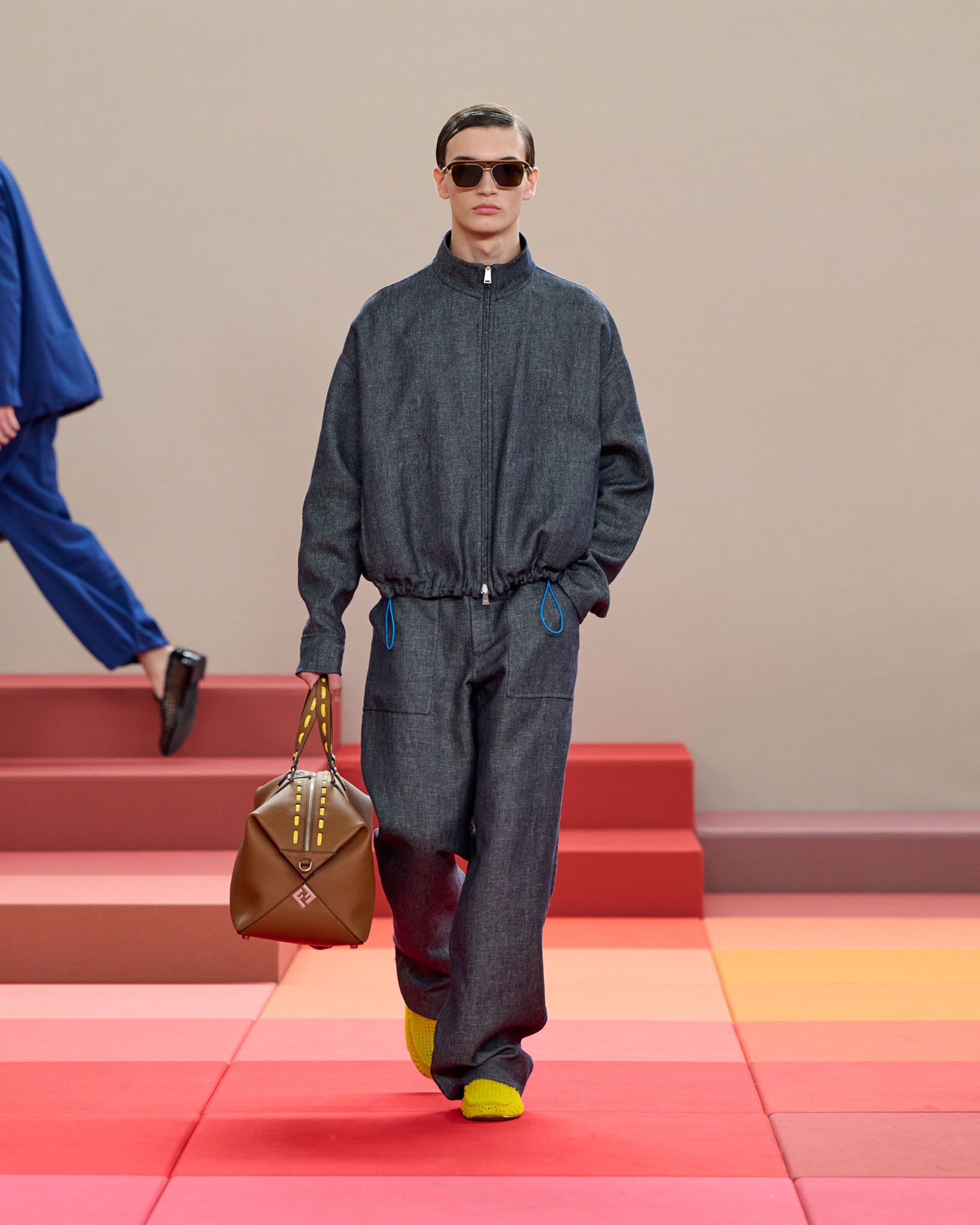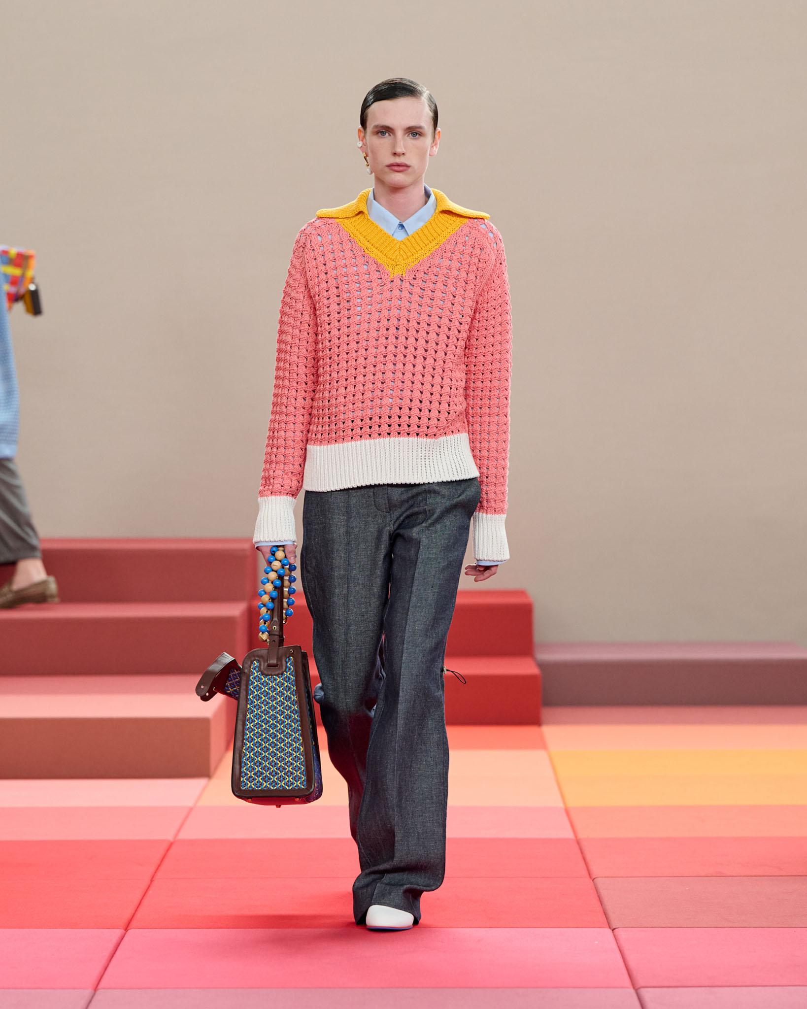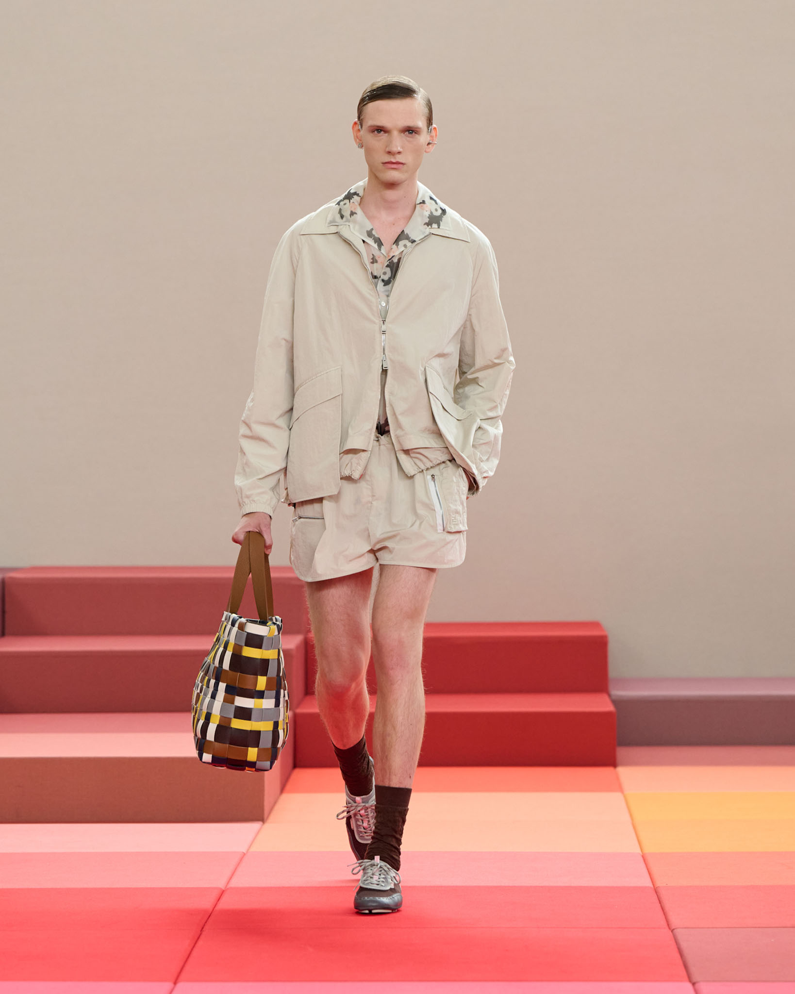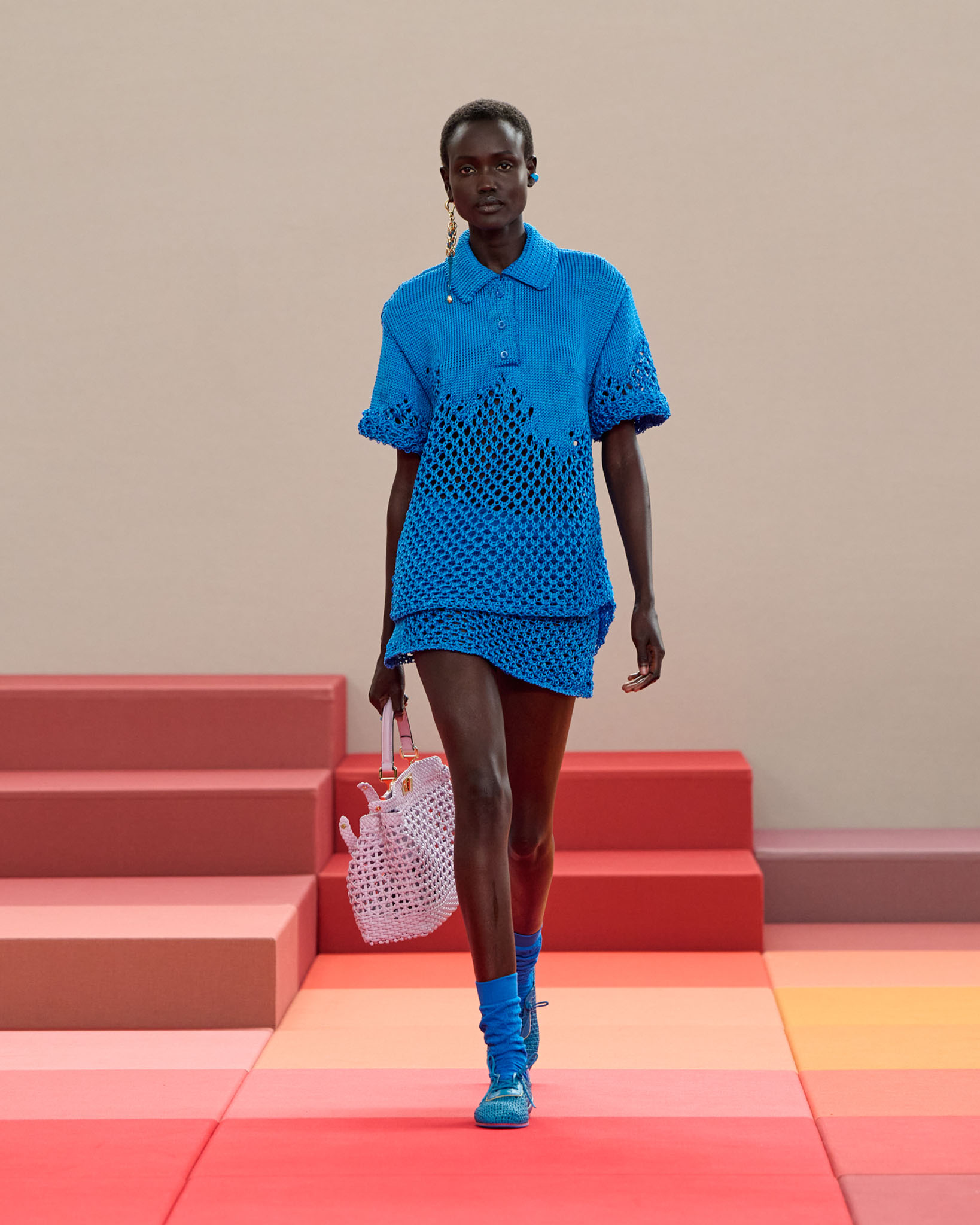 FENDI 今年正值成立 100 周年之际,创意总监 Silvia Venturini Fendi 与工业设计师 Mar Newson 合作,将秀场舞台打造成亮眼的像素化风格,推出了一个融合意式轻松与波普艺术美感的服装系列。
