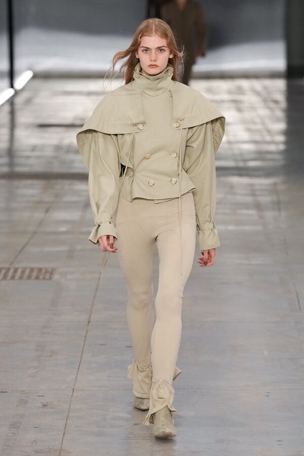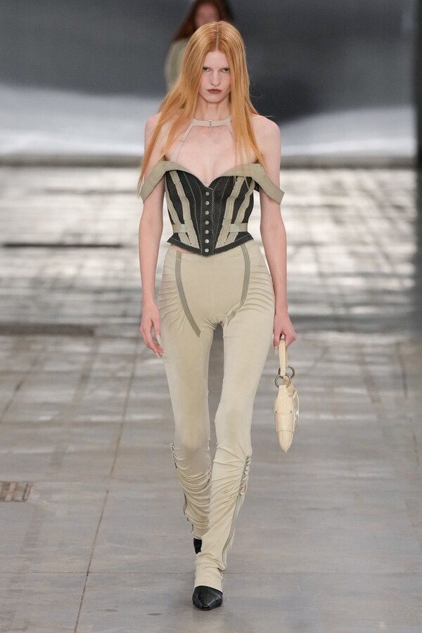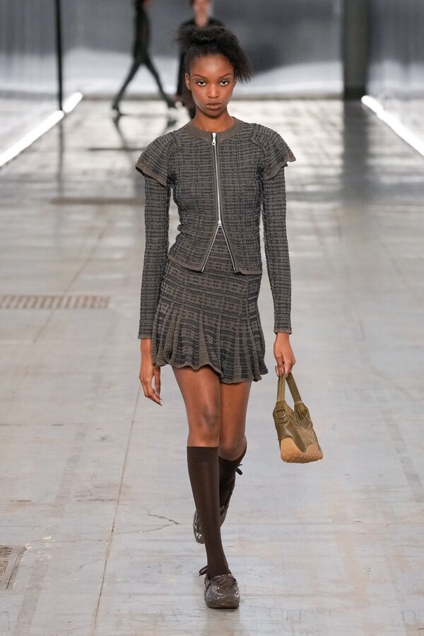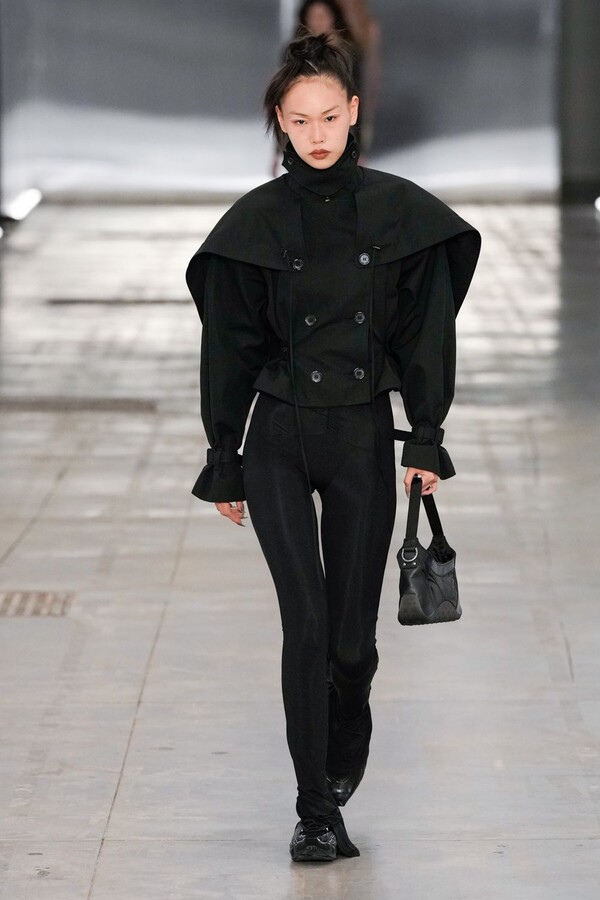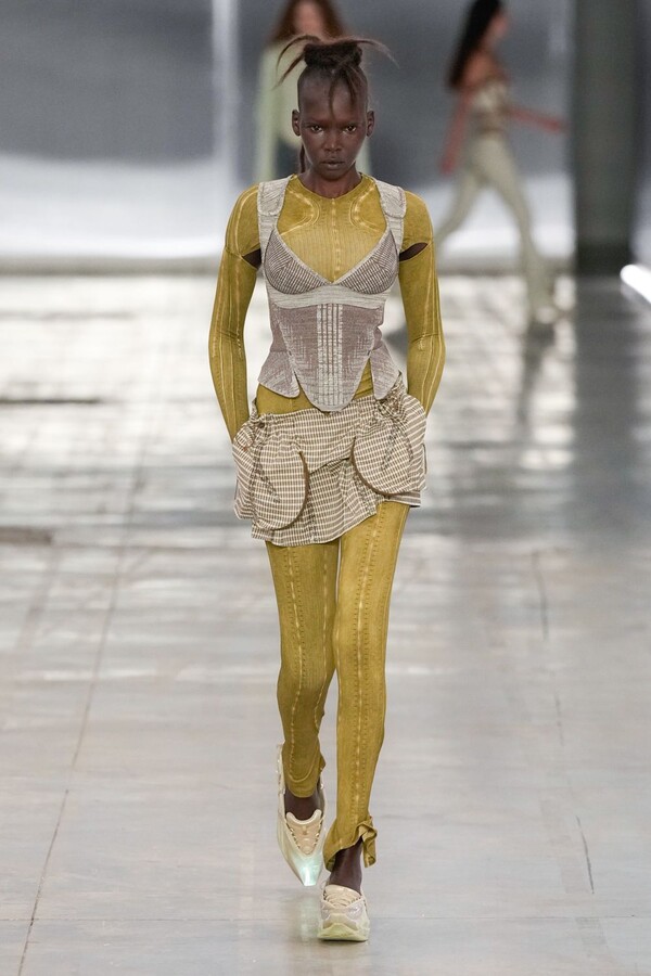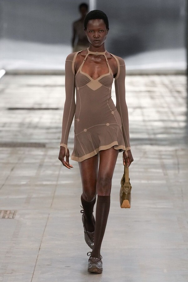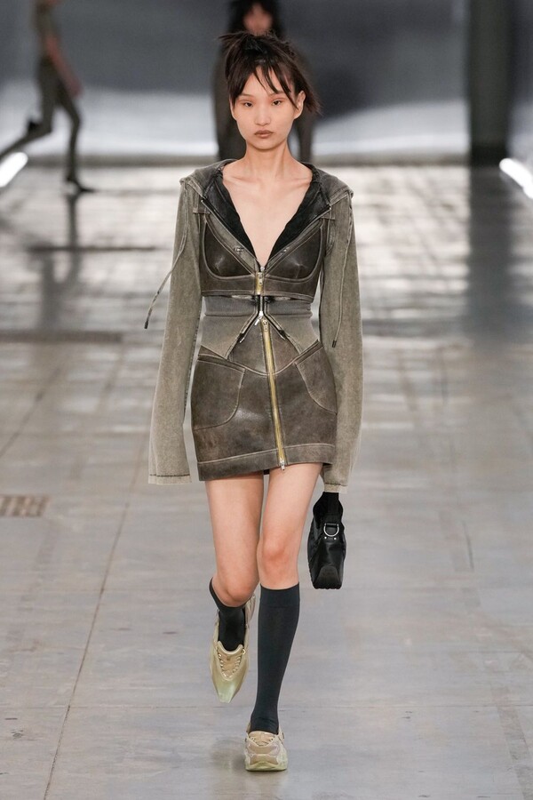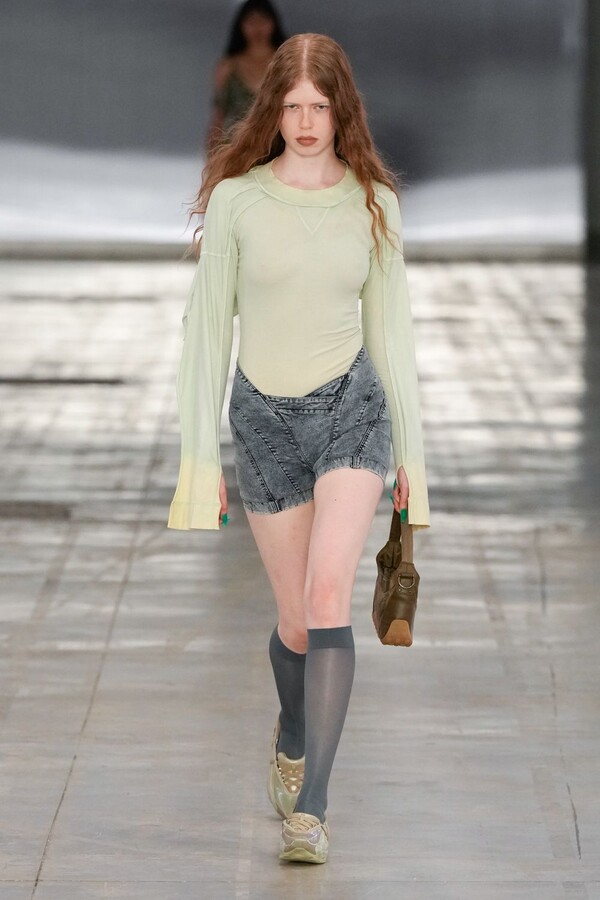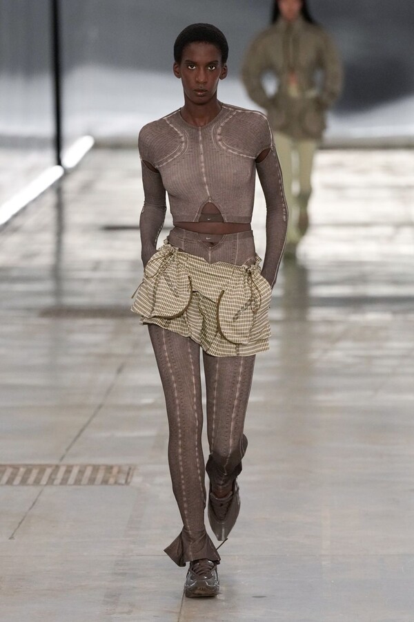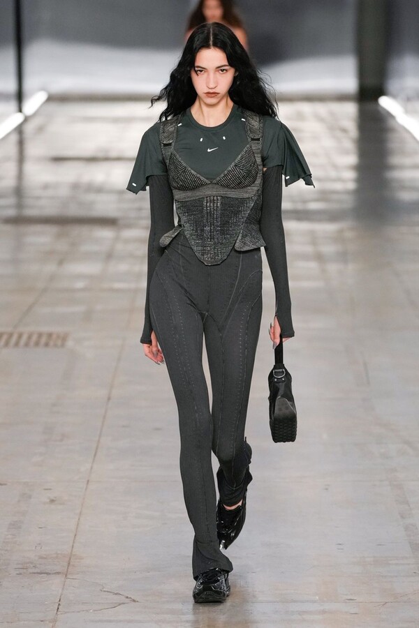 与 Nike 的合作亮点首先是一款采用尖头 TPU 模压鞋头的运动鞋——灵感源自品牌经典 Raptor 战靴,充满中世纪未来主义的韵味。该鞋搭配泡泡袖提花连衣裙,模糊了运动性能与女性气质之间的界限。配饰系列延续了这一实验,采用华夫格鞋底和尼龙拼接面料打造的手提包,以及专属 Flyknit 面料制成的紧身胸衣,将都准军事风格融入了运动服饰。