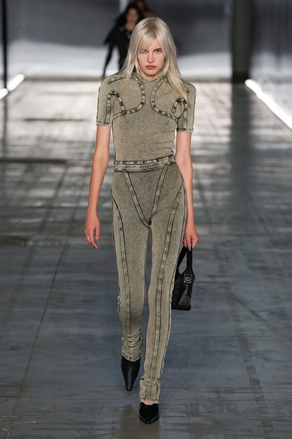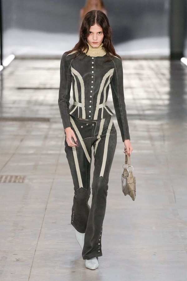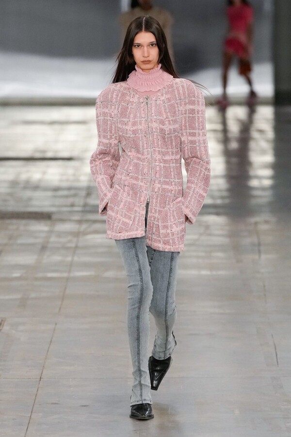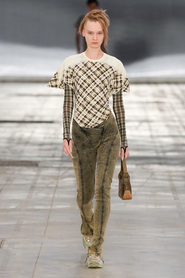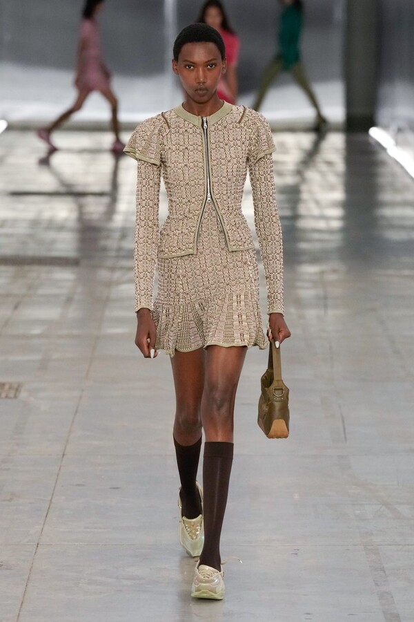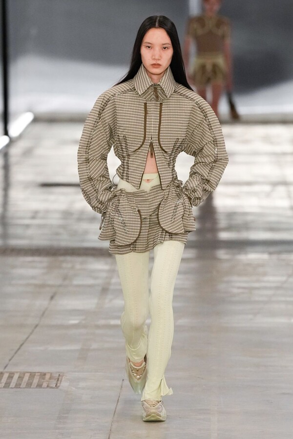 这些设计与 KNWLS 的主线系列无缝衔接。氯丁橡胶粘合皮夹克的廓形与圆肩宛如盔甲,褶边式衣领细节则更显锋芒,仿若击剑服。针织格纹夹克和褶皱裙层叠搭配短款上衣,注入活力的基础上通过粗犷纹理和倾斜比例进行了颠覆。紧身棉质和管状针织莱卡面料的修身单品,均饰有类似运动贴布的人体工学滚边,在增强了物理质感的同时,又隐含着近乎实用的用途。