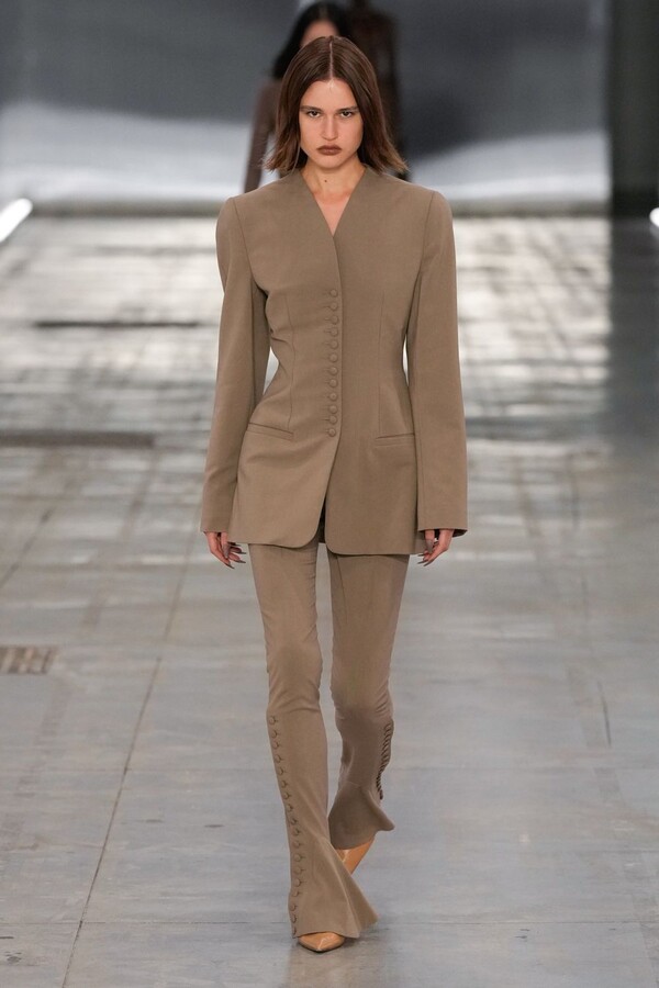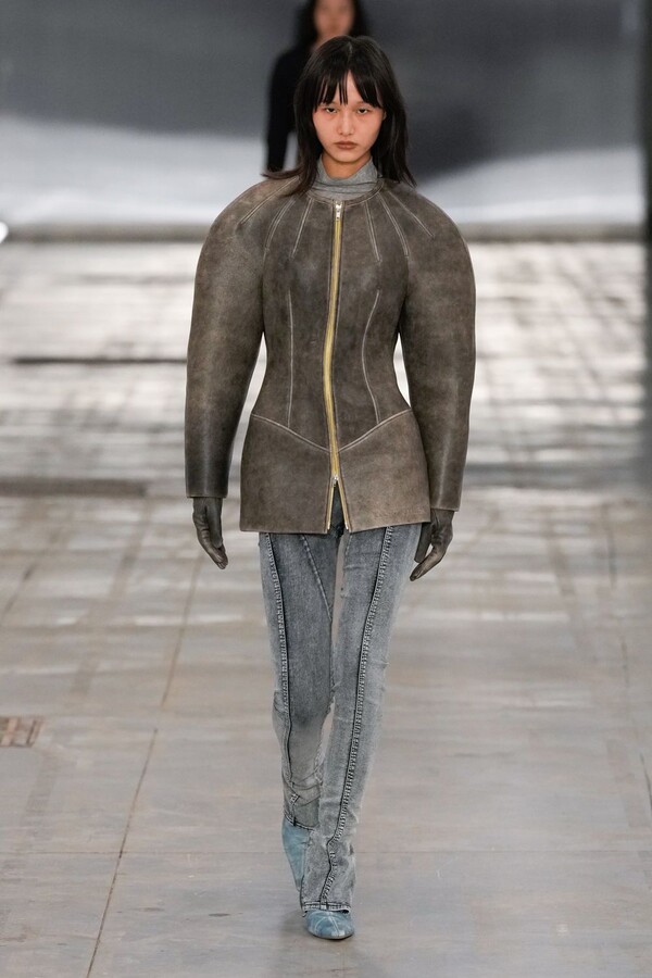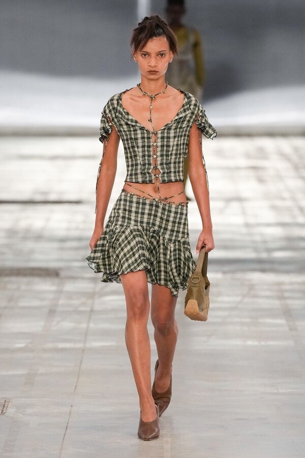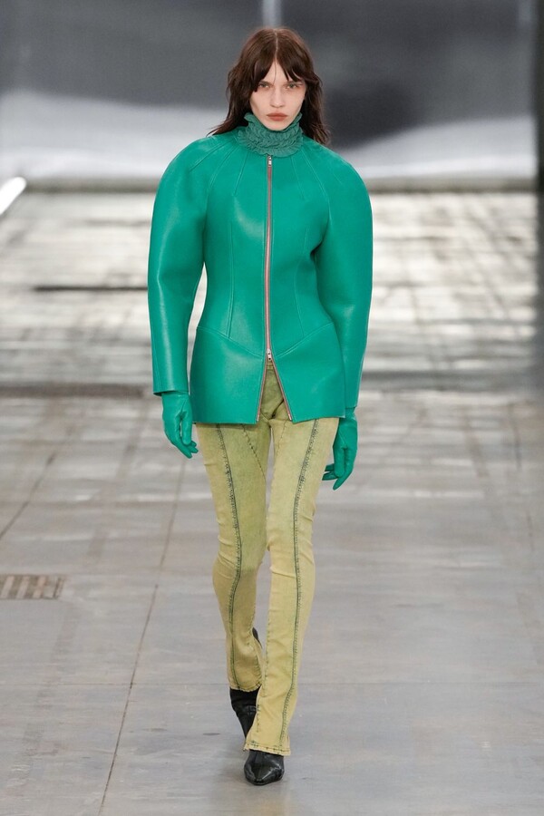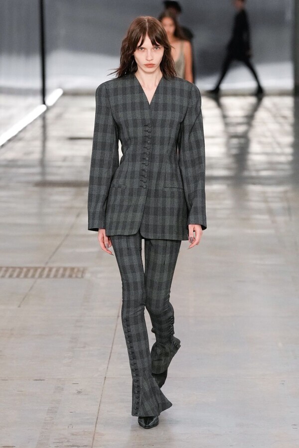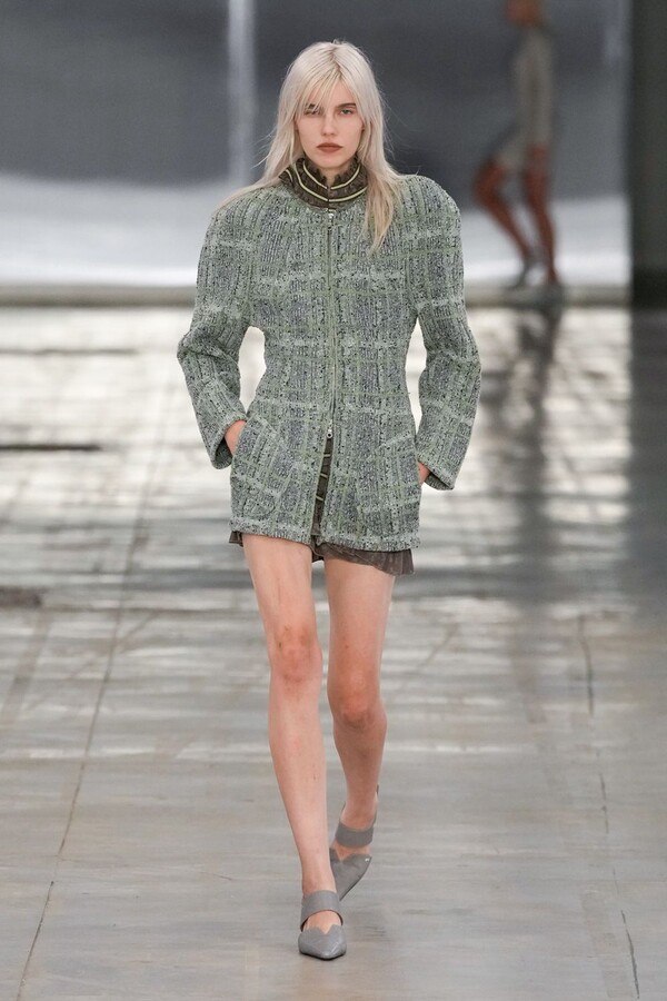 这些设计与 KNWLS 的主线系列无缝衔接。氯丁橡胶粘合皮夹克的廓形与圆肩宛如盔甲,褶边式衣领细节则更显锋芒,仿若击剑服。针织格纹夹克和褶皱裙层叠搭配短款上衣,注入活力的基础上通过粗犷纹理和倾斜比例进行了颠覆。紧身棉质和管状针织莱卡面料的修身单品,均饰有类似运动贴布的人体工学滚边,在增强了物理质感的同时,又隐含着近乎实用的用途。