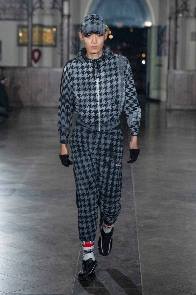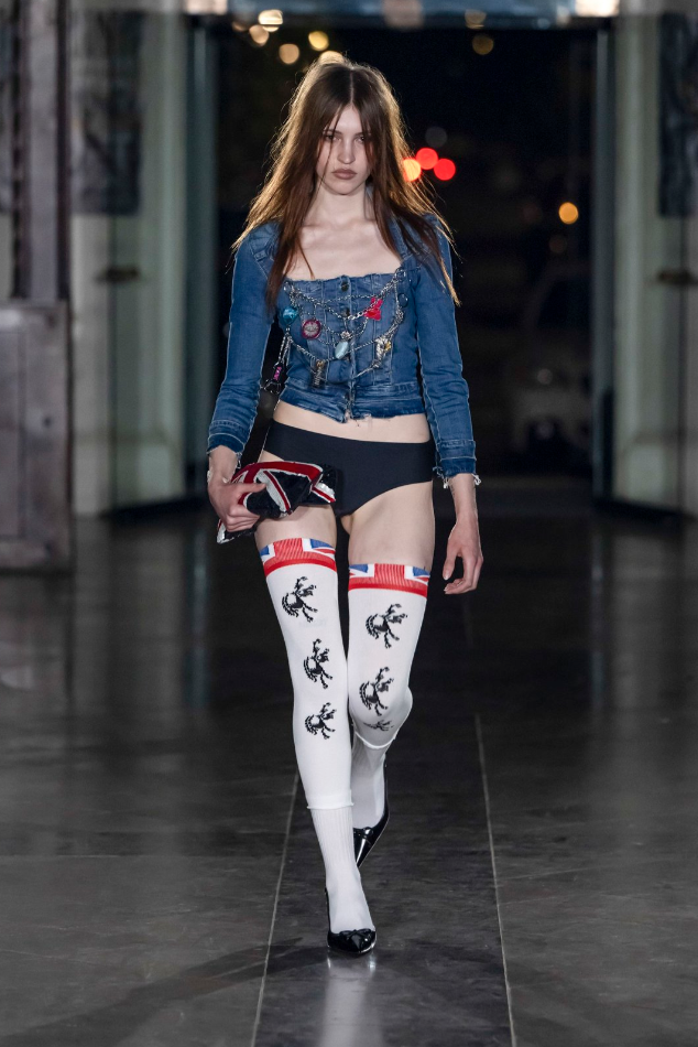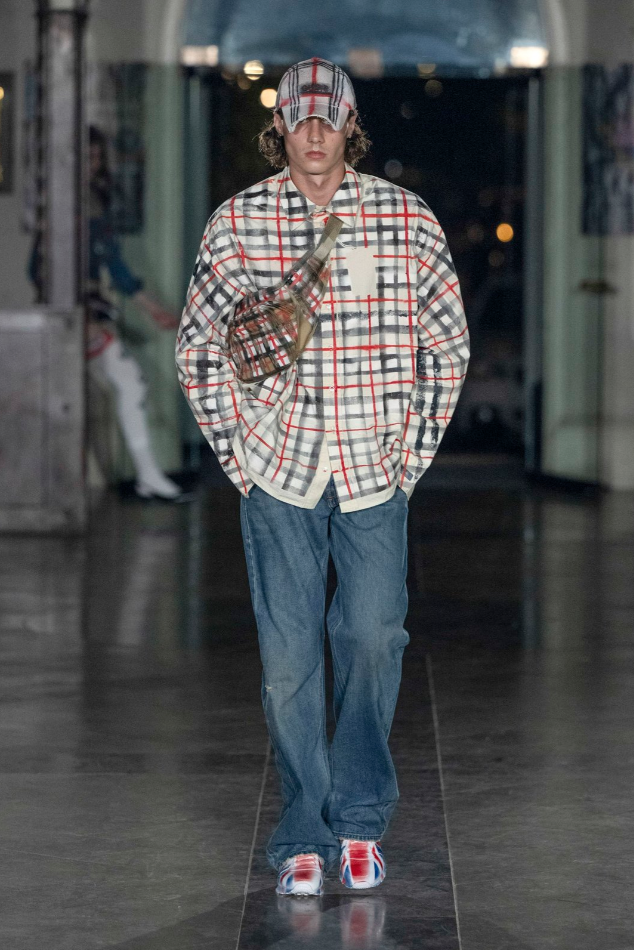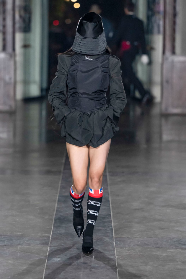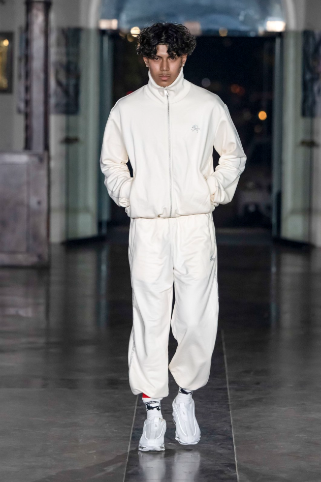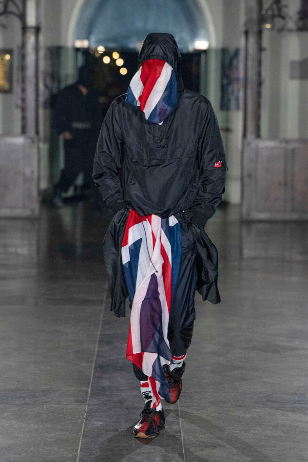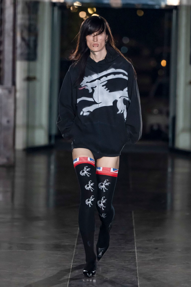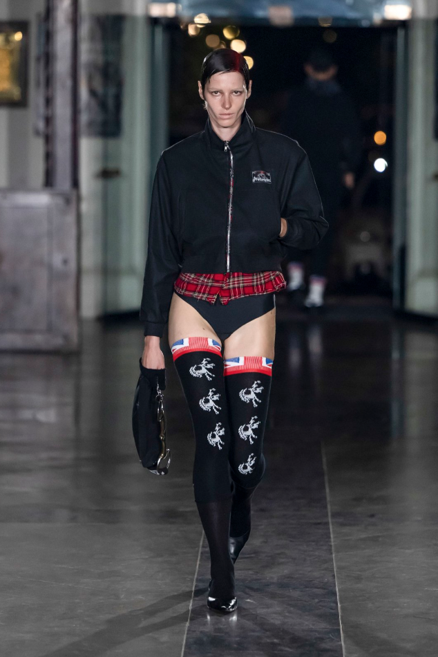 在整个系列中,袜类化身为防暴装备,紧身连衣裙呼应了中世纪的廓形,印花旗帜连衣裙则如同文化团结的旗帜飘扬。格纹、千鸟格、Reebok Classics 和 DMX 元素在致敬英伦根源的同时,也坚持探索着新的可能性。整场秀并非一首挽歌,而更像是一声凝聚的号召——提醒我们在充满不确定性的时代,文化记忆的碎片仍然可以被重塑成共同的身份认同。