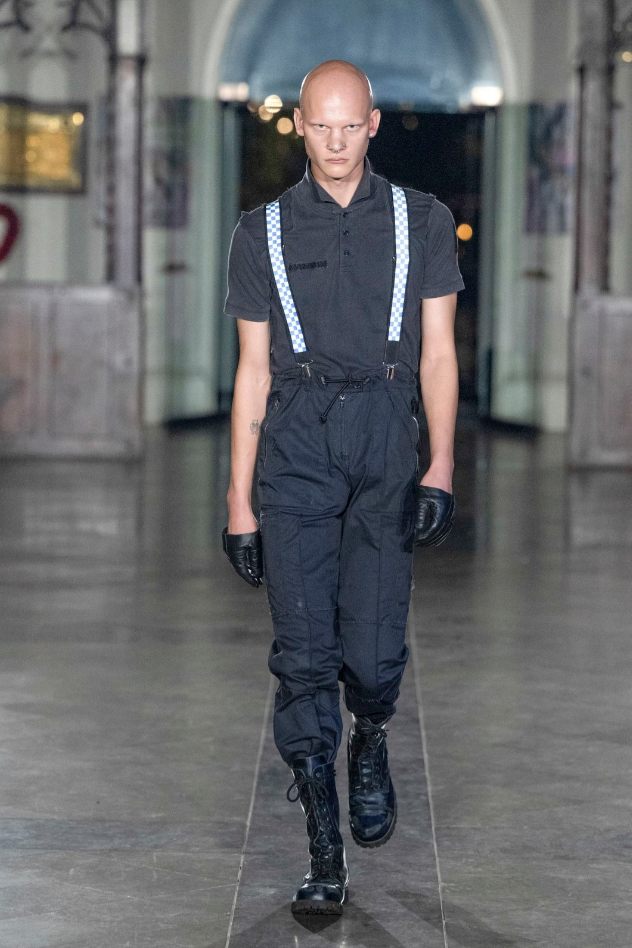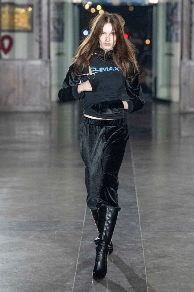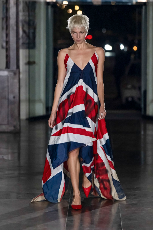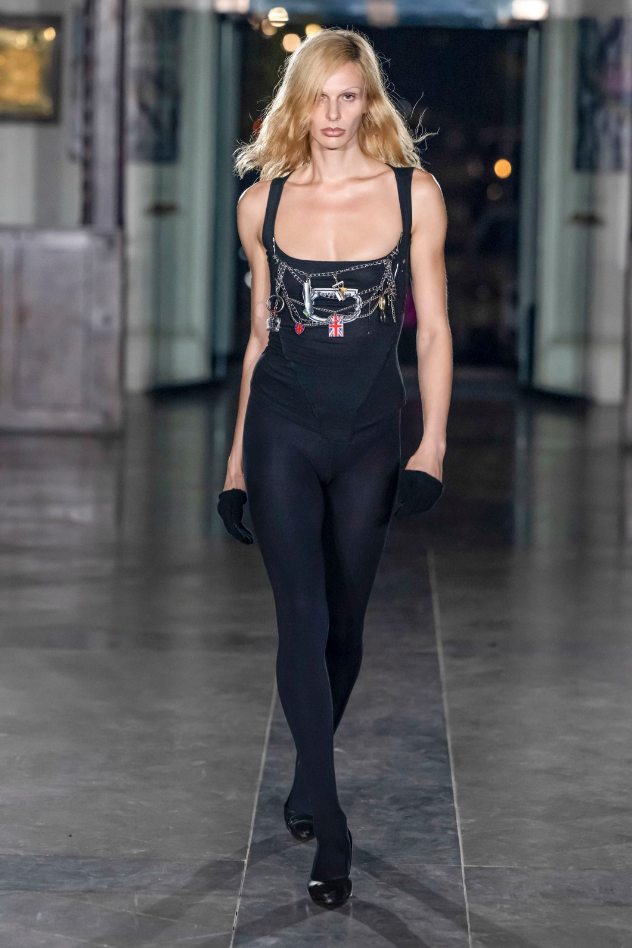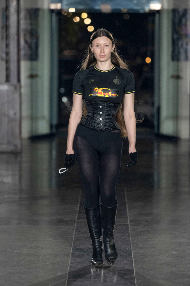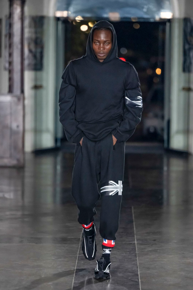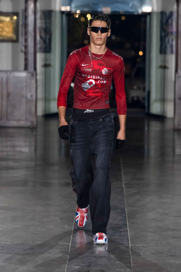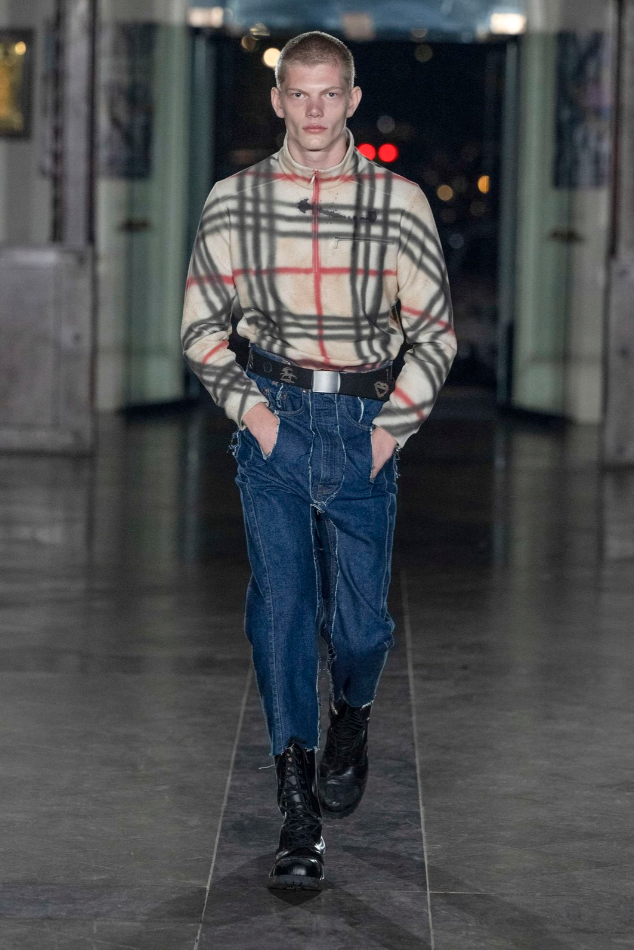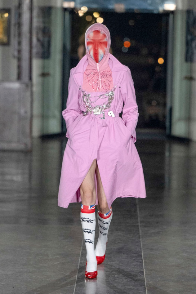 在整个系列中,袜类化身为防暴装备,紧身连衣裙呼应了中世纪的廓形,印花旗帜连衣裙则如同文化团结的旗帜飘扬。格纹、千鸟格、Reebok Classics 和 DMX 元素在致敬英伦根源的同时,也坚持探索着新的可能性。整场秀并非一首挽歌,而更像是一声凝聚的号召——提醒我们在充满不确定性的时代,文化记忆的碎片仍然可以被重塑成共同的身份认同。