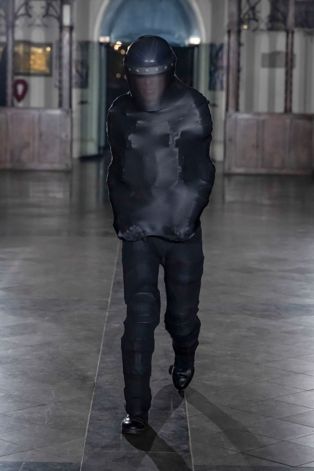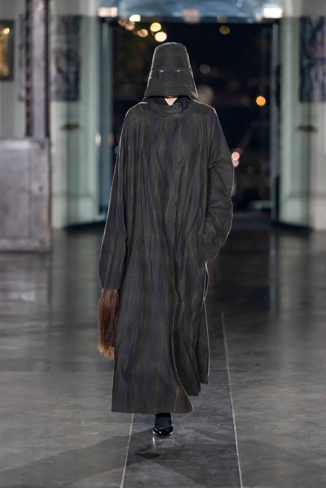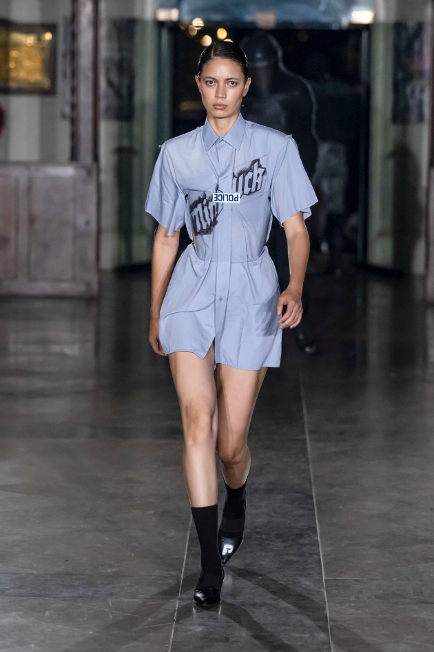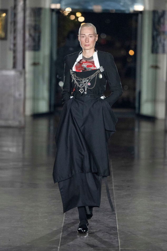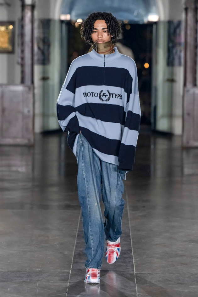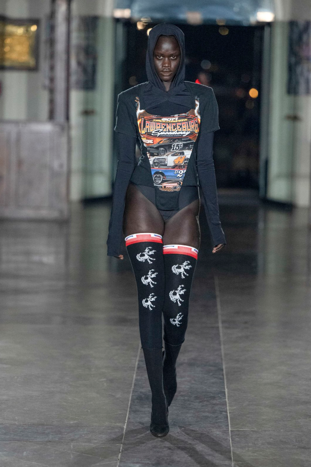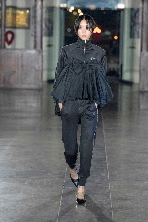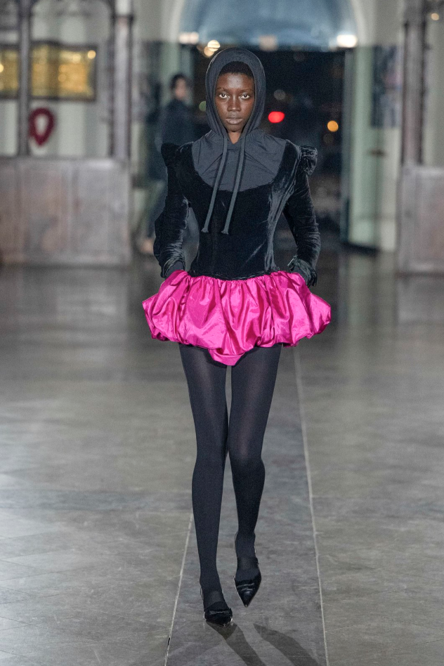 在整个系列中,袜类化身为防暴装备,紧身连衣裙呼应了中世纪的廓形,印花旗帜连衣裙则如同文化团结的旗帜飘扬。格纹、千鸟格、Reebok Classics 和 DMX 元素在致敬英伦根源的同时,也坚持探索着新的可能性。整场秀并非一首挽歌,而更像是一声凝聚的号召——提醒我们在充满不确定性的时代,文化记忆的碎片仍然可以被重塑成共同的身份认同。
