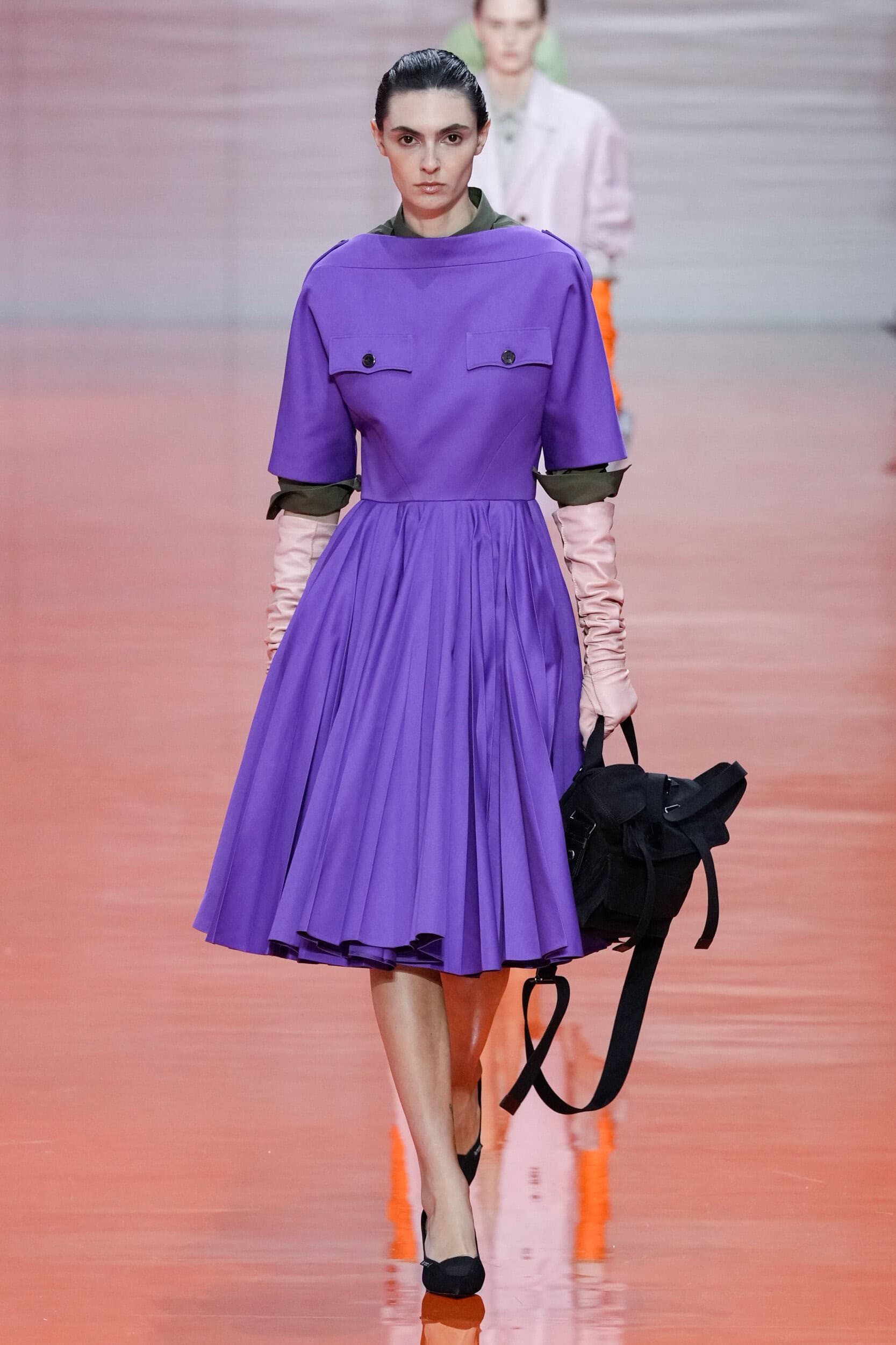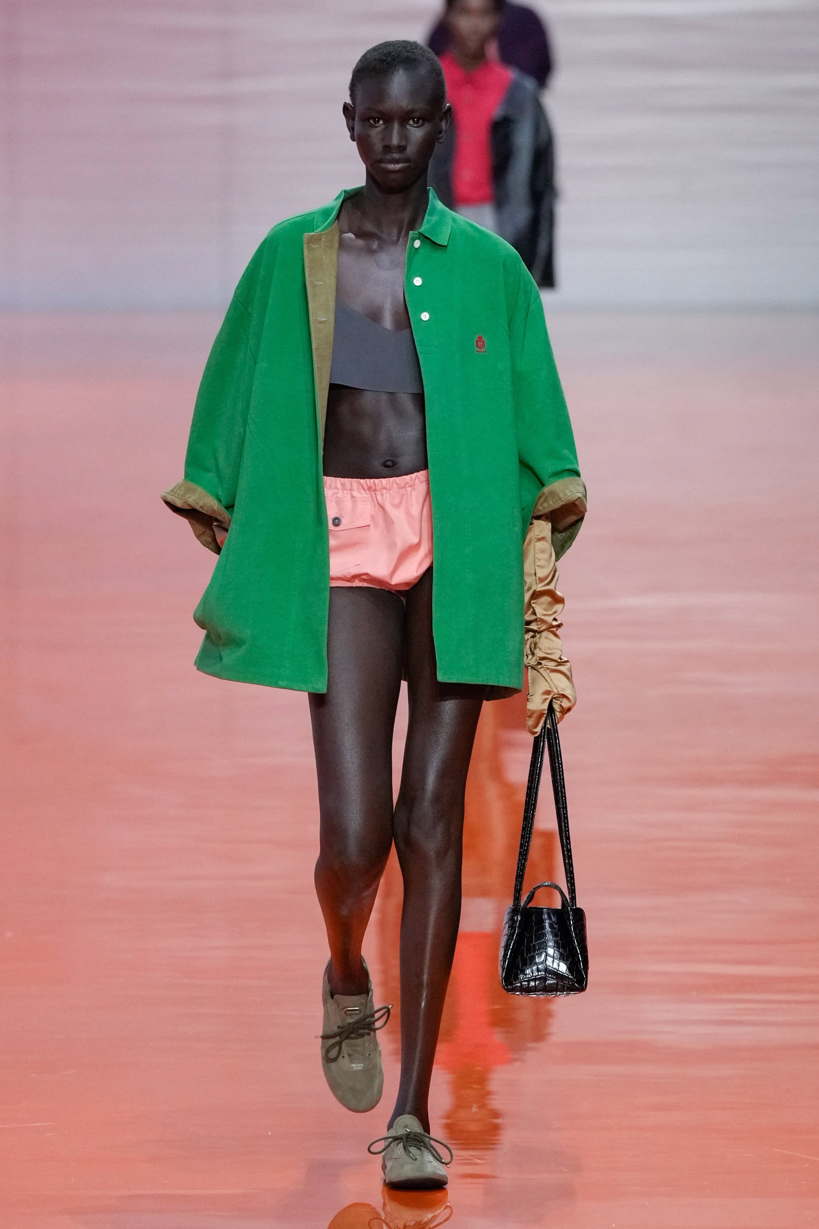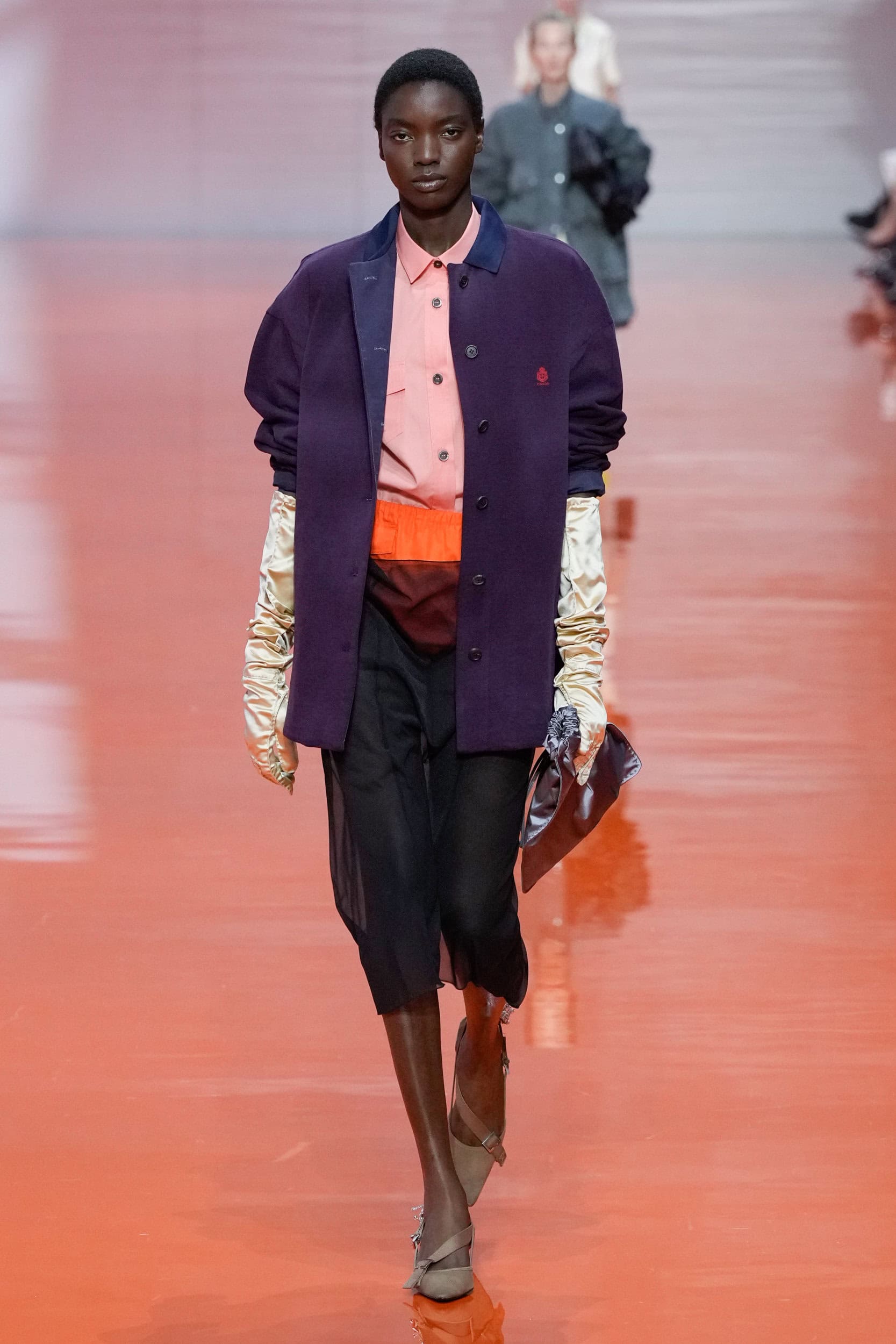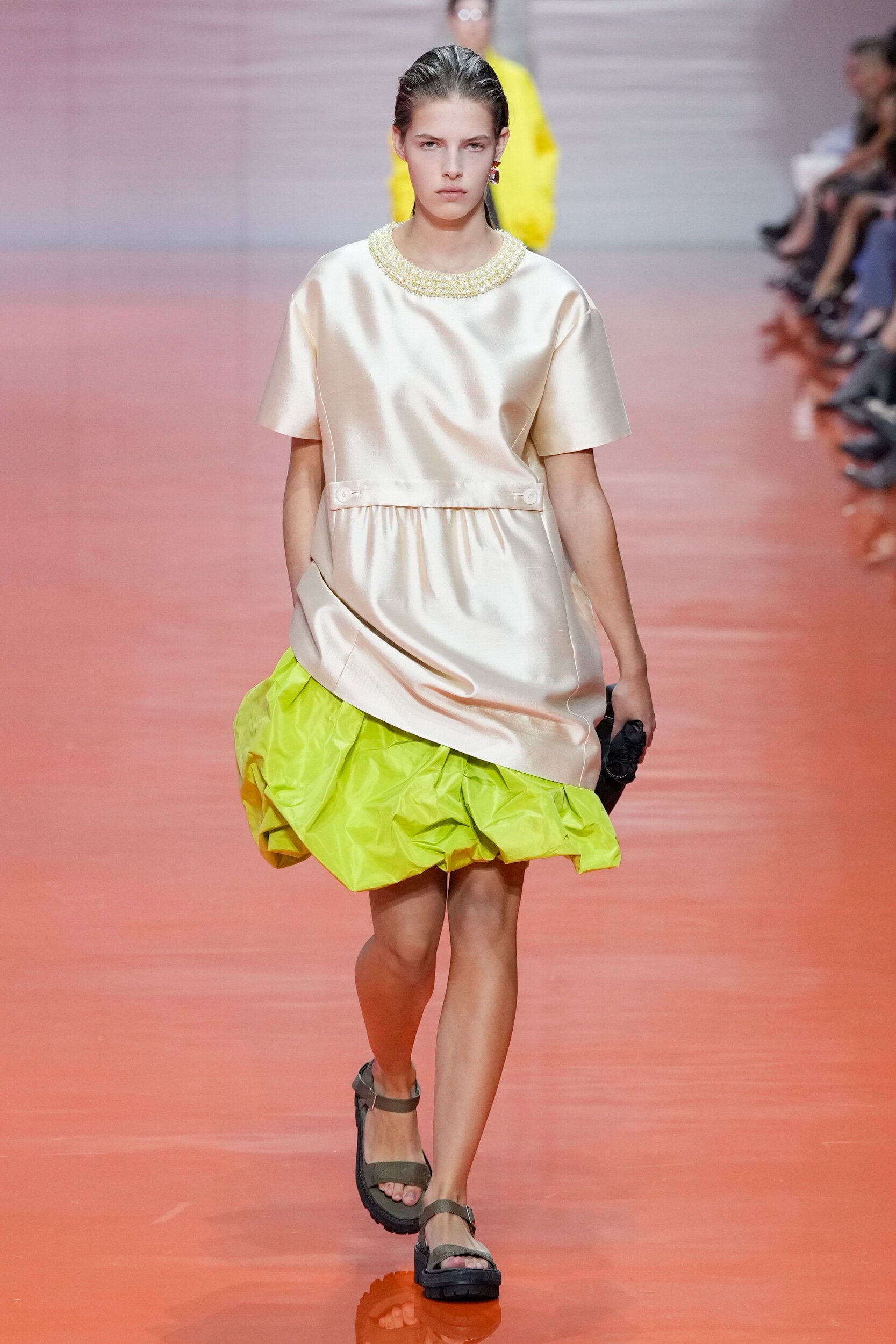 色彩方面,设计师大胆使用鲜艳的酸绿色、橙色和明亮的紫色等,使整个系列充满活力与自由感。经典的直筒裙被拉高并倾斜,露出蓬松的裙摆,增加了层次感和动感。系列中还融入了运动风与实用主义元素,如改造过的 Polo 衫与实用主义连体裤,充分体现了设计师对现代女性穿着需求的回应。