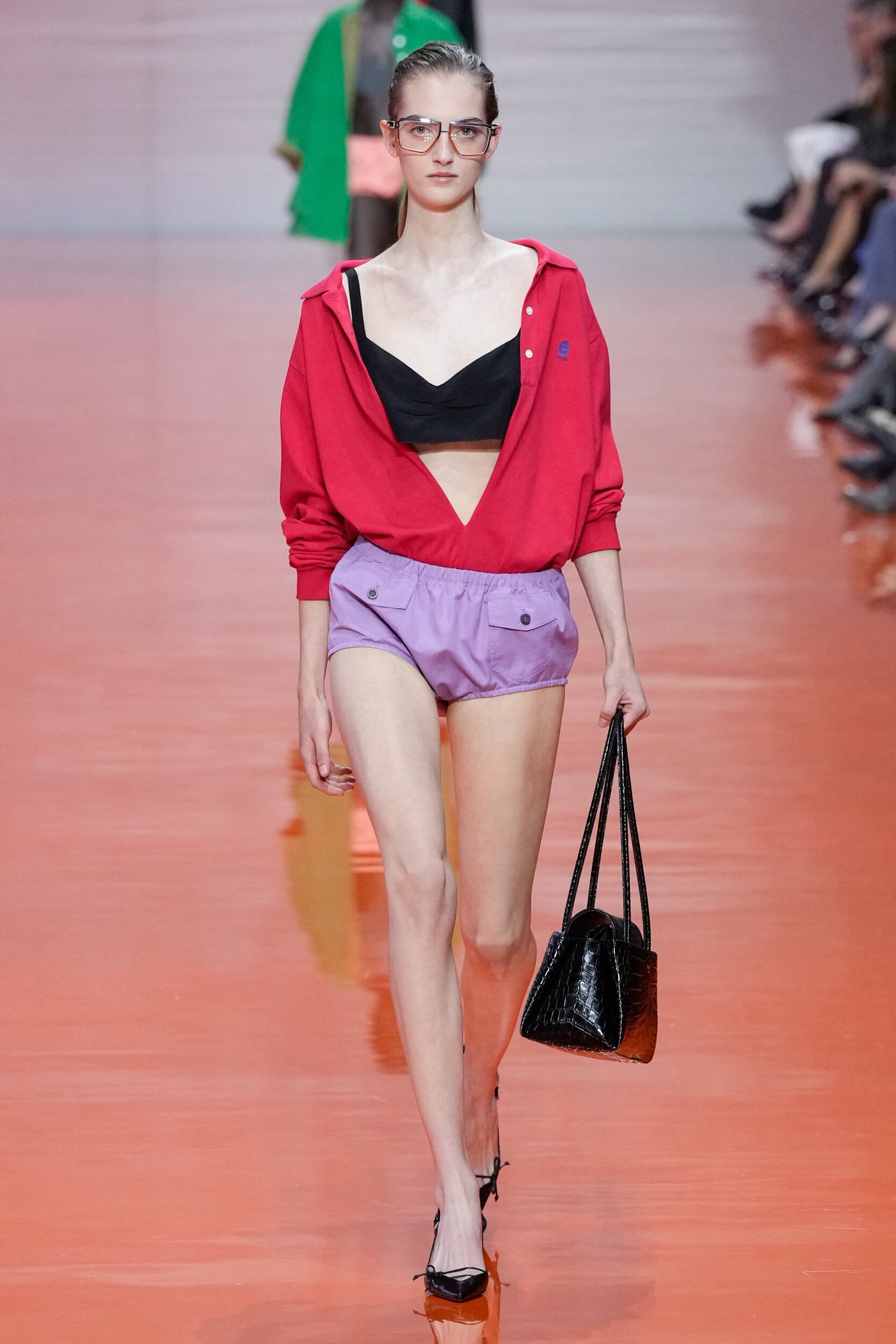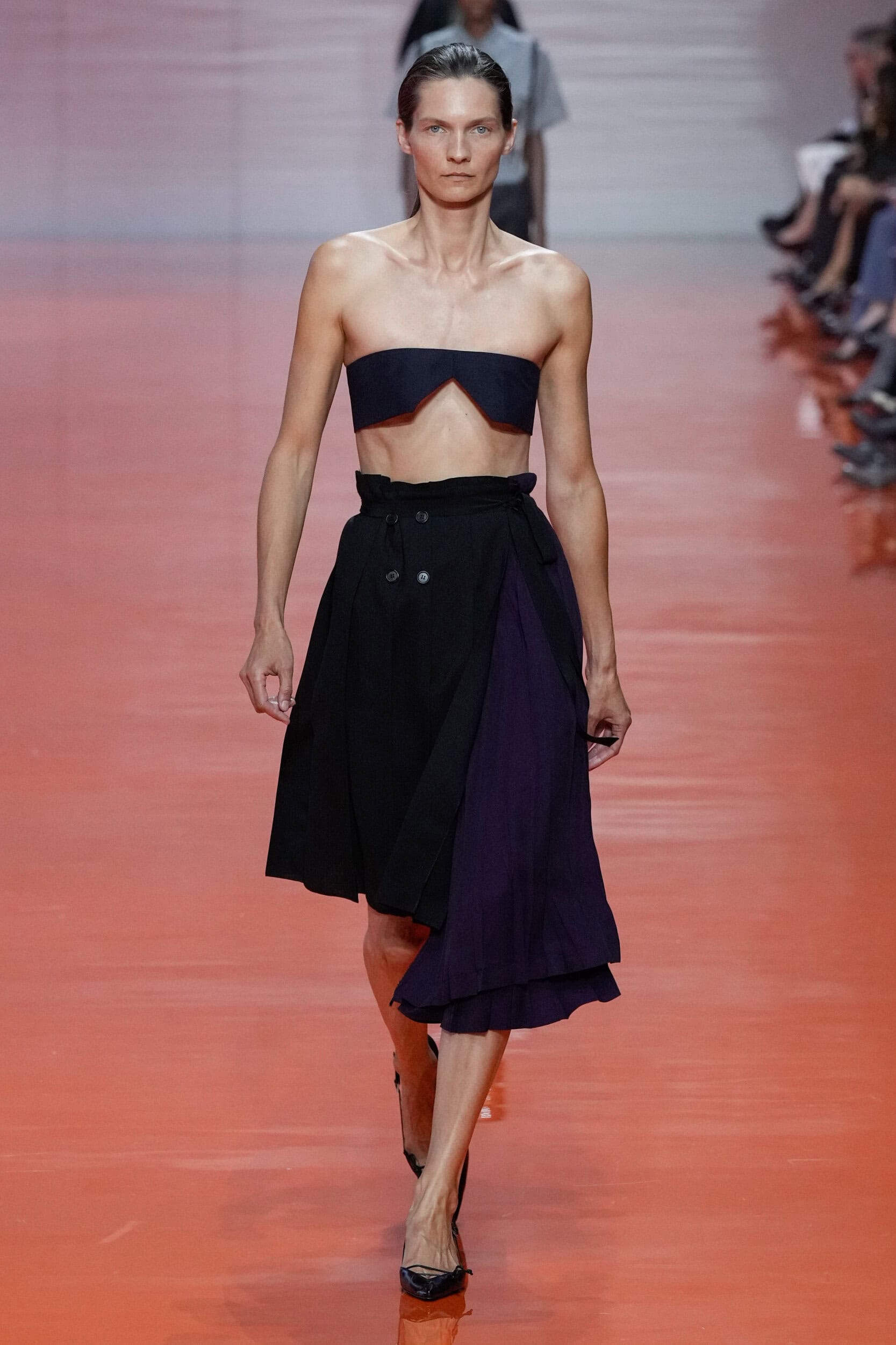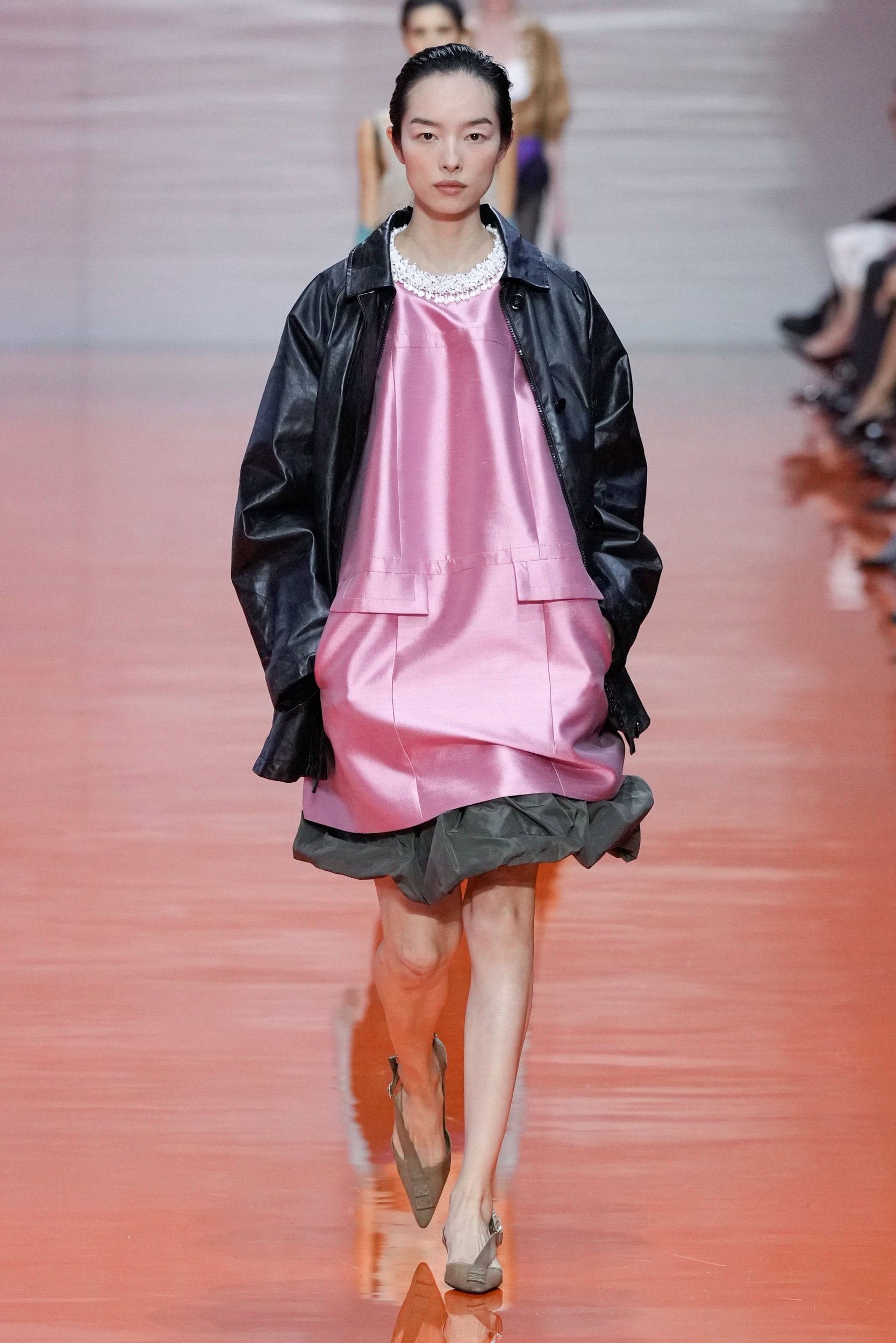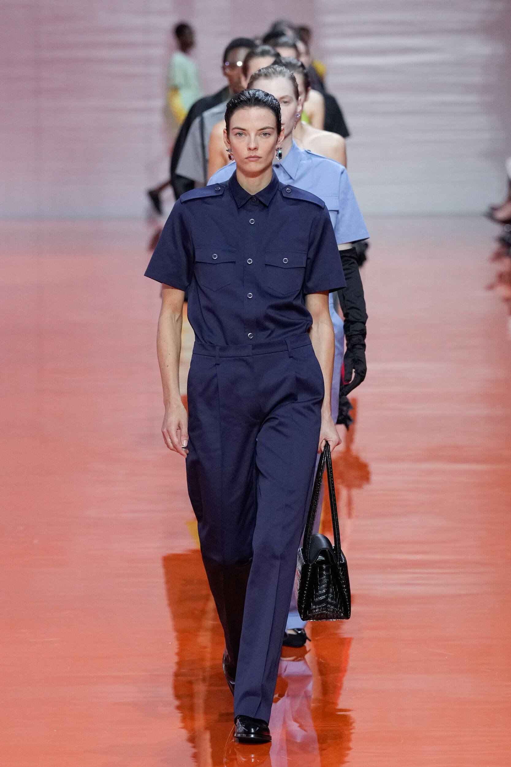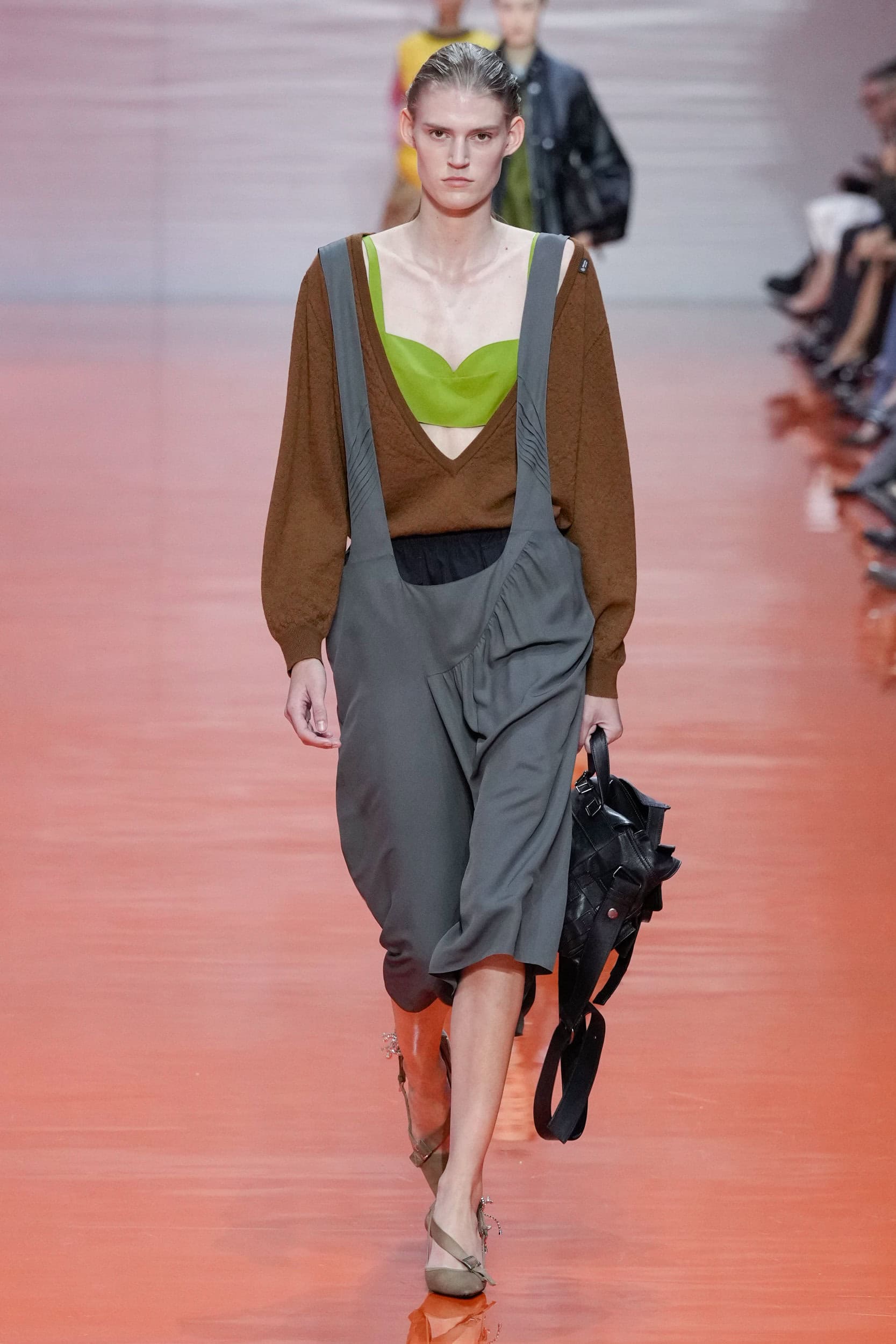 色彩方面,设计师大胆使用鲜艳的酸绿色、橙色和明亮的紫色等,使整个系列充满活力与自由感。经典的直筒裙被拉高并倾斜,露出蓬松的裙摆,增加了层次感和动感。系列中还融入了运动风与实用主义元素,如改造过的 Polo 衫与实用主义连体裤,充分体现了设计师对现代女性穿着需求的回应。