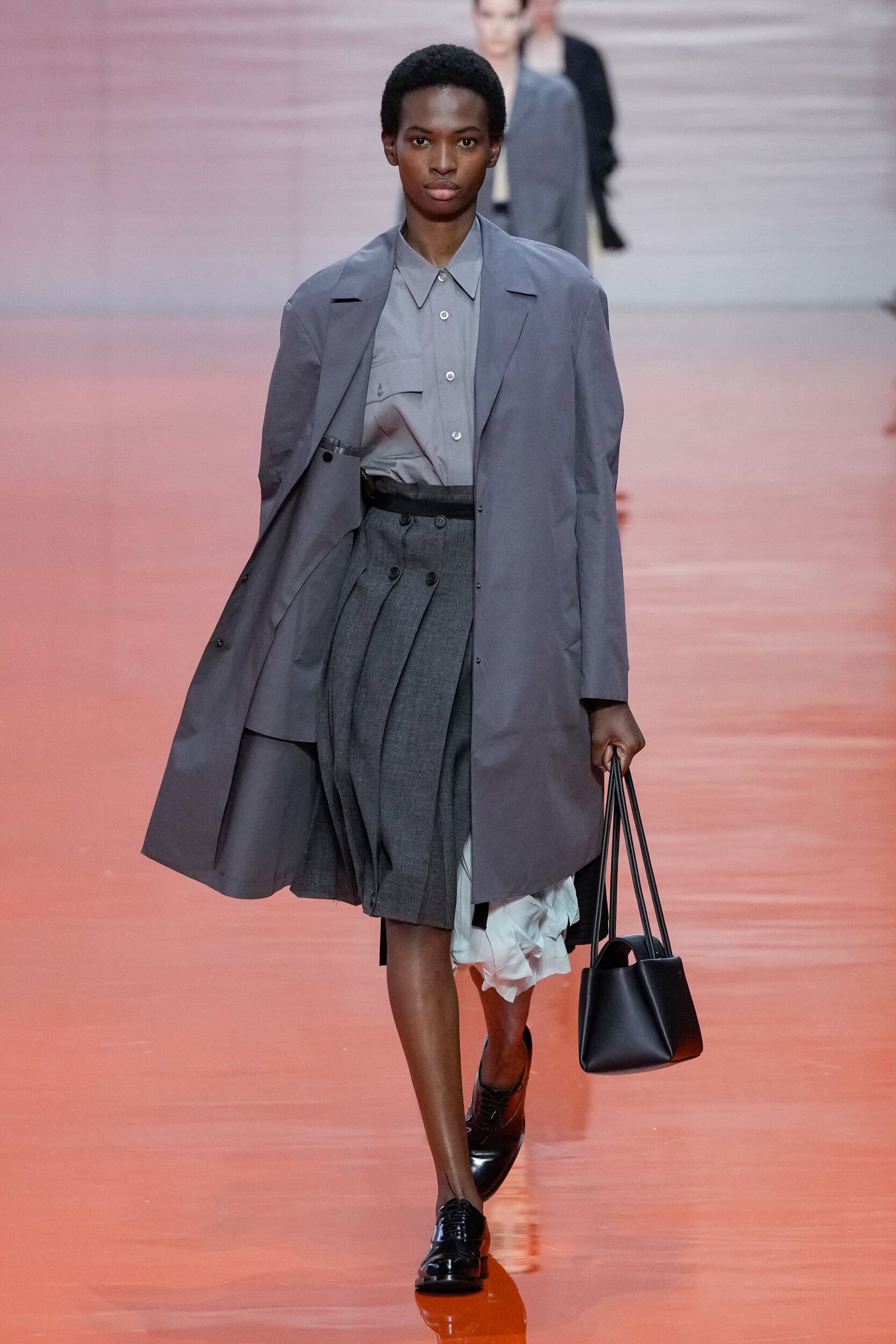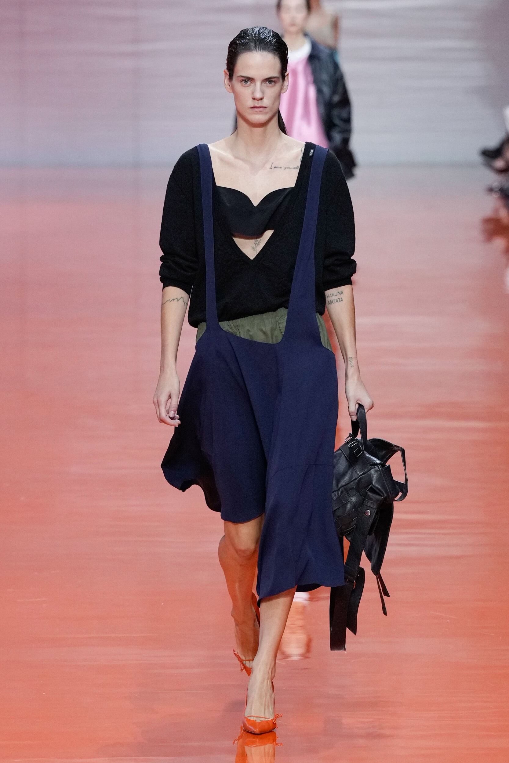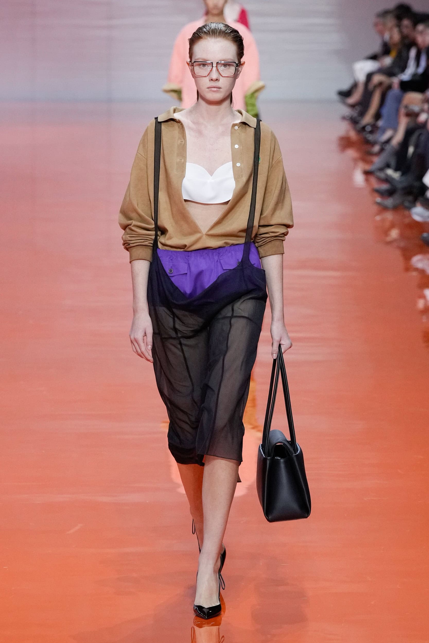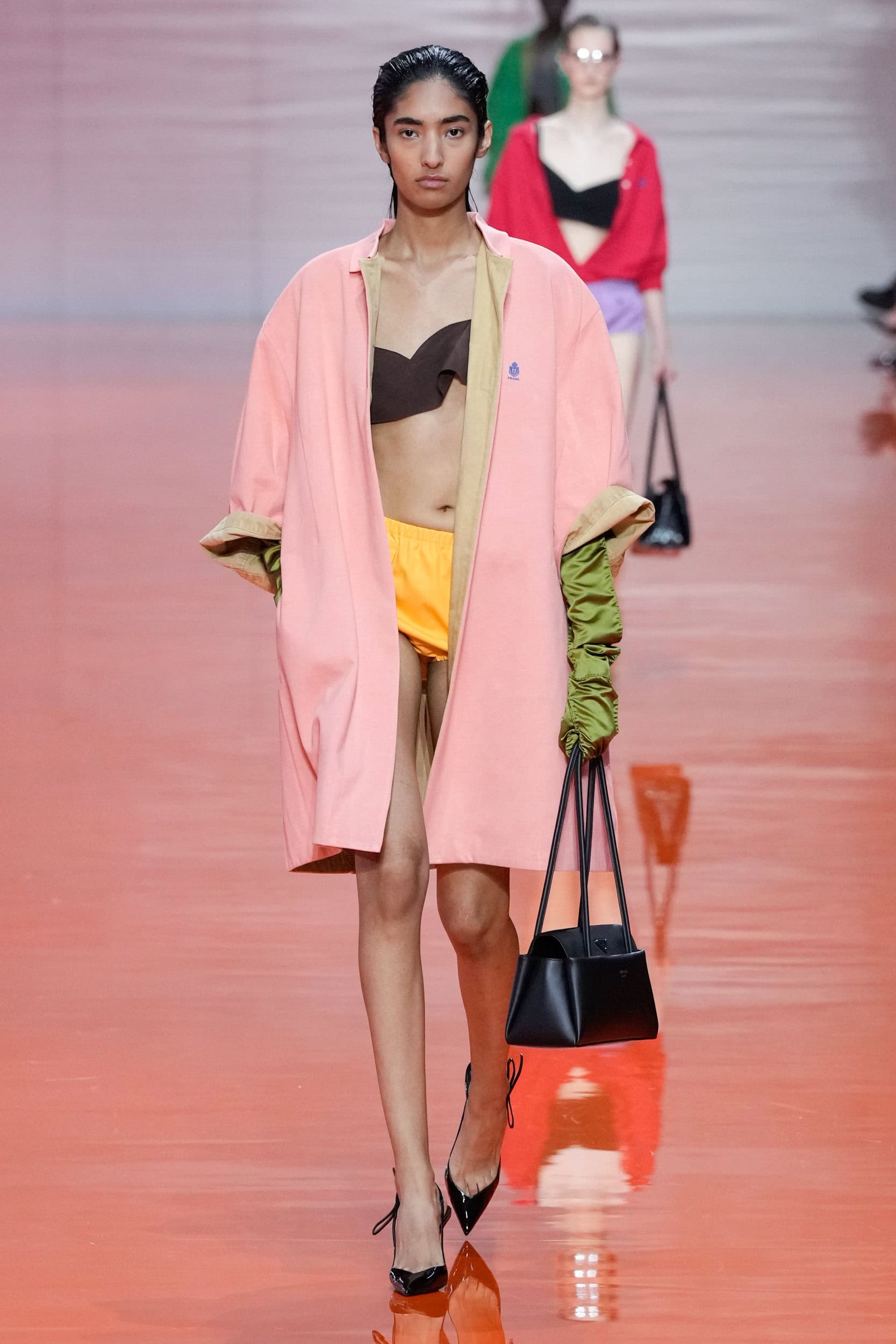 色彩方面,设计师大胆使用鲜艳的酸绿色、橙色和明亮的紫色等,使整个系列充满活力与自由感。经典的直筒裙被拉高并倾斜,露出蓬松的裙摆,增加了层次感和动感。系列中还融入了运动风与实用主义元素,如改造过的 Polo 衫与实用主义连体裤,充分体现了设计师对现代女性穿着需求的回应。