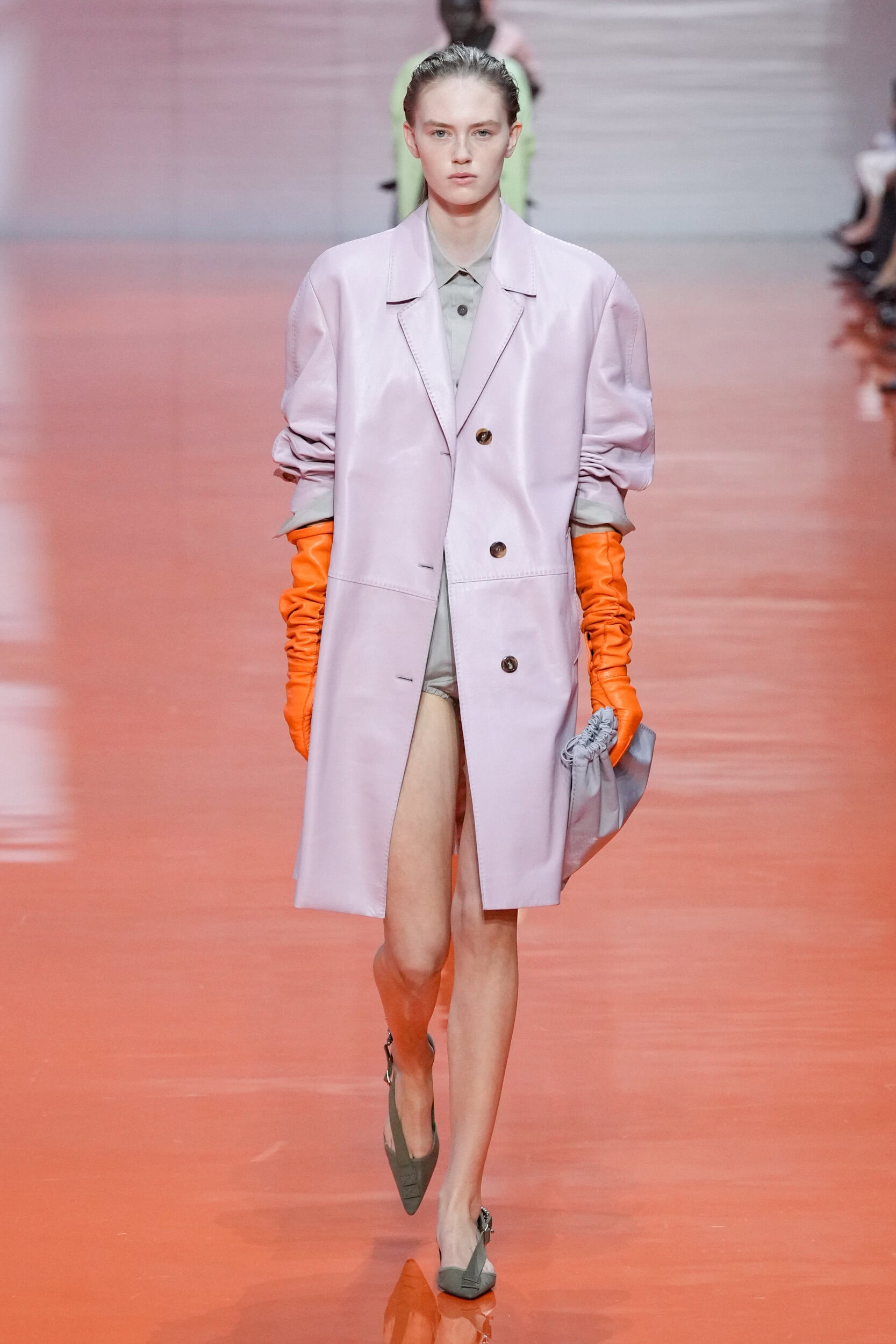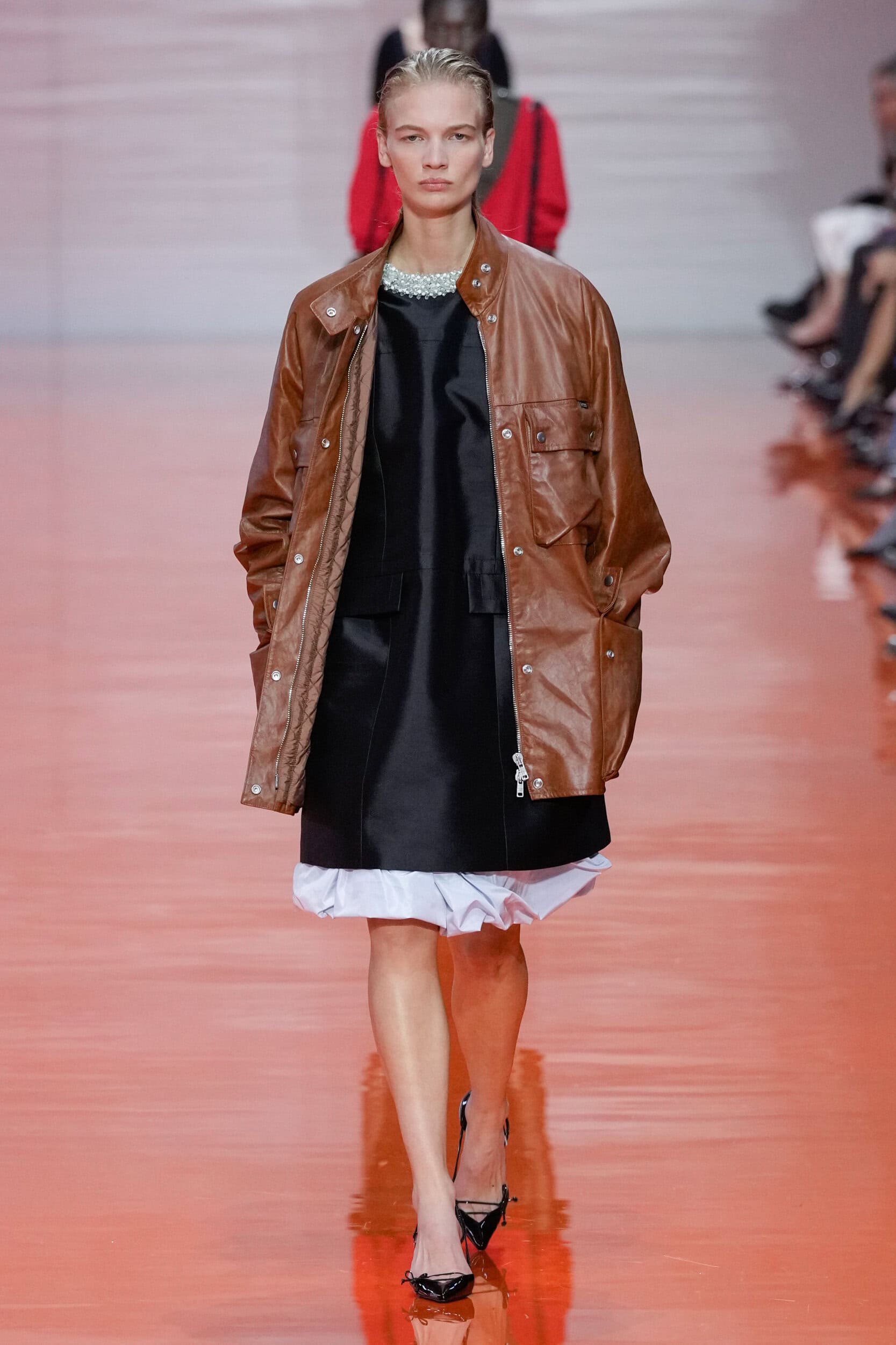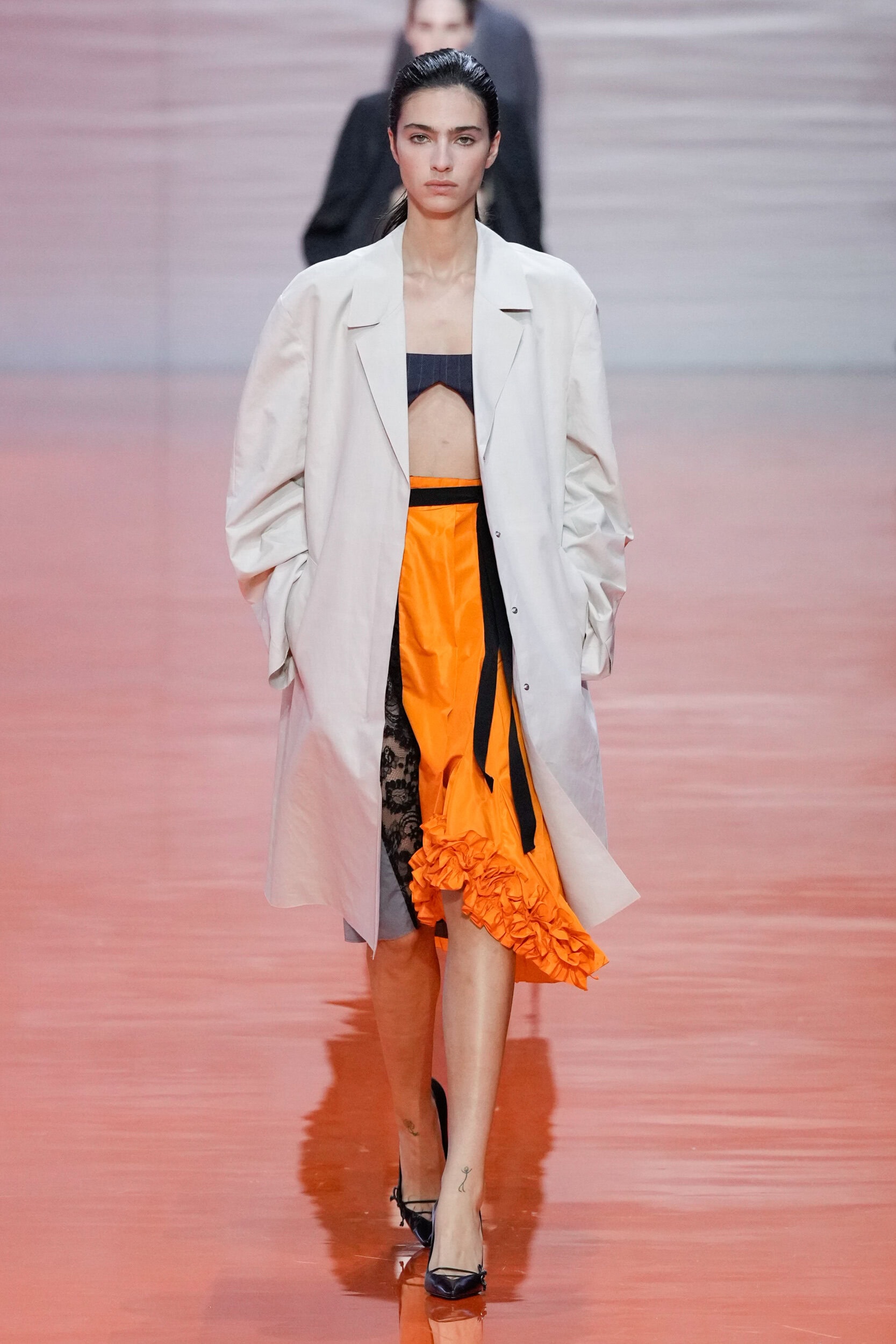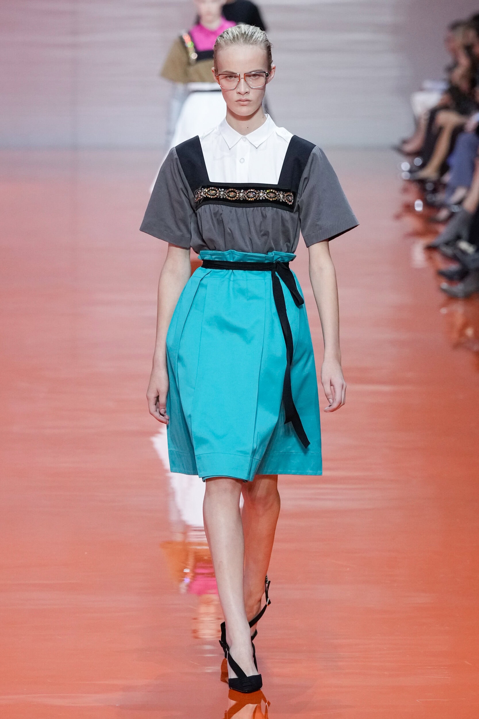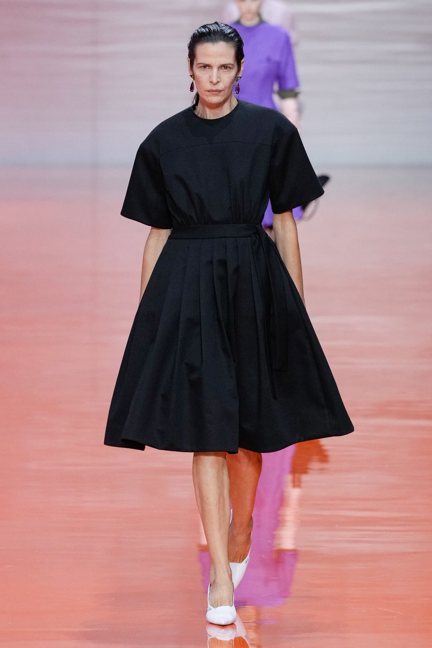 色彩方面,设计师大胆使用鲜艳的酸绿色、橙色和明亮的紫色等,使整个系列充满活力与自由感。经典的直筒裙被拉高并倾斜,露出蓬松的裙摆,增加了层次感和动感。系列中还融入了运动风与实用主义元素,如改造过的 Polo 衫与实用主义连体裤,充分体现了设计师对现代女性穿着需求的回应。