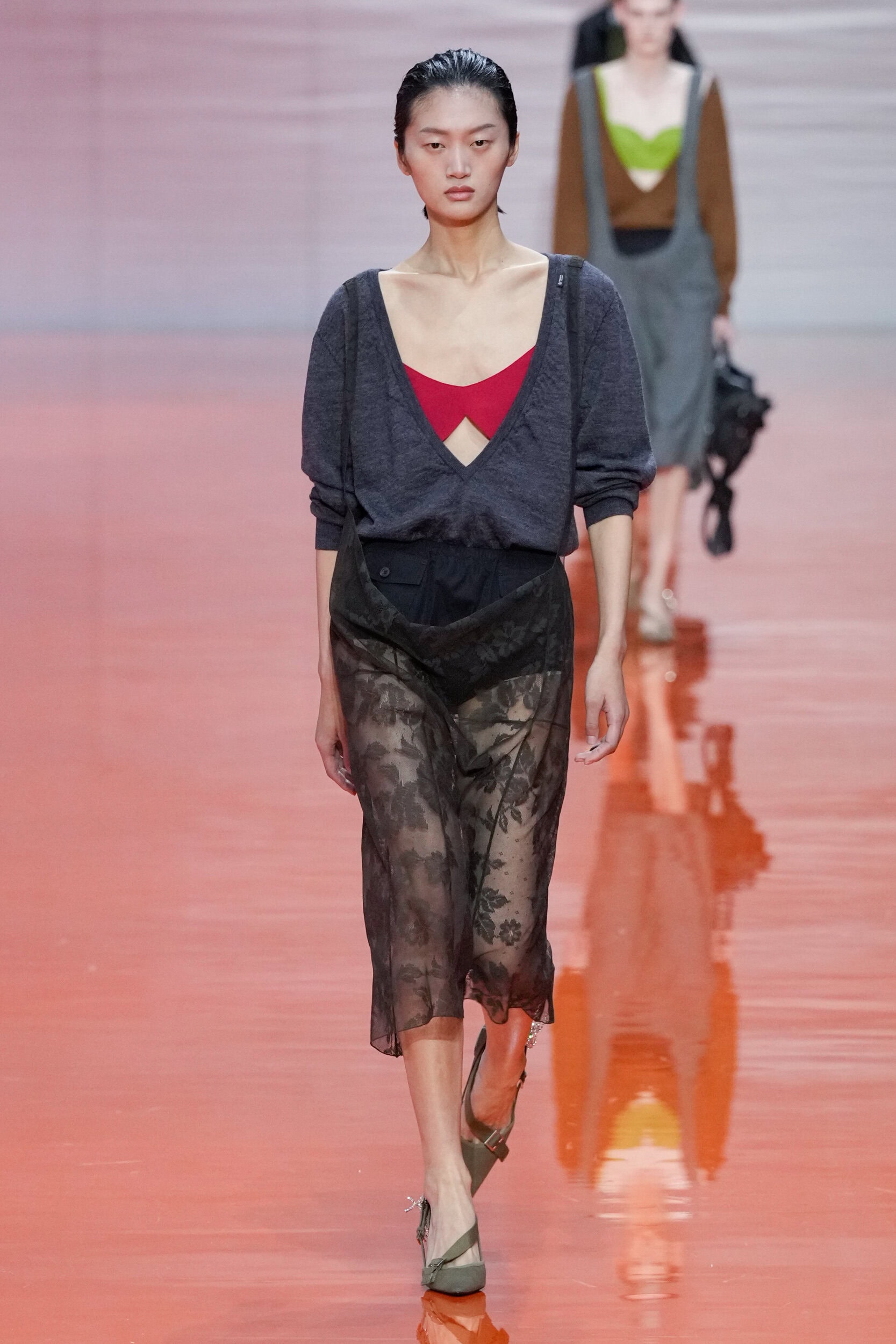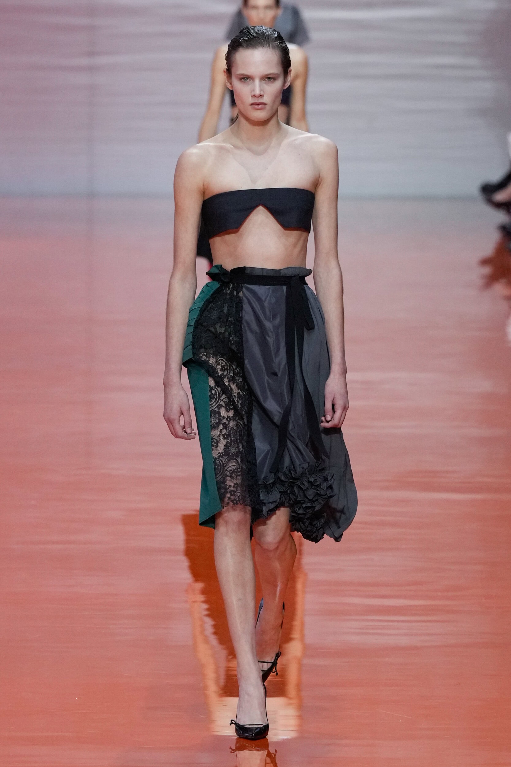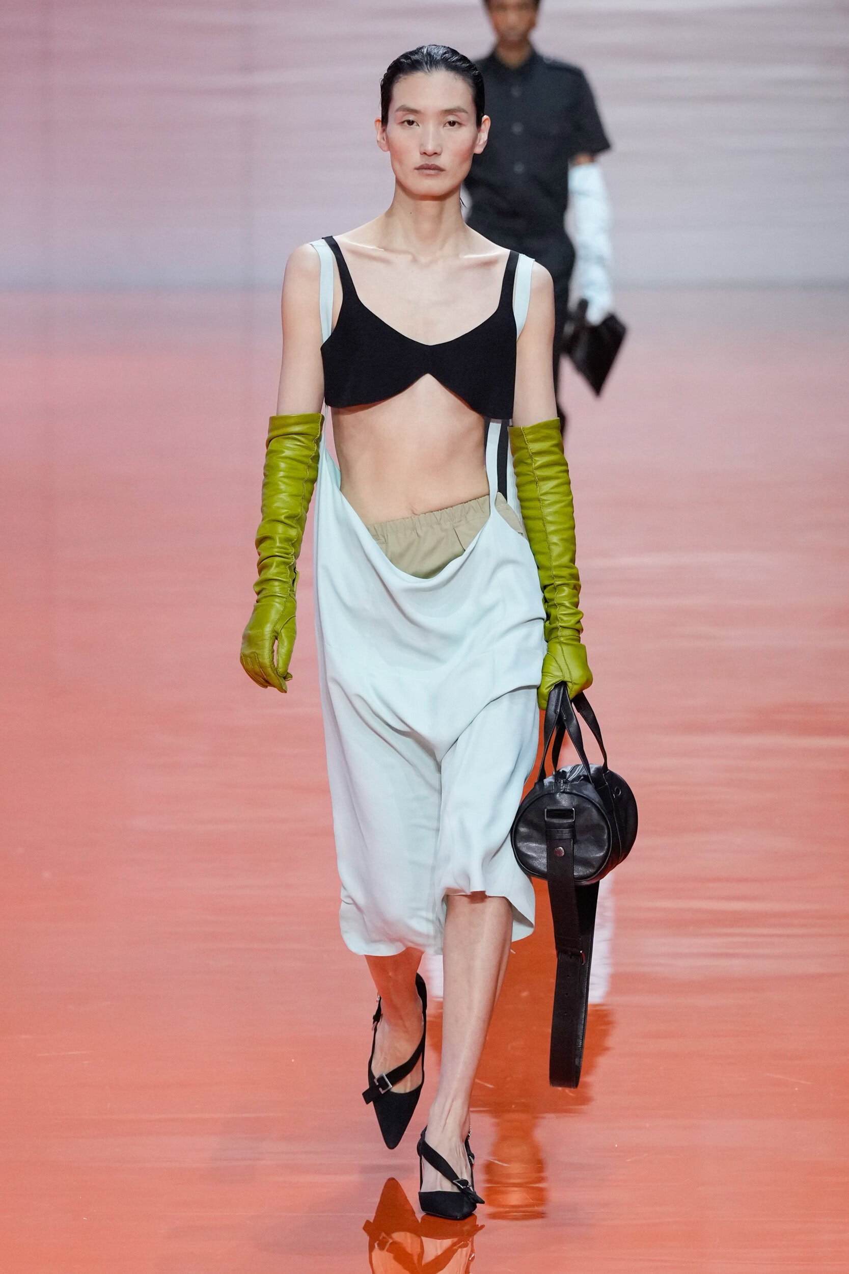 Miuccia Prada 与 Raf Simons 在本季系列中大胆摆脱传统时尚的束缚,探索如何在复杂的世界中通过服装表达自由。最显著的元素是轻薄的「胸罩」设计,采用轻盈的丝绸,几乎没有支撑功能,打破了「形式应跟随功能」的传统理念。这种设计与过去季节的「子弹胸罩」形成鲜明对比,展现了对现代女性身体的重新定义。裙子和衬衫的结构也被颠覆,传统上贴合腰部的裙子被改为从肩膀悬挂,呈现出围裙式的设计,极具实验性。