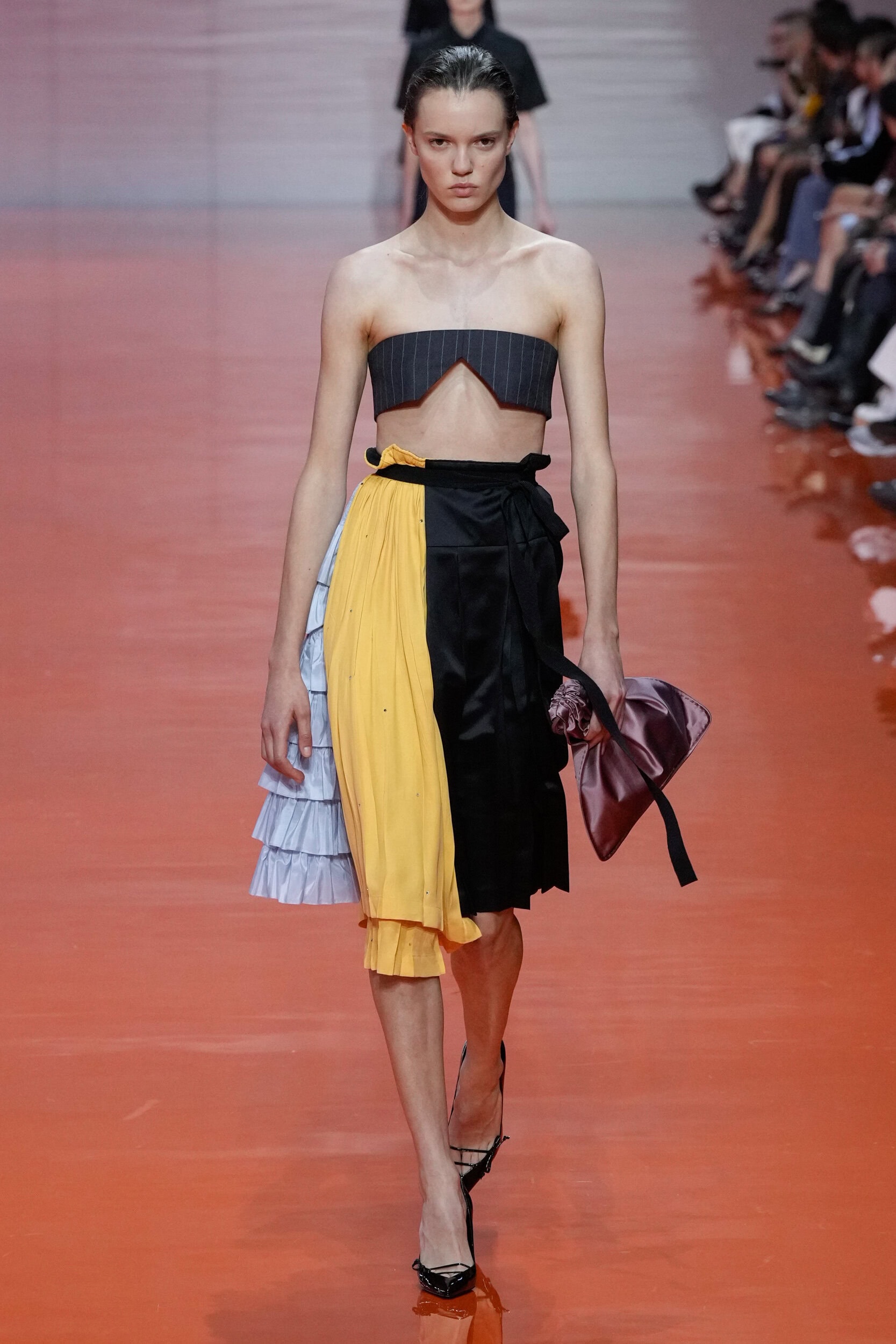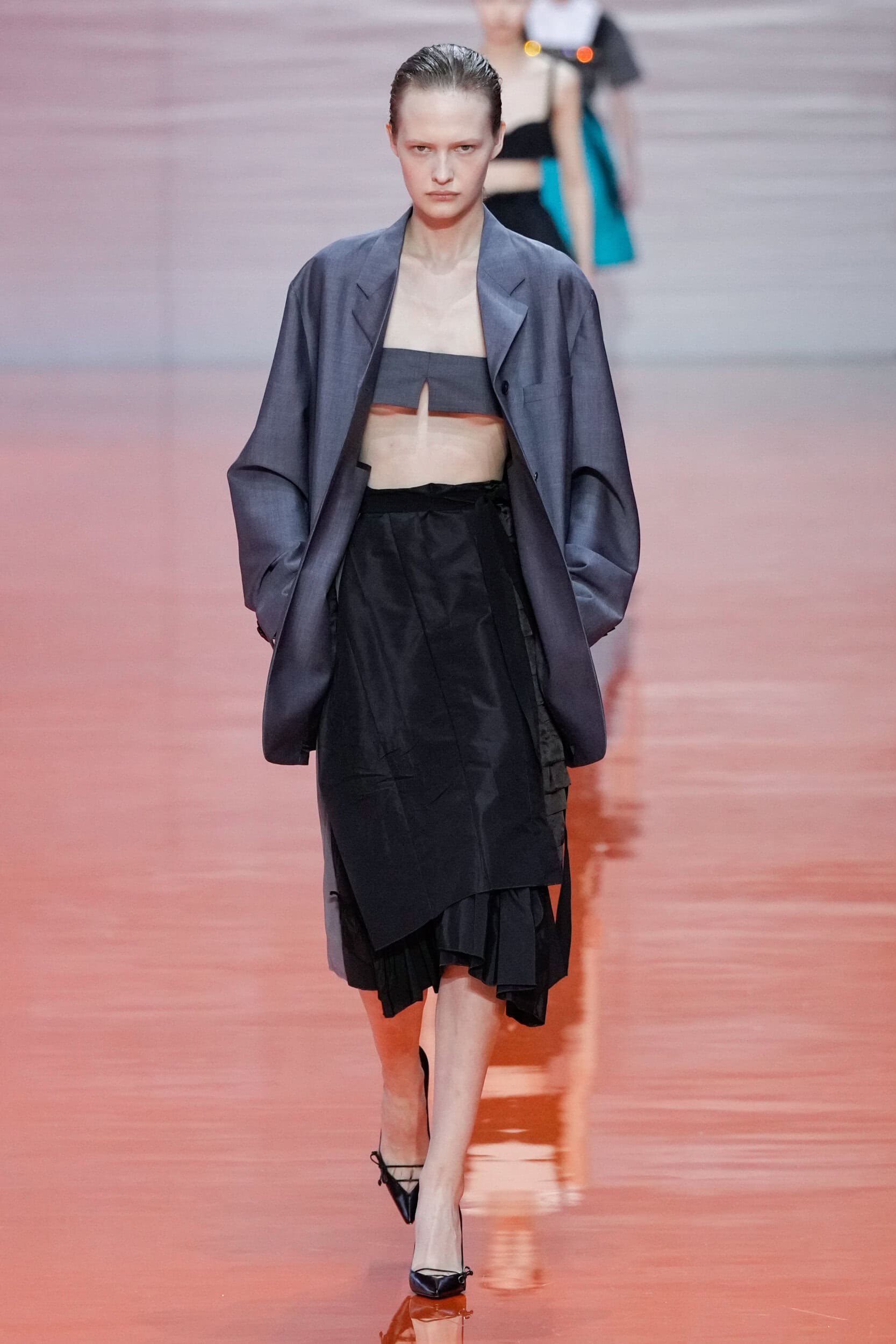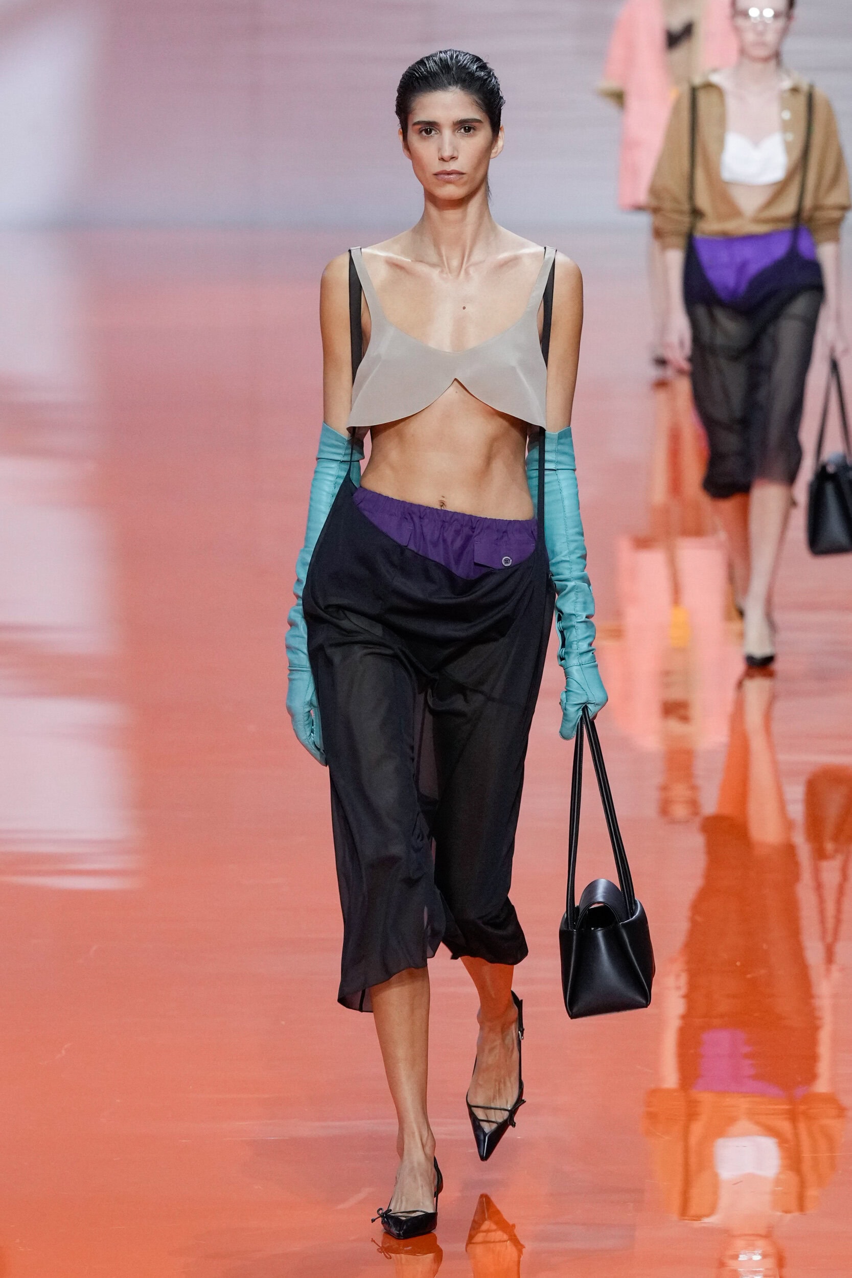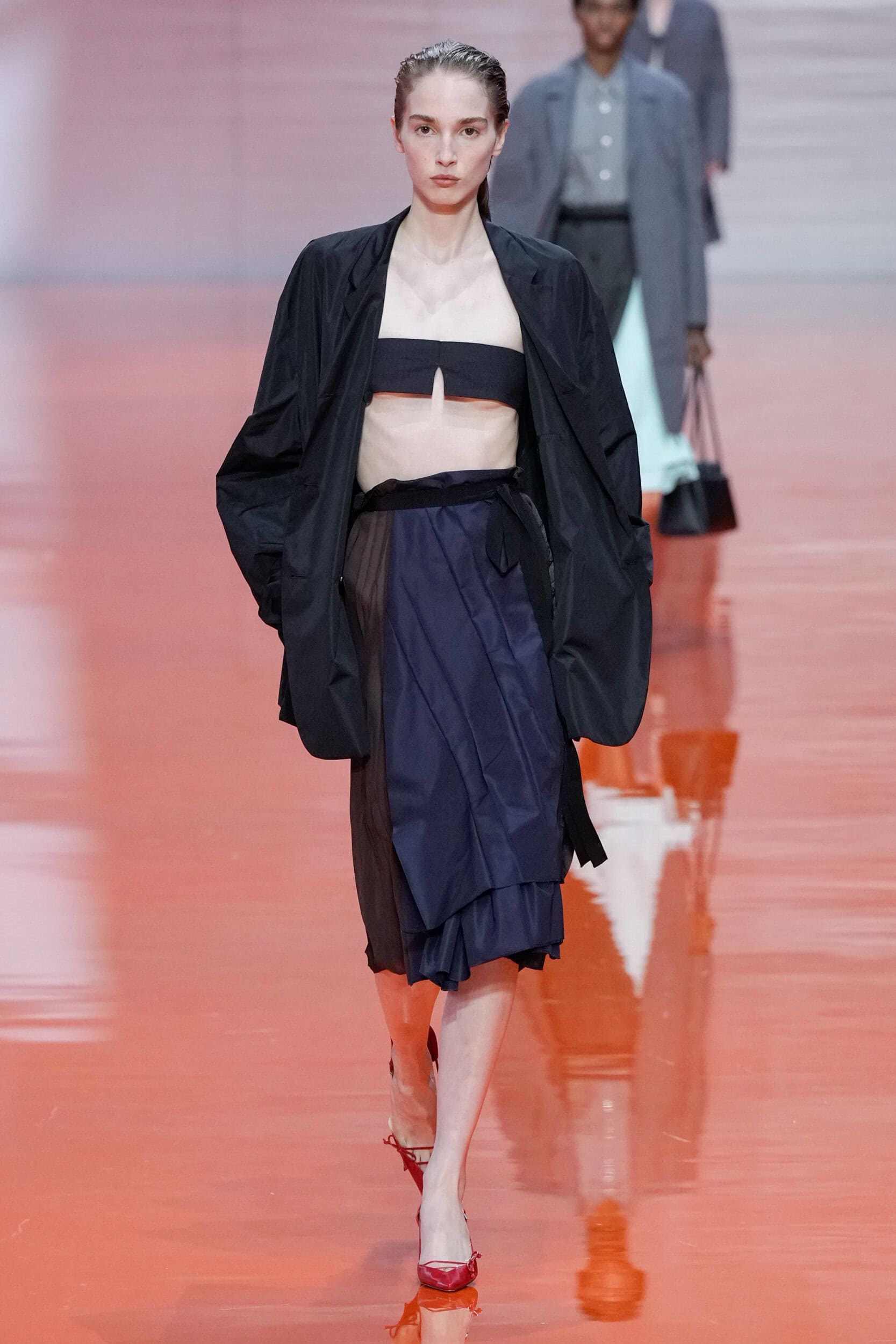 Miuccia Prada 与 Raf Simons 在本季系列中大胆摆脱传统时尚的束缚,探索如何在复杂的世界中通过服装表达自由。最显著的元素是轻薄的「胸罩」设计,采用轻盈的丝绸,几乎没有支撑功能,打破了「形式应跟随功能」的传统理念。这种设计与过去季节的「子弹胸罩」形成鲜明对比,展现了对现代女性身体的重新定义。裙子和衬衫的结构也被颠覆,传统上贴合腰部的裙子被改为从肩膀悬挂,呈现出围裙式的设计,极具实验性。