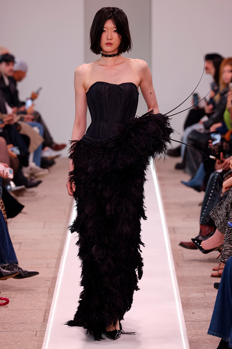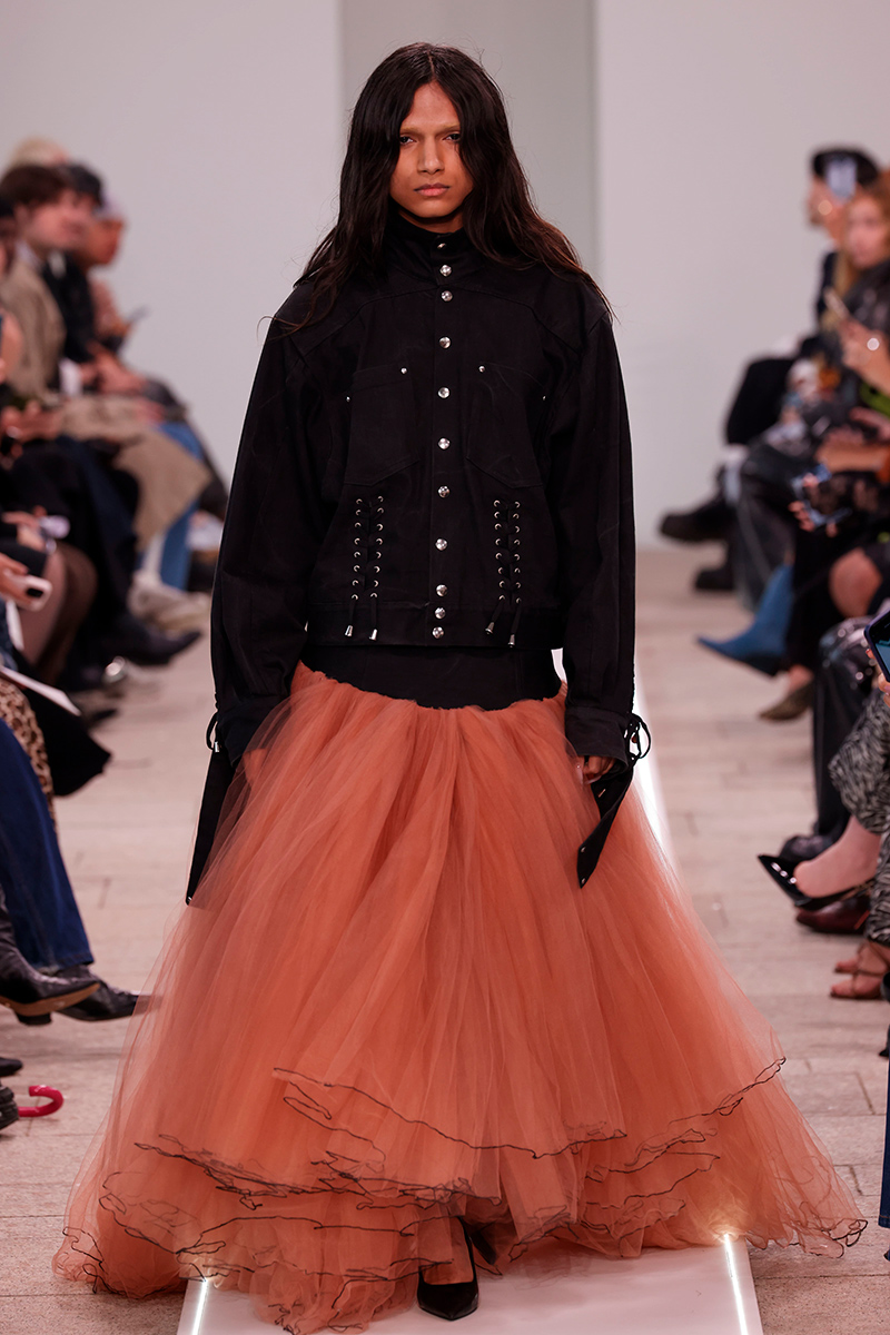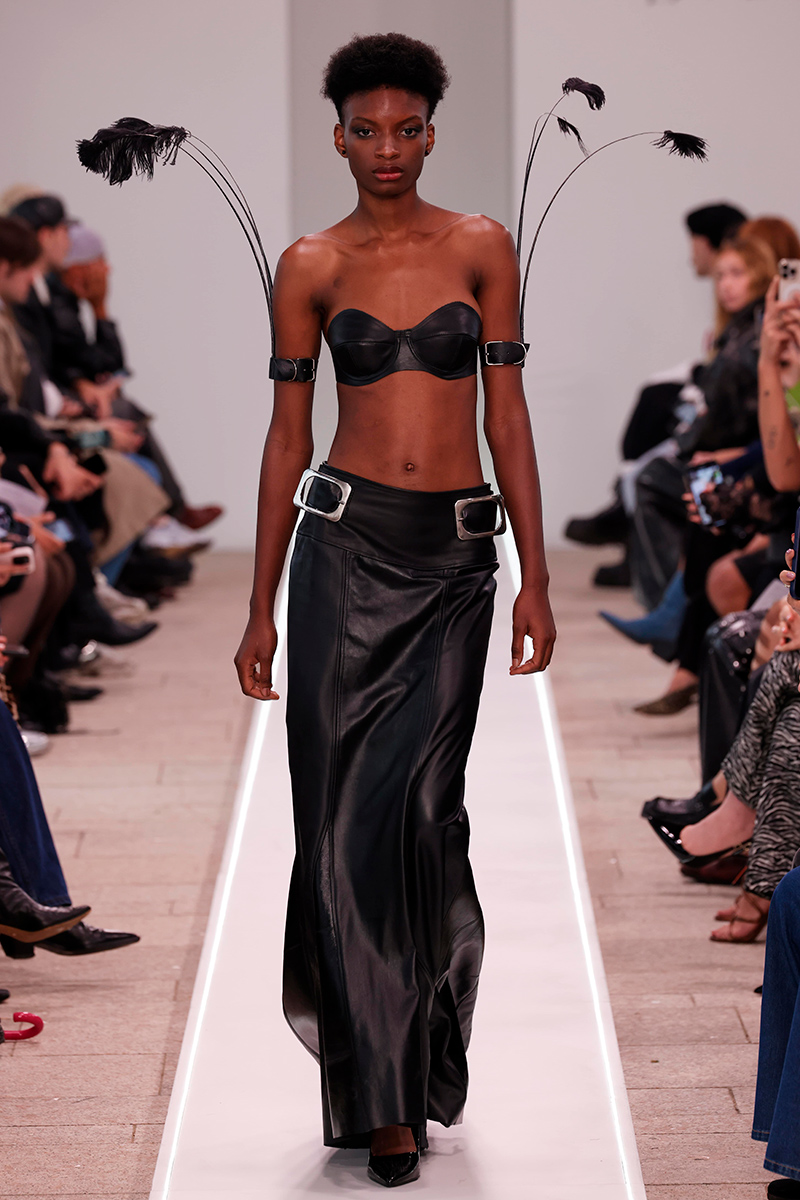 得益于与意大利米兰皮革展 Lineapelle 的合作,皮革首次出现在 Lorenzo Seghezzi 的系列造型中。这些从样品册中回收的材质,复杂而多面,与这一季的主题完美契合。所有面料均从档案库存中回收,每件服装也均由 Lorenzo Seghezzi 及其团队手工制作。