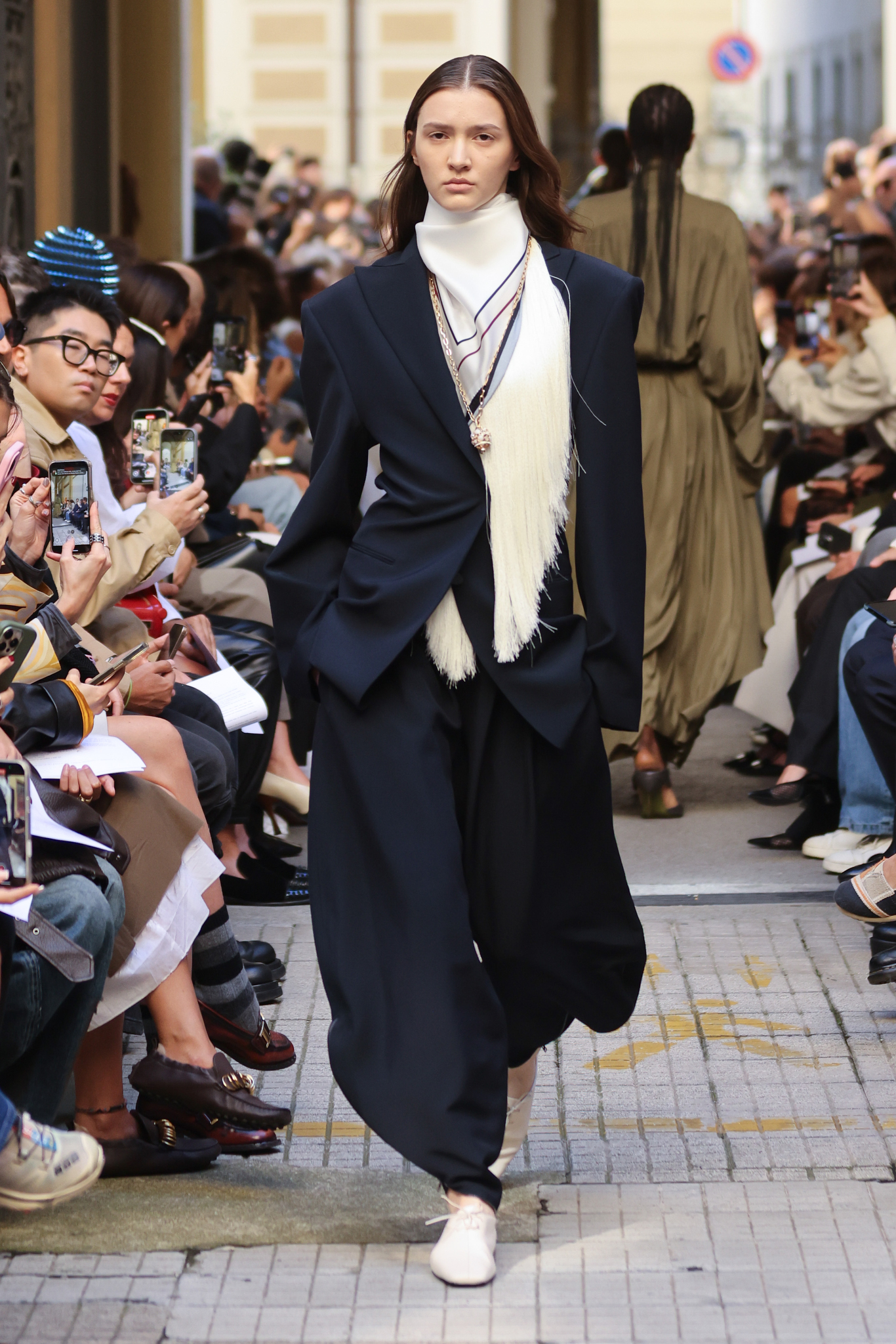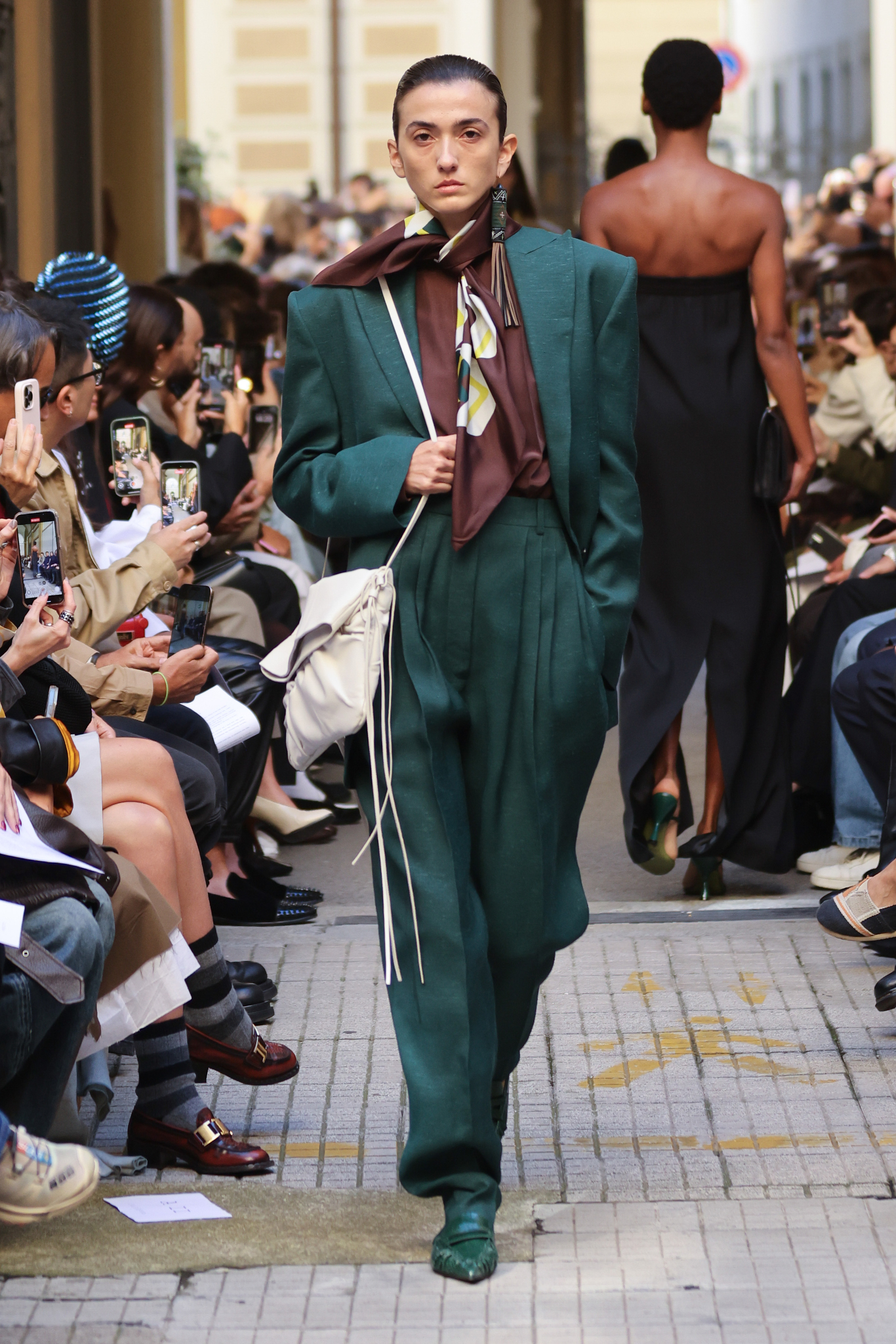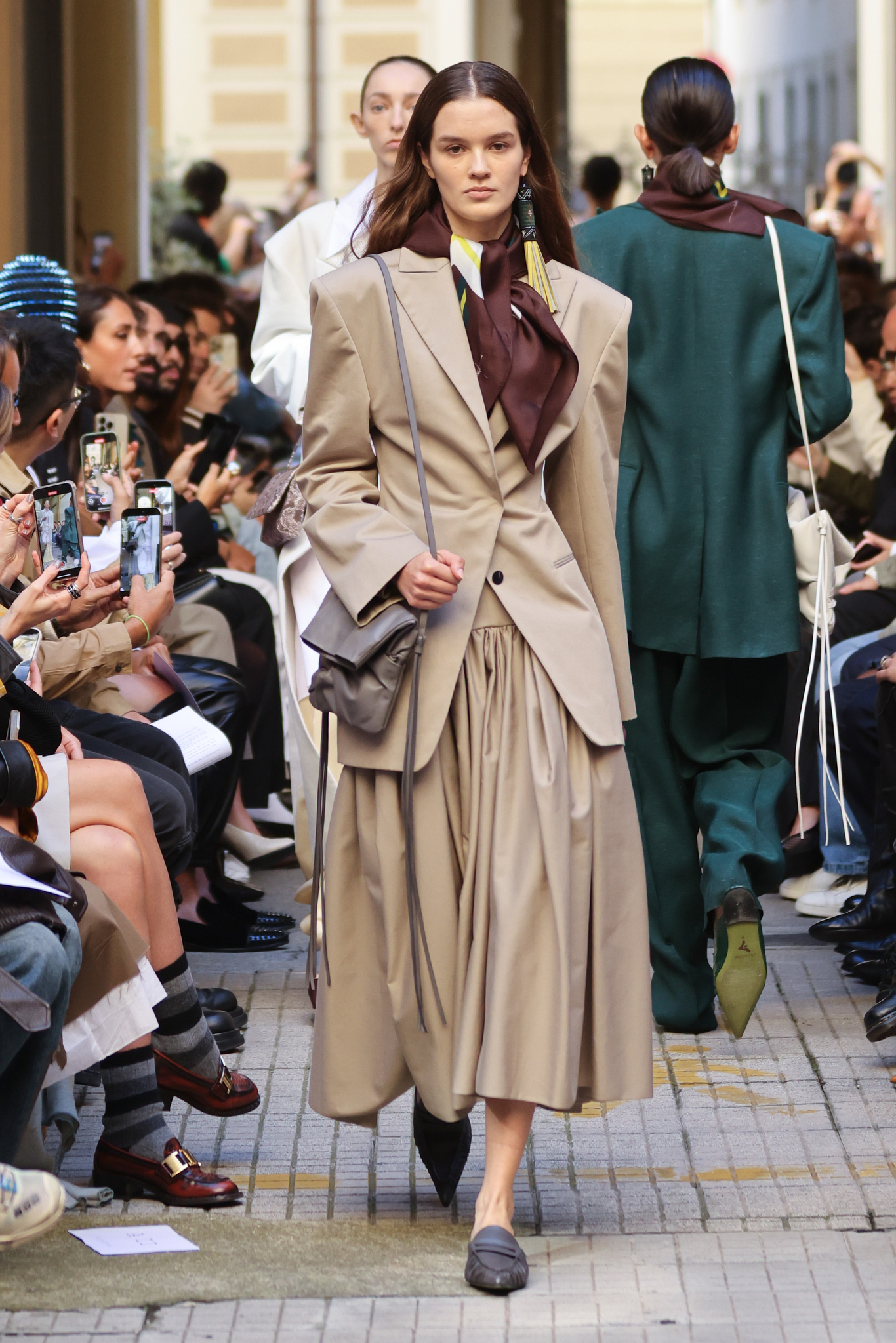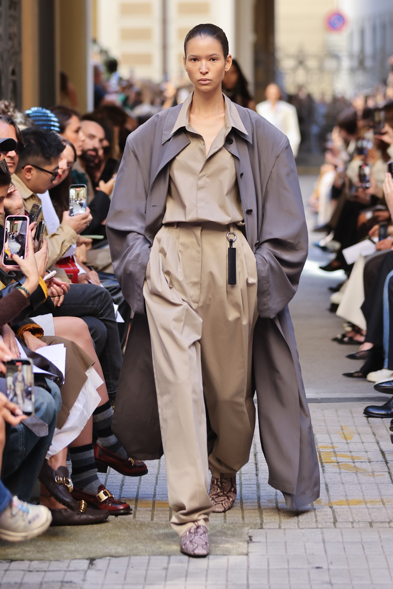 此次系列中,Calcaterra 以巧妙的设计语言展现了流动感十足的外套、剪裁精致的西装以及具有层次感的组合,色调灵感来源于自然,巧妙运用巧克力色、石色和玉米黄等大地色系。比如,他将橄榄绿色的蝴蝶领衬衫与宽腿裤搭配,外披一件长款灰褐色外套,与卡其色装束搭配,带有军事感的设计细节令人印象深刻。