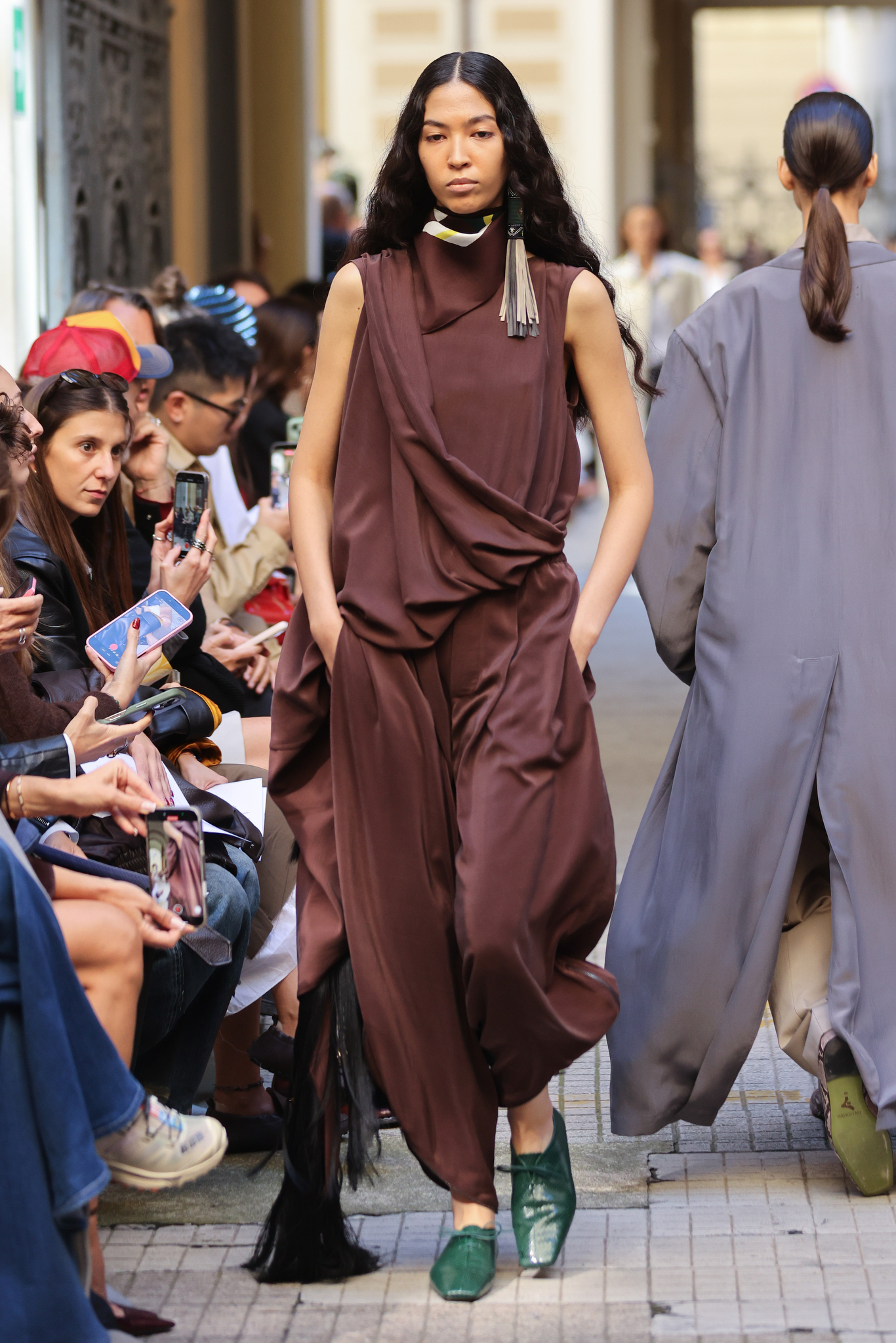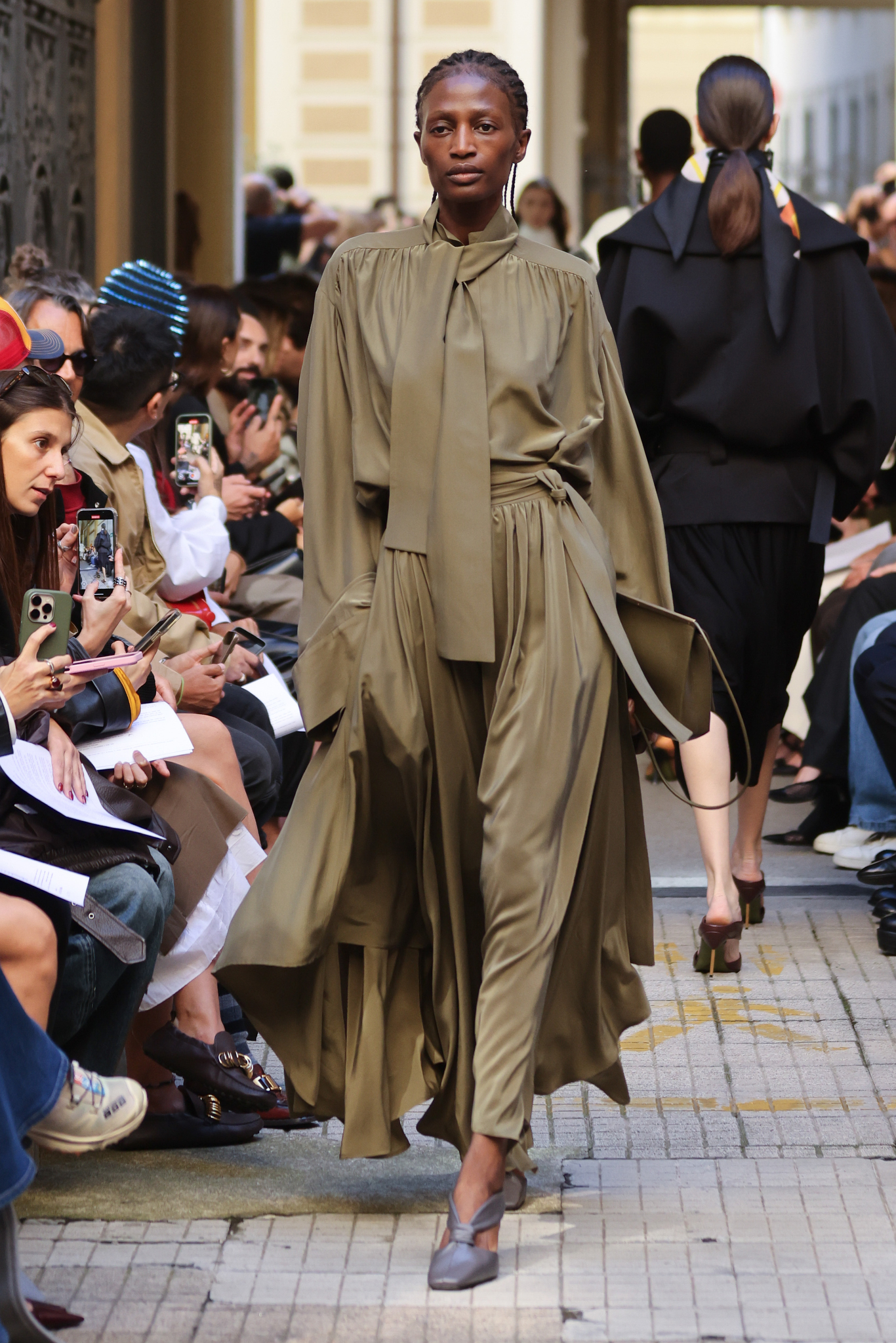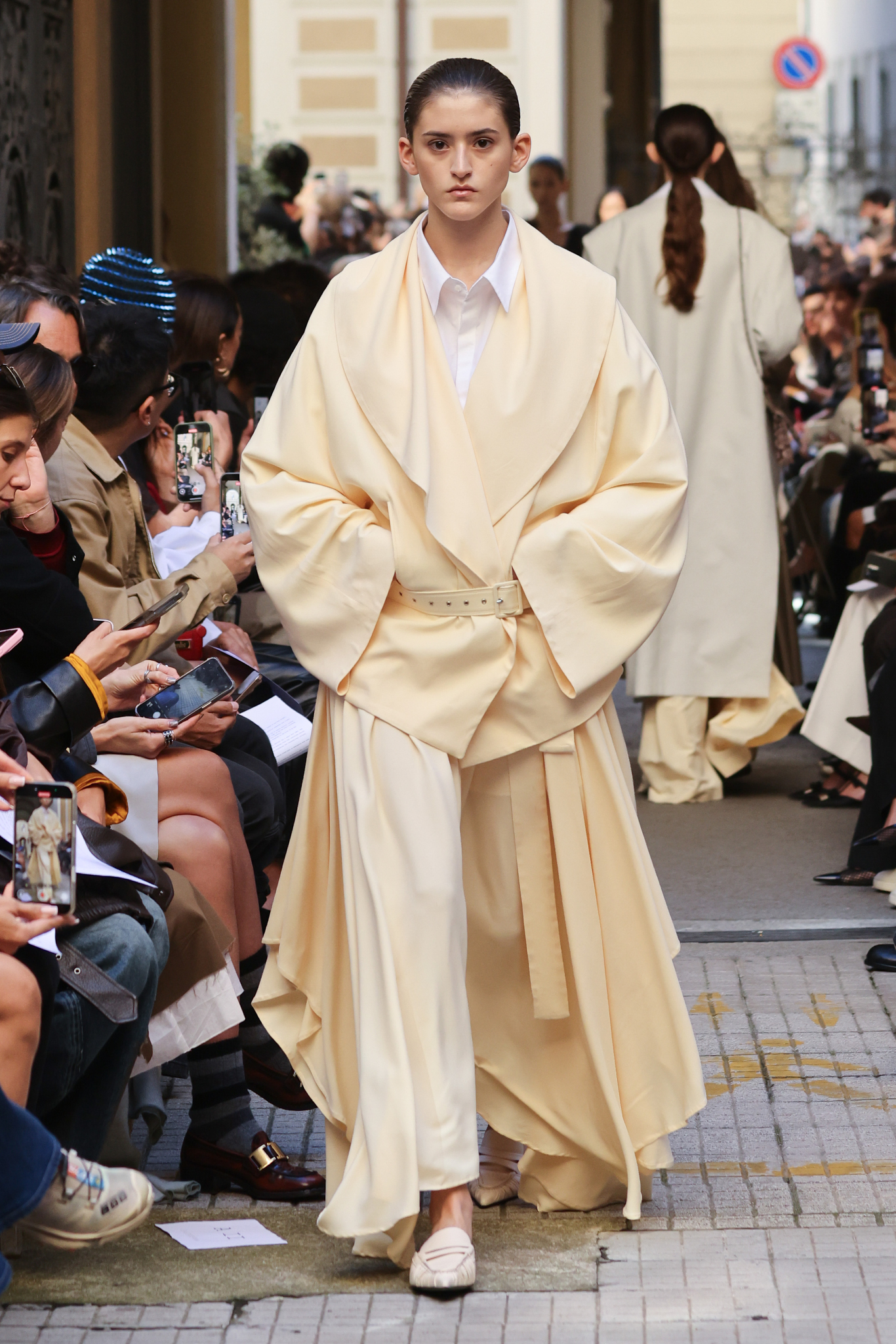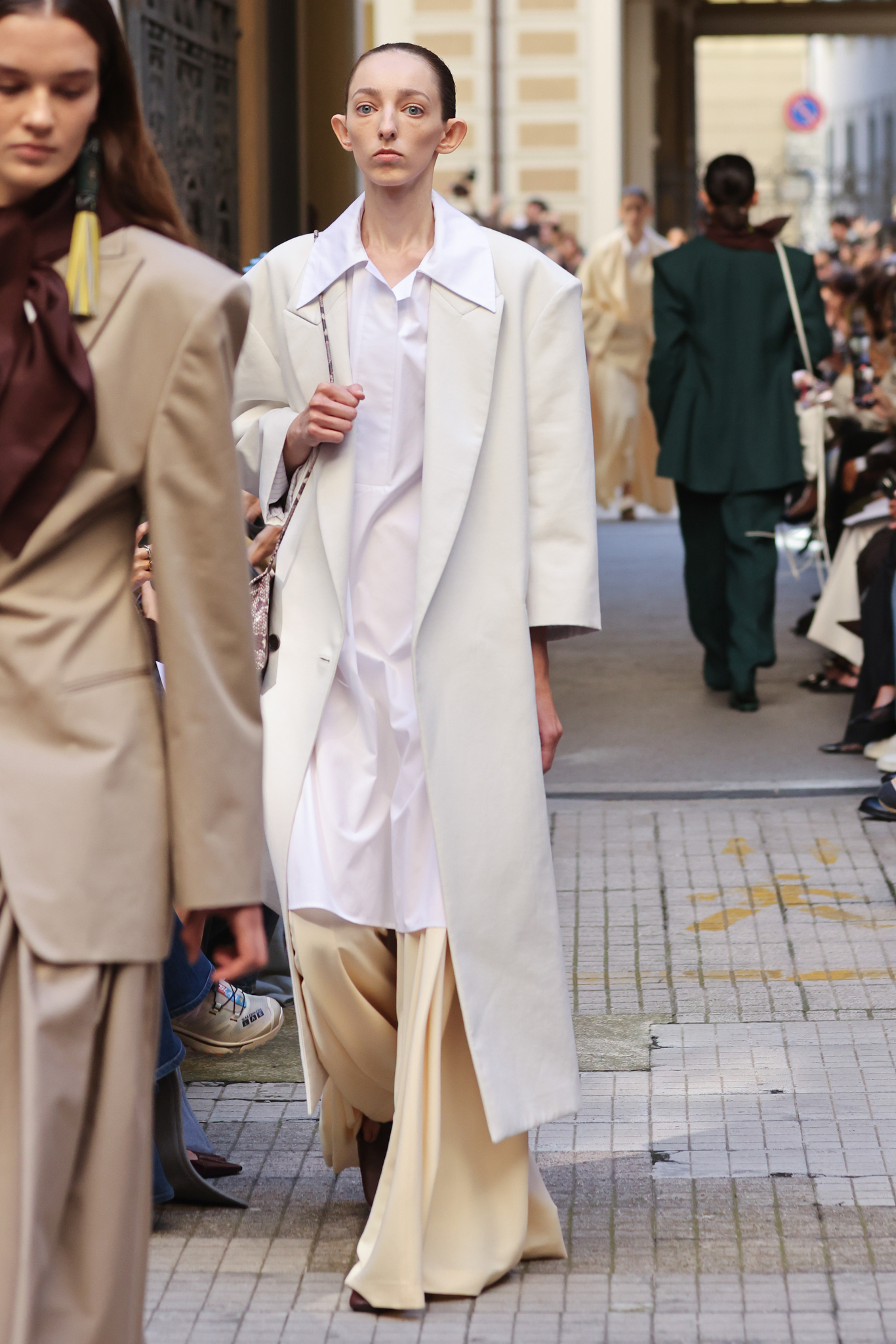 此次系列中,Calcaterra 以巧妙的设计语言展现了流动感十足的外套、剪裁精致的西装以及具有层次感的组合,色调灵感来源于自然,巧妙运用巧克力色、石色和玉米黄等大地色系。比如,他将橄榄绿色的蝴蝶领衬衫与宽腿裤搭配,外披一件长款灰褐色外套,与卡其色装束搭配,带有军事感的设计细节令人印象深刻。