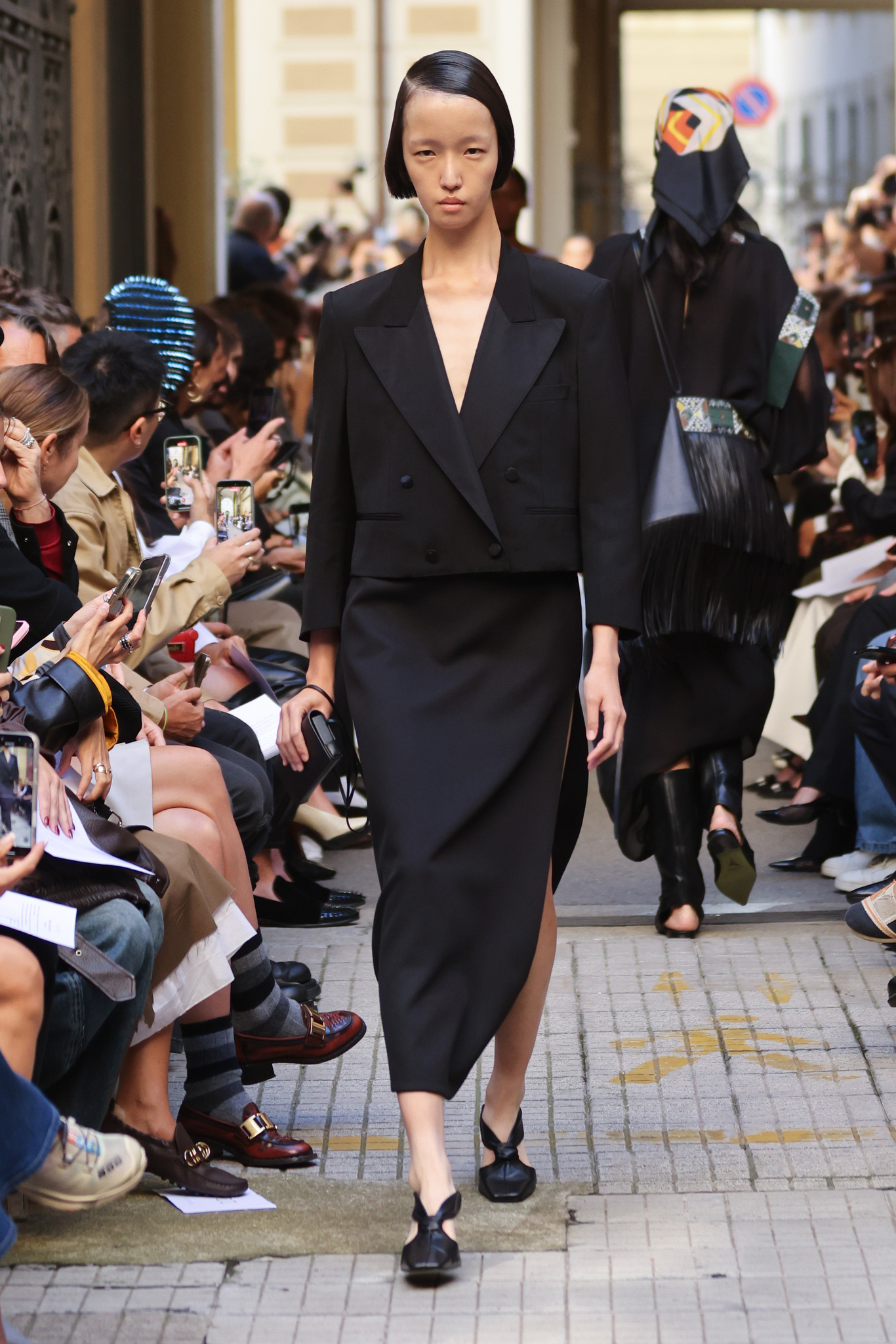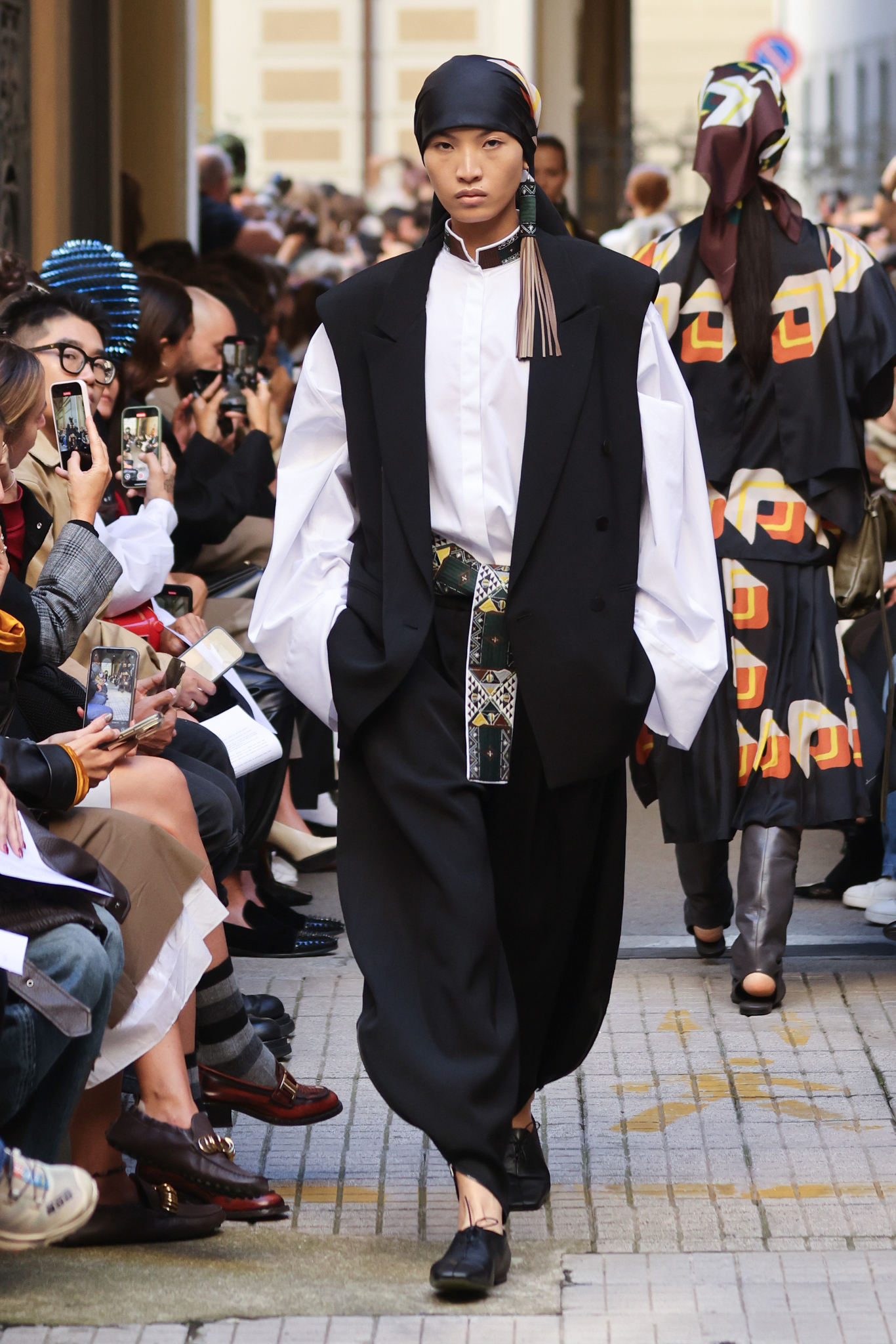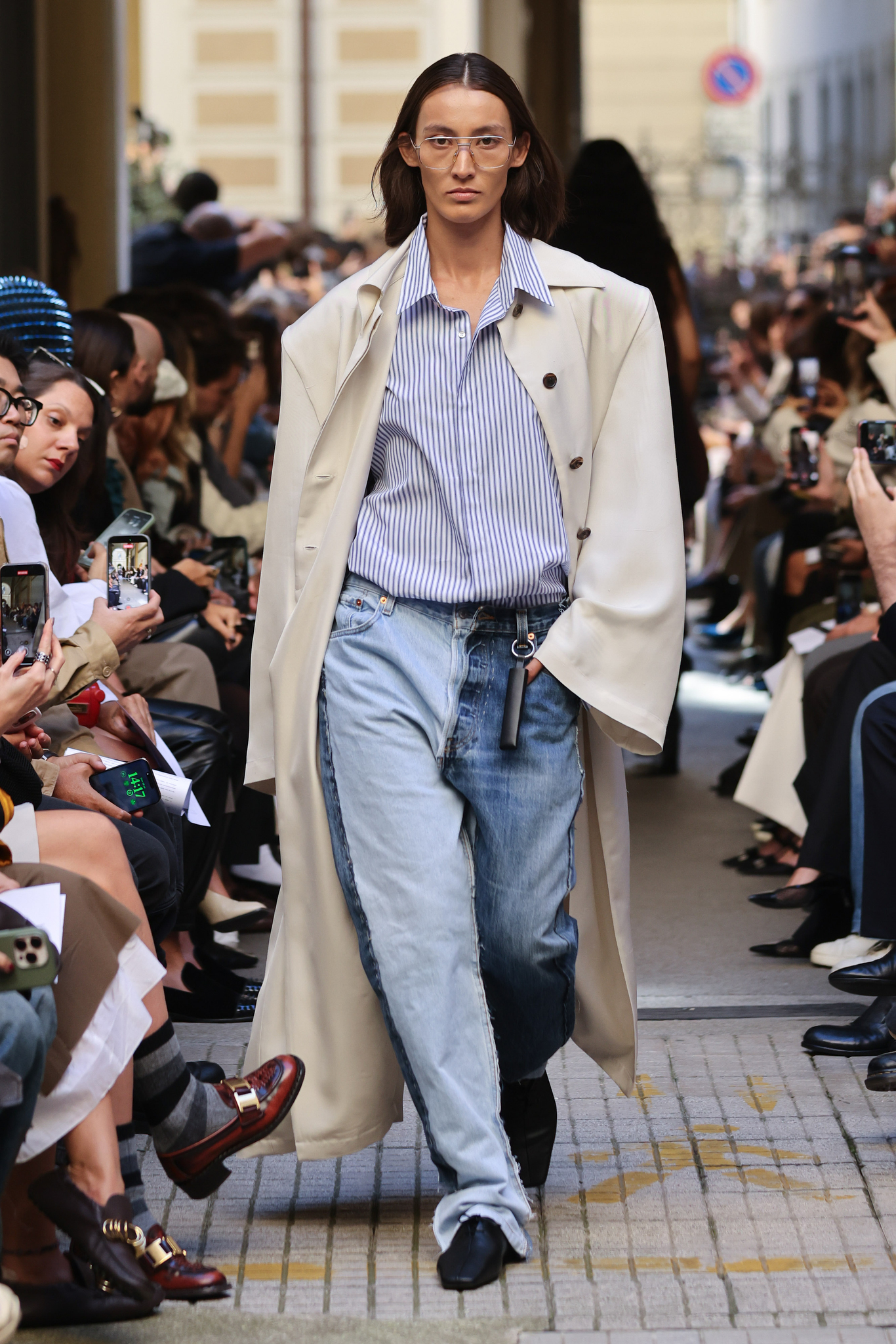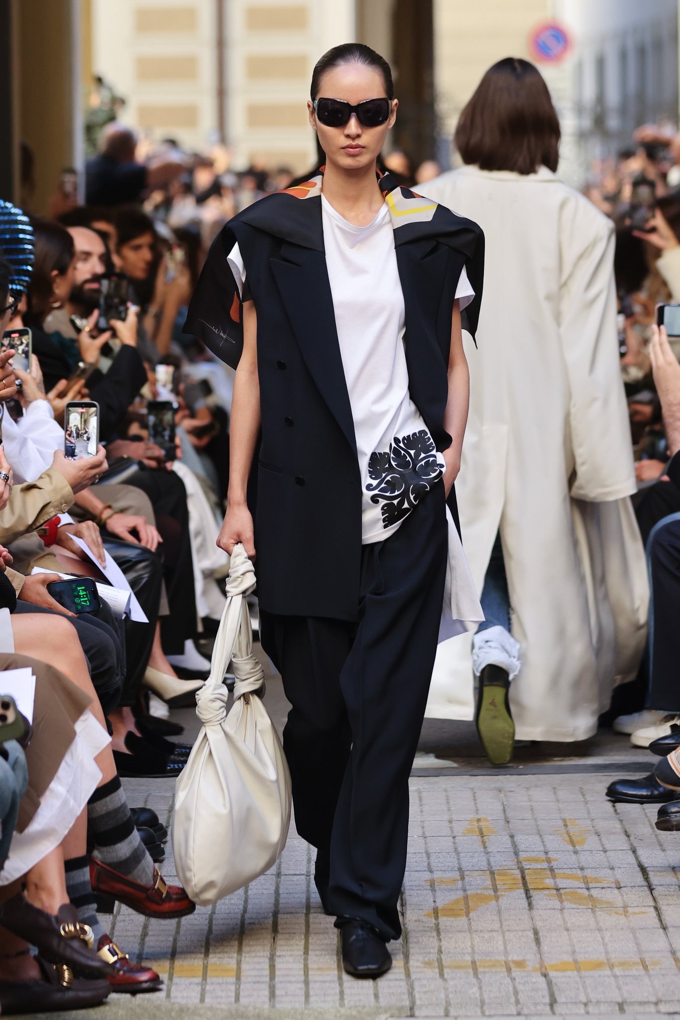 此次系列中,Calcaterra 以巧妙的设计语言展现了流动感十足的外套、剪裁精致的西装以及具有层次感的组合,色调灵感来源于自然,巧妙运用巧克力色、石色和玉米黄等大地色系。比如,他将橄榄绿色的蝴蝶领衬衫与宽腿裤搭配,外披一件长款灰褐色外套,与卡其色装束搭配,带有军事感的设计细节令人印象深刻。