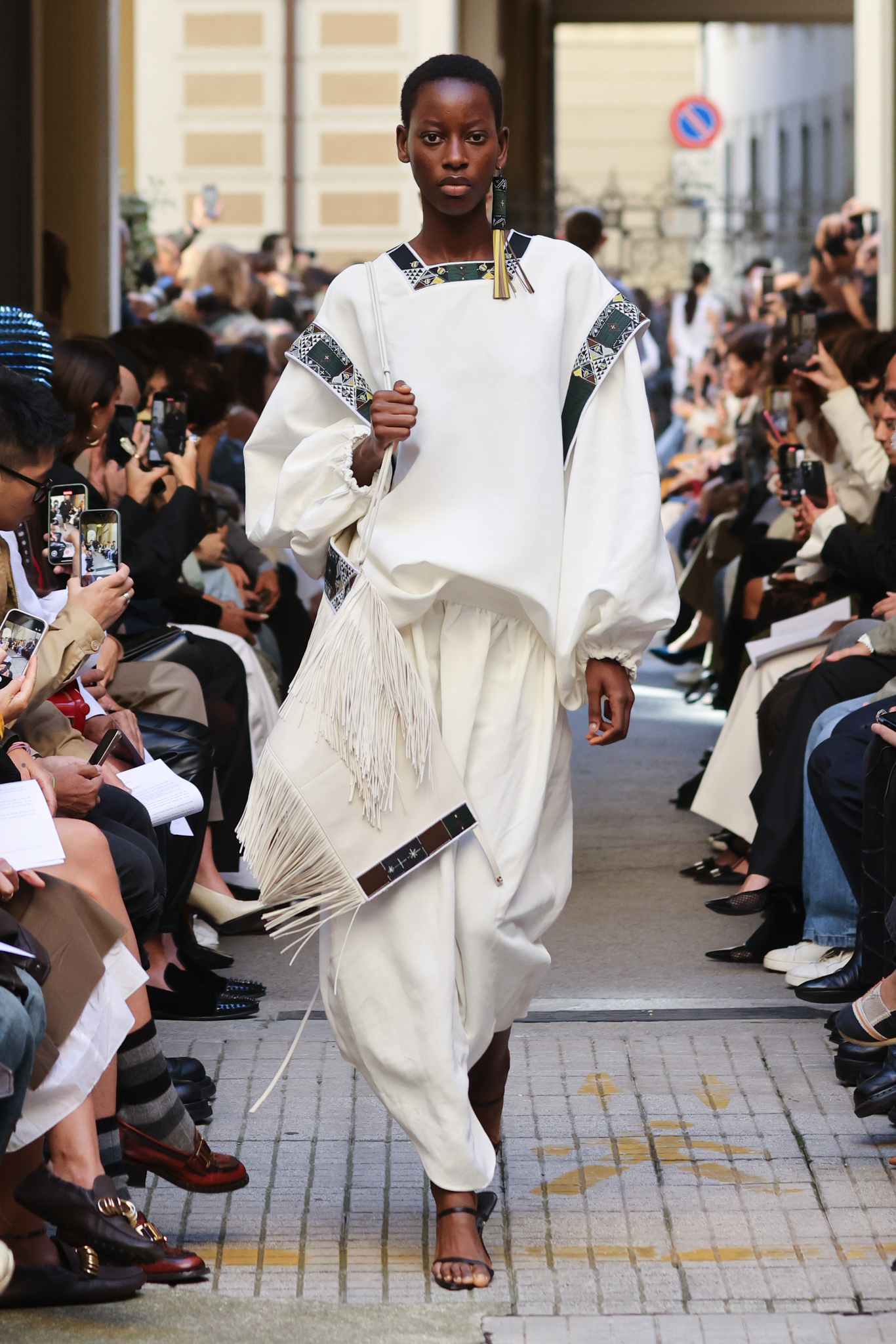 本季最具看点的是传统柏柏尔刺绣的加入,几何图案出现在白色上衣和裤装的边缘,也为卡其色宽腿裤带来独特的点缀。明亮的丝质刺绣用以收腰,增添了灵动感和精致的细节。