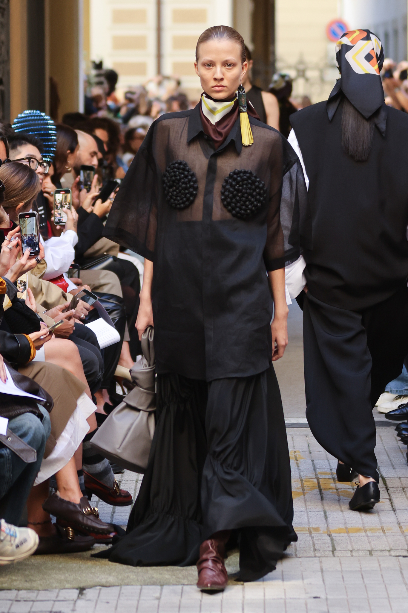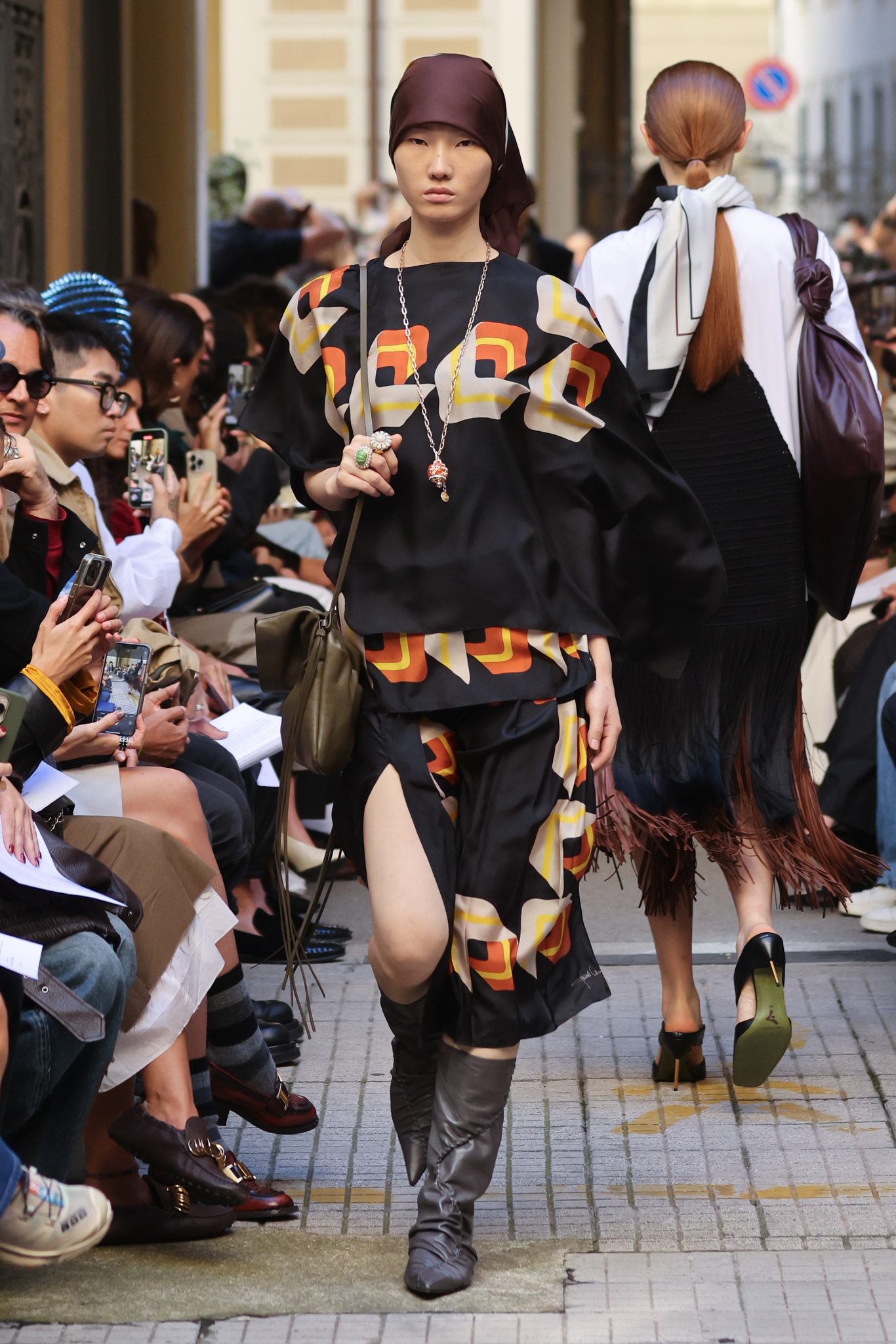 外套和西装的设计中,夸张的披肩领和锐利的肩部线条为整体造型增添了立体感,Calcaterra 还喜欢用图案丝巾将其系于脖部,仿佛在沙漠风沙中寻求保护。