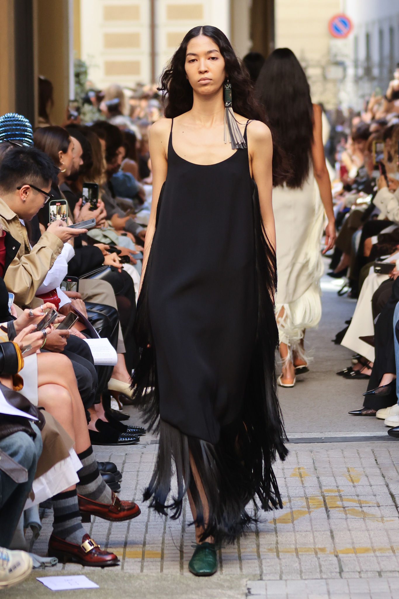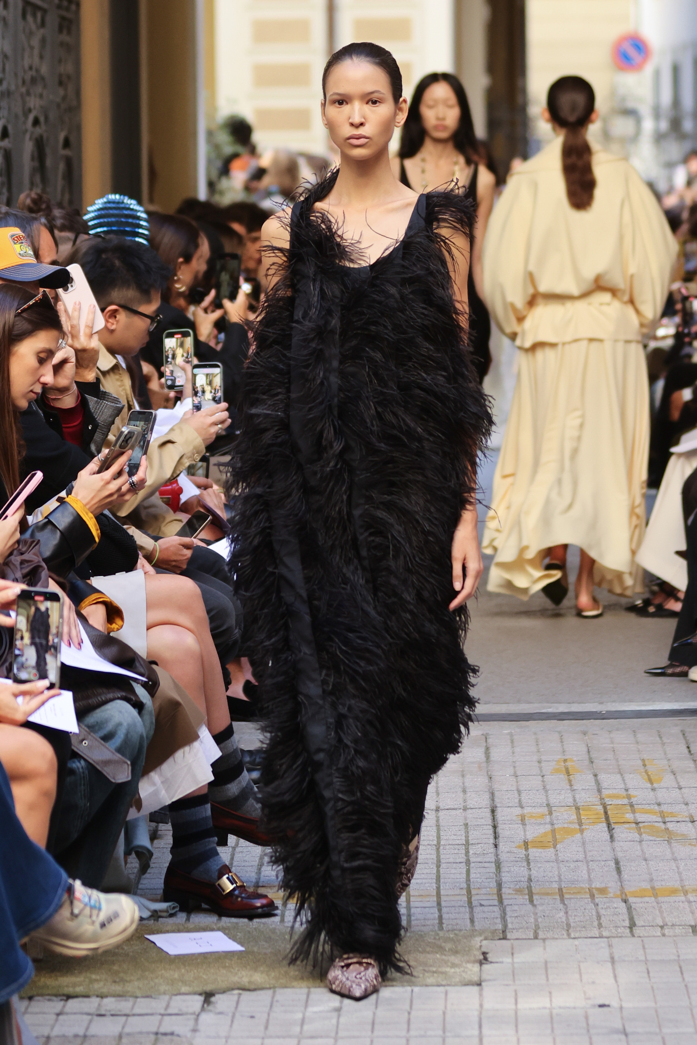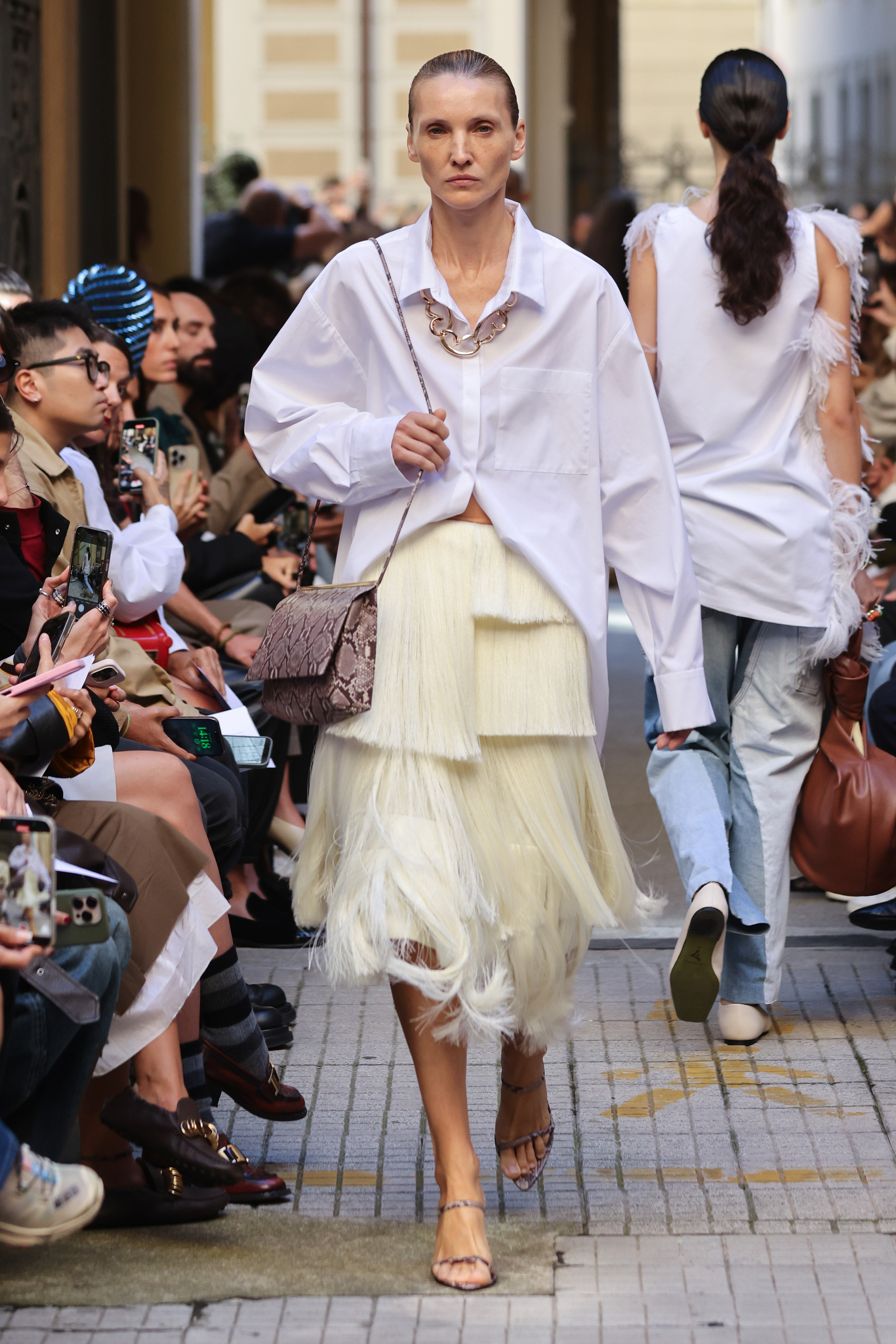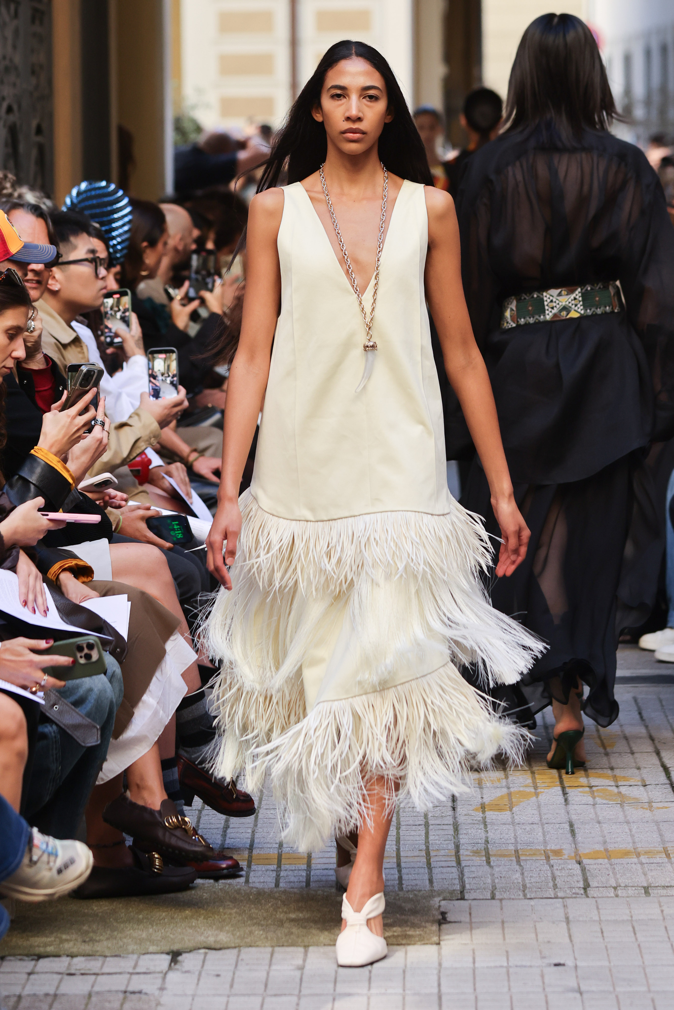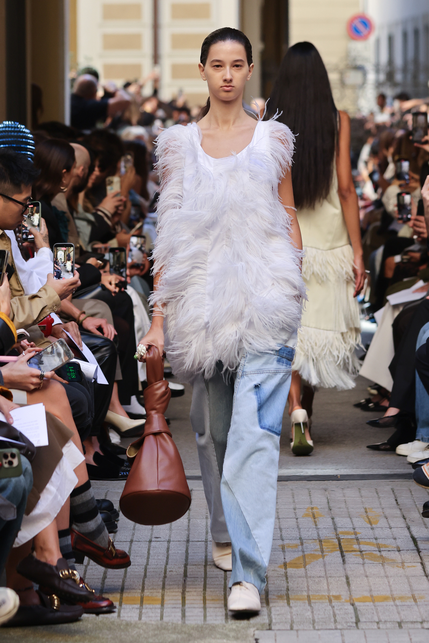 晚装部分,羽毛与流苏装饰点缀修身连衣裙和层叠裙,白色长衫与磨损感拼接牛仔裤的搭配更是充满趣味和街头感。整体设计精美,但某些造型因层次与面料的过多交织稍显复杂。如果在层次的处理上更加简化,整体效果可能会更加精致清晰。