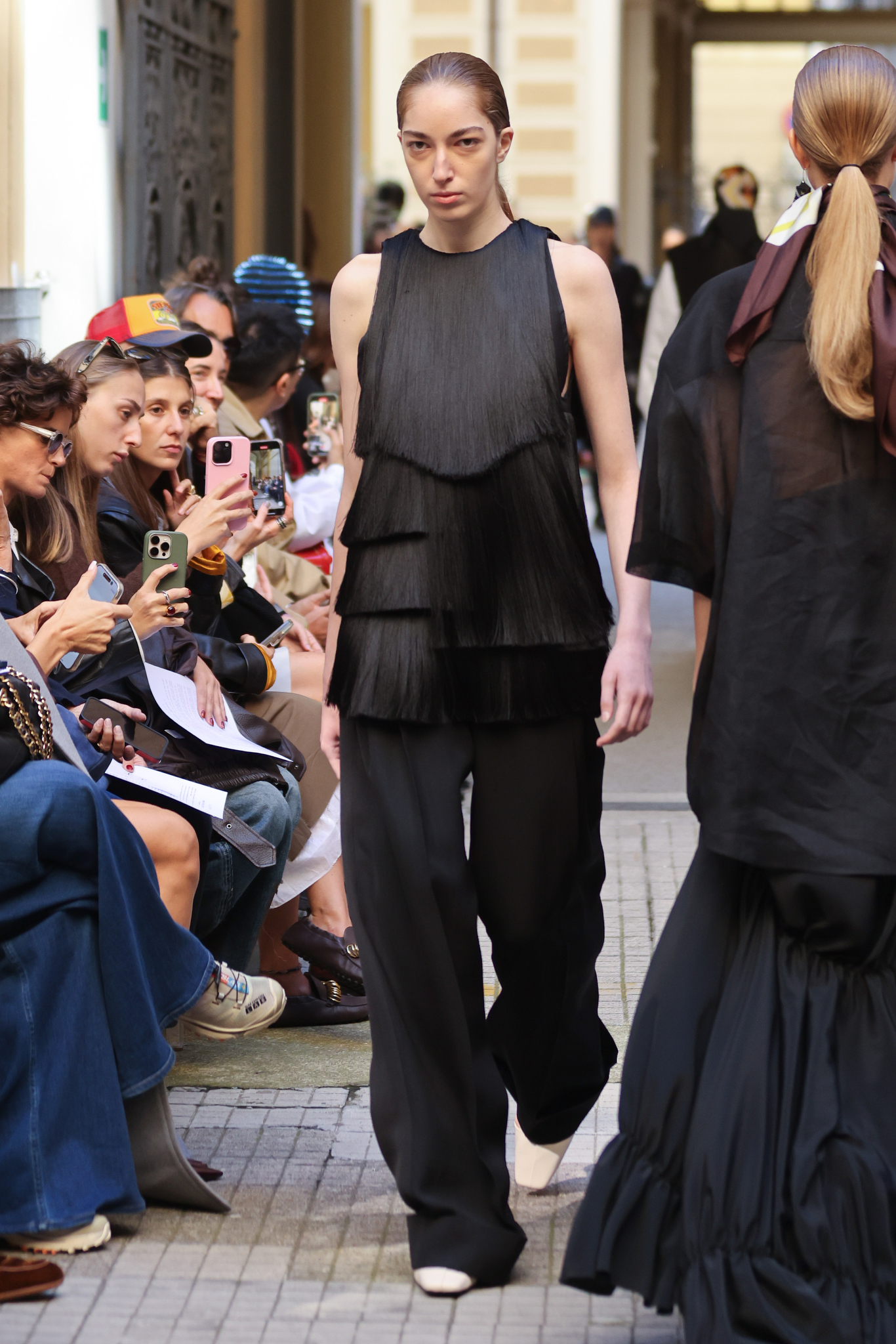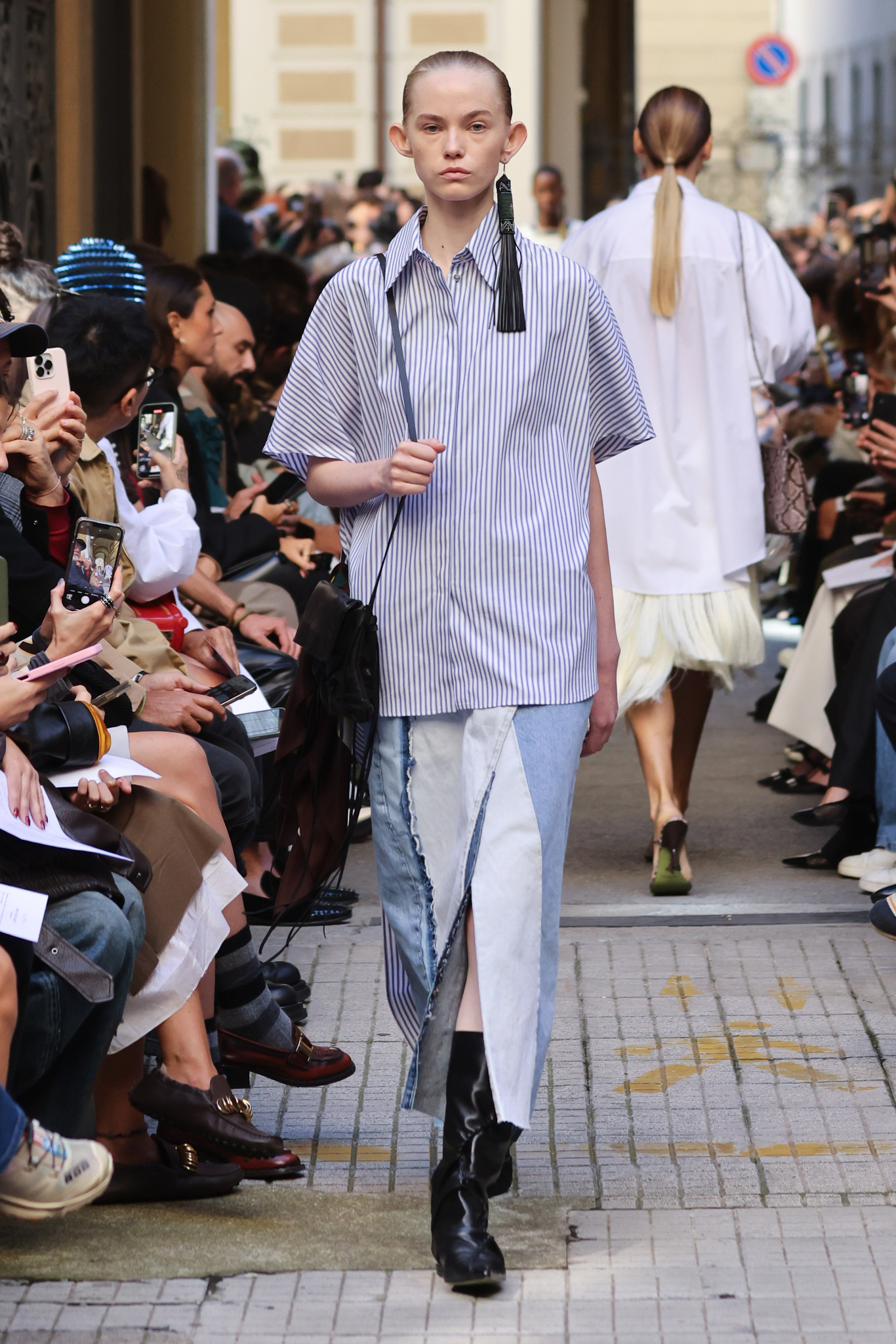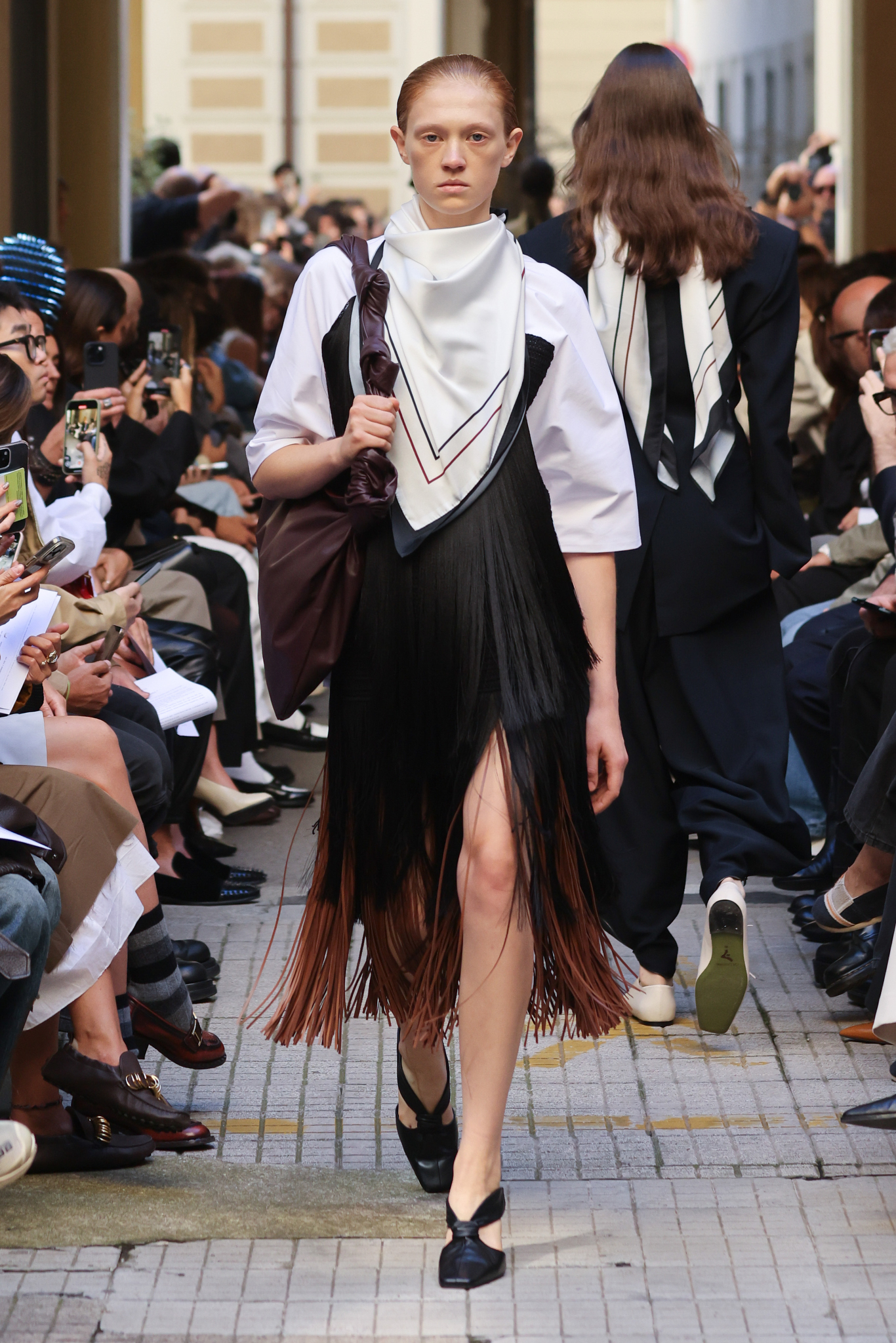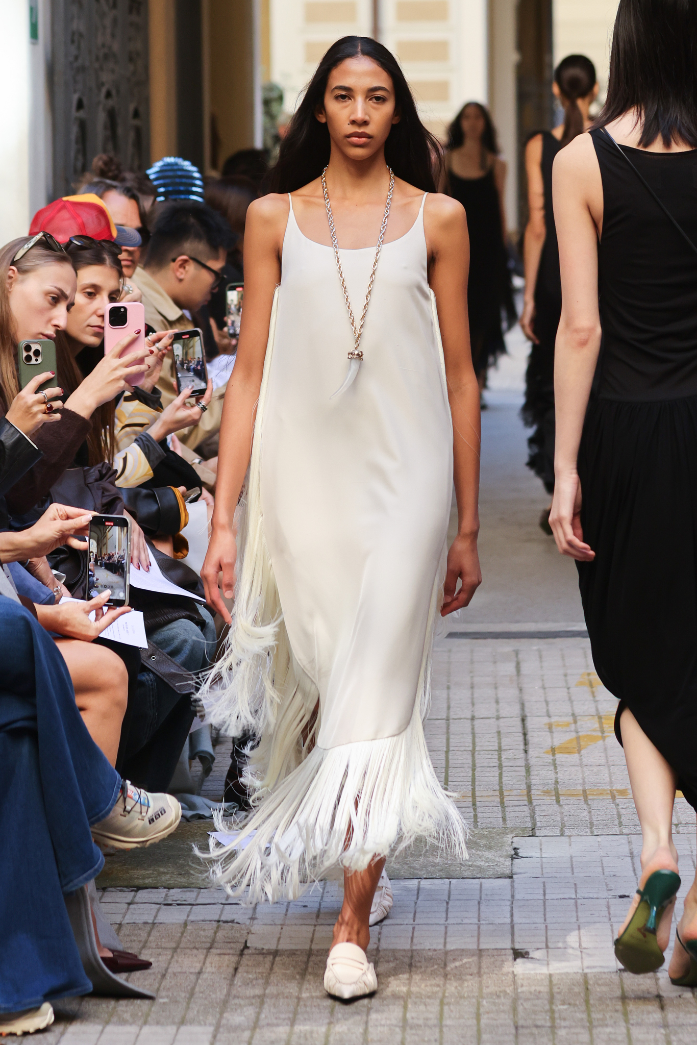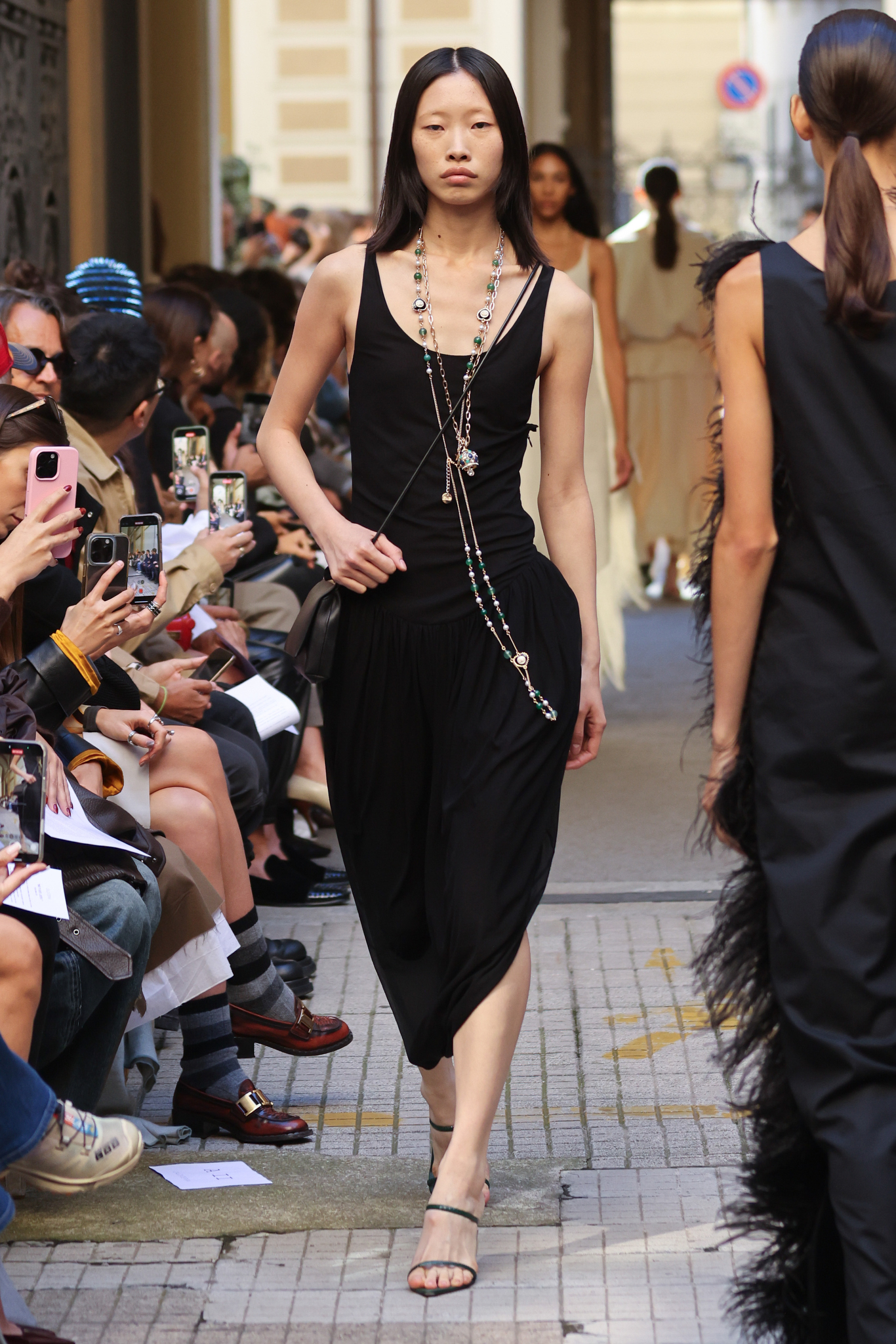 晚装部分,羽毛与流苏装饰点缀修身连衣裙和层叠裙,白色长衫与磨损感拼接牛仔裤的搭配更是充满趣味和街头感。整体设计精美,但某些造型因层次与面料的过多交织稍显复杂。如果在层次的处理上更加简化,整体效果可能会更加精致清晰。