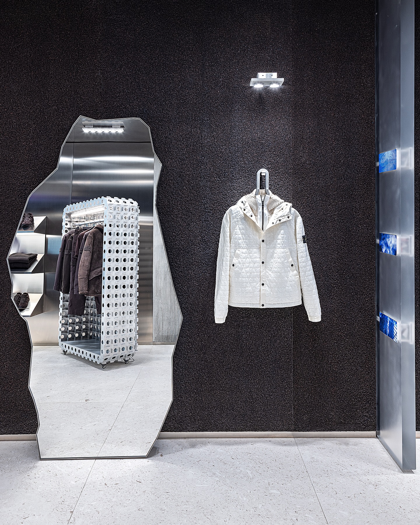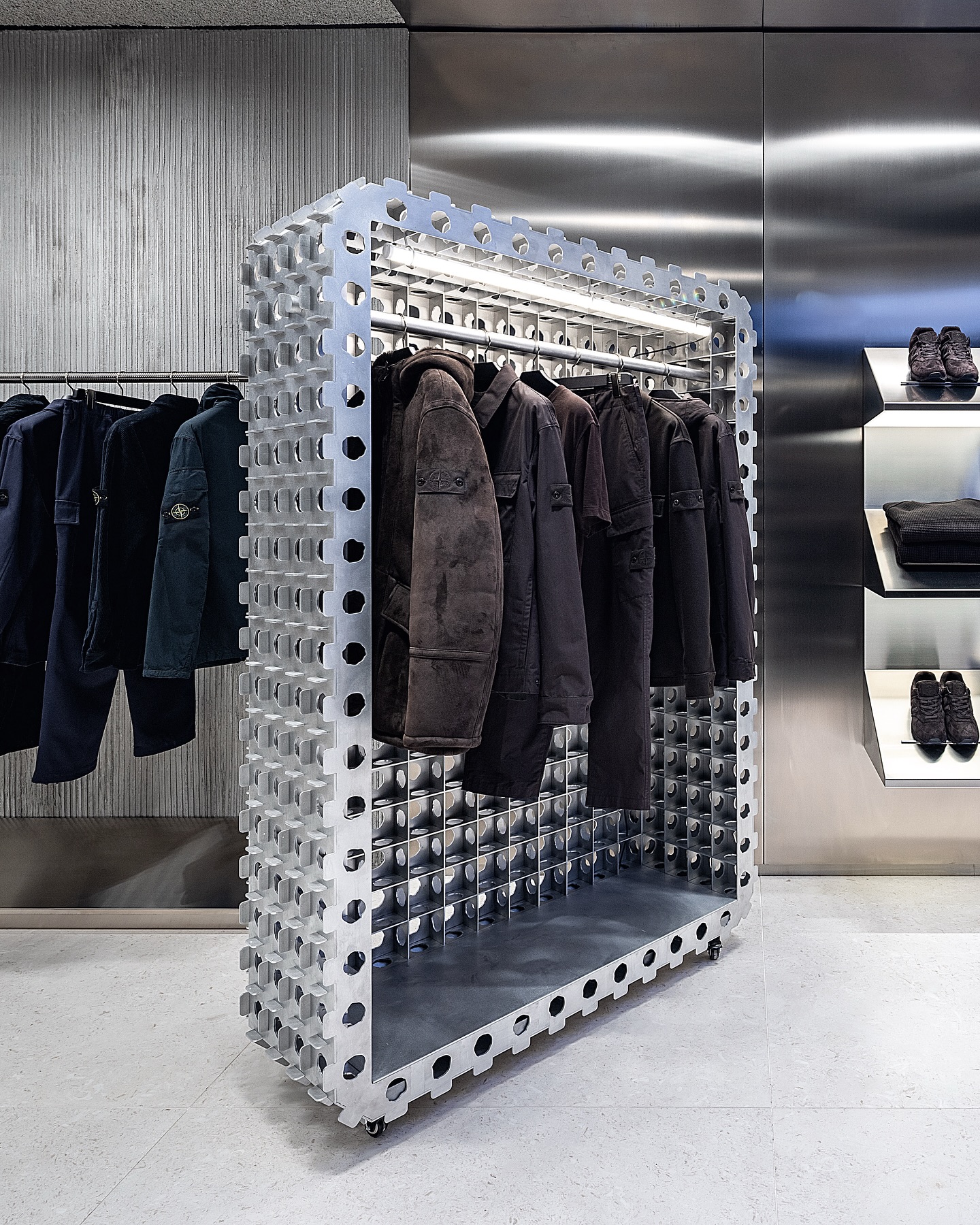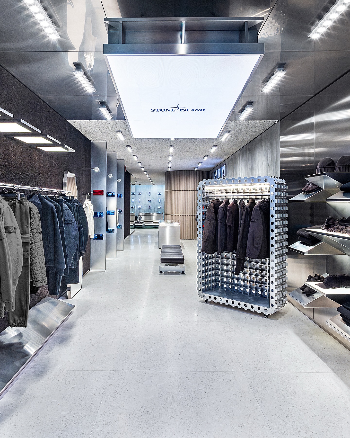 近日,Stone Island 纽约苏荷区旗舰店于格林街 70 号焕新启幕,标志着品牌进驻 SoHo 区十周年。由 OMA 与 AMO 建筑团队操刀设计,打造兼具画廊美学与社群功能的 3,157 平方英尺空间。新店核心亮点为品牌与伦敦 Shiva Feshareki 工作室合作开发的模块化音响系统「Stone Island x Friendly Pressure」,构筑沉浸式声场体验。开业期间举办「Stone Island Sound Presents: Studio One_NYC」音乐企划,集结 Charlotte Day Wilson 等多元音乐人演绎跨界音景。全新旗舰店体现了 Stone Island 的 LAB(材料创新)和 LIFE(社区与文化体验)理念,并将超越传统零售,成为融合材料研究、文化项目与社群互动的北美战略枢纽。