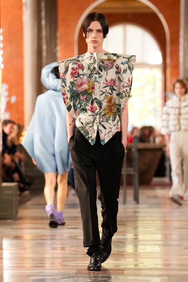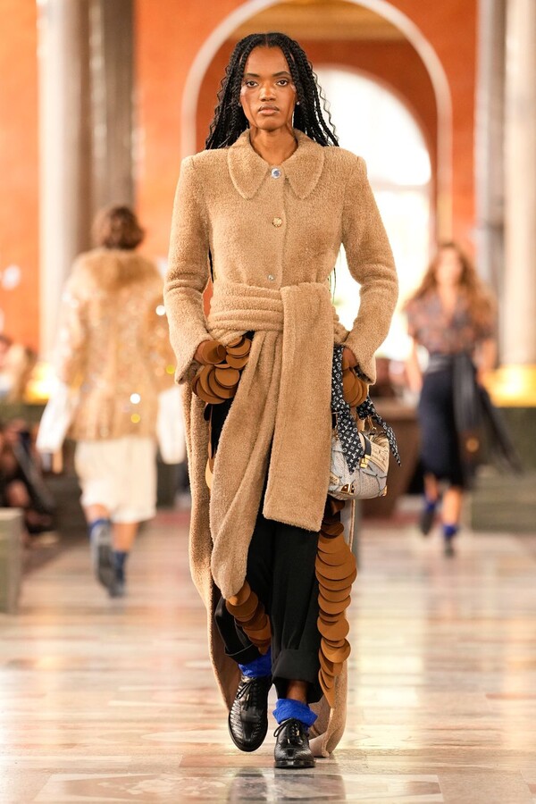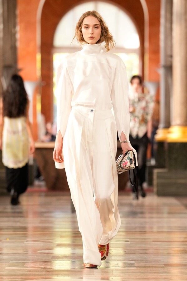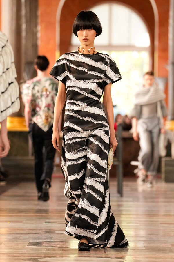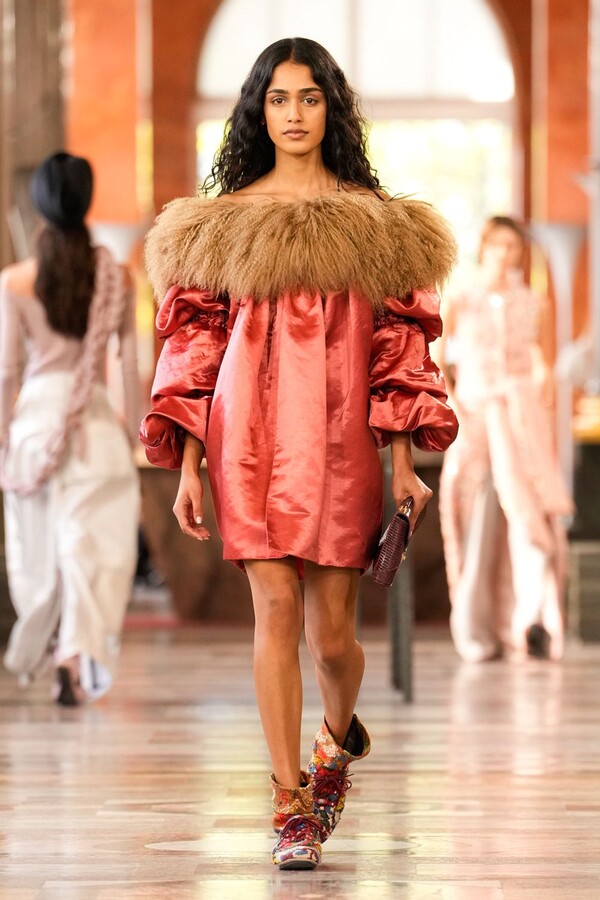 精湛的工艺在其中扮演着决定性的角色。精致的针织紧身胸衣饰以褶饰细节,与轻盈的真丝长裤相得益彰,缀以层叠串珠流苏的连衣裙则捕捉了光影与动感。针织衫、头巾和柔软的层叠设计凸显了触感,带有金属光泽的褶皱披肩营造出未来主义的对比效果。尖领衬衫令人联想到过去的教会服饰,饰有水晶刺绣的皮草边背心则将历史元素融入现代廓形。