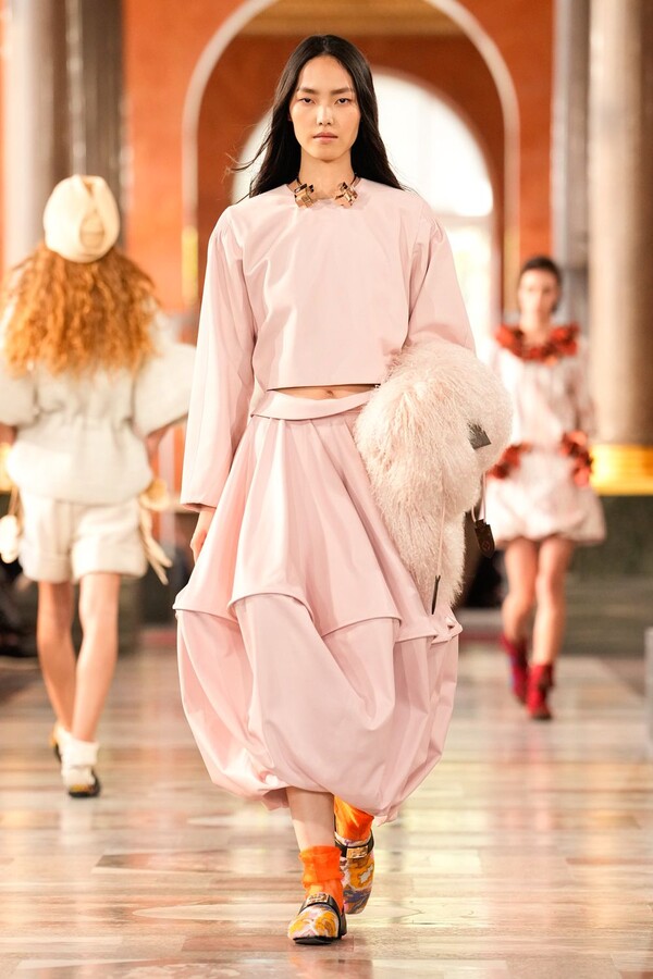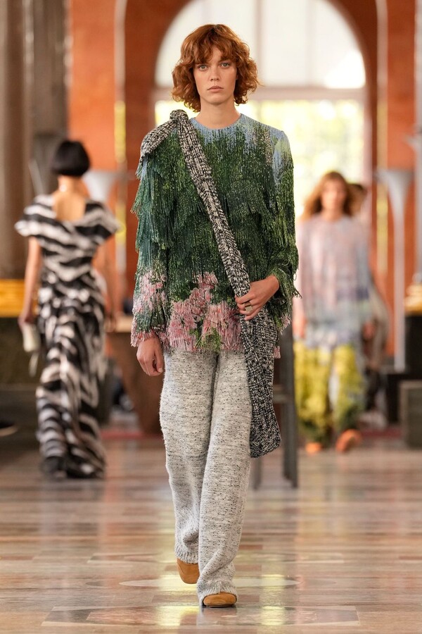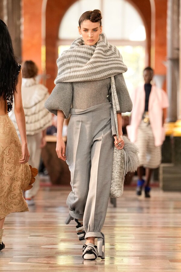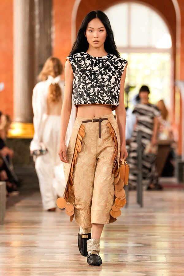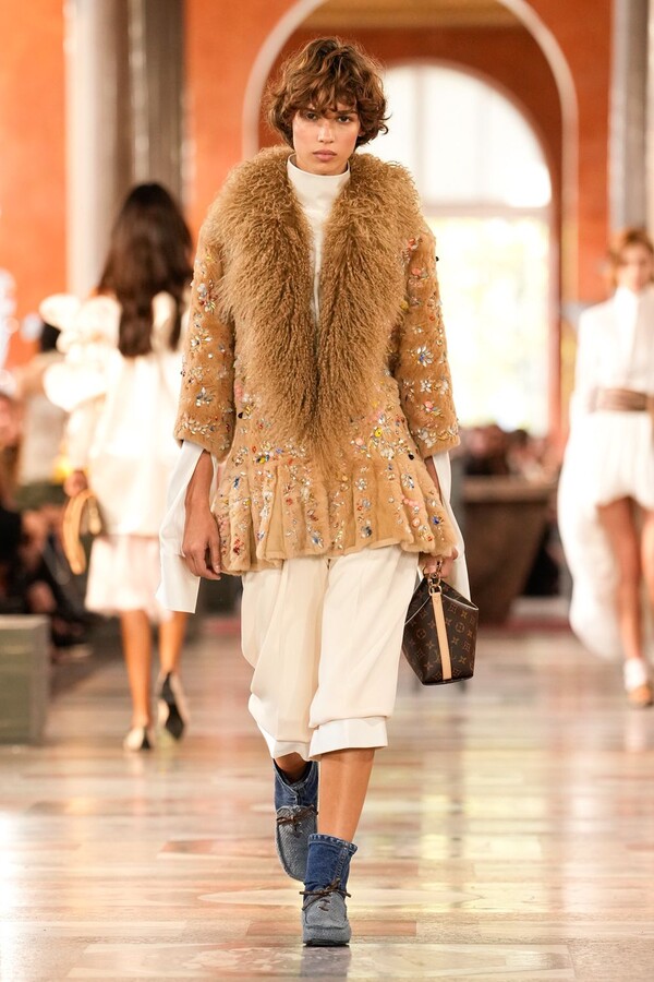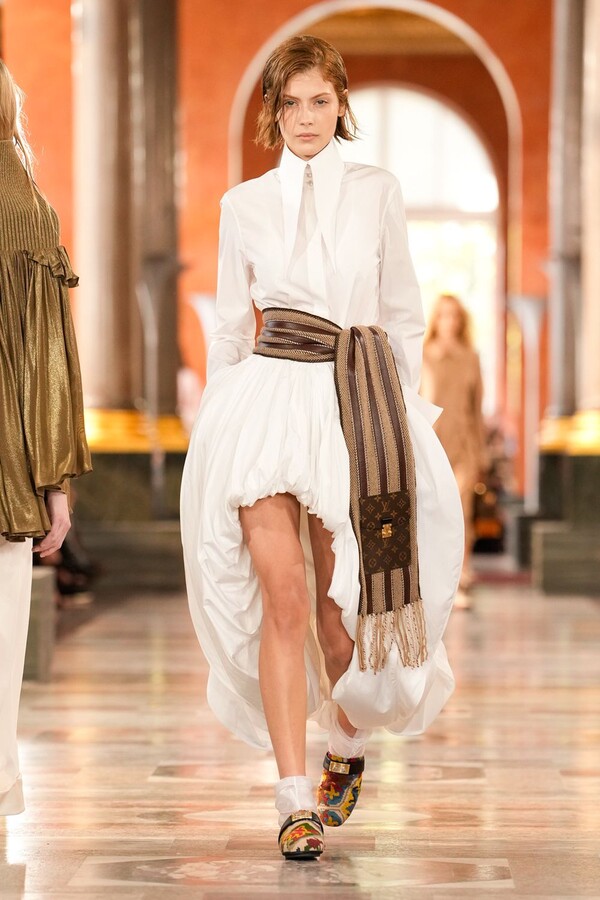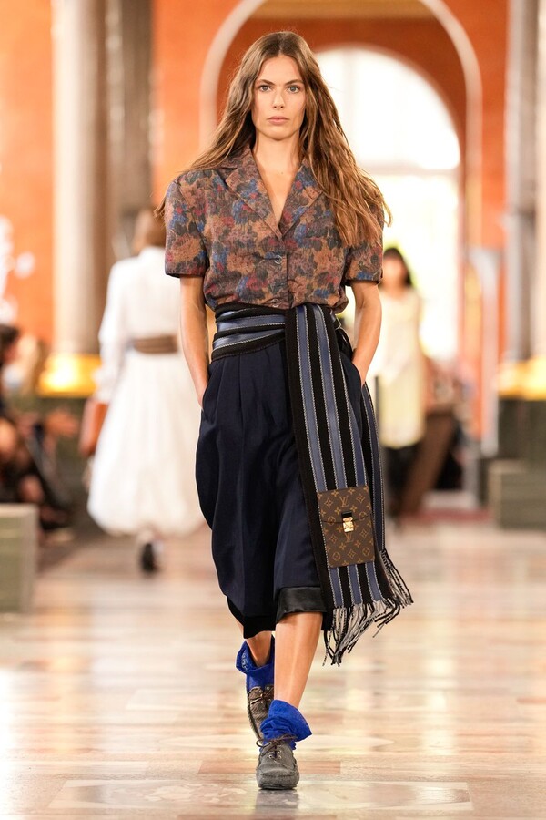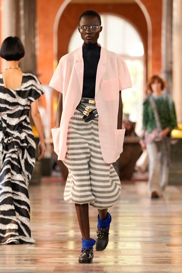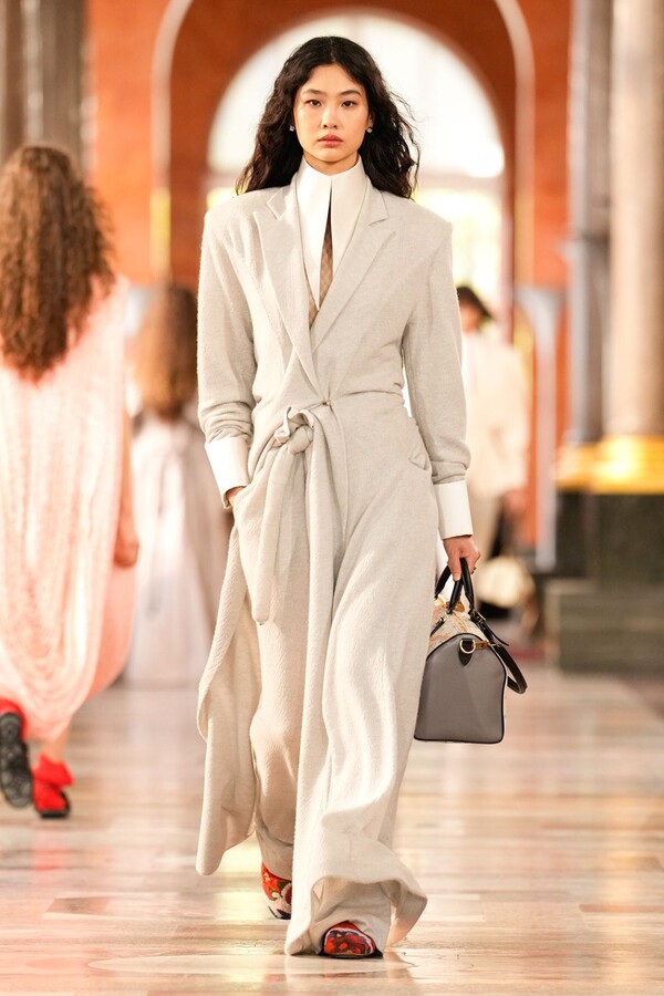 Nicolas Ghesquière 对廓形和层次的处理依旧亮眼:露肩连体裤搭配了拉链长裤,轻盈的针织连衣裙搭配袜子和一脚蹬凉鞋。这种处理方式模糊了轻松与正式之间的界限,强化了本季对于私人舒适性与公共展示之间的探索。