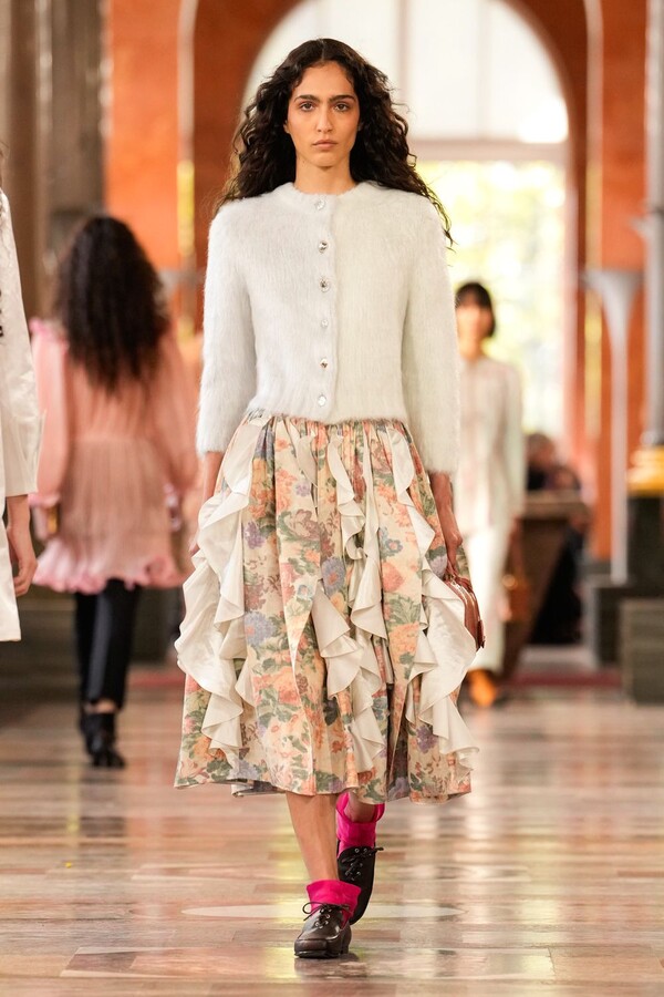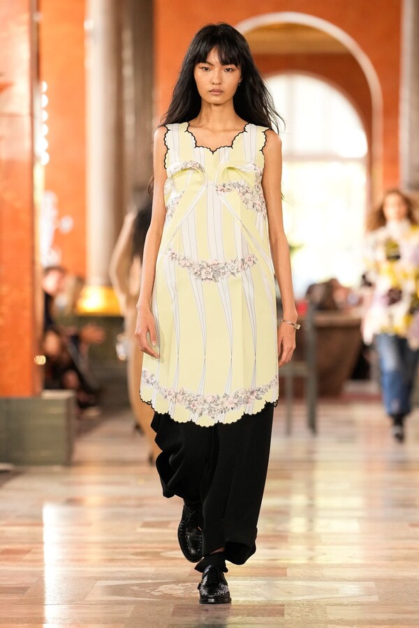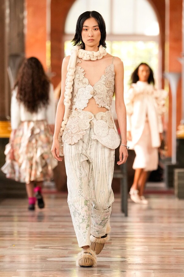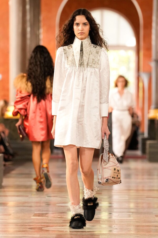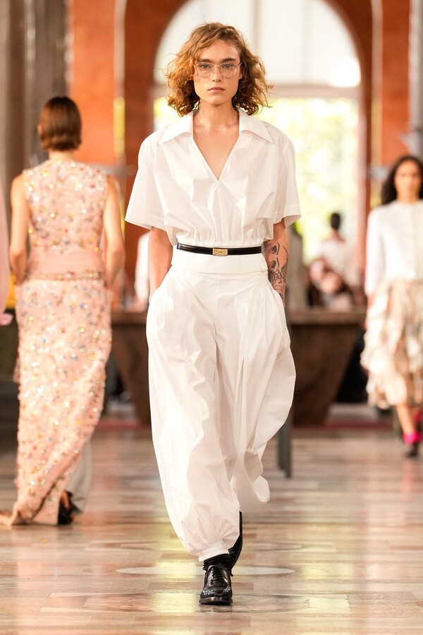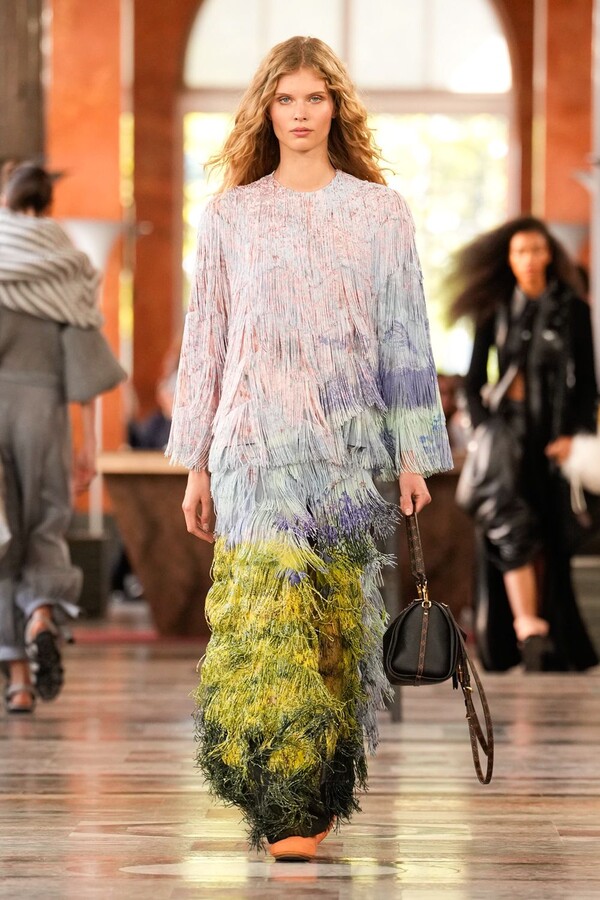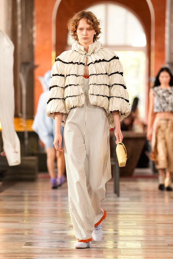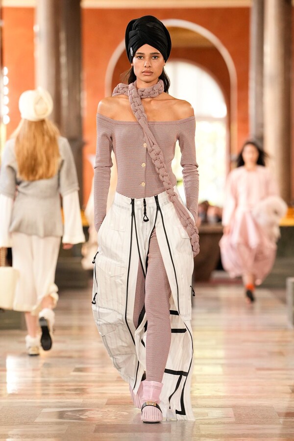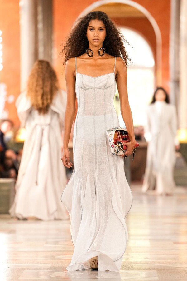 Nicolas Ghesquière 对廓形和层次的处理依旧亮眼:露肩连体裤搭配了拉链长裤,轻盈的针织连衣裙搭配袜子和一脚蹬凉鞋。这种处理方式模糊了轻松与正式之间的界限,强化了本季对于私人舒适性与公共展示之间的探索。