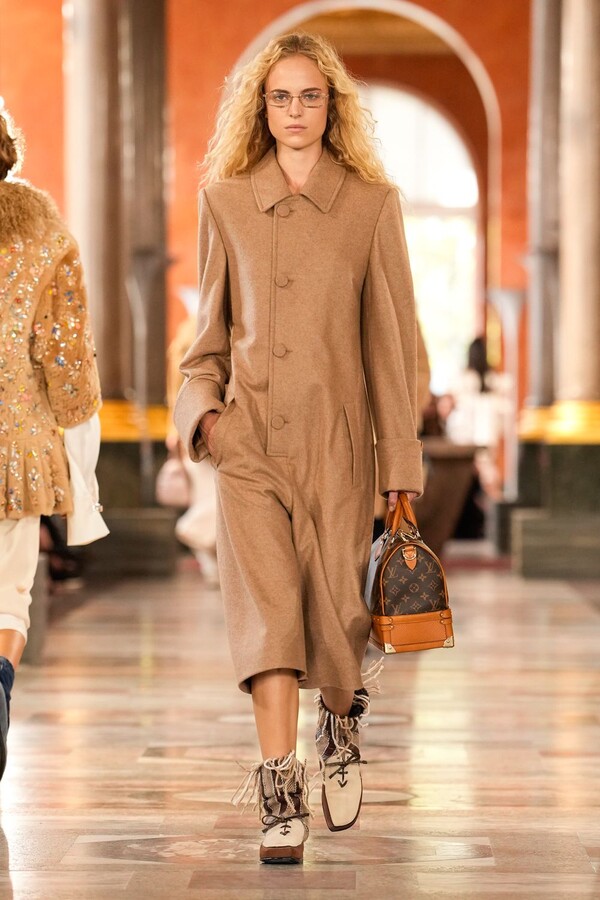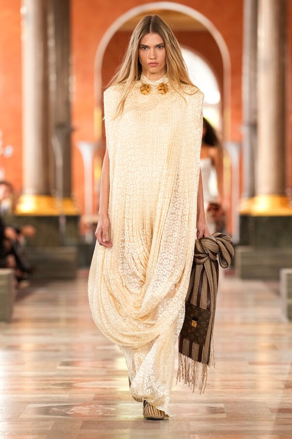 LOUIS VUITTON 2026 春夏系列亮相于卢浮宫内一处巴洛克风格的空间。在绘有壁画的天花板和大理石地板的映衬下,Nicolas Ghesquière 重新诠释了家居服和礼服的元素。开场造型奠定了基调:一件飘逸的花瓣袖长袍,廓形夸张却剪裁精准,将家居服重新定义为醒目的外套。由此,该系列陆续呈现了镶嵌水晶的长袍、以柔和粉彩重新演绎的定制睡衣套装和加长夹克,以及搭配半开式化妆盒的轻盈衬裙。配饰与 LOUIS VUITTON 历史悠久的旅行箱相呼应,暗示着对私人生活的展现。
