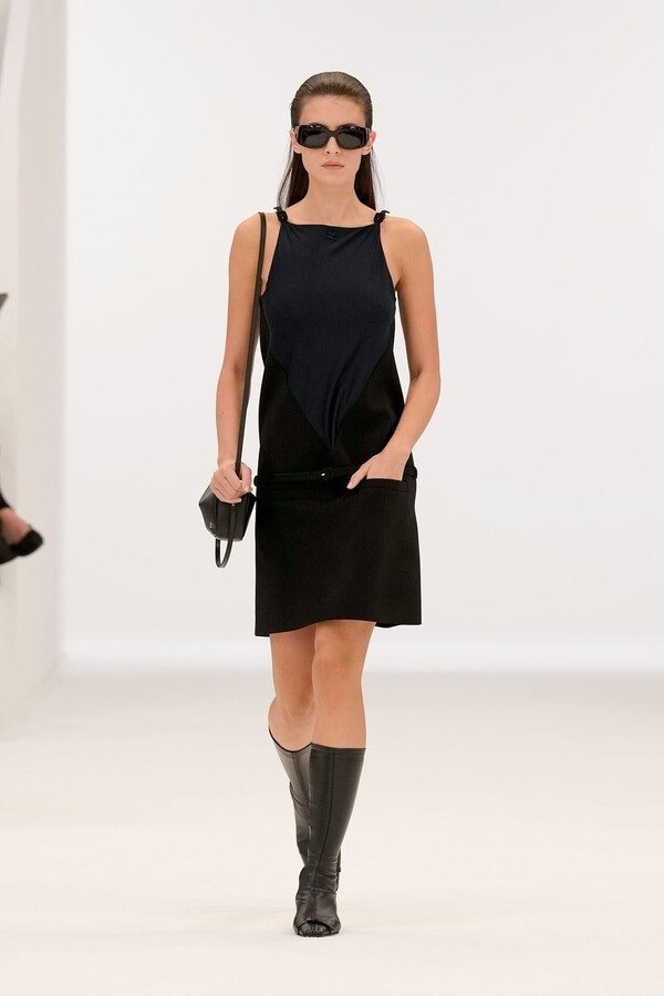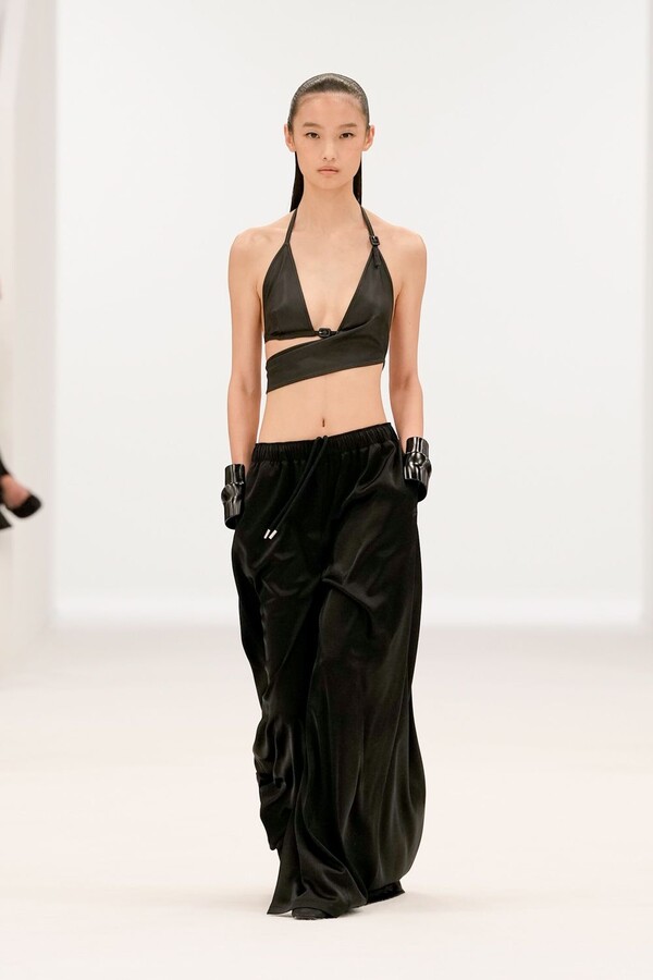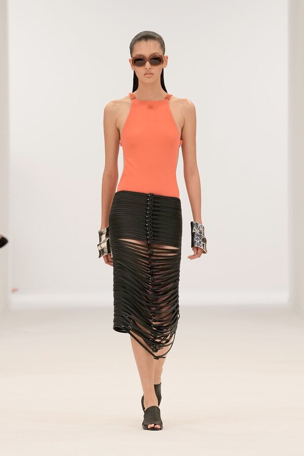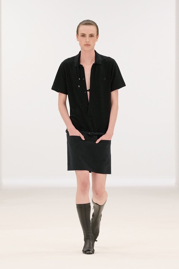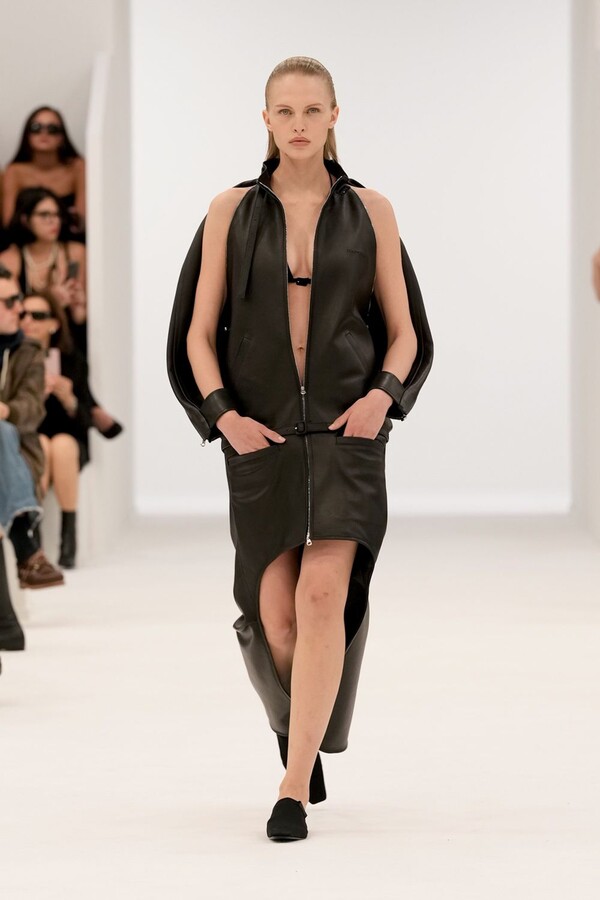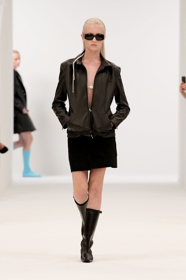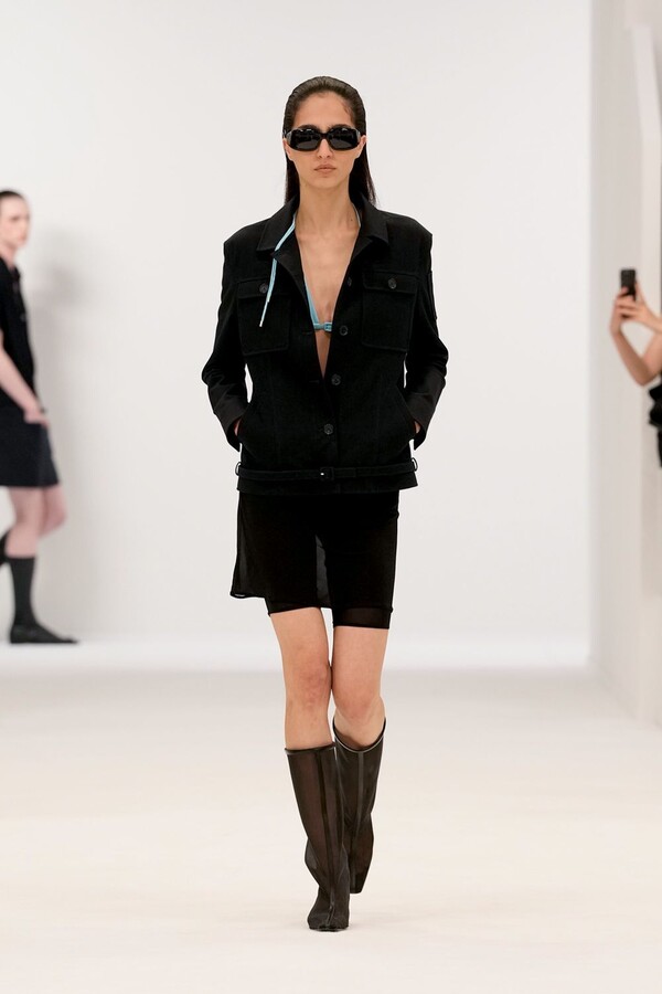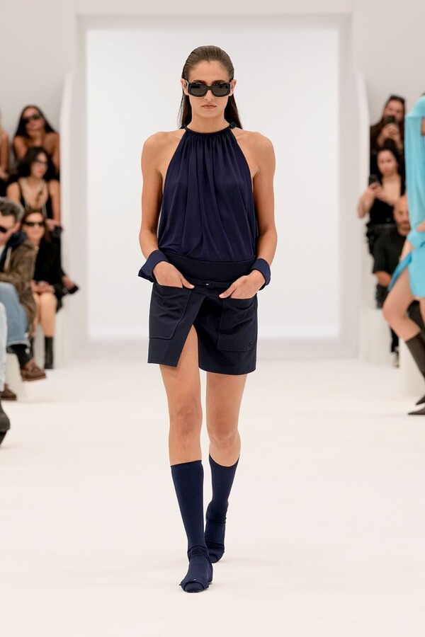 在全球变暖成为话题的当下,Nicolas Di Felice 在剪裁方面进行了各种实验,以展示 Courrèges 的现代服装在炎热天气下会是何种面貌。他尤其擅长上衣的不对称包裹、连体衣肩线剪裁的几何造型,以及服装的融合。短裤在后背变成了长裙;皮革机车夹克的袖子拉链是垂直拉开的,方便纳凉。Nicolas Di Felice 还以全球变暖作为隐喻,将设计推向更极端的融化理念。「阳光充足的时候,有时你真的看不清眼前的东西。」