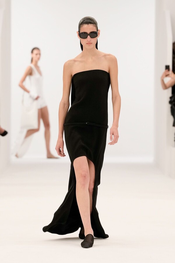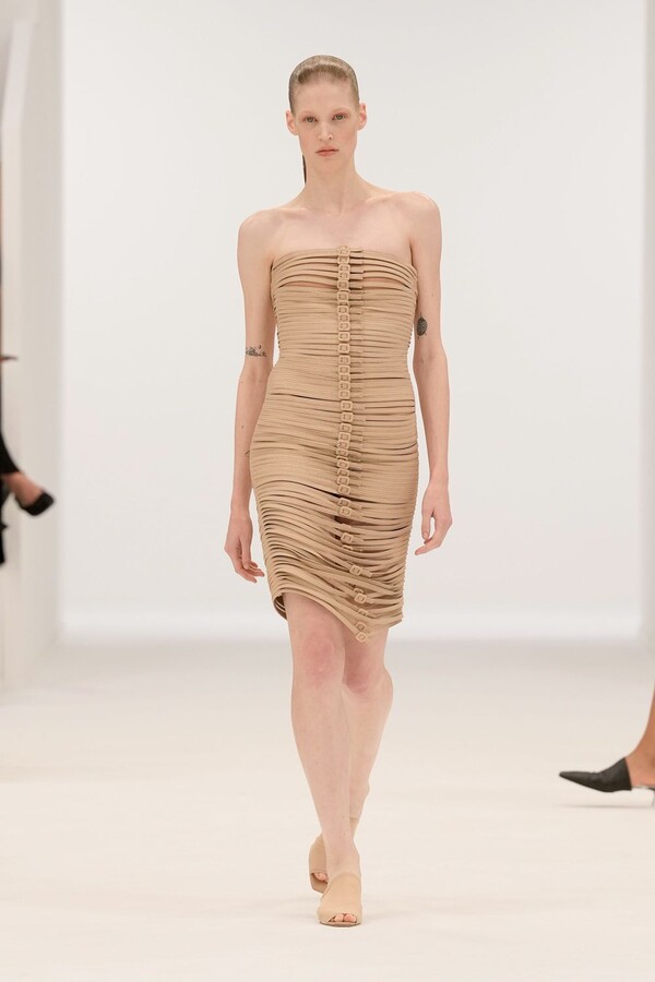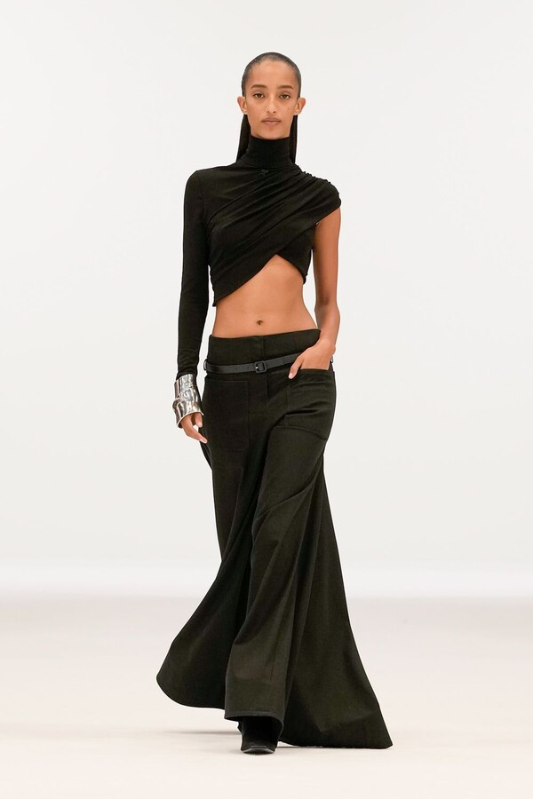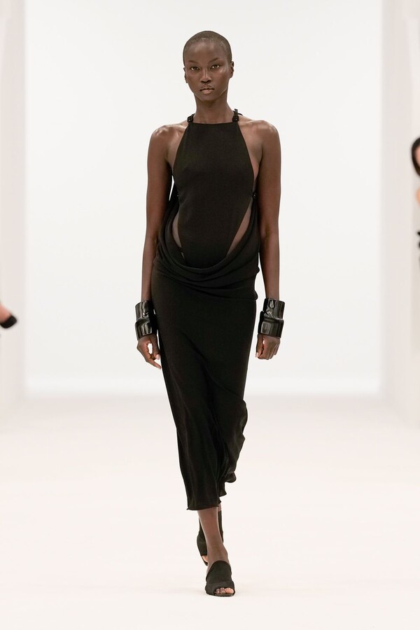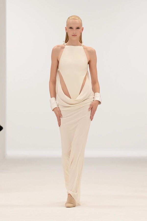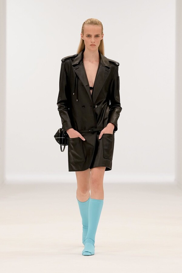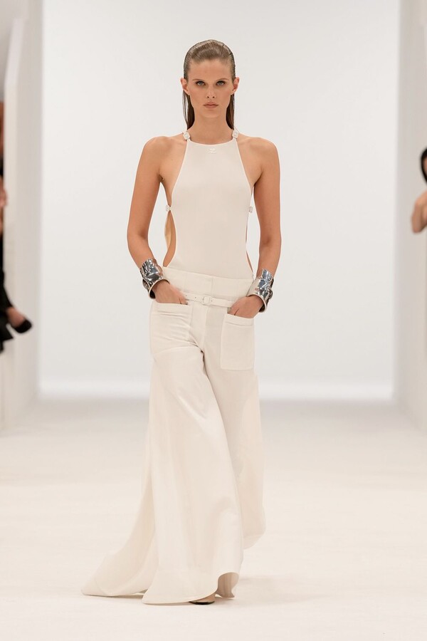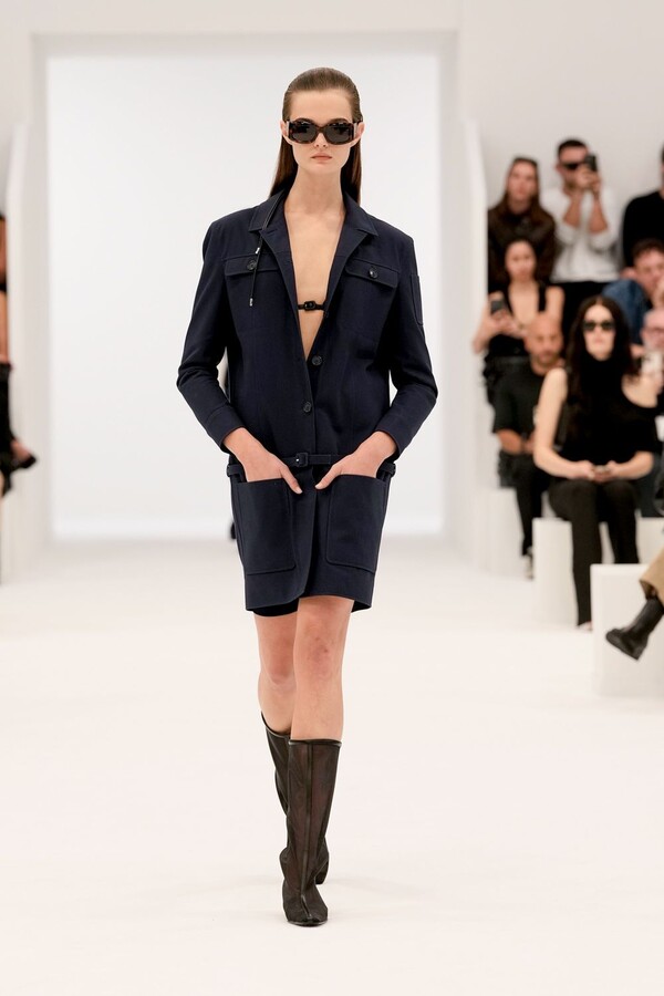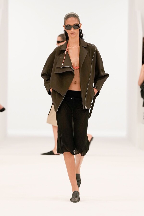 在全球变暖成为话题的当下,Nicolas Di Felice 在剪裁方面进行了各种实验,以展示 Courrèges 的现代服装在炎热天气下会是何种面貌。他尤其擅长上衣的不对称包裹、连体衣肩线剪裁的几何造型,以及服装的融合。短裤在后背变成了长裙;皮革机车夹克的袖子拉链是垂直拉开的,方便纳凉。Nicolas Di Felice 还以全球变暖作为隐喻,将设计推向更极端的融化理念。「阳光充足的时候,有时你真的看不清眼前的东西。」