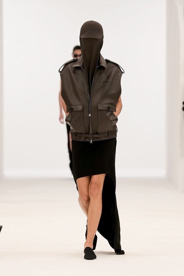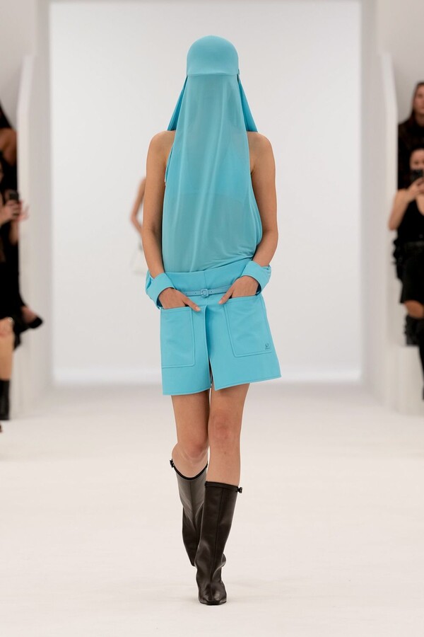 外形上看似面纱,但 Courrèges 2026 春夏秀场开场的五块面罩并非源于任何宗教,而实则功能性紫外线阻隔物。Nicolas Di Felice 称在泰国旅行时见过这类产品出售。经过他的重新设计,这种面料被固定在鸭舌帽上,遮盖住脸部,然后塞进同样面料的 A 字迷你裙中。