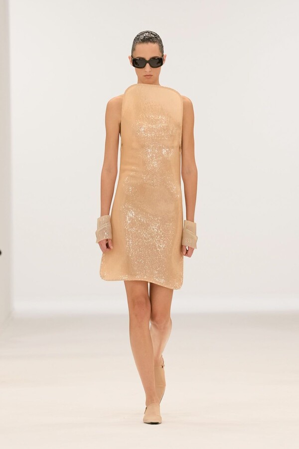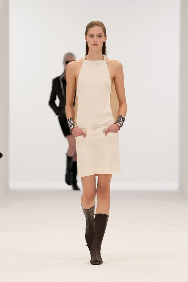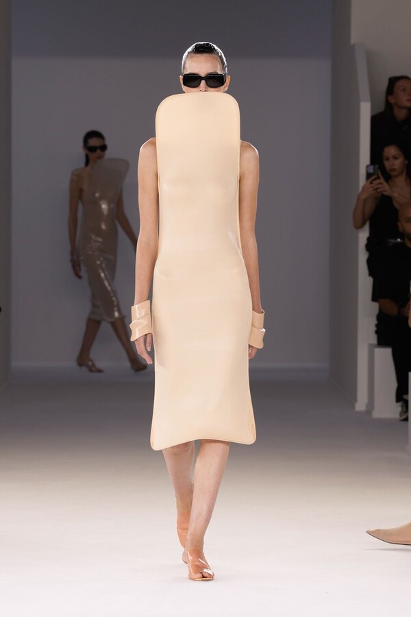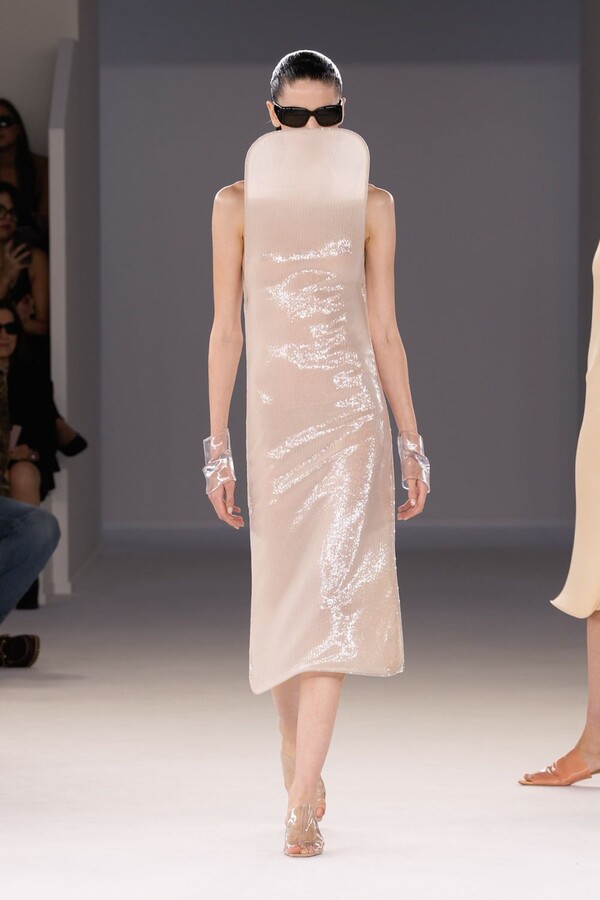 汽车挡风玻璃的形状被用来打造成圆形的遮阳面罩,从连衣裙和上衣中升起。这体现了 André Courrèges 的「未来主义」,但乐观主义的色彩却少了很多。这场秀没有大型的概念布景,只有上方一圈地狱般的灯光,灯光随着时间流逝变得越来越亮、越来越热,暗示着全球变暖的现状。