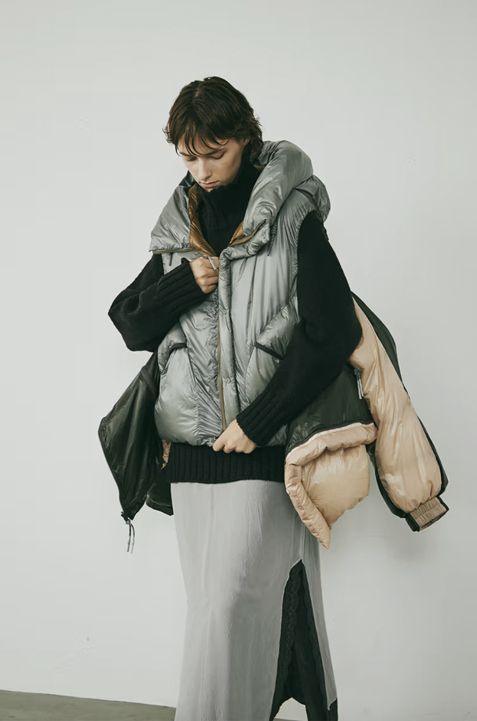 此次联名系列的核心亮点在于「多层穿搭系统」。夹克与背心通过结构性连接设计,可实现六种以上的穿搭方式,既能应对户外严寒,也能适配室内温暖环境。双面设计则进一步扩展了造型可能,让一件羽绒单品拥有比传统羽绒服更广泛的穿搭风格。