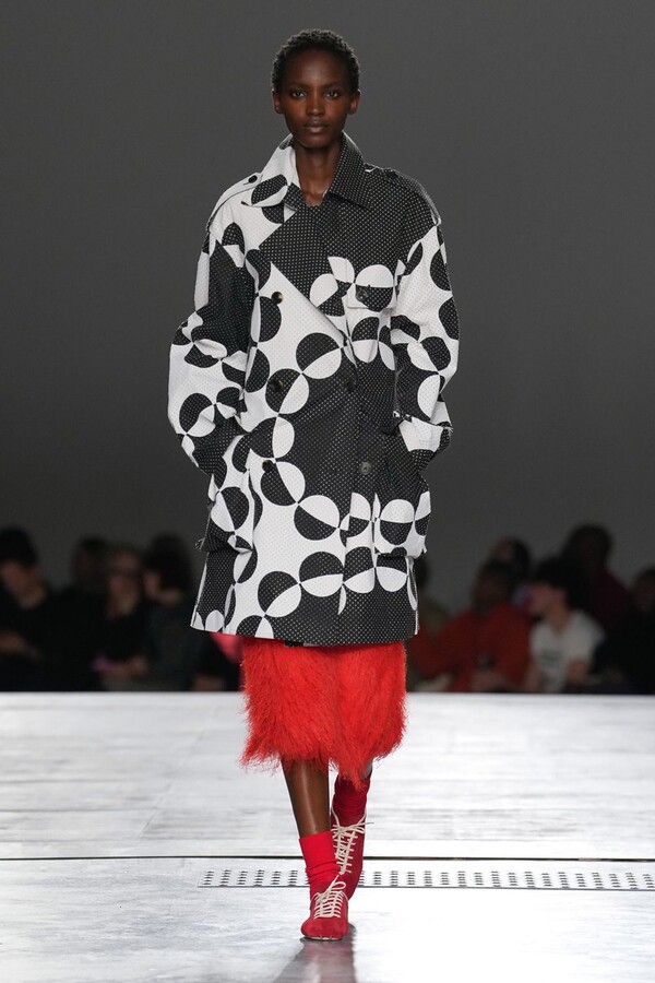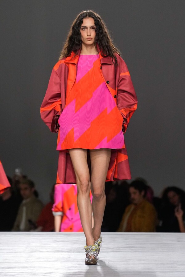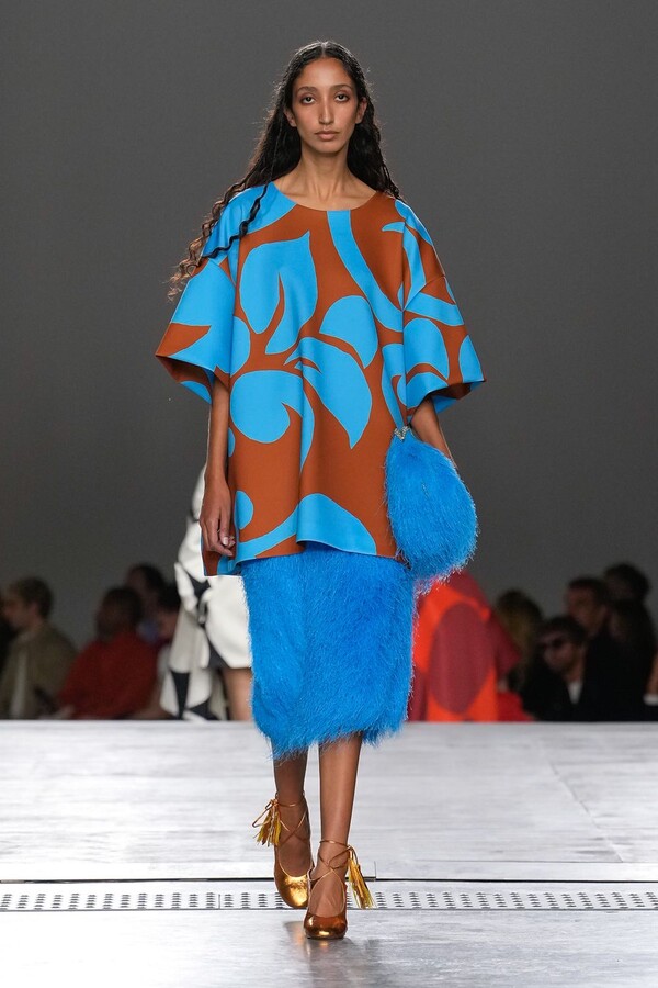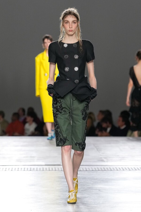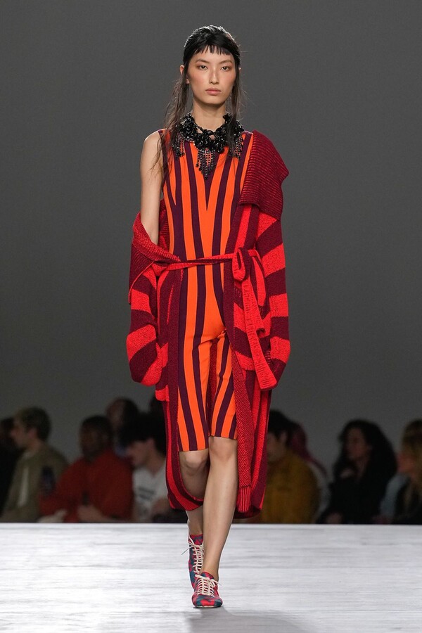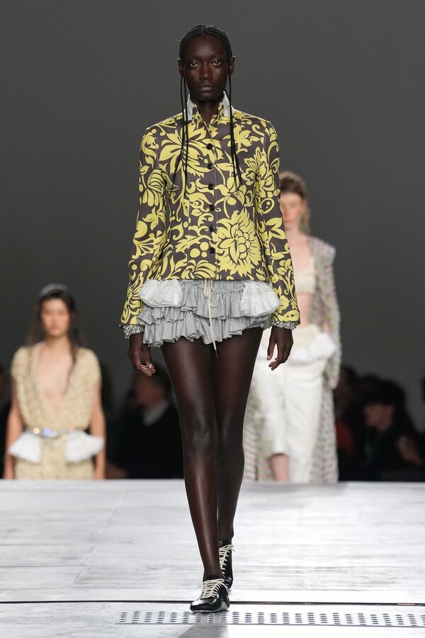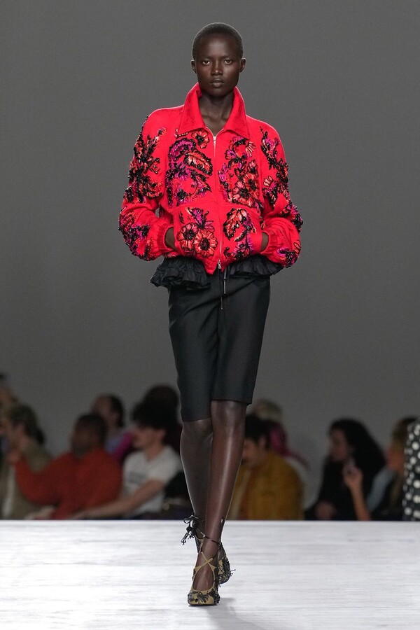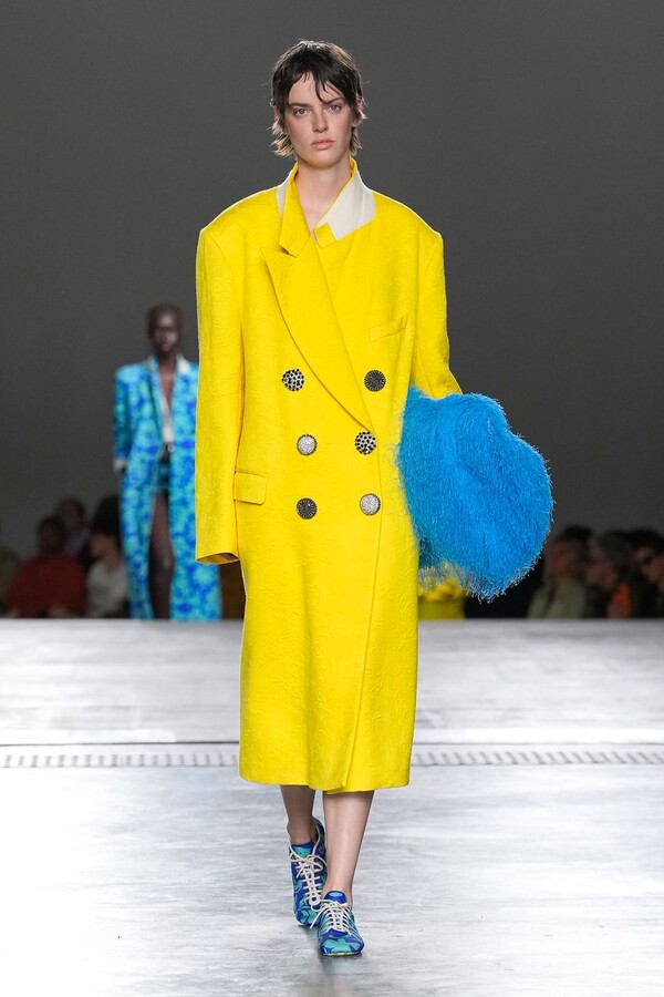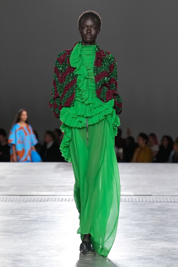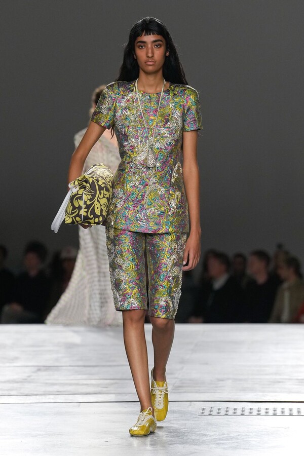 另一亮点——纹理也贯穿始终。流畅的针织上衣在肩部饰以夸张的荷叶边,军装风格的外套和夹克有着修长的比例和华丽色调,颇具戏剧感。淡黄色羊毛与午夜天鹅绒形成鲜明对比,而代尔夫特蓝、奶油色和勃艮第酒红色则在层叠造型中营造出莫名的和谐感。在配饰方面,彩虹色系的运动鞋等设计也为整体增添了欢乐感。