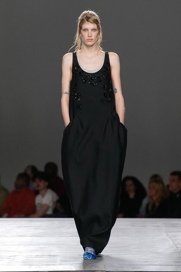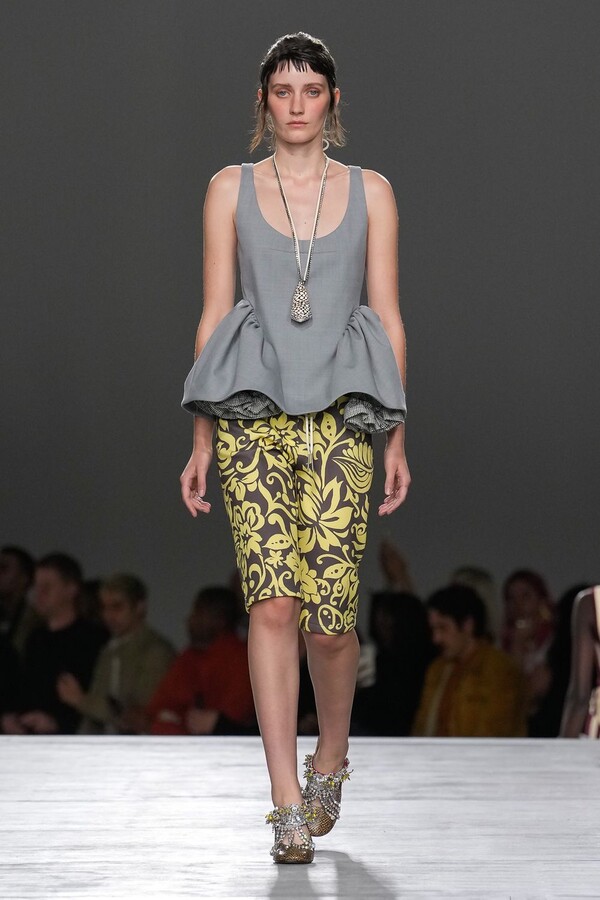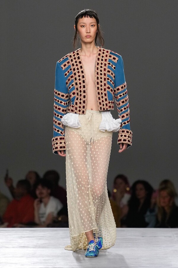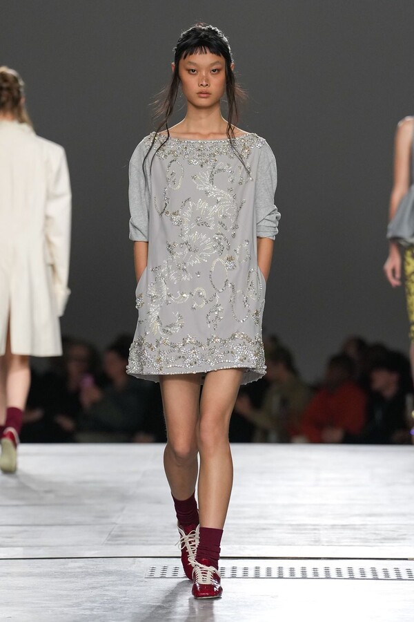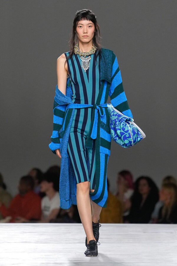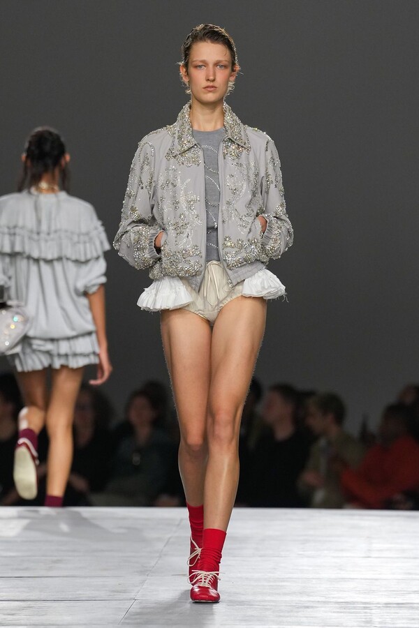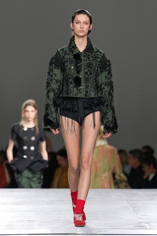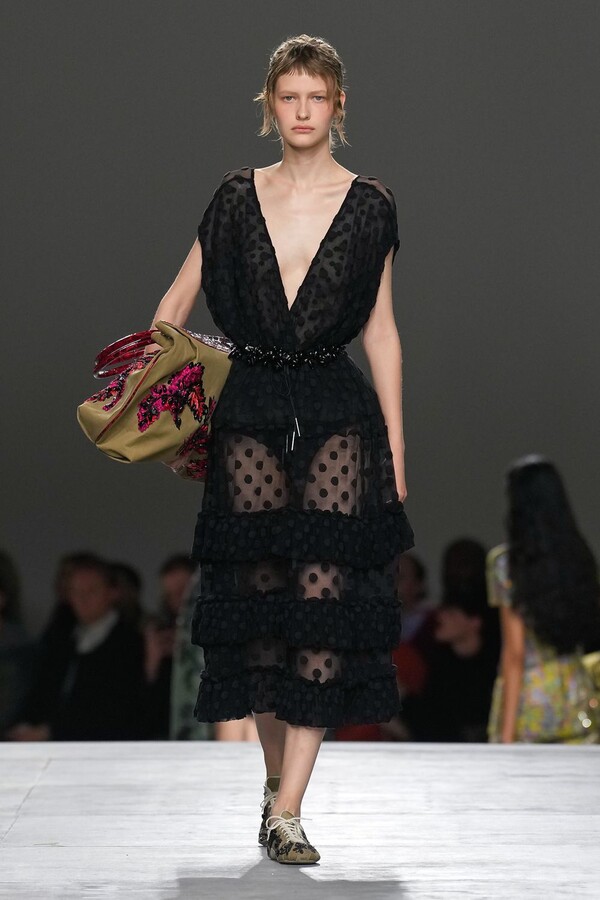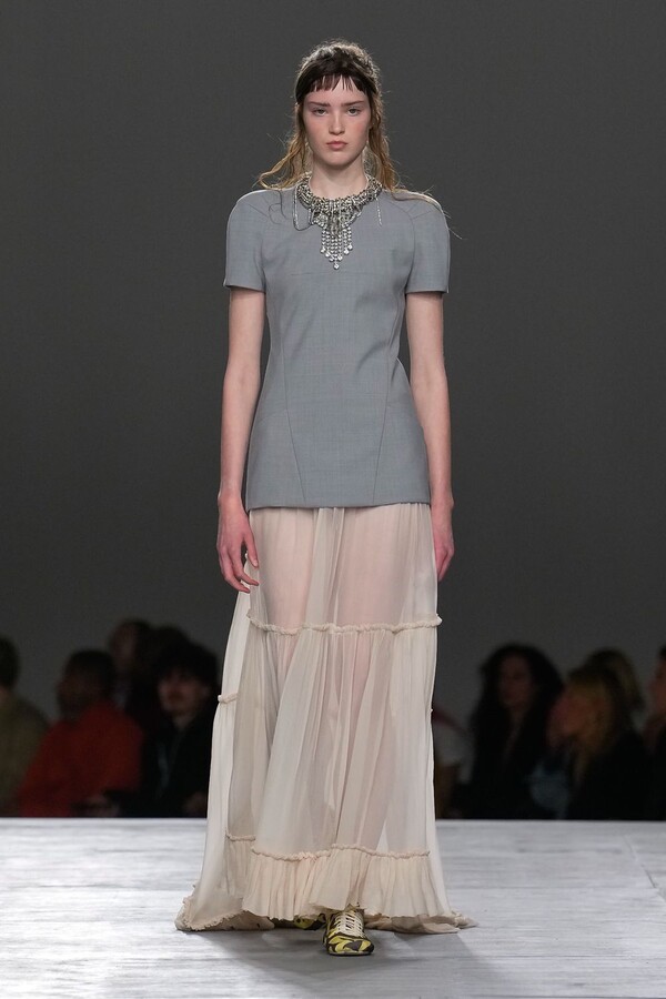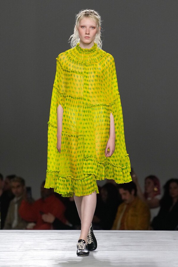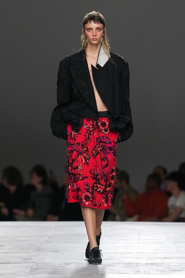 另一亮点——纹理也贯穿始终。流畅的针织上衣在肩部饰以夸张的荷叶边,军装风格的外套和夹克有着修长的比例和华丽色调,颇具戏剧感。淡黄色羊毛与午夜天鹅绒形成鲜明对比,而代尔夫特蓝、奶油色和勃艮第酒红色则在层叠造型中营造出莫名的和谐感。在配饰方面,彩虹色系的运动鞋等设计也为整体增添了欢乐感。