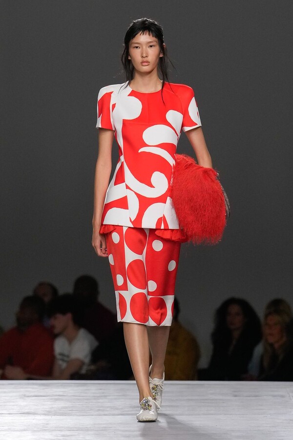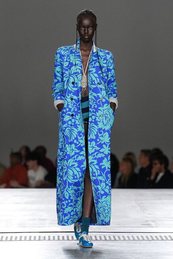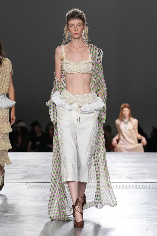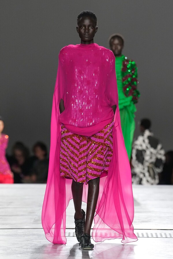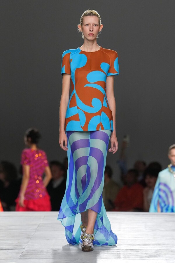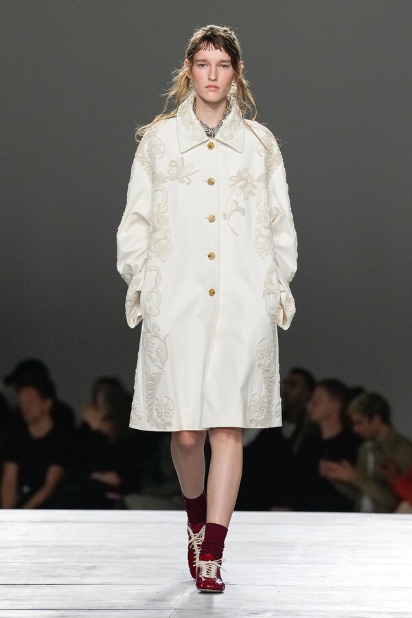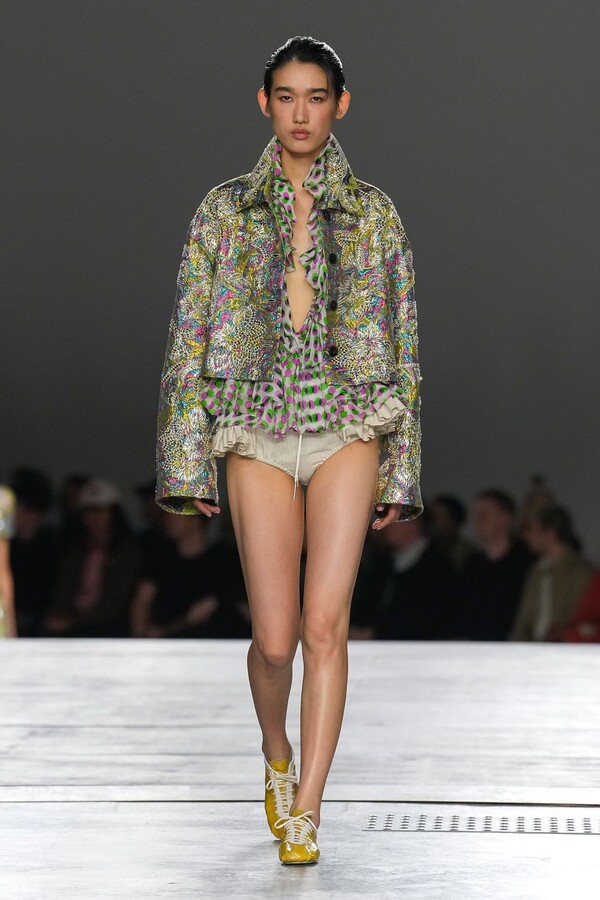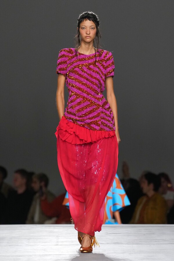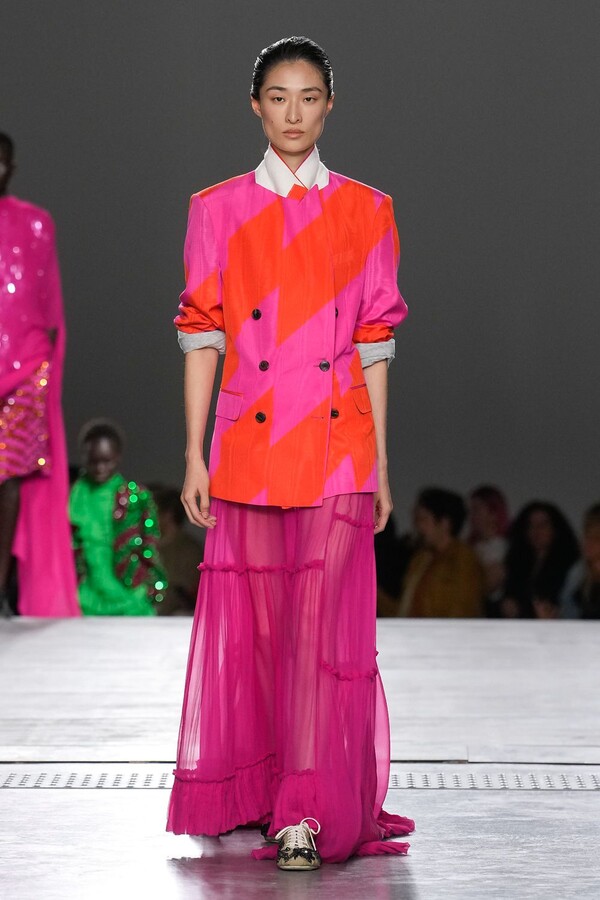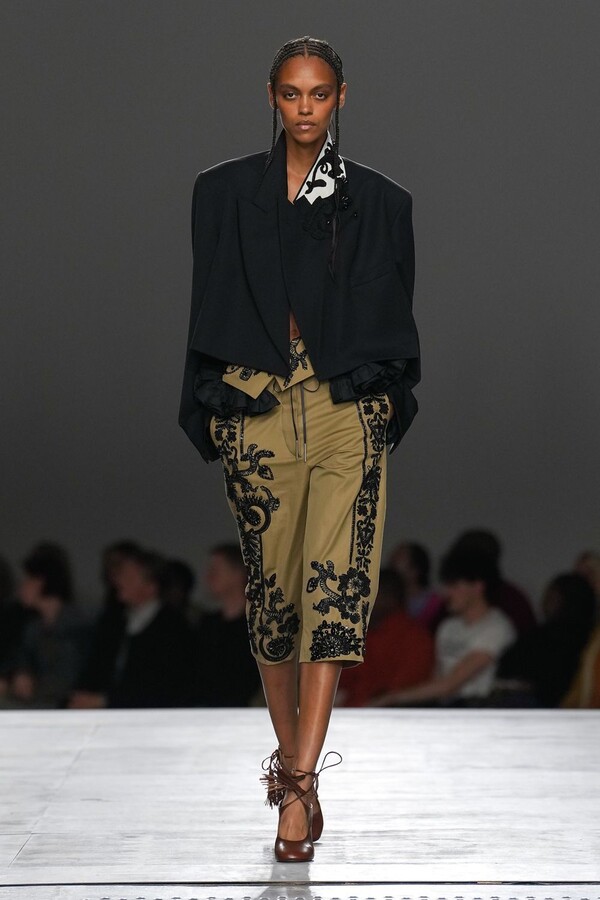 另一亮点——纹理也贯穿始终。流畅的针织上衣在肩部饰以夸张的荷叶边,军装风格的外套和夹克有着修长的比例和华丽色调,颇具戏剧感。淡黄色羊毛与午夜天鹅绒形成鲜明对比,而代尔夫特蓝、奶油色和勃艮第酒红色则在层叠造型中营造出莫名的和谐感。在配饰方面,彩虹色系的运动鞋等设计也为整体增添了欢乐感。