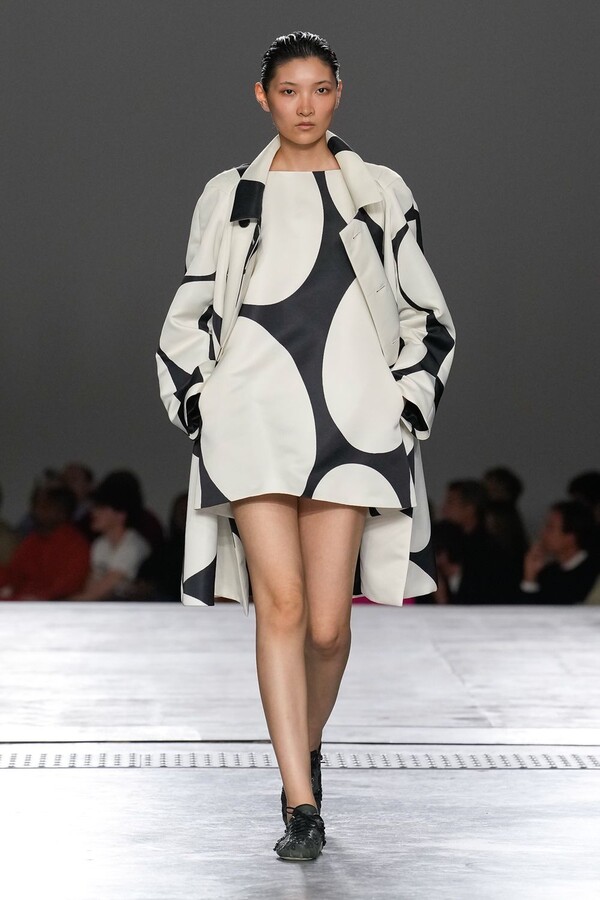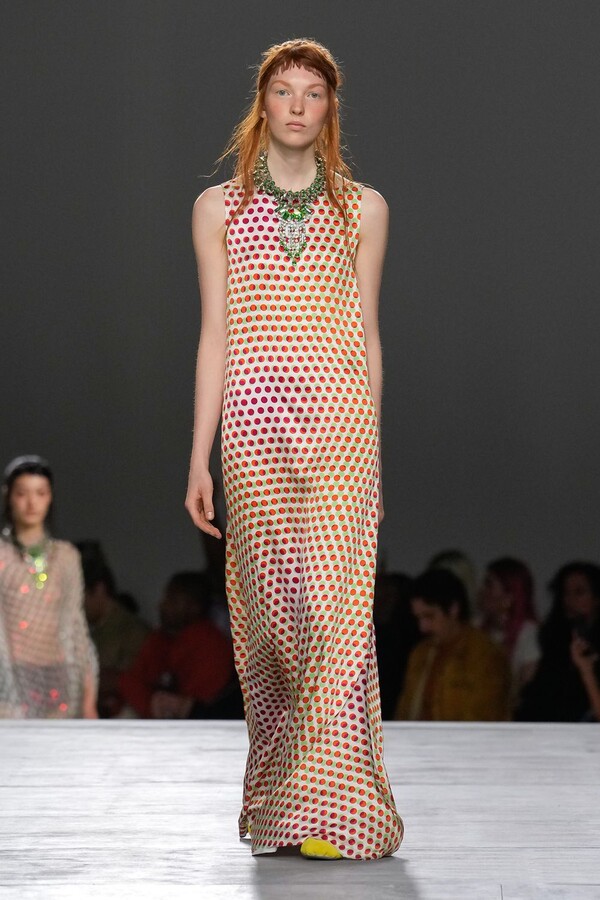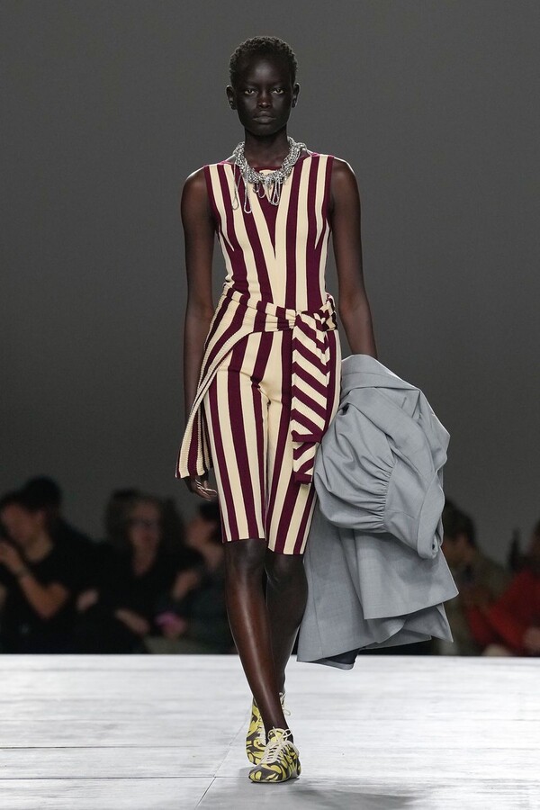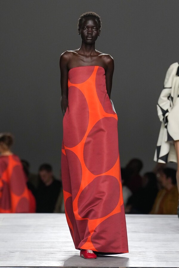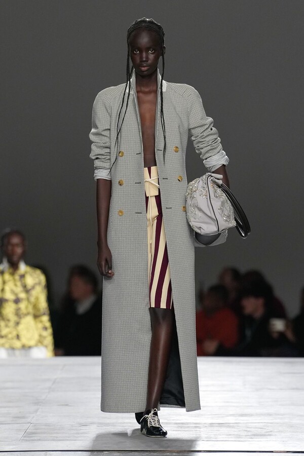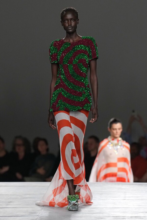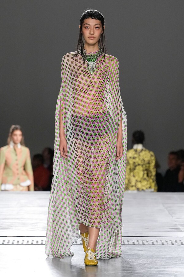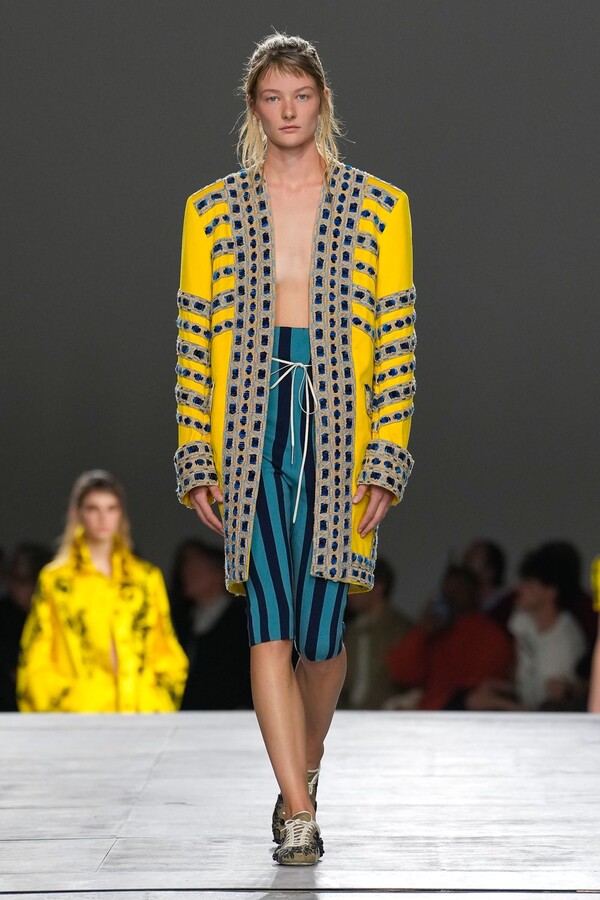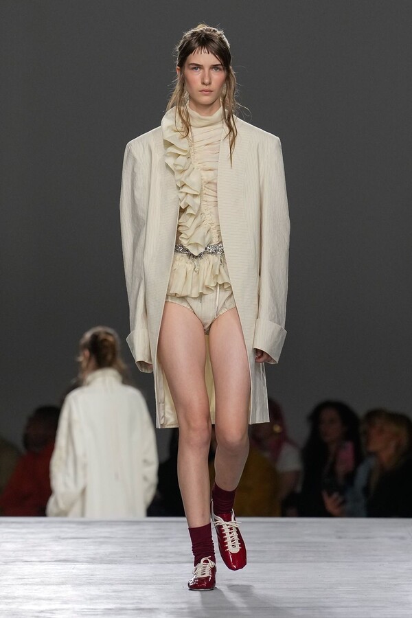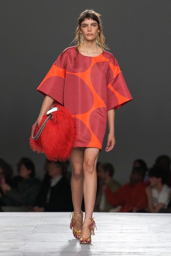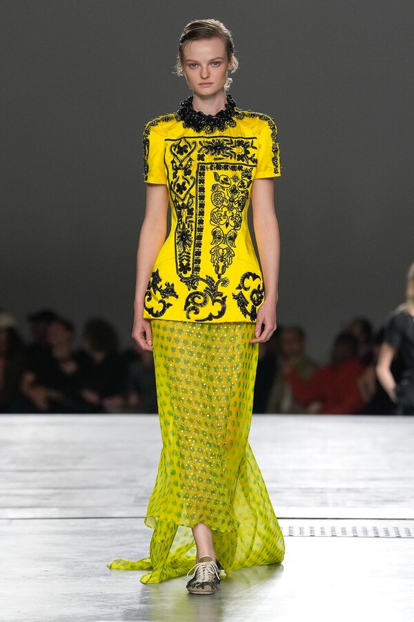 另一亮点——纹理也贯穿始终。流畅的针织上衣在肩部饰以夸张的荷叶边,军装风格的外套和夹克有着修长的比例和华丽色调,颇具戏剧感。淡黄色羊毛与午夜天鹅绒形成鲜明对比,而代尔夫特蓝、奶油色和勃艮第酒红色则在层叠造型中营造出莫名的和谐感。在配饰方面,彩虹色系的运动鞋等设计也为整体增添了欢乐感。