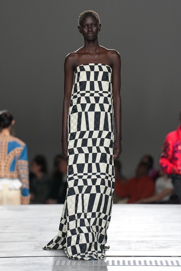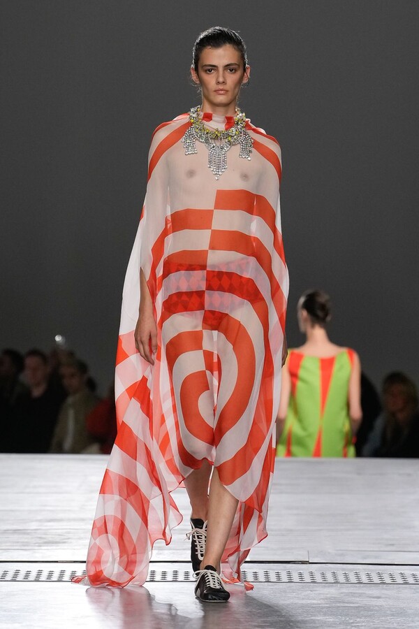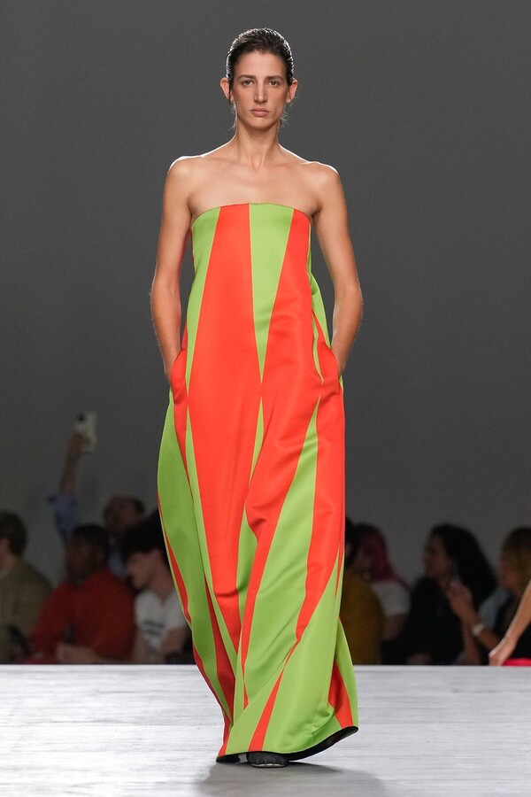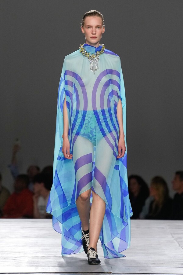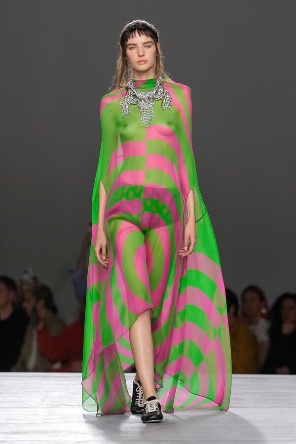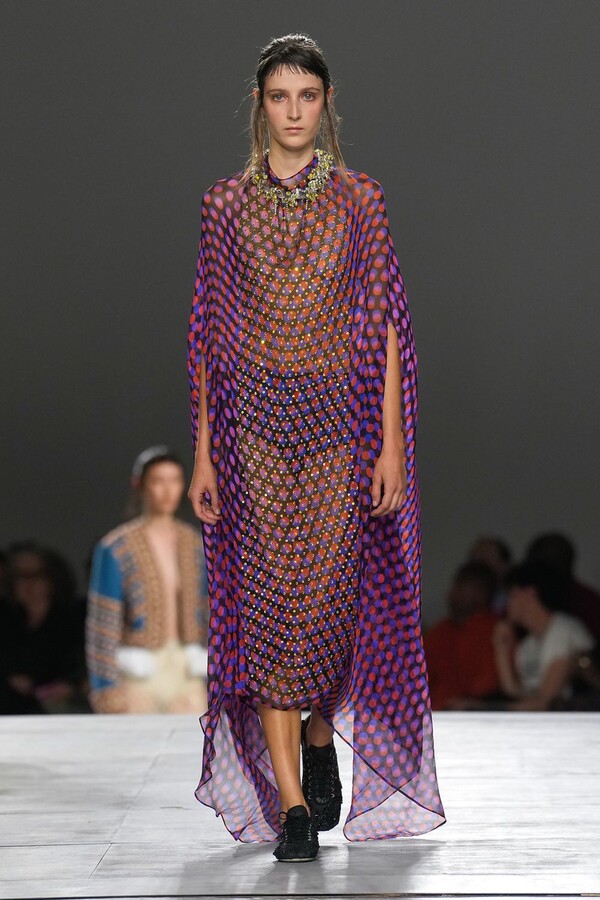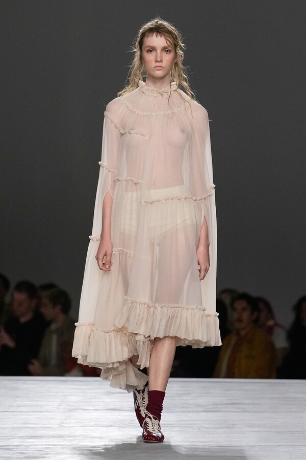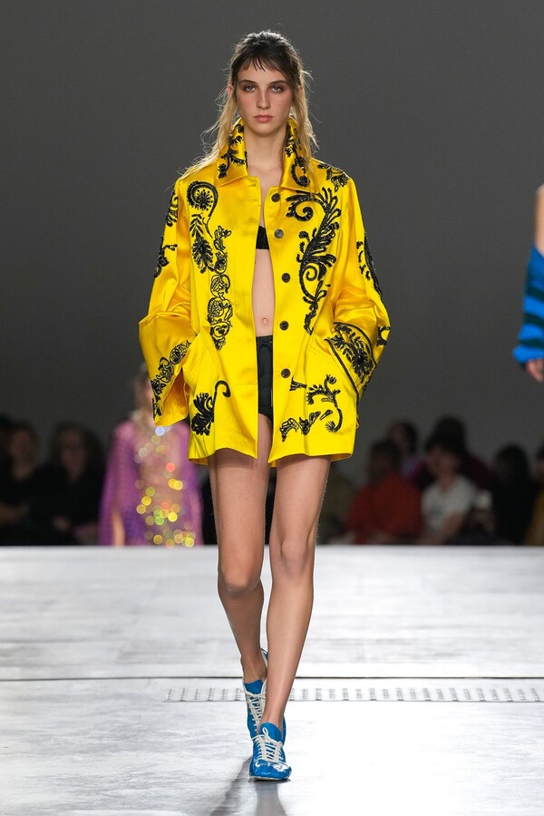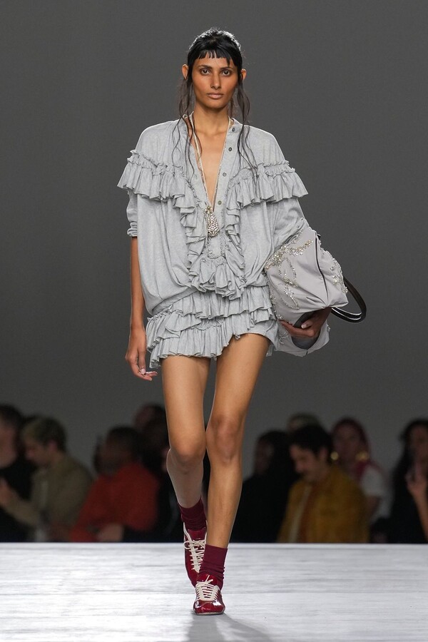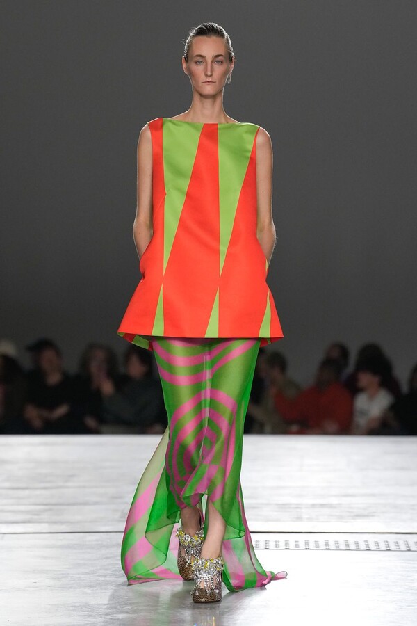 另一亮点——纹理也贯穿始终。流畅的针织上衣在肩部饰以夸张的荷叶边,军装风格的外套和夹克有着修长的比例和华丽色调,颇具戏剧感。淡黄色羊毛与午夜天鹅绒形成鲜明对比,而代尔夫特蓝、奶油色和勃艮第酒红色则在层叠造型中营造出莫名的和谐感。在配饰方面,彩虹色系的运动鞋等设计也为整体增添了欢乐感。