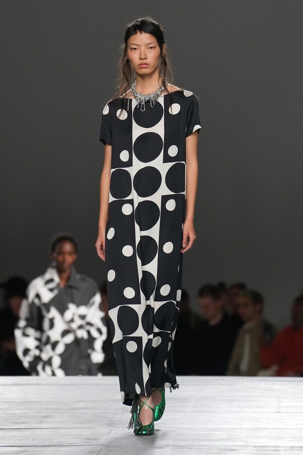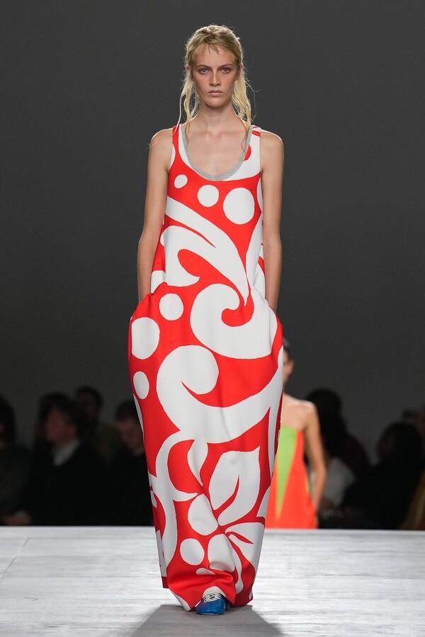 Dries Van Noten 2026 春夏秀以海滩及其自然魅力为起点,延伸至对色彩、动感和乐观精神的思考,整个系列充满了冲浪精神和海洋韵味。模特们身着柠檬黄、青柠绿、橘色和电光绿等亮色服装登场,轻薄的印花长衫在灯光下泛起涟漪,缀满的亮片如同水滴般倾泻而下。镶有水钻的飘逸直筒连衣裙格外引人注目,宛如阳光照耀下的水面。