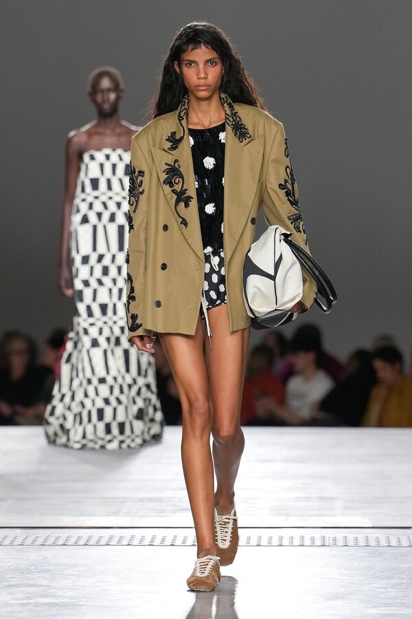 色彩对比一直是该品牌的标志性元素,在本季更为明显。双色剪裁夹克与轻盈透亮的半身裙相得益彰,实用的橄榄绿短裤则缀以精致的黑色珠饰,休闲中透着华丽。羊毛上衣雕塑感十足,其肩部设计令人想起潜水服的结构,搭配着的半透明半身裙将运动与高级定制完美融合。