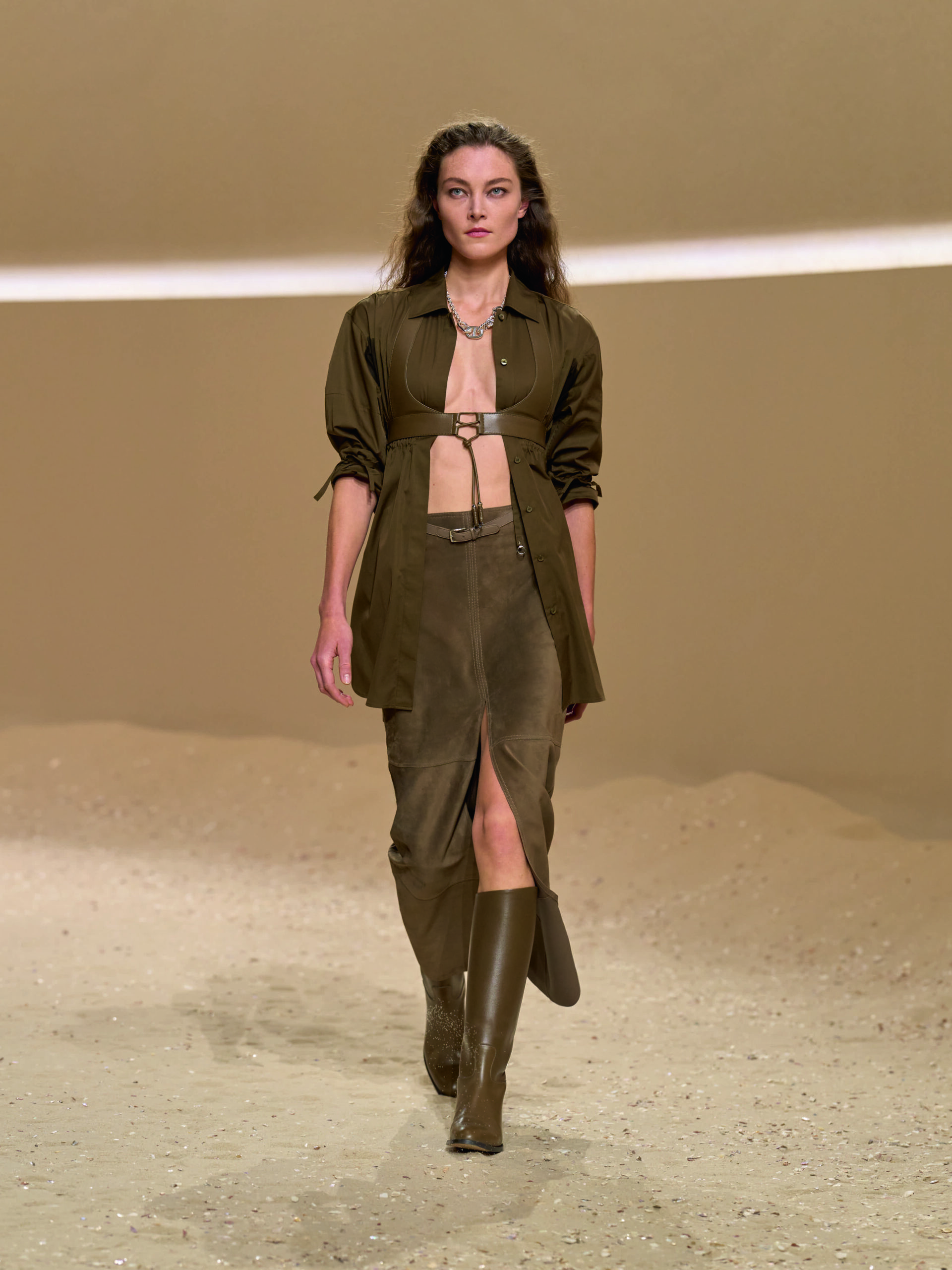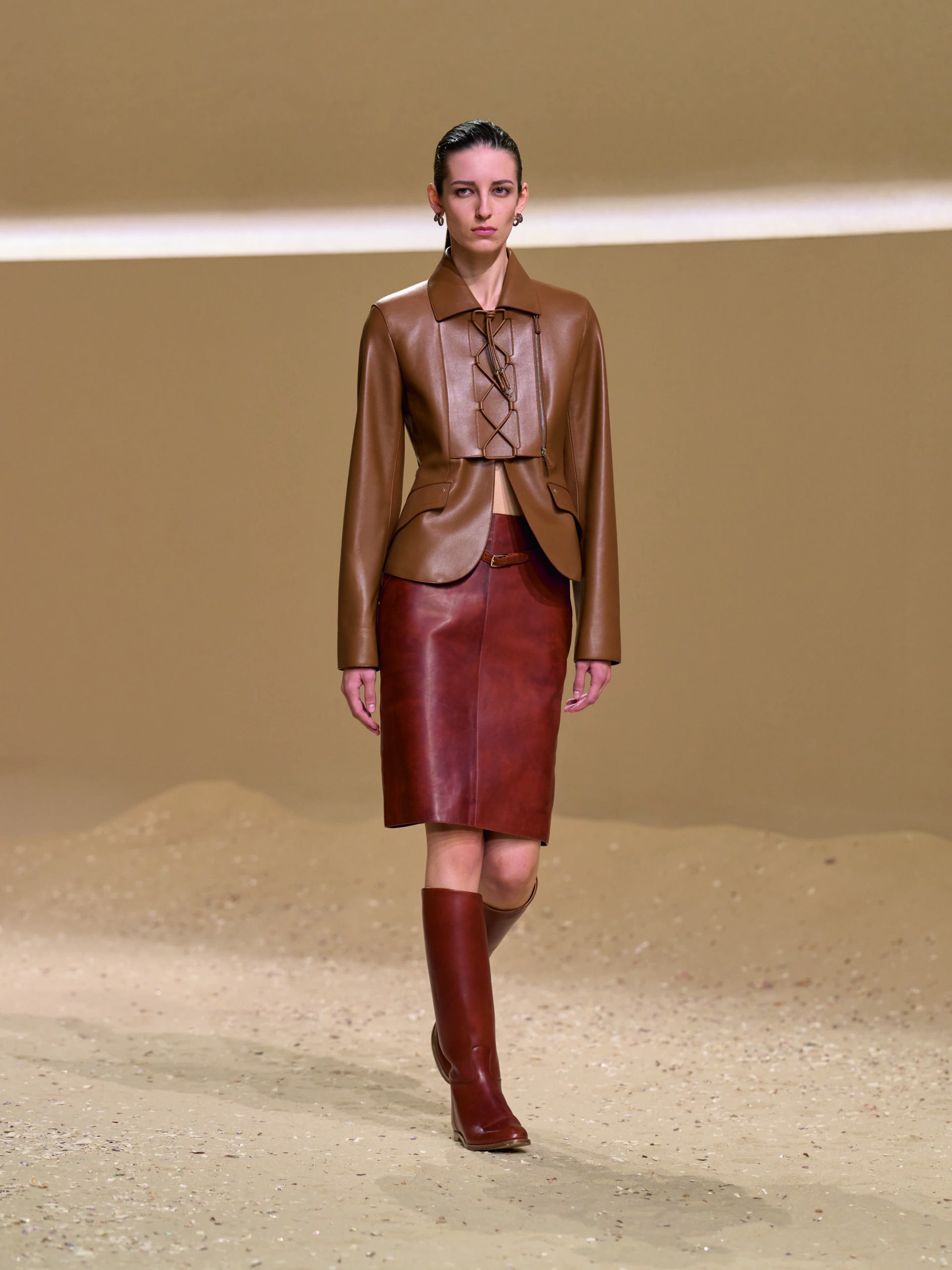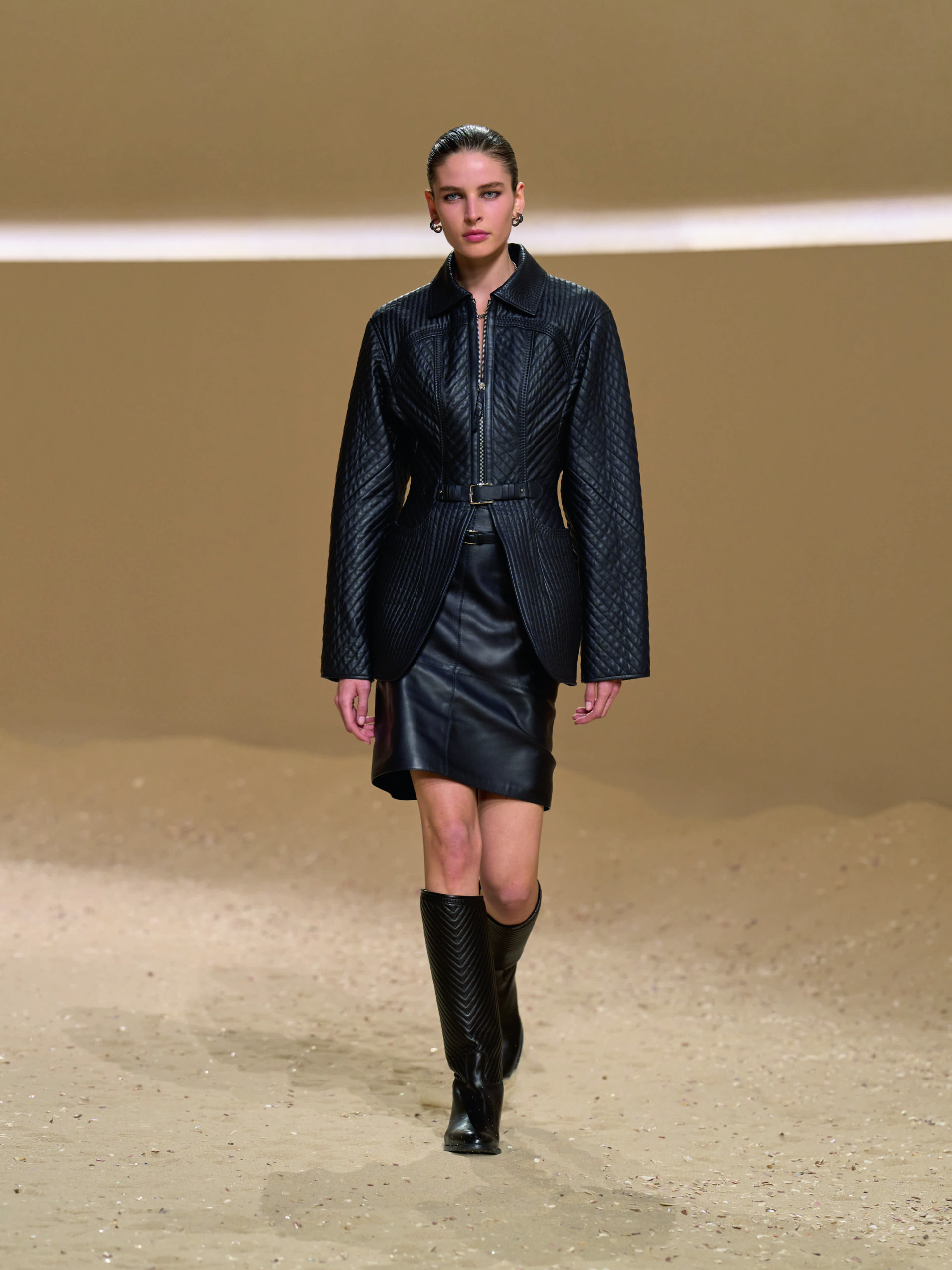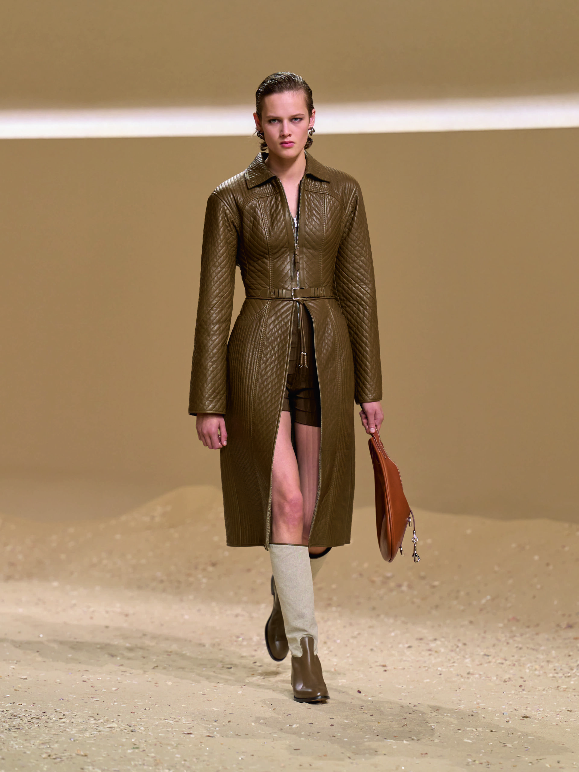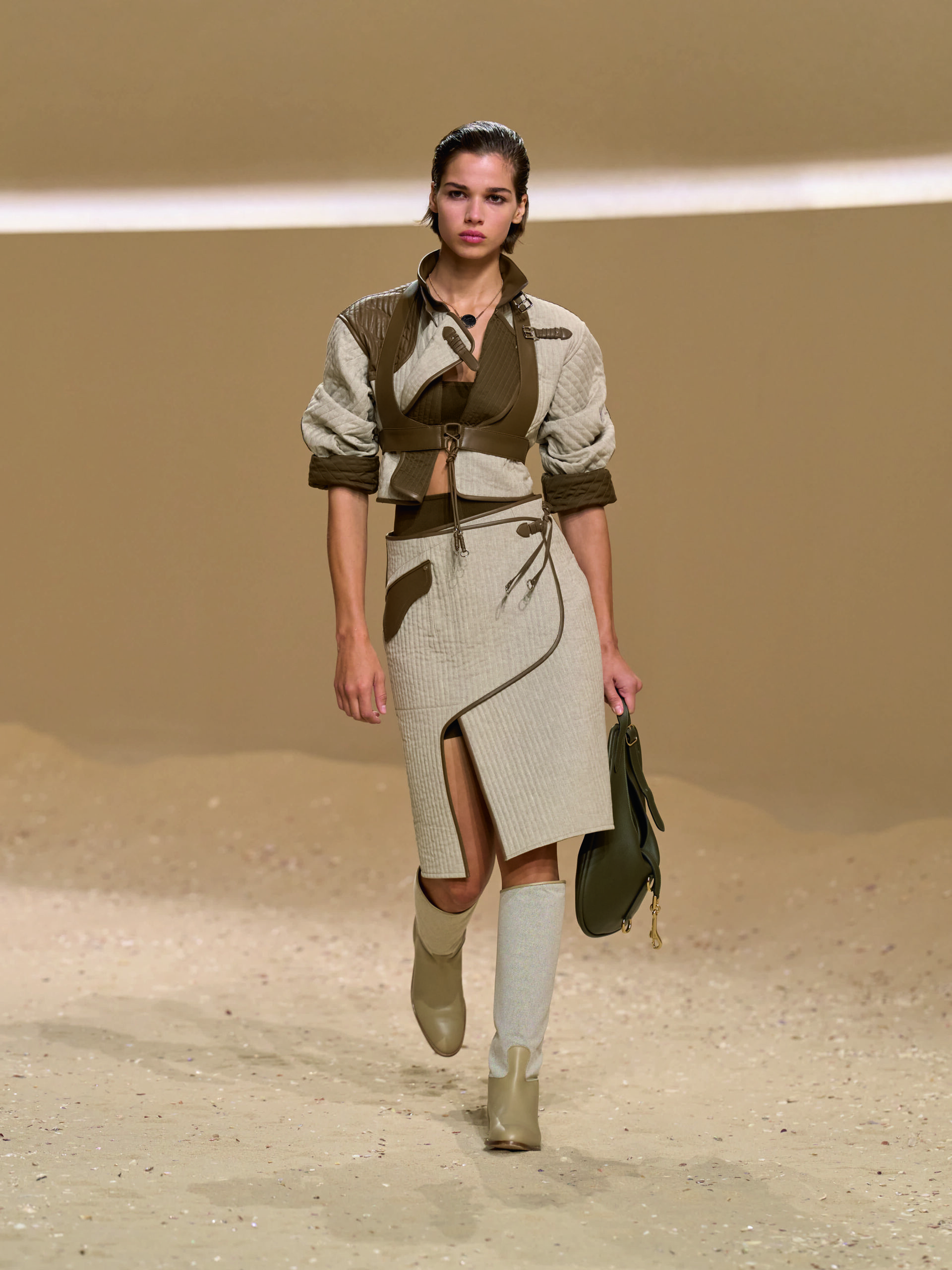 手工涂蜡皮革勾勒曼妙弧度;束带、搭扣与环饰将功能性与手工艺巧妙融合;绗缝工艺致敬皮革工艺与悠久的布提刺绣。为活动自如而设计的短款骑士夹克与绗缝亚麻帆布不对称半裙相映成趣;飘逸防风大衣灵感源于战壕风衣,以束带收紧腰身,呼应正装剪裁法则,亦诠释马术精准美学。