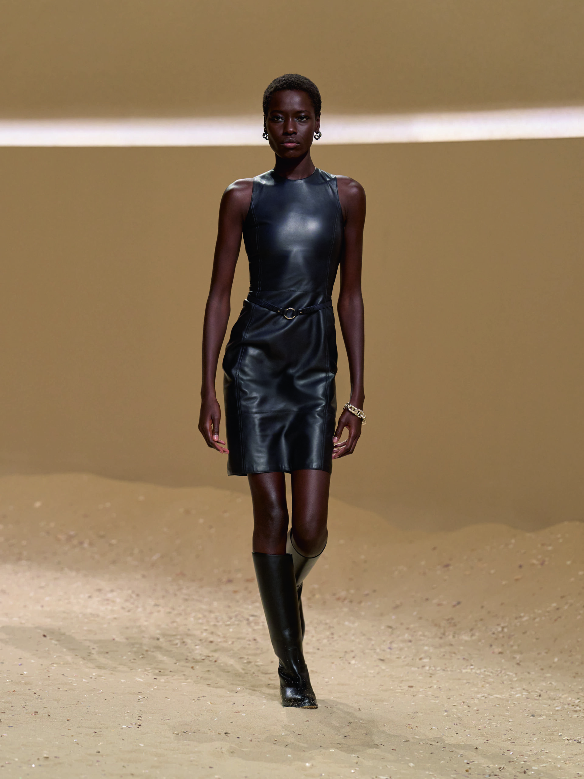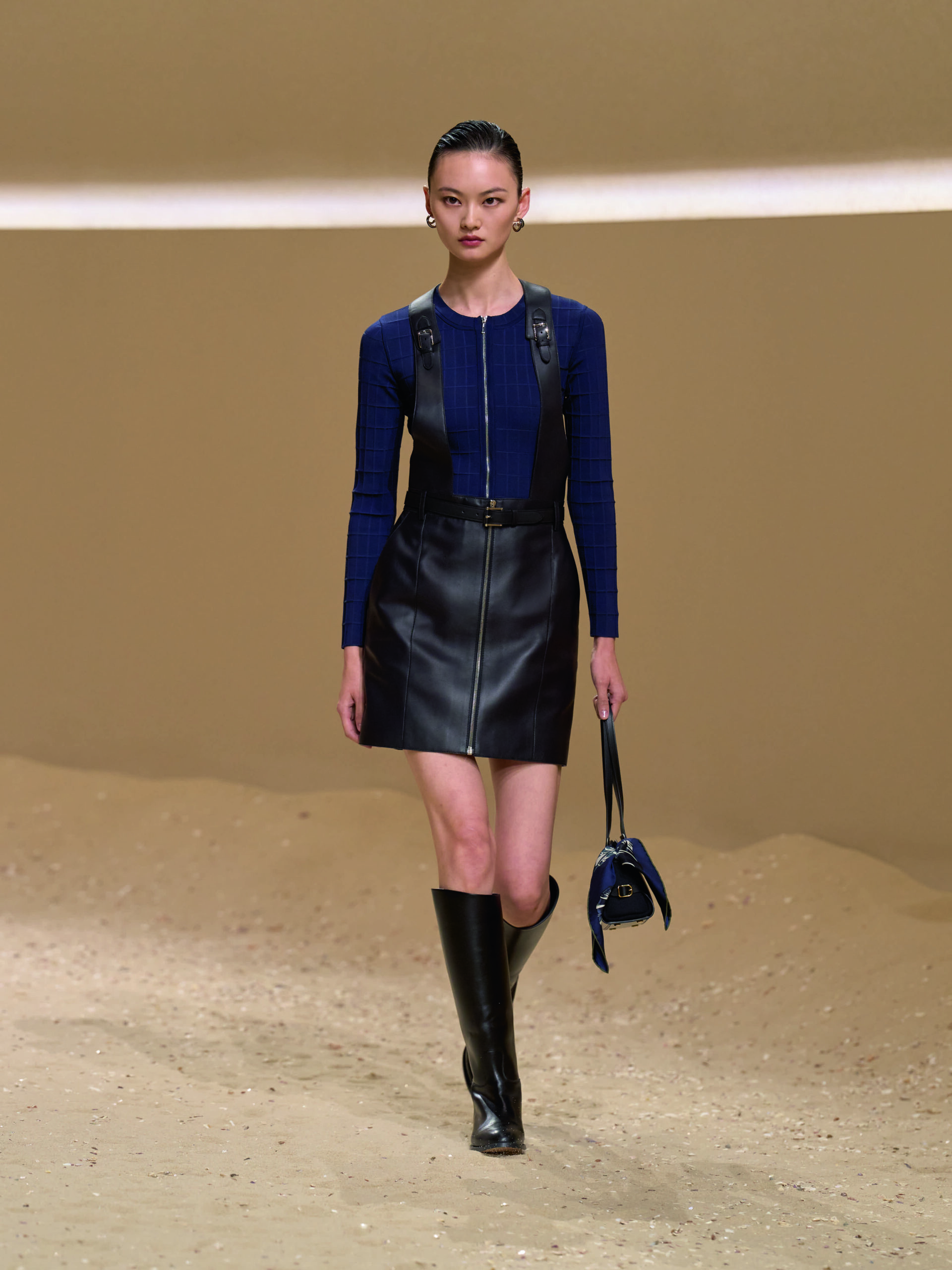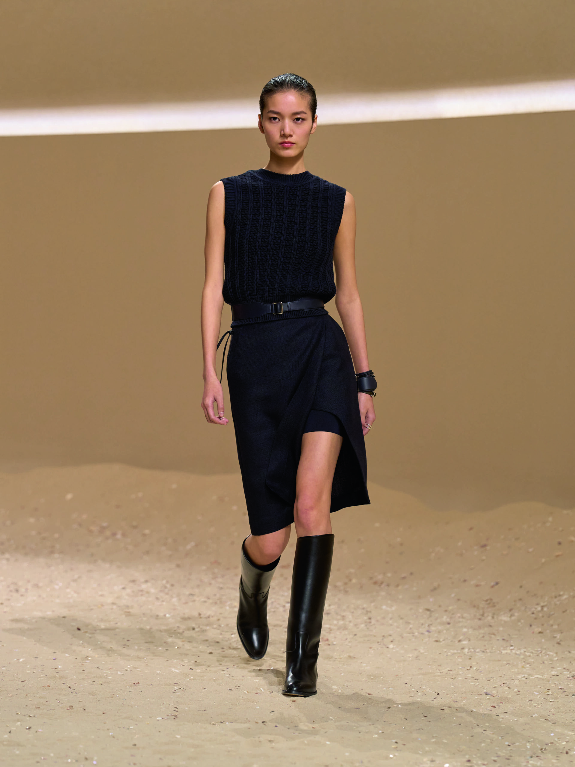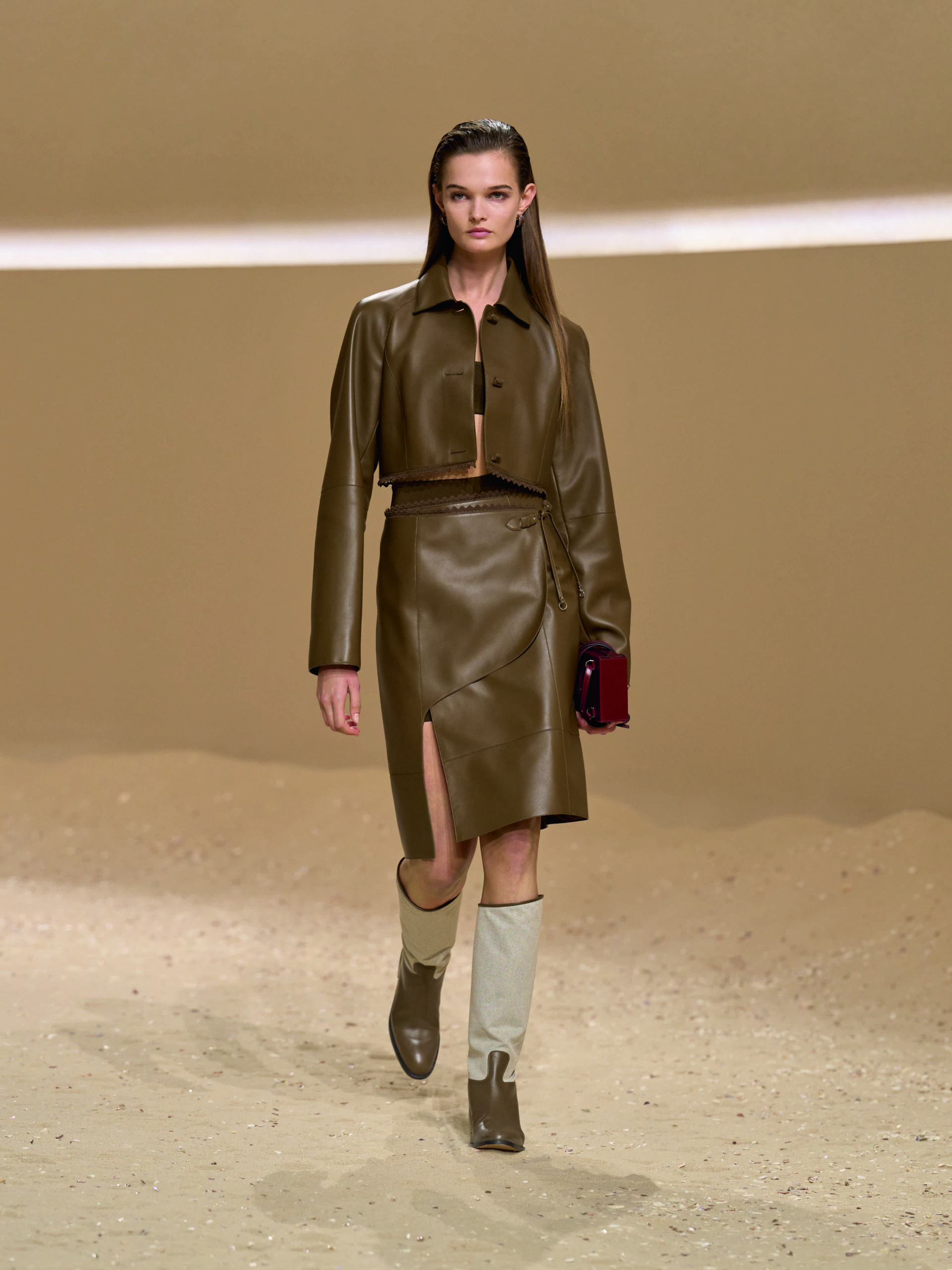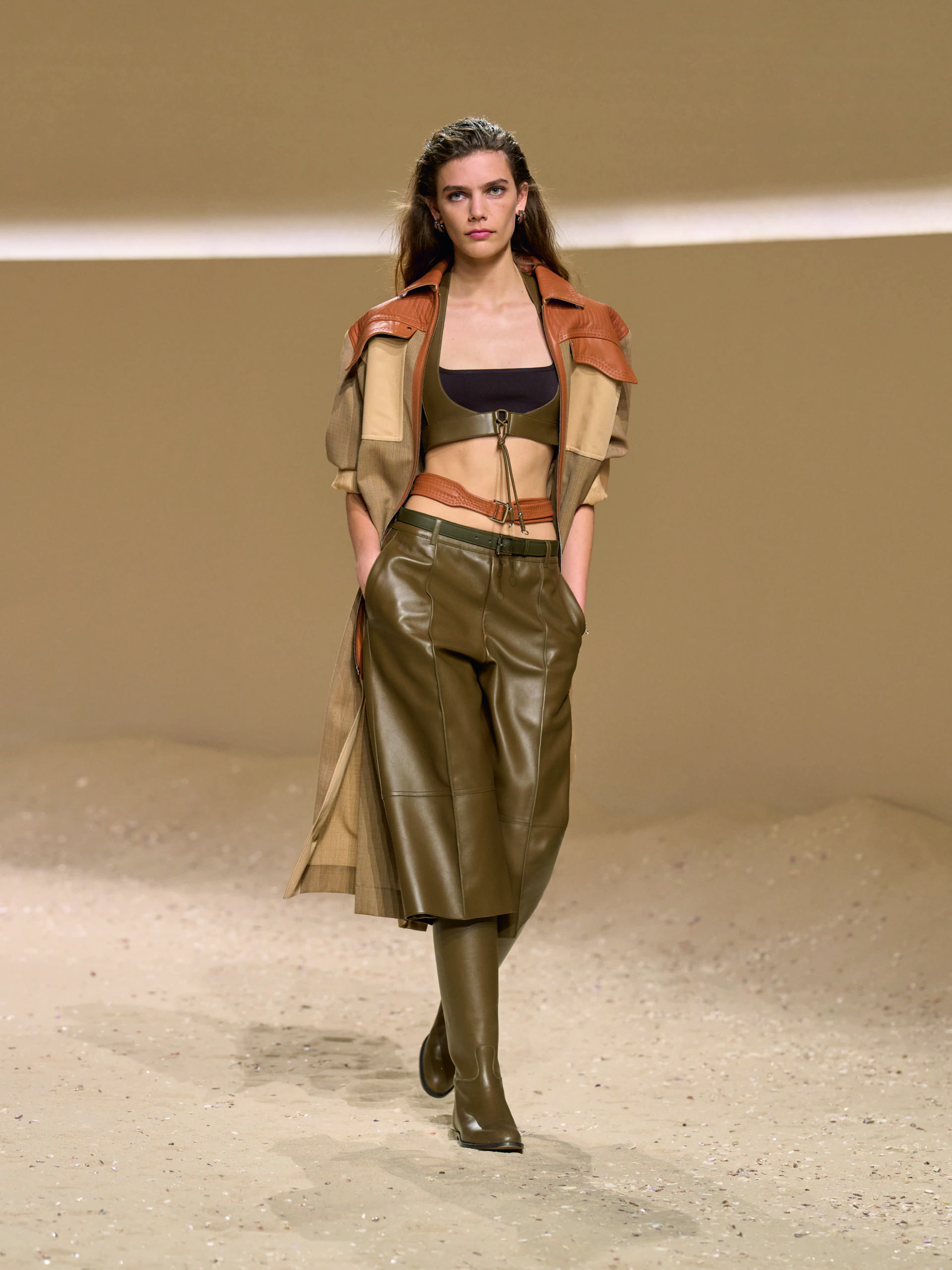 手工涂蜡皮革勾勒曼妙弧度;束带、搭扣与环饰将功能性与手工艺巧妙融合;绗缝工艺致敬皮革工艺与悠久的布提刺绣。为活动自如而设计的短款骑士夹克与绗缝亚麻帆布不对称半裙相映成趣;飘逸防风大衣灵感源于战壕风衣,以束带收紧腰身,呼应正装剪裁法则,亦诠释马术精准美学。