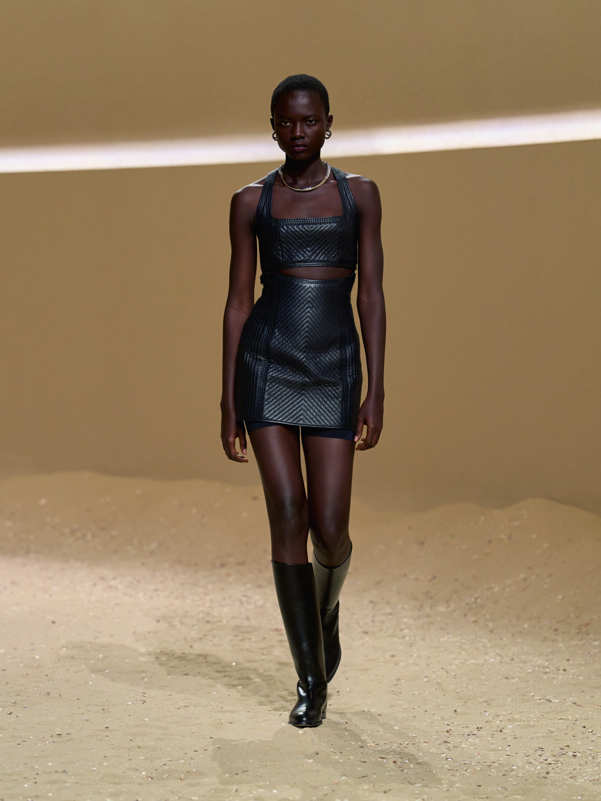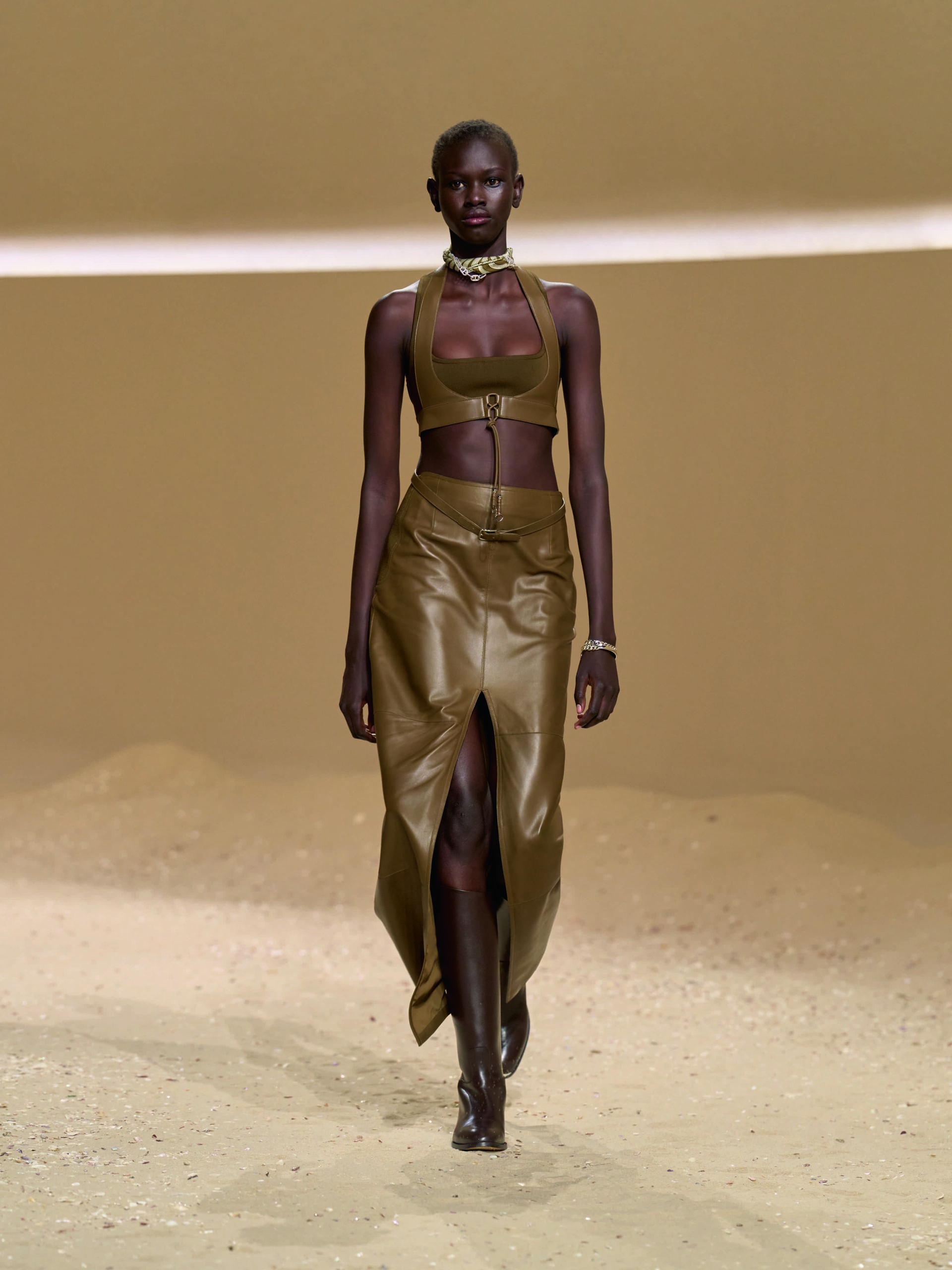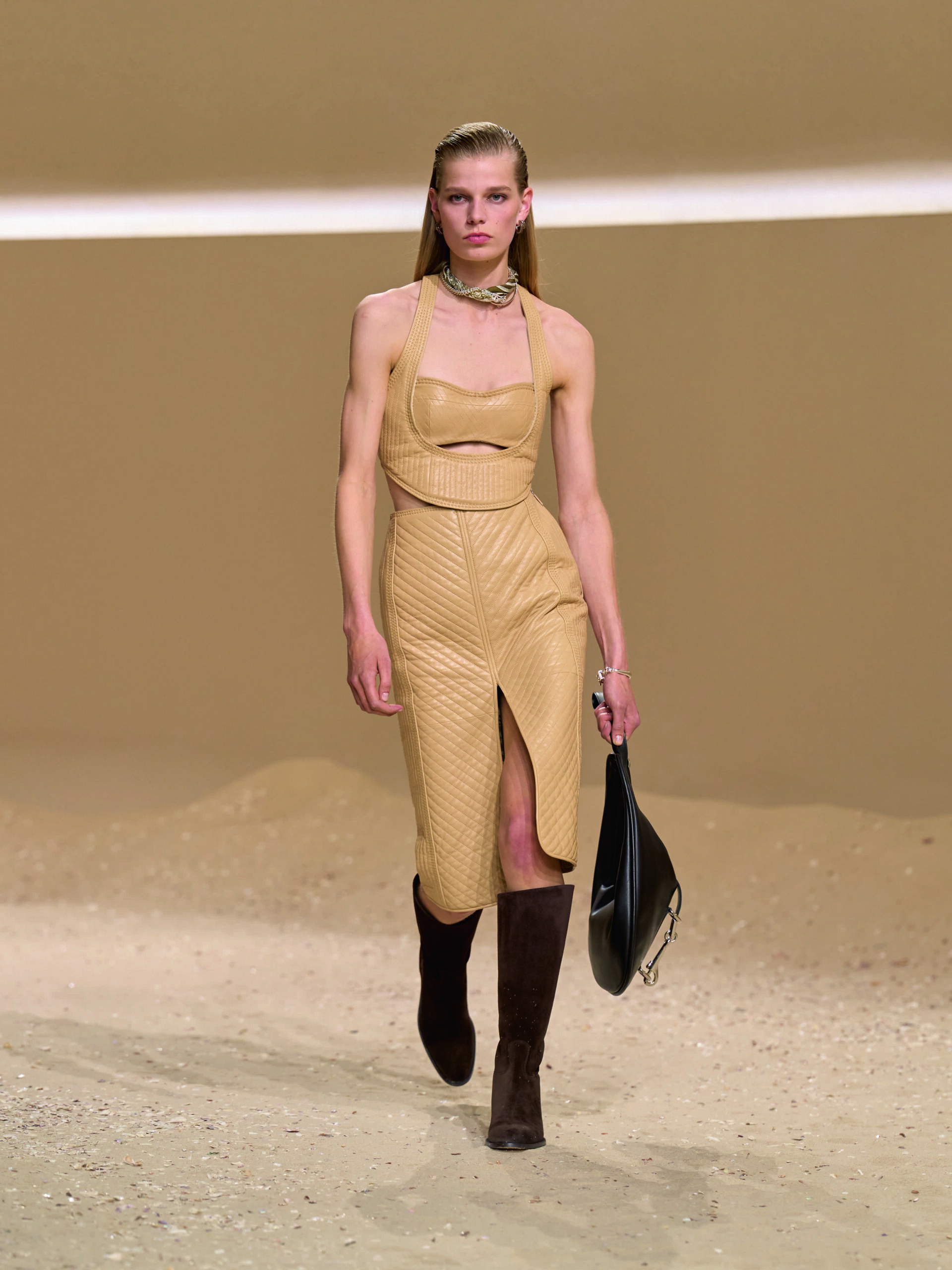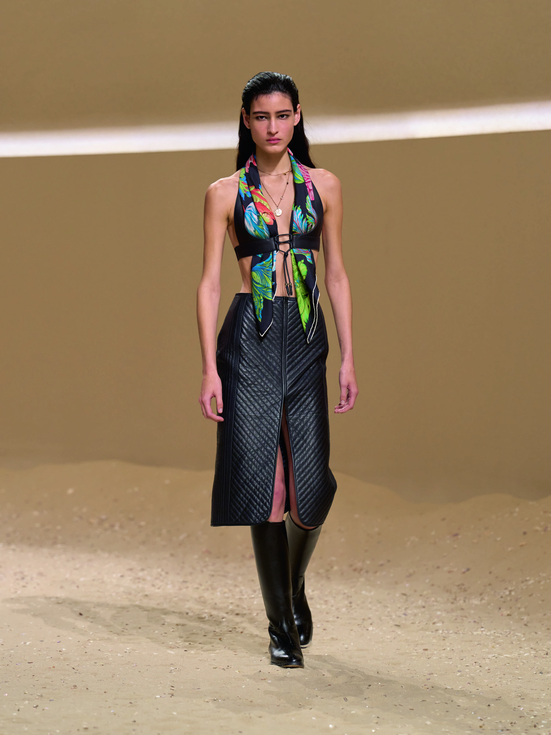 真丝方巾随性折叠为上衣,由皮革胸衣束裹,亦或化作雕塑感颈饰,与项链交织映衬。灵思巧构的组合式叠穿意在呈现而非掩映身姿之美。