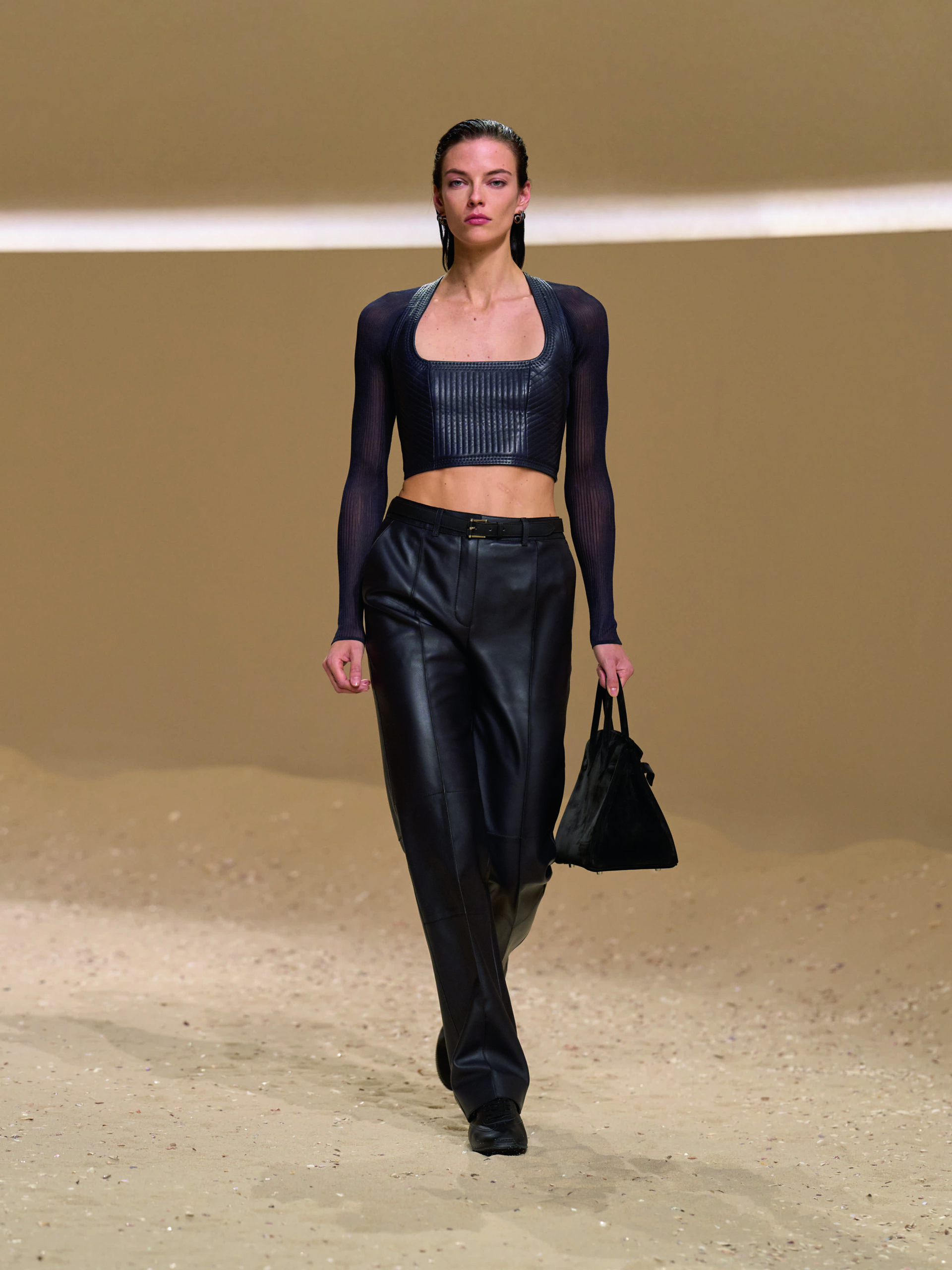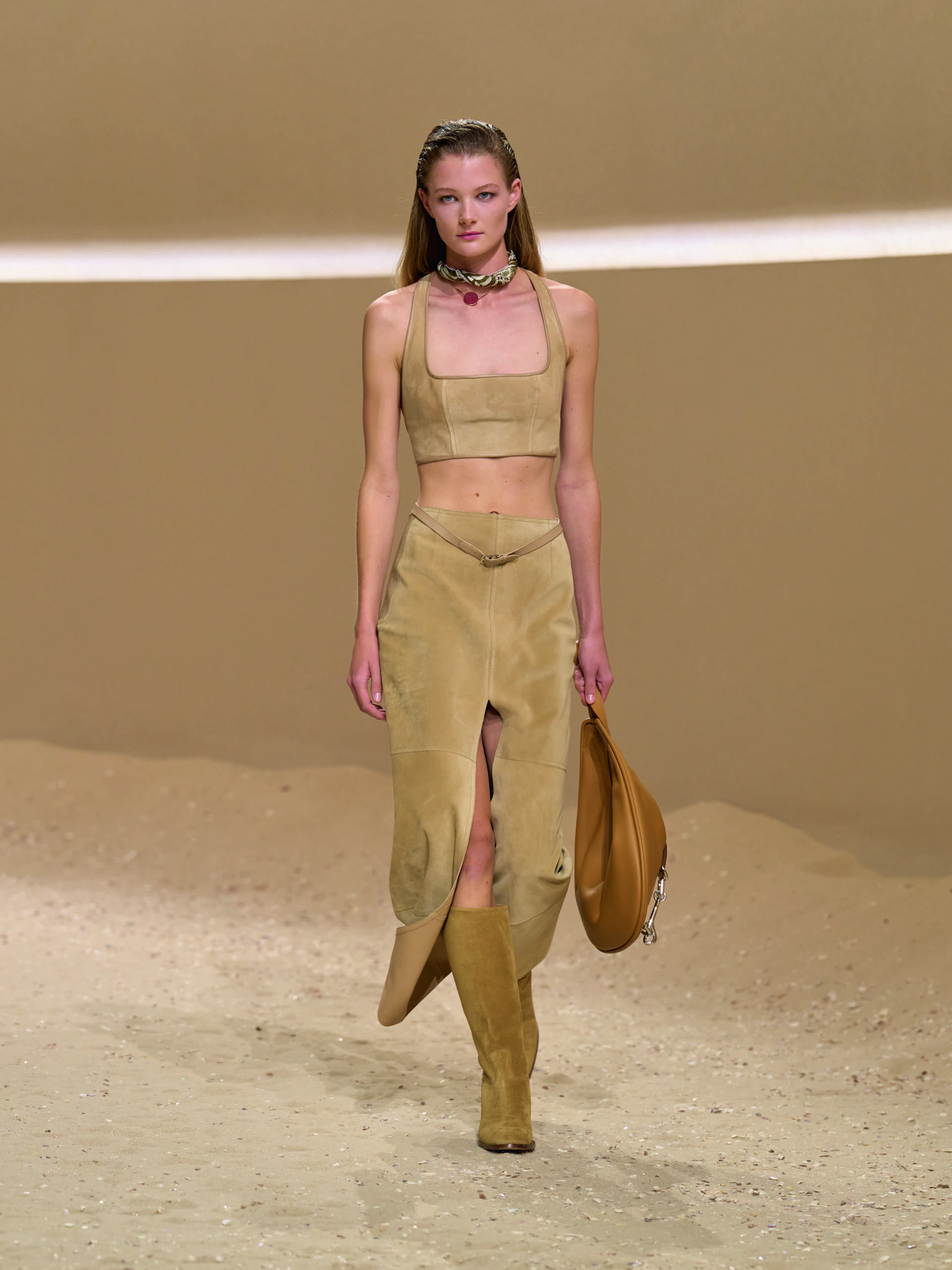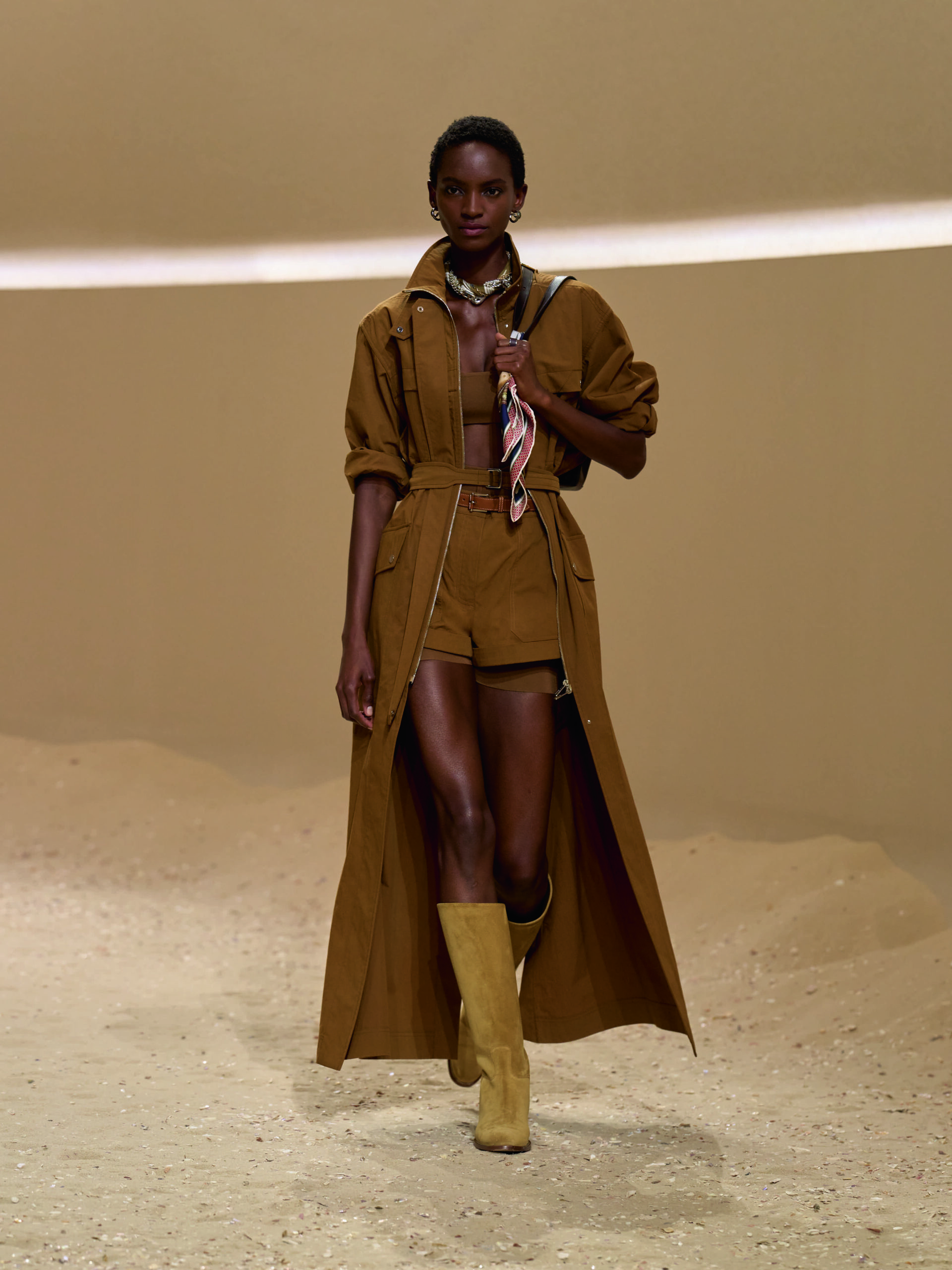 这位自由女骑士的衣橱中,精湛剪裁技艺融糅传承自马鞍制作的匠心,灵感源于爱马仕档案馆中珍藏的一副来自 Camargue 的古老马鞍。历经时光洗礼的鞍桥靠背,由骑手与骏马共同塑就,启发蕴藉经典传承亦敞怀独立精神的系列。