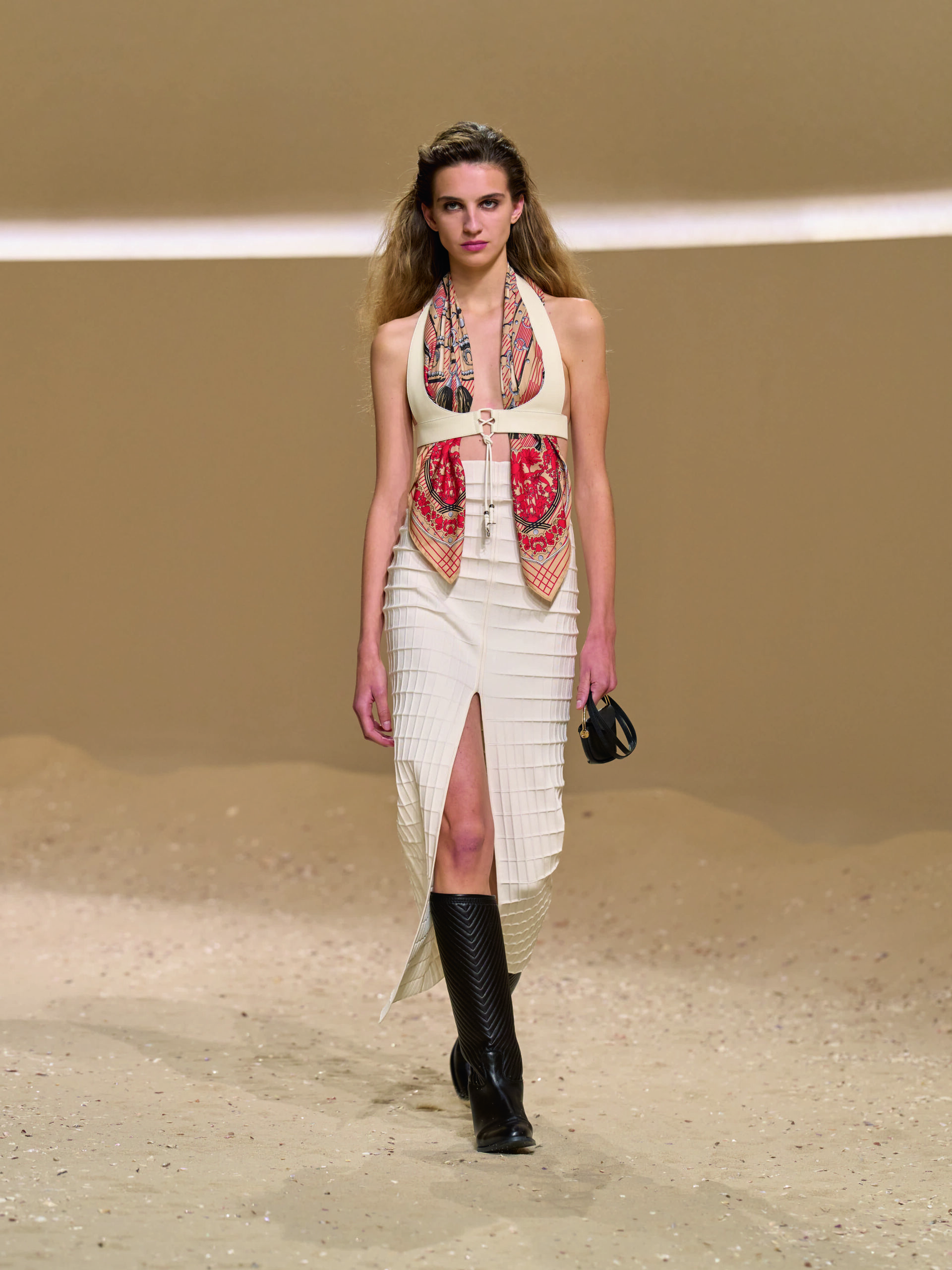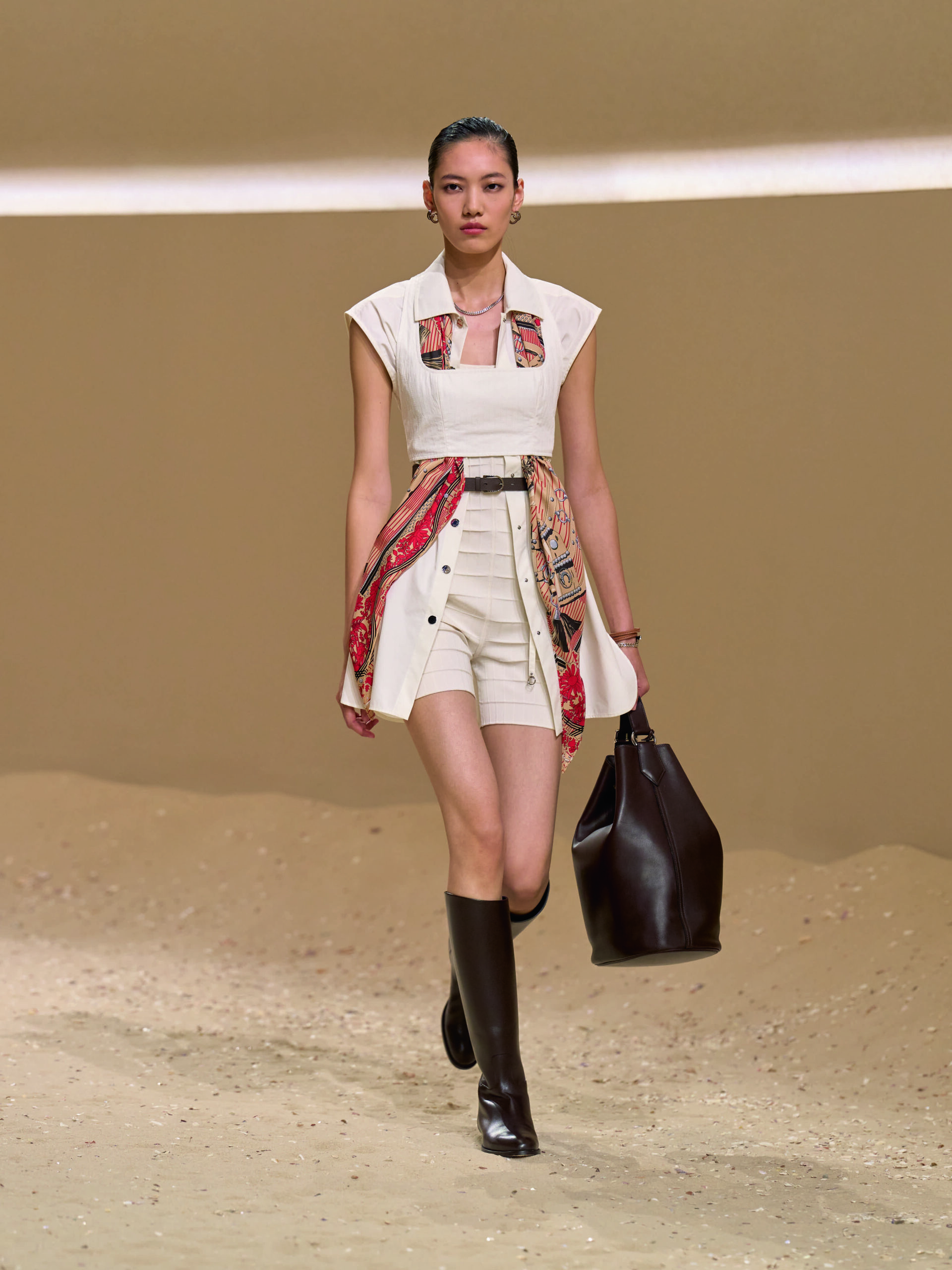 胸衣承托流动垂褶廓形,撷 Aux champs en fleurs 方巾的灵动图案点缀。贴合身形的绗缝连衣裙汲取束身衣灵感,腰带与系绳环绕其上,搭配骑行短裤,交融传统工艺与运动活力。