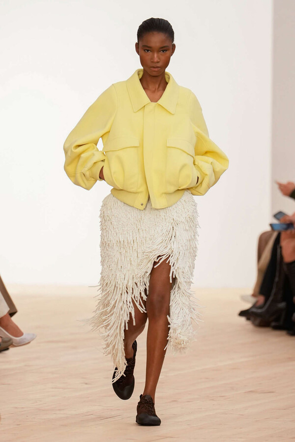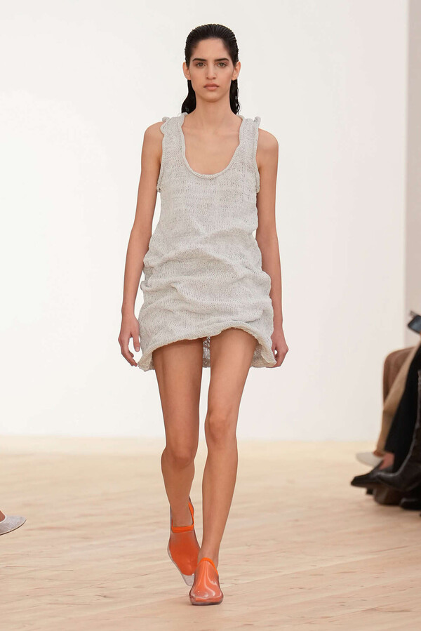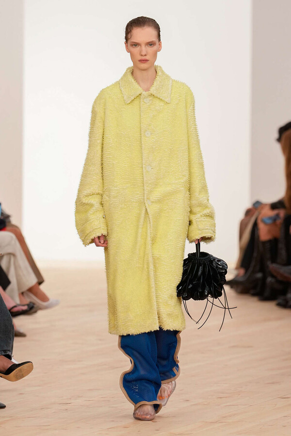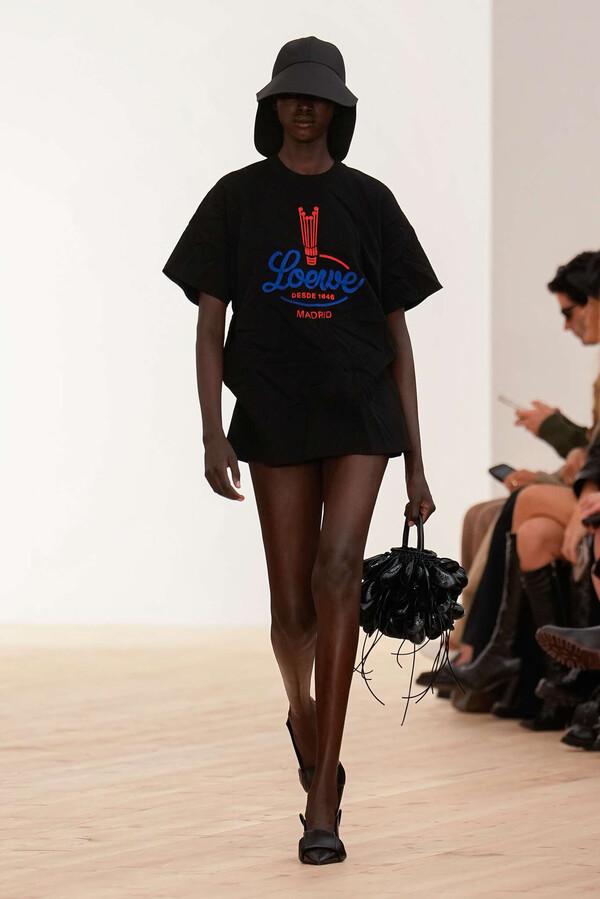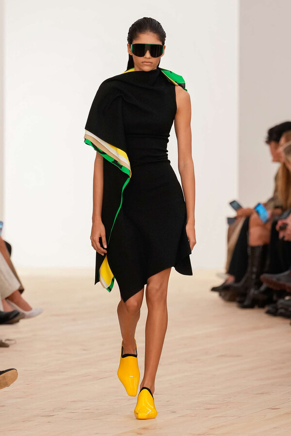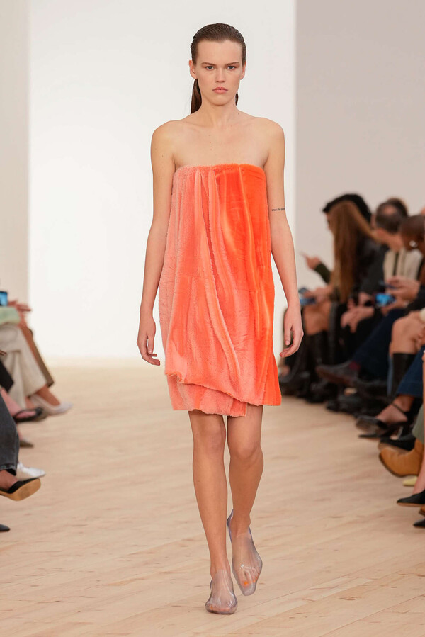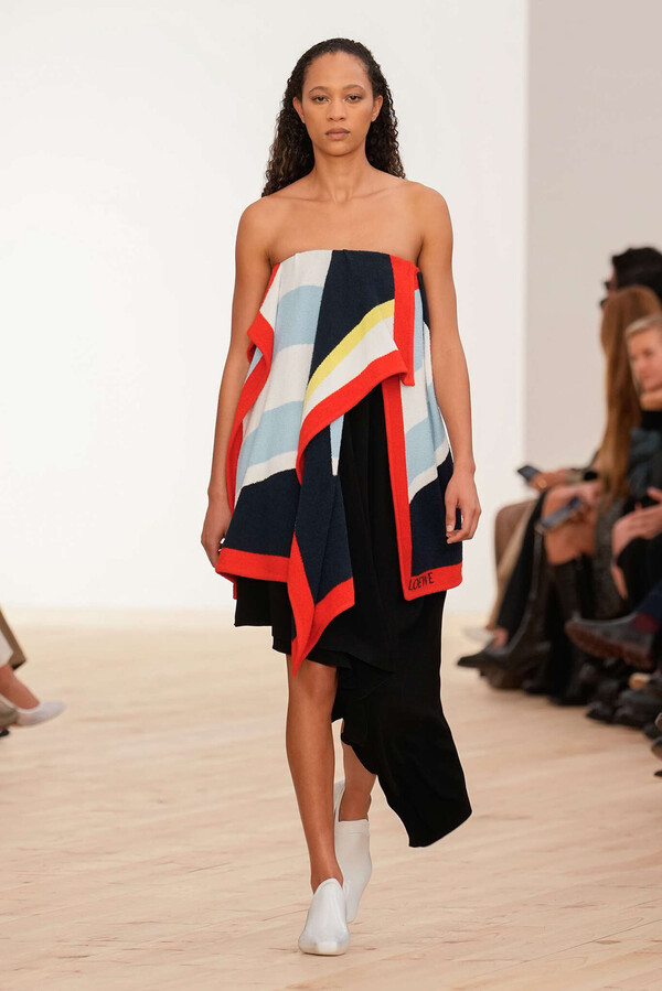 本季还引入了材质创新。其中一款风衣采用丝绸 Gore-Tex 混合面料制成;连衣裙模仿了毛巾的柔软质感,但实际上采用 3D 打印材质制成,并带有天鹅绒般的绒毛。层叠的围巾连衣裙搭配毛边荷叶边,将轻松的穿着体验与细致做工完美融合。这种触觉实验与可穿戴廓形的相互辉映,体现了 LOEWE 将工艺与科技融合,同时不失其核心手工工艺的渴望。